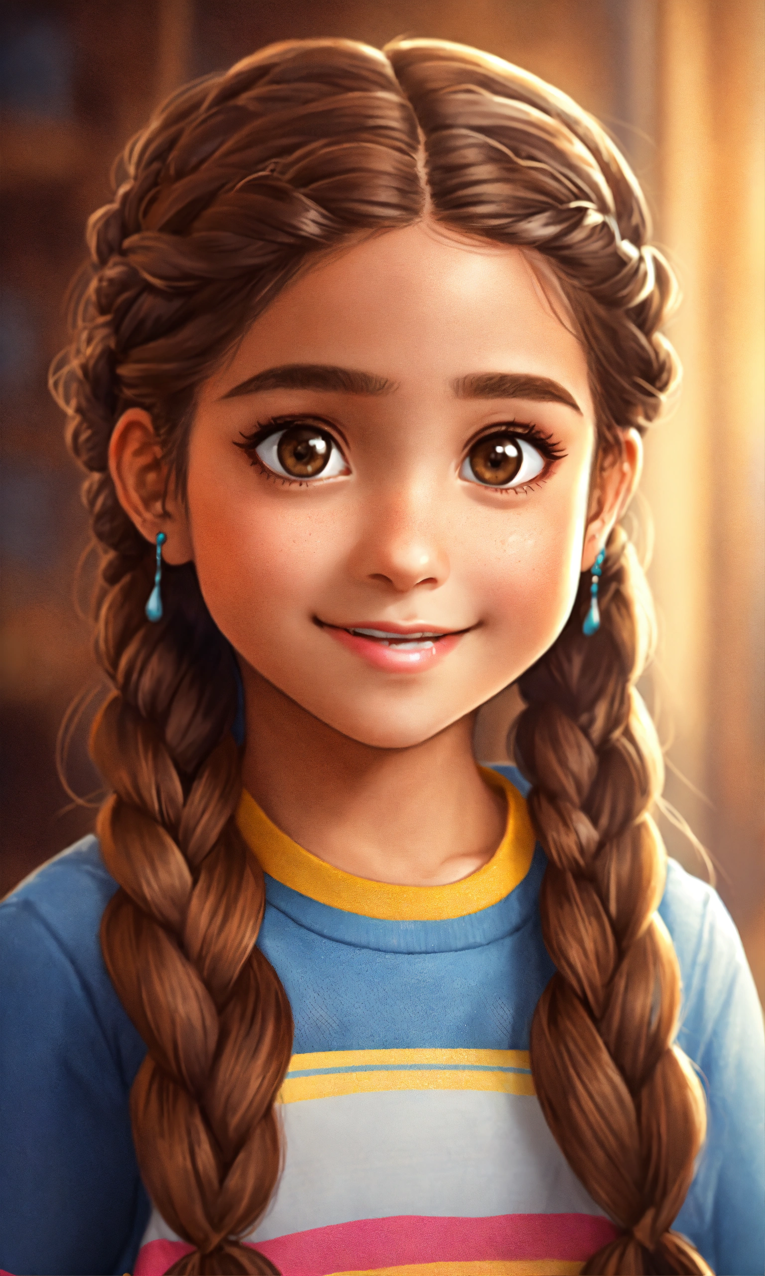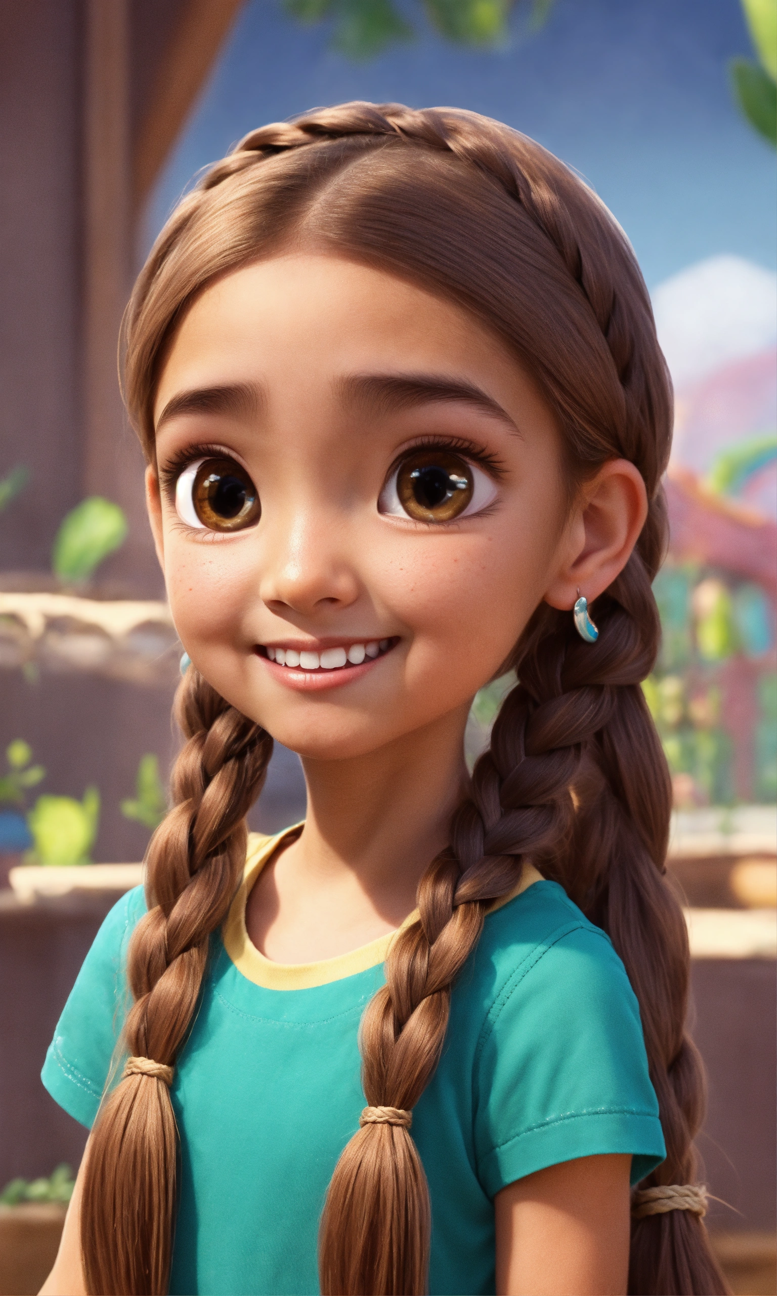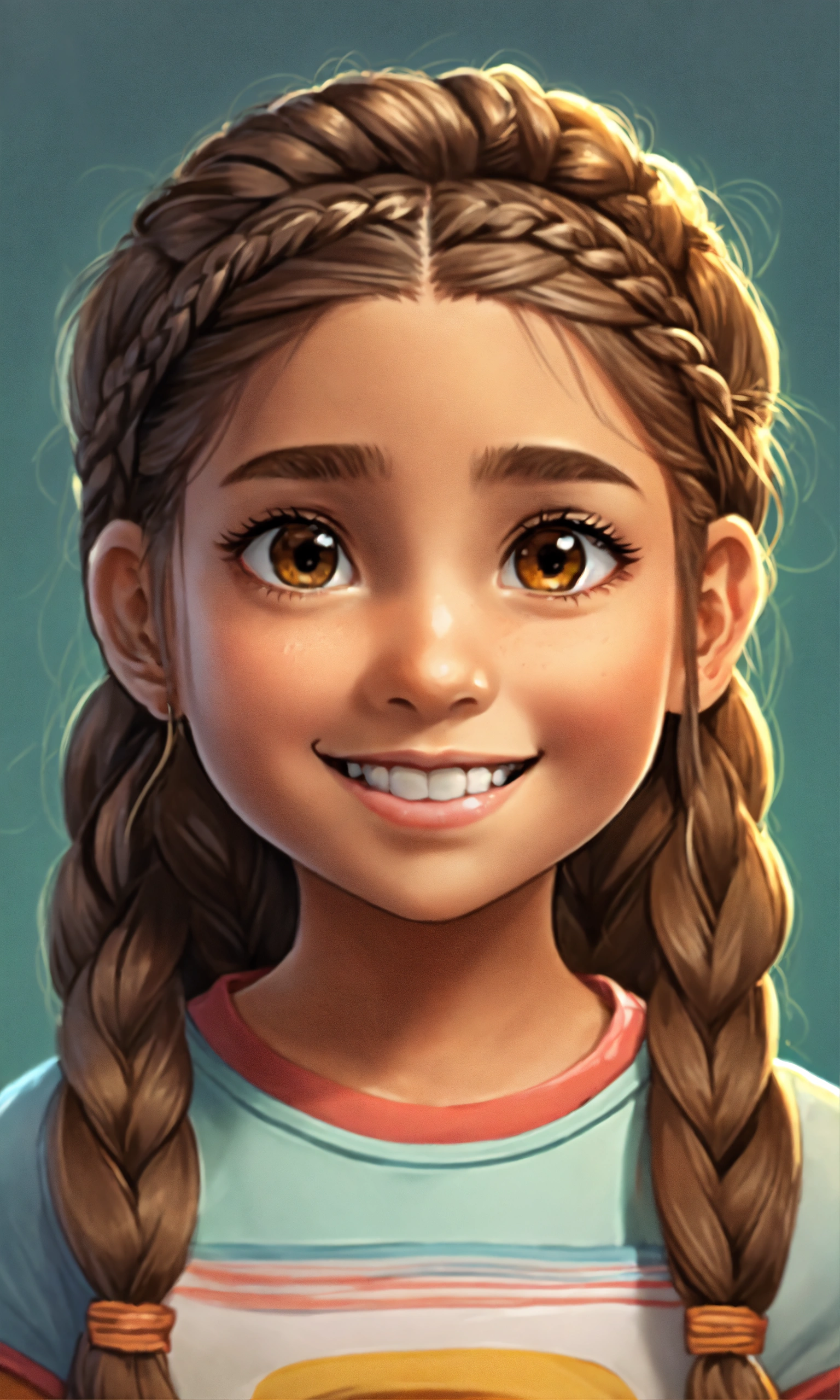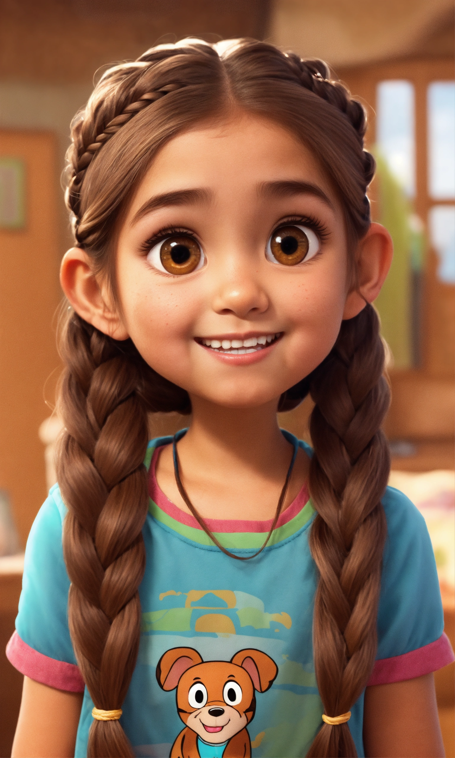 One small braid but no straight hair with a braid, brown eyes, missing upper two tooth, 6 years old girl, cartoon style