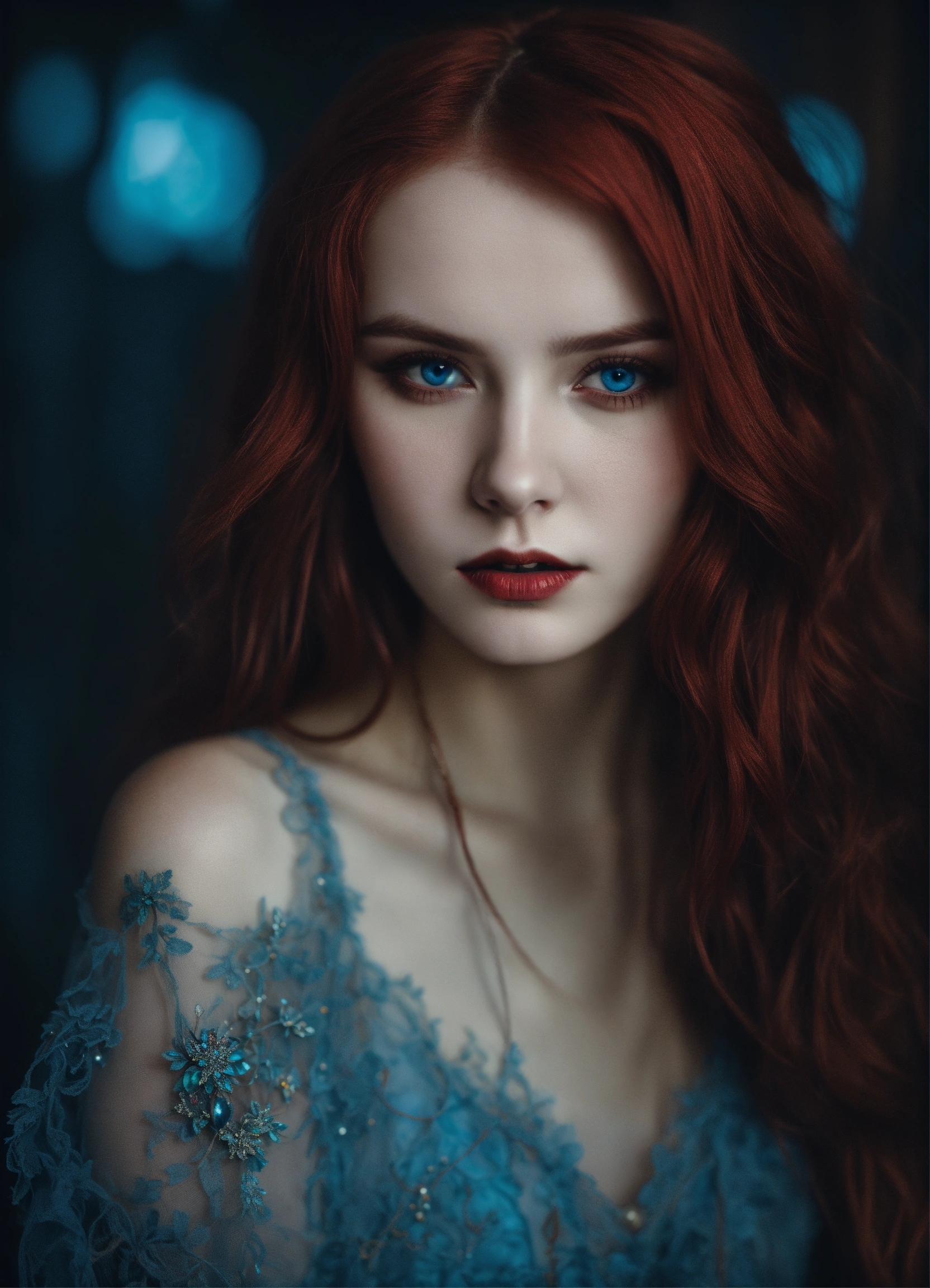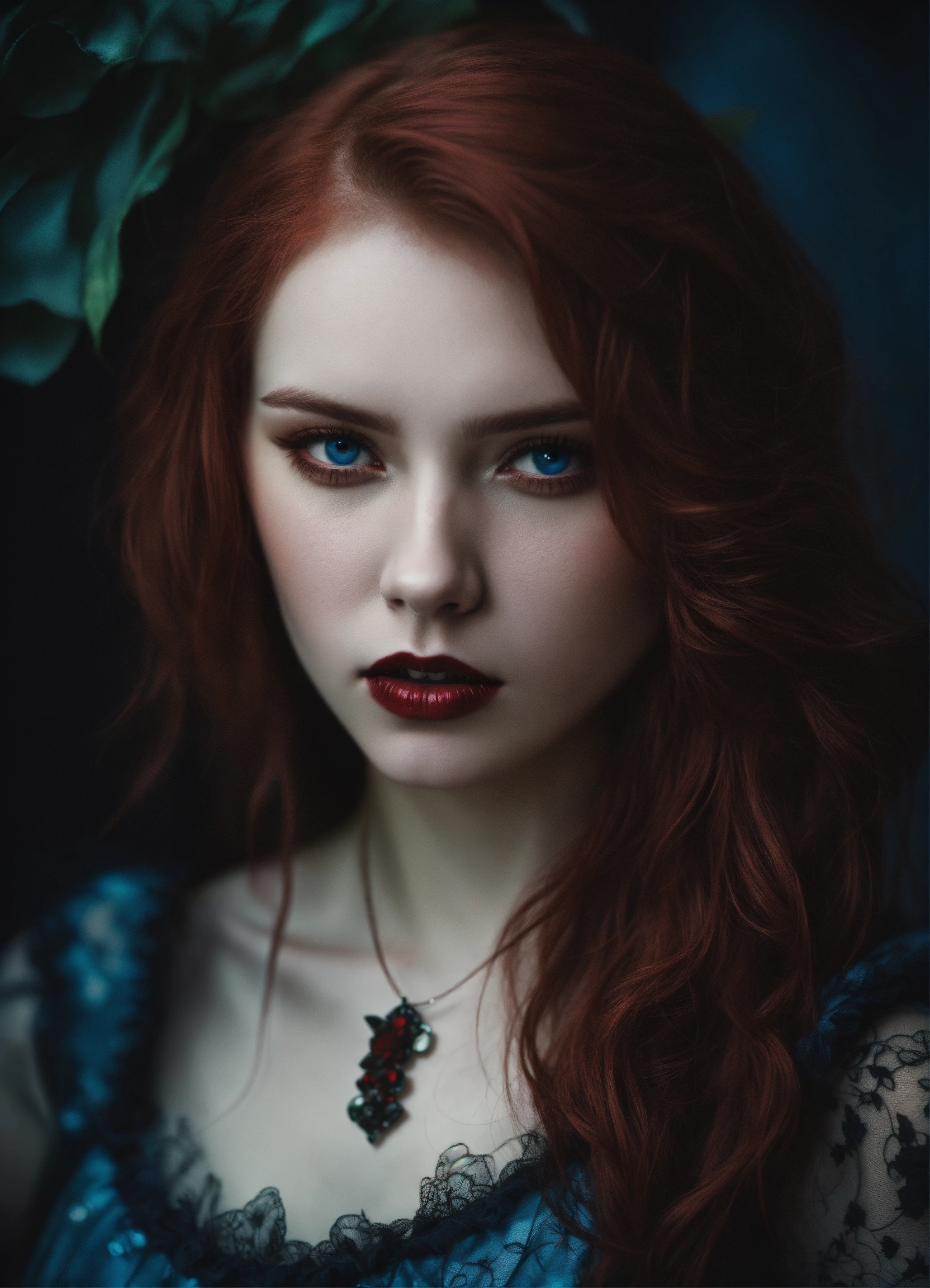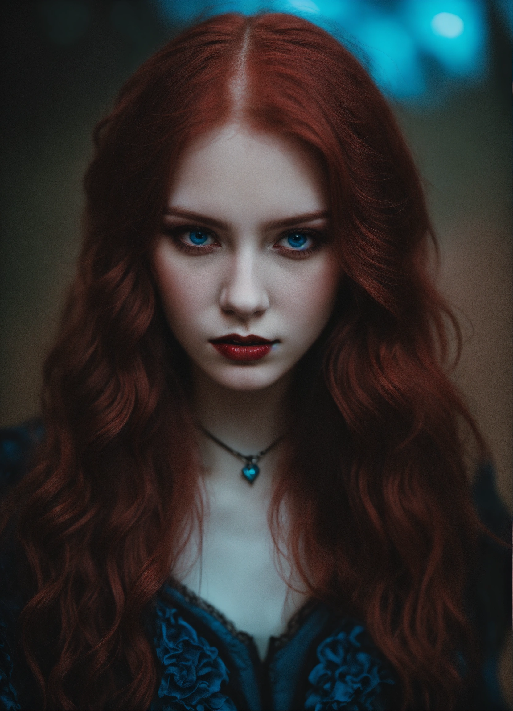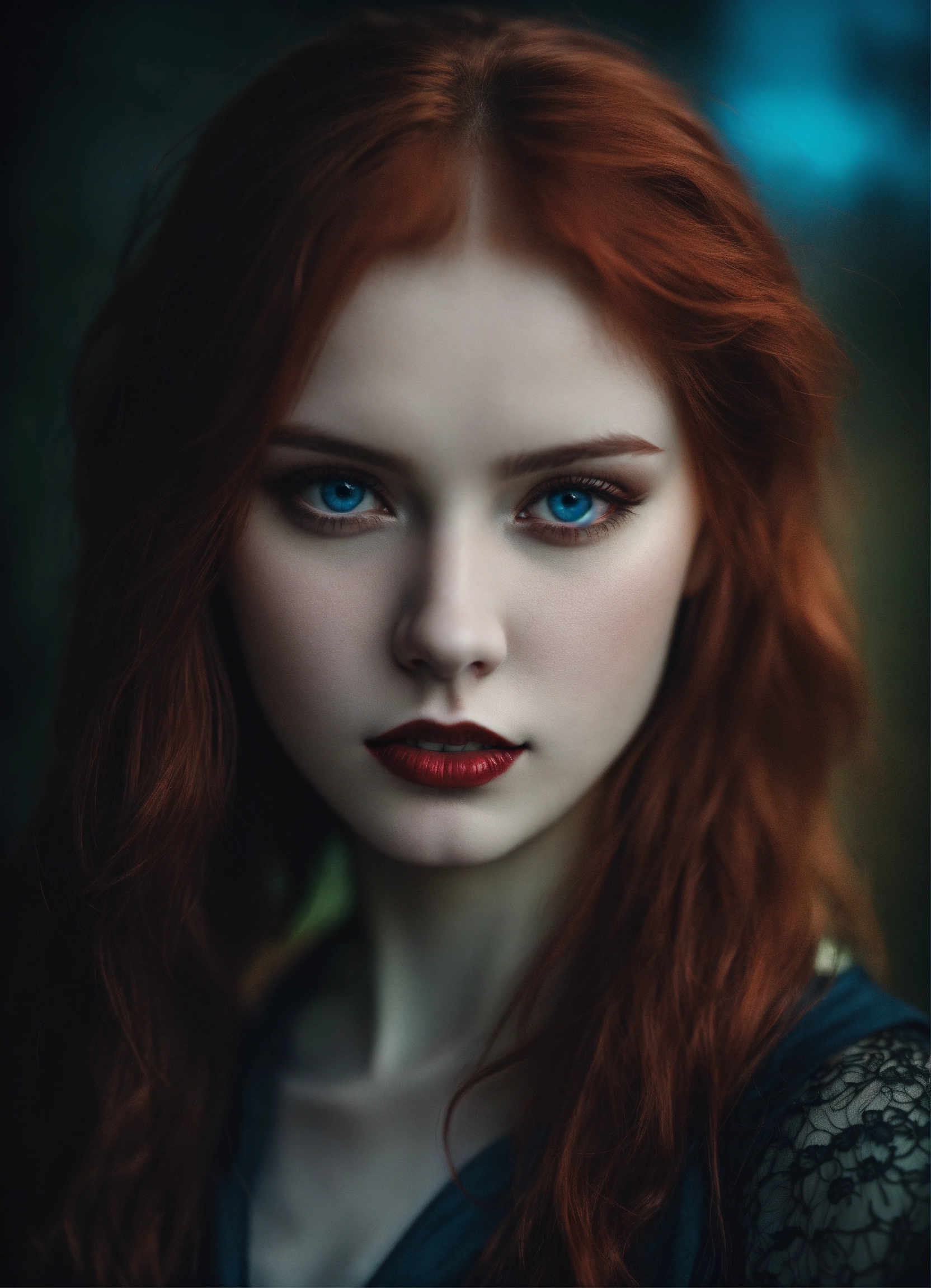 Detailed portrait of russian 20 year old woman dark evil red hair, dark vampire fantasy, pale skin, blue eyes, grunge aesthetic!!! fantasy dark background