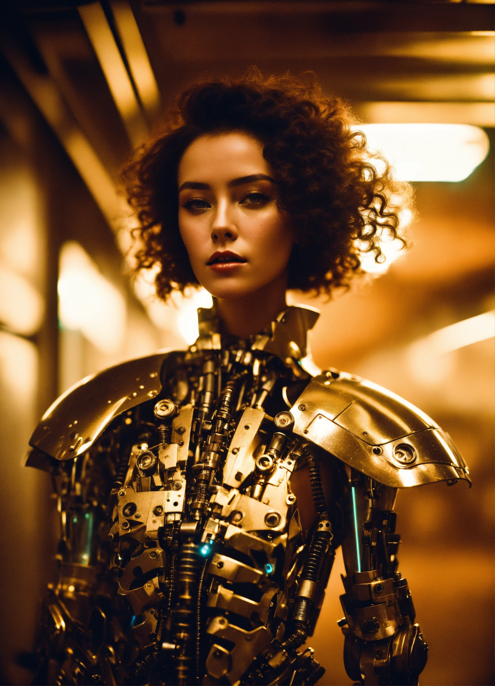 Fashion photography, a female model manifests as a future cyborg, merging metal and fashion. short lighting emphasizes her mechanical edge, with unexpected light leaks adding dynamism. lomo effect instills vintage futurism, all captured using a nikon z9