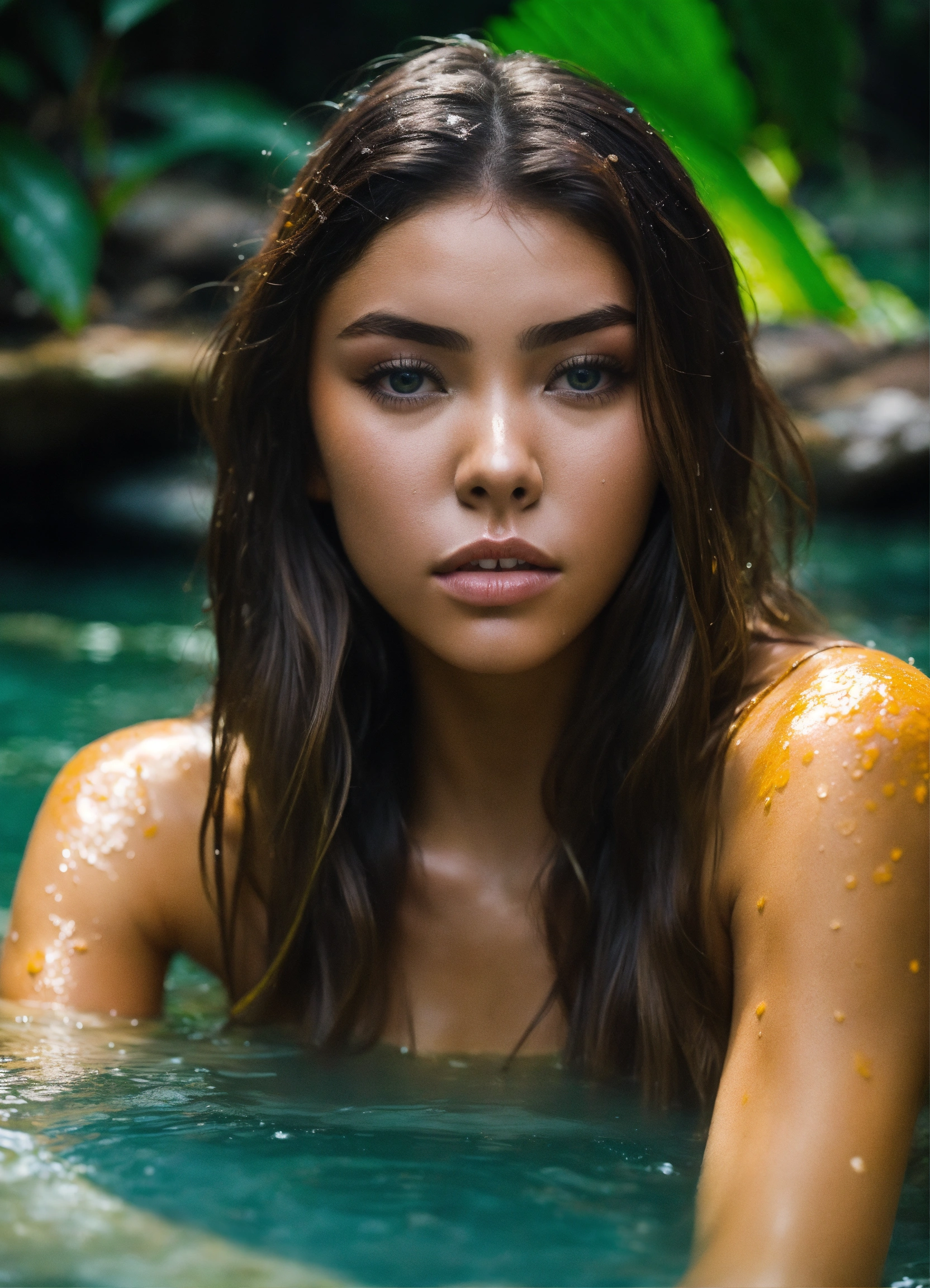 Madison beer in a natural hot springs in the jungle, drenched hair, realistic. full natural body view. 4k real photoshoot.