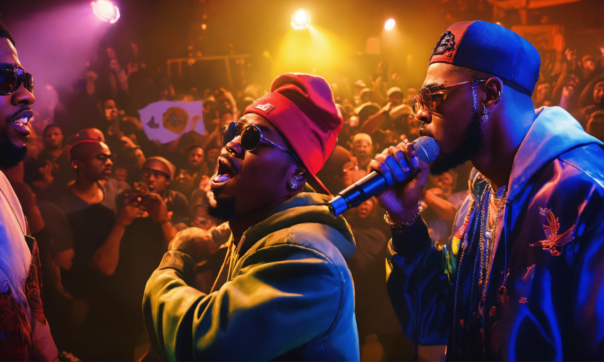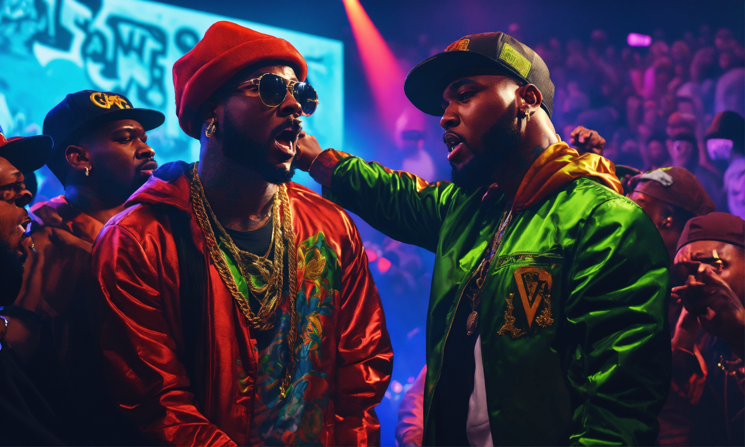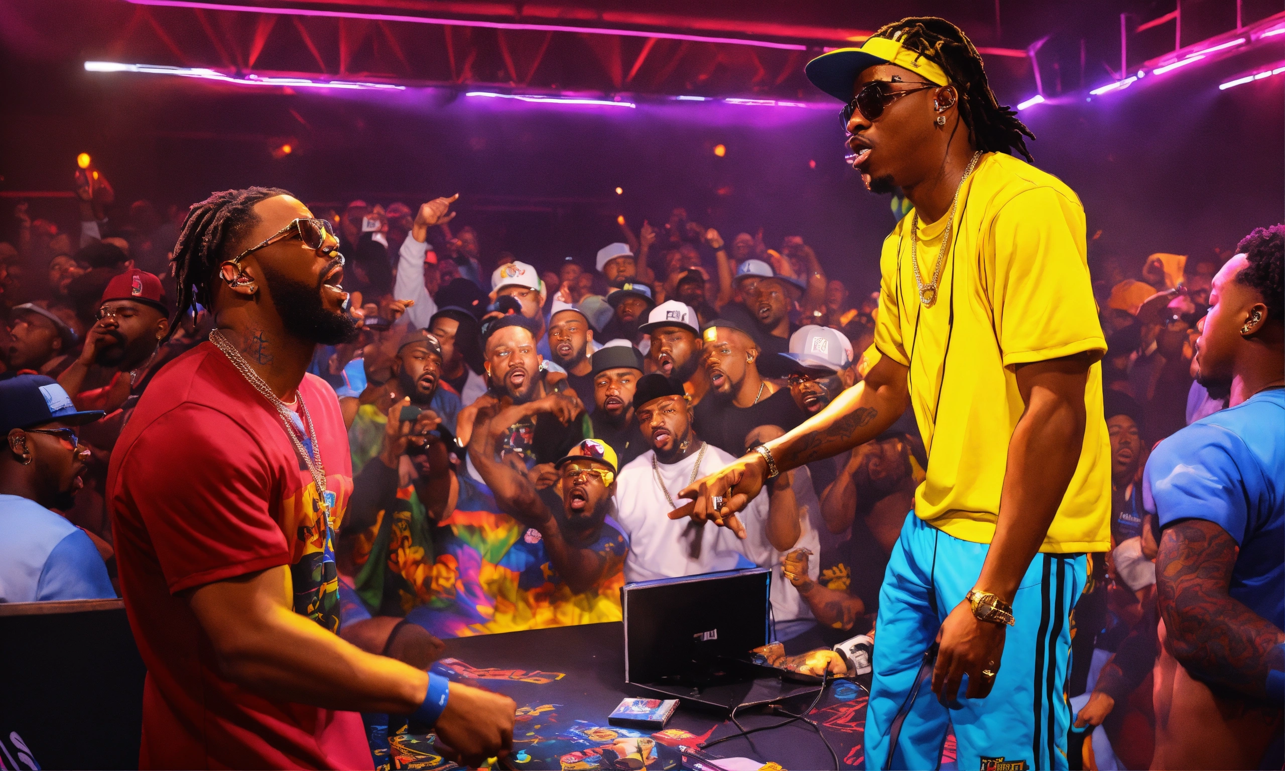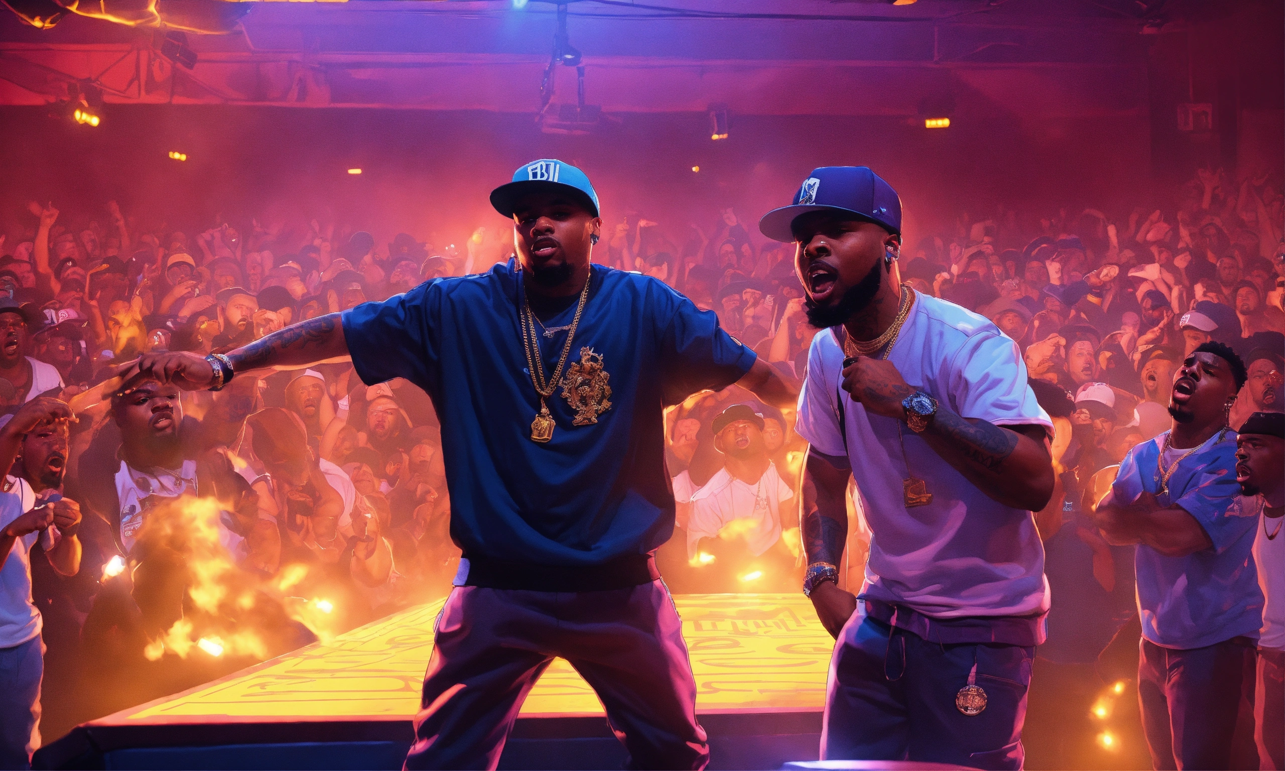 Pop art, hyperrealist portrait of battle rapper "geechi gotti " vs " eazy the block captain" in a url rap battle league battling another rapper on stage cheering in background, fancy interior fantasy art, photo realistic, dynamic lighting, art station, poster, volumetric lighting, very detailed faces, 4 k, award winning