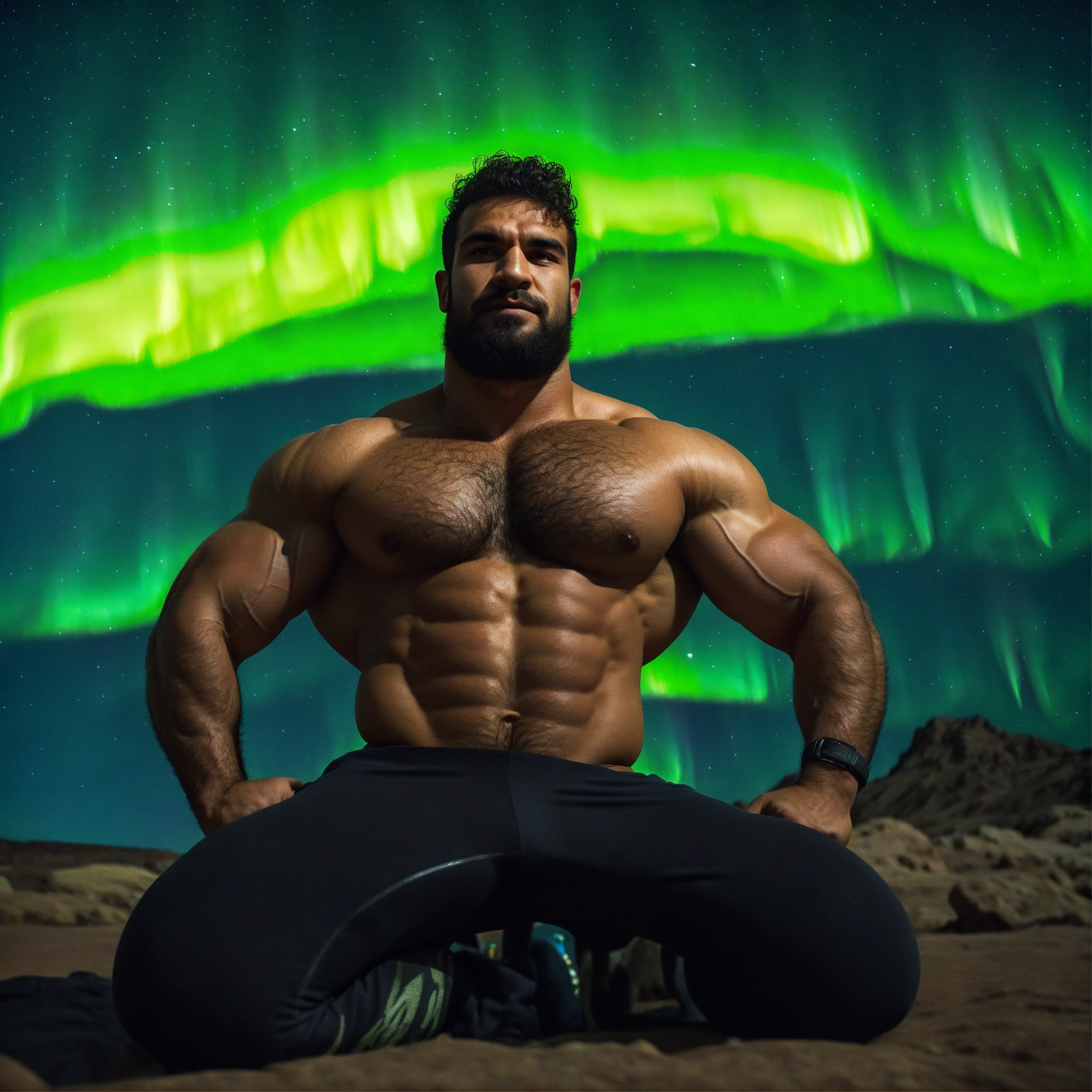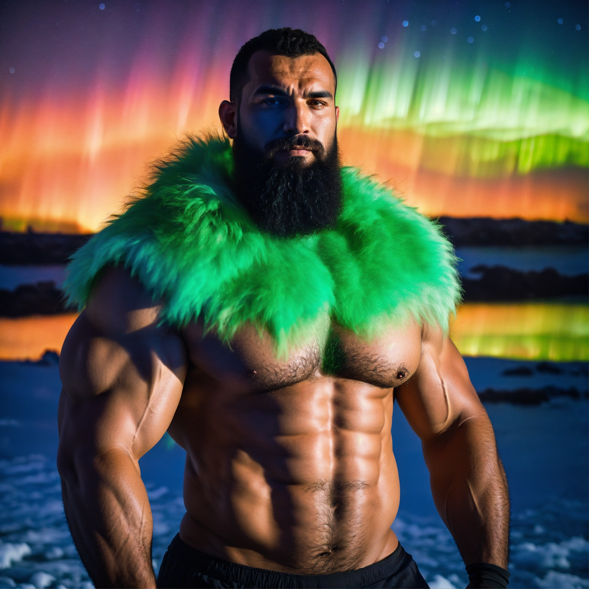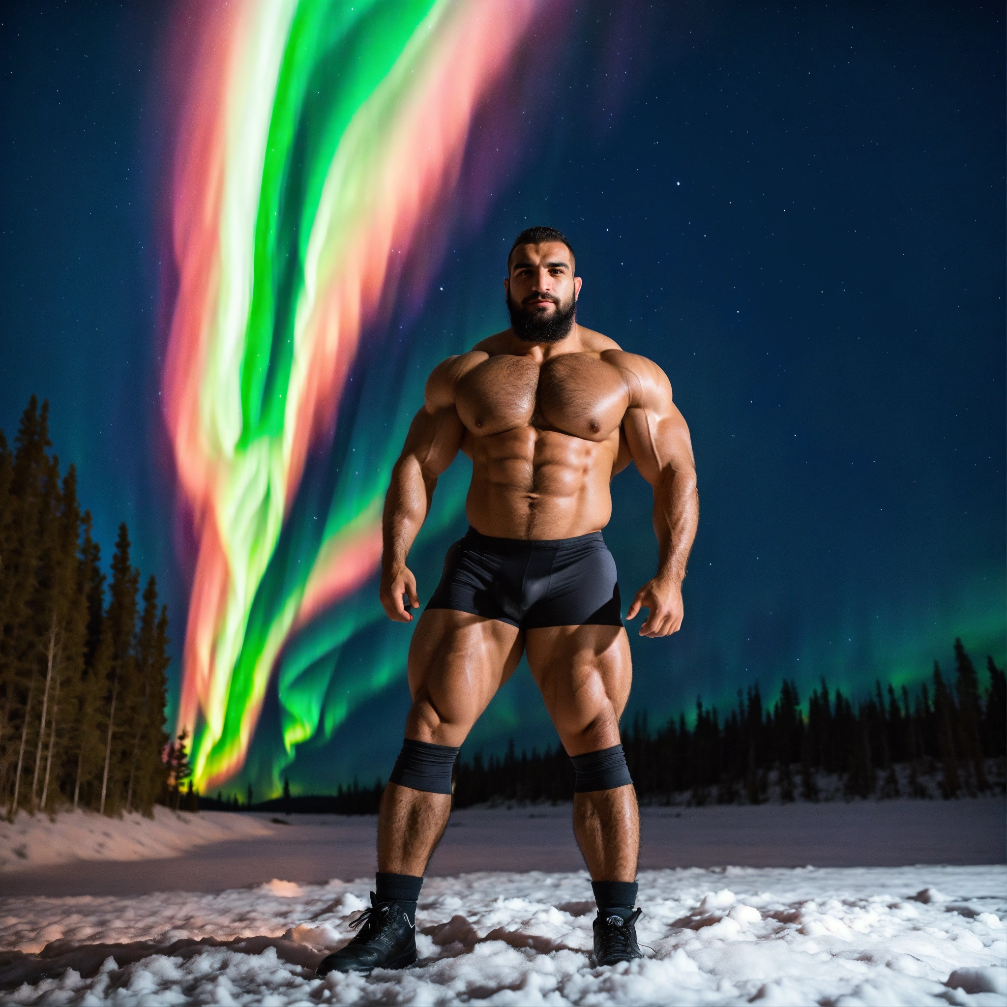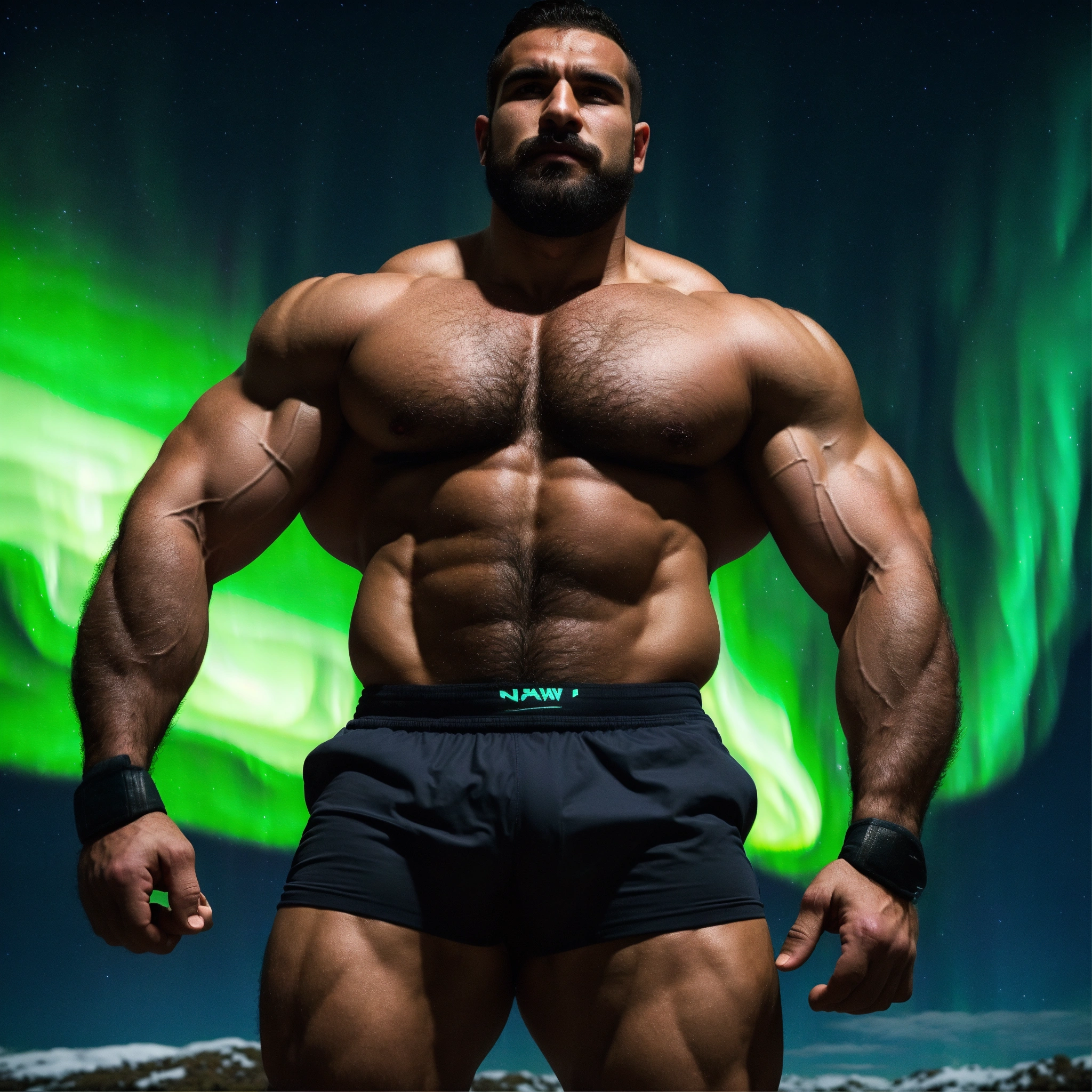 30-year-old hairy algerian man with big muscles, big bodybuilder, body like a wrestler, under the northern lights