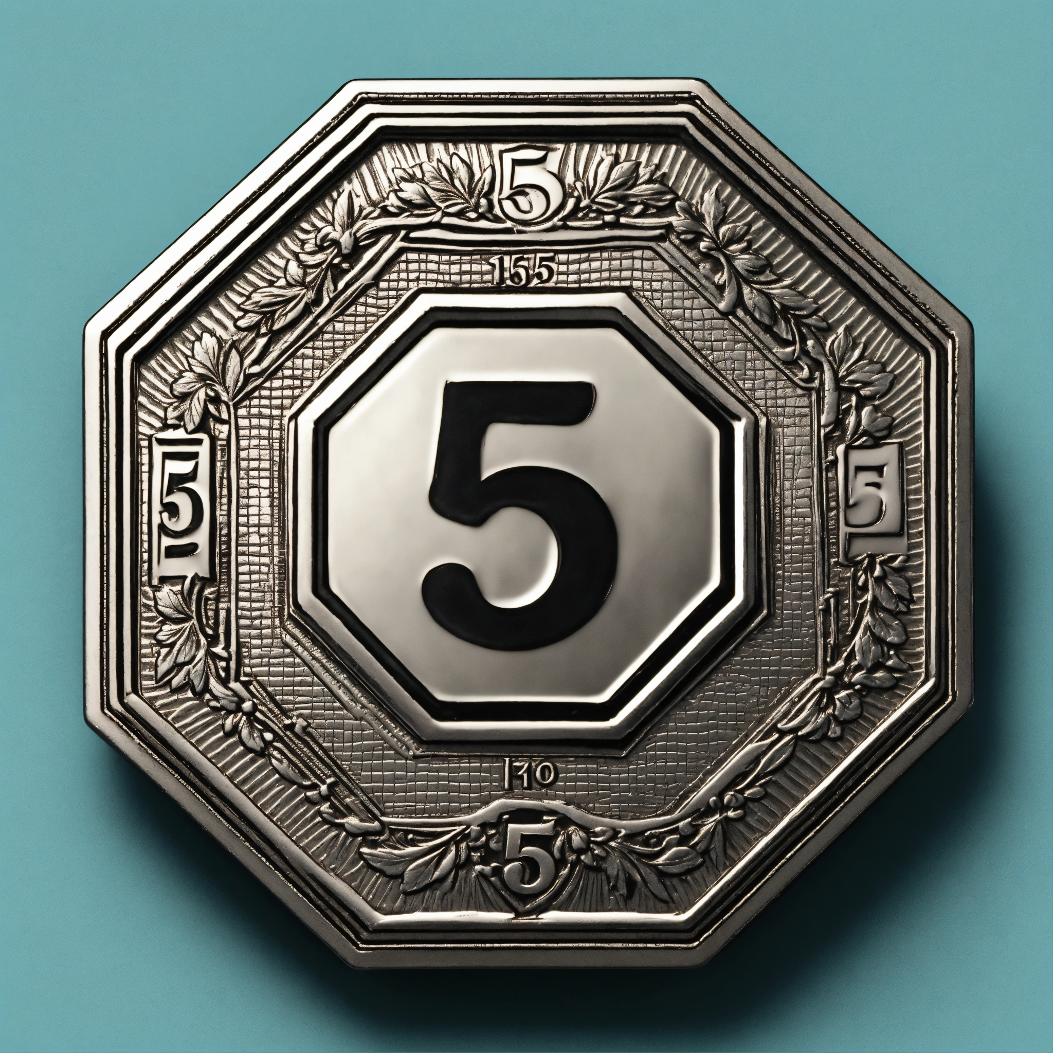 A silver octagonal silver coin with the number 5 stamped in the centre