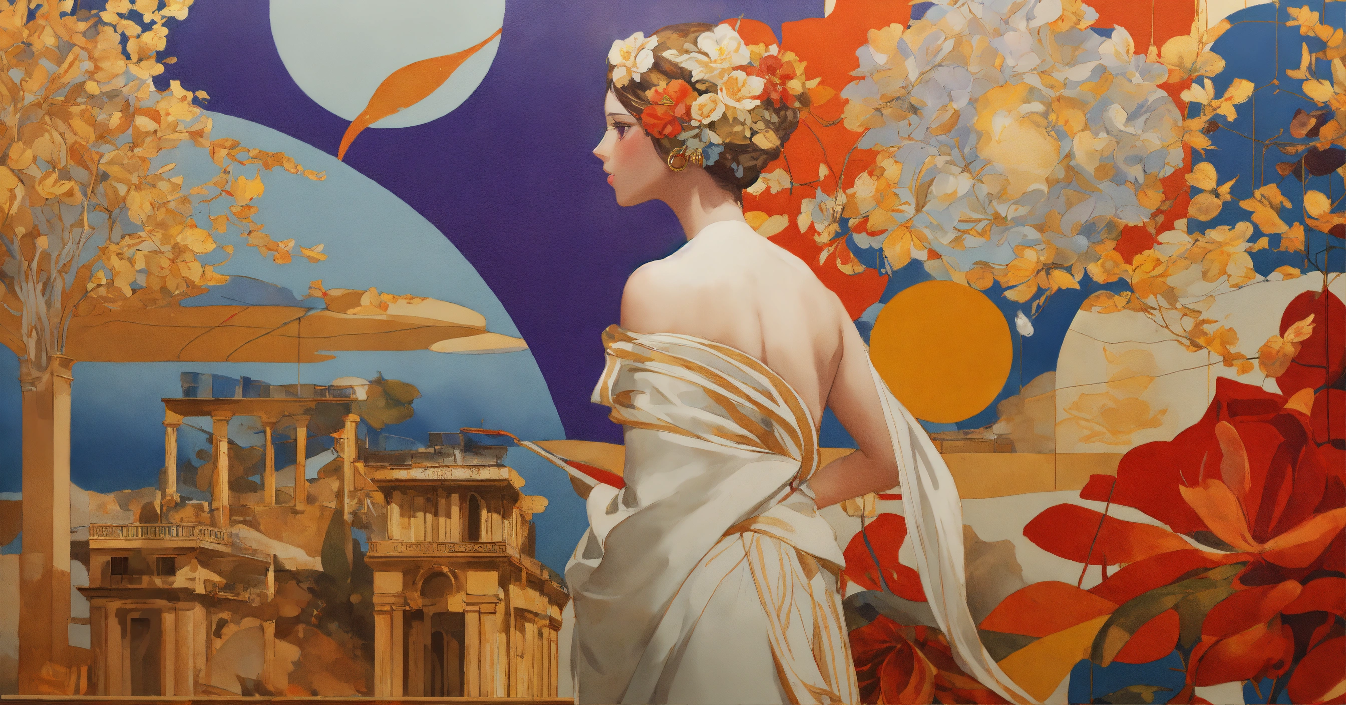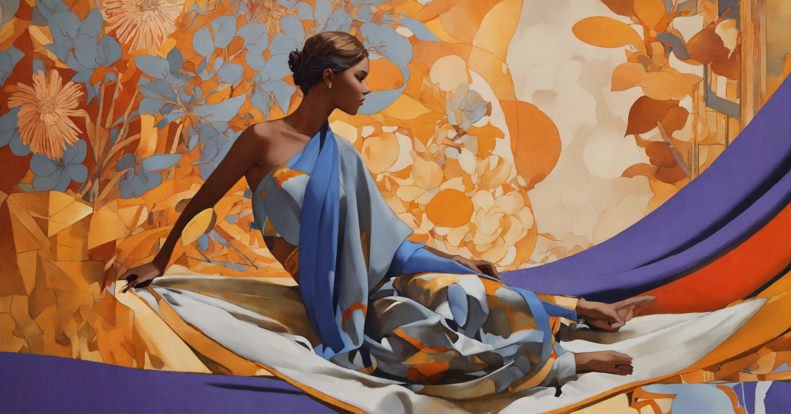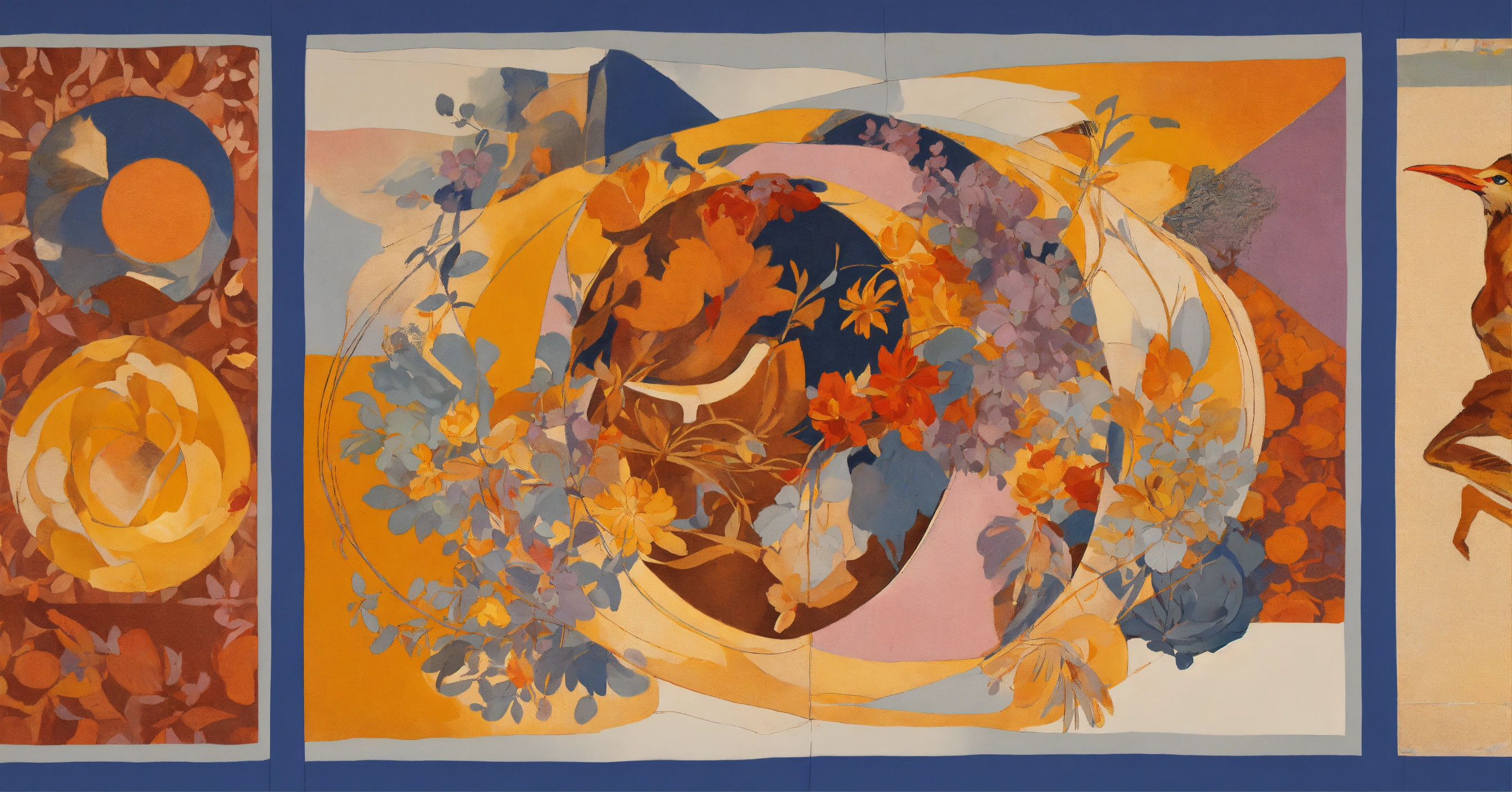 Fresco calligraphic focused collage of flowers and geometry, slate-blue red orange yellow, by james jean and edward hopper, mockup for hermes scarf, multiple looks and layout, typography, square silk scarves, lookbook for hermes branding, surreal angelic eritrean painted-female beings phi limbs, hollow anatomy, (brown american urban ethnicity), exploded bauhaus colorfield scene, fine pencil rendering of ladies body curves, [purple], graffiti influence modern deco lines and overlapping shadow reflection creole woven, painted moma exhibit, ((heavy paint brush strokes)), gold jewelry adornments, beautiful large bird sunrise scene, on greek vase silhouette contrast