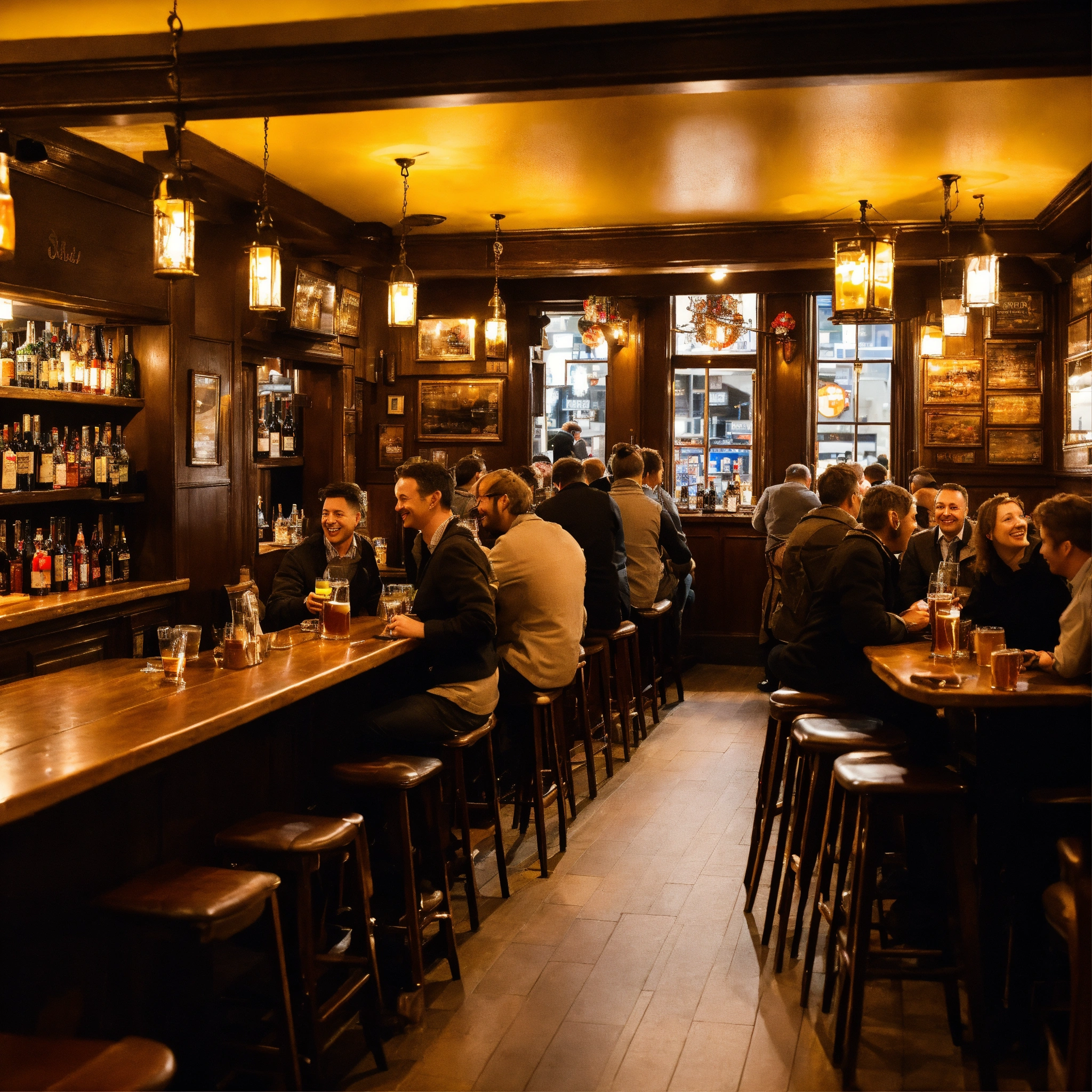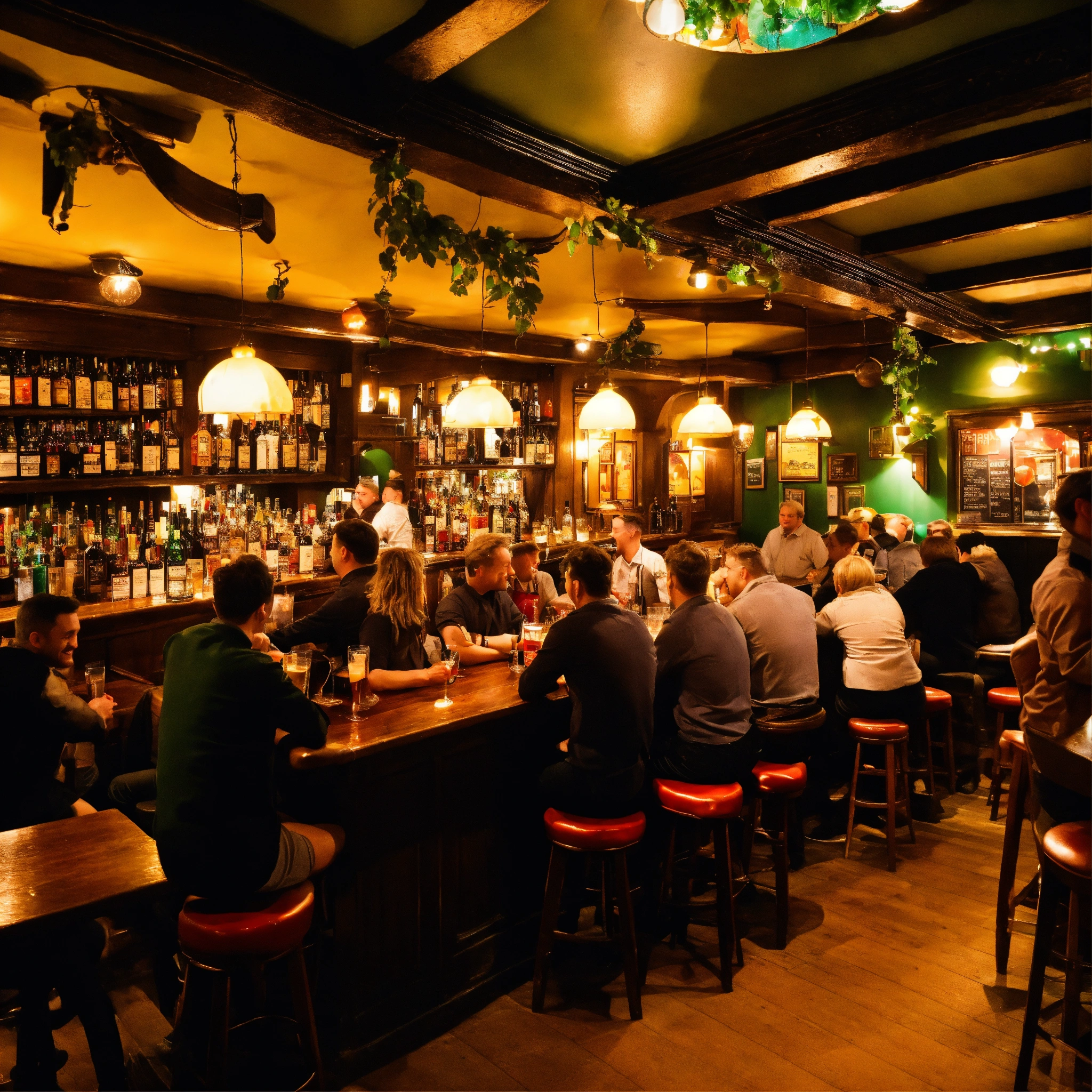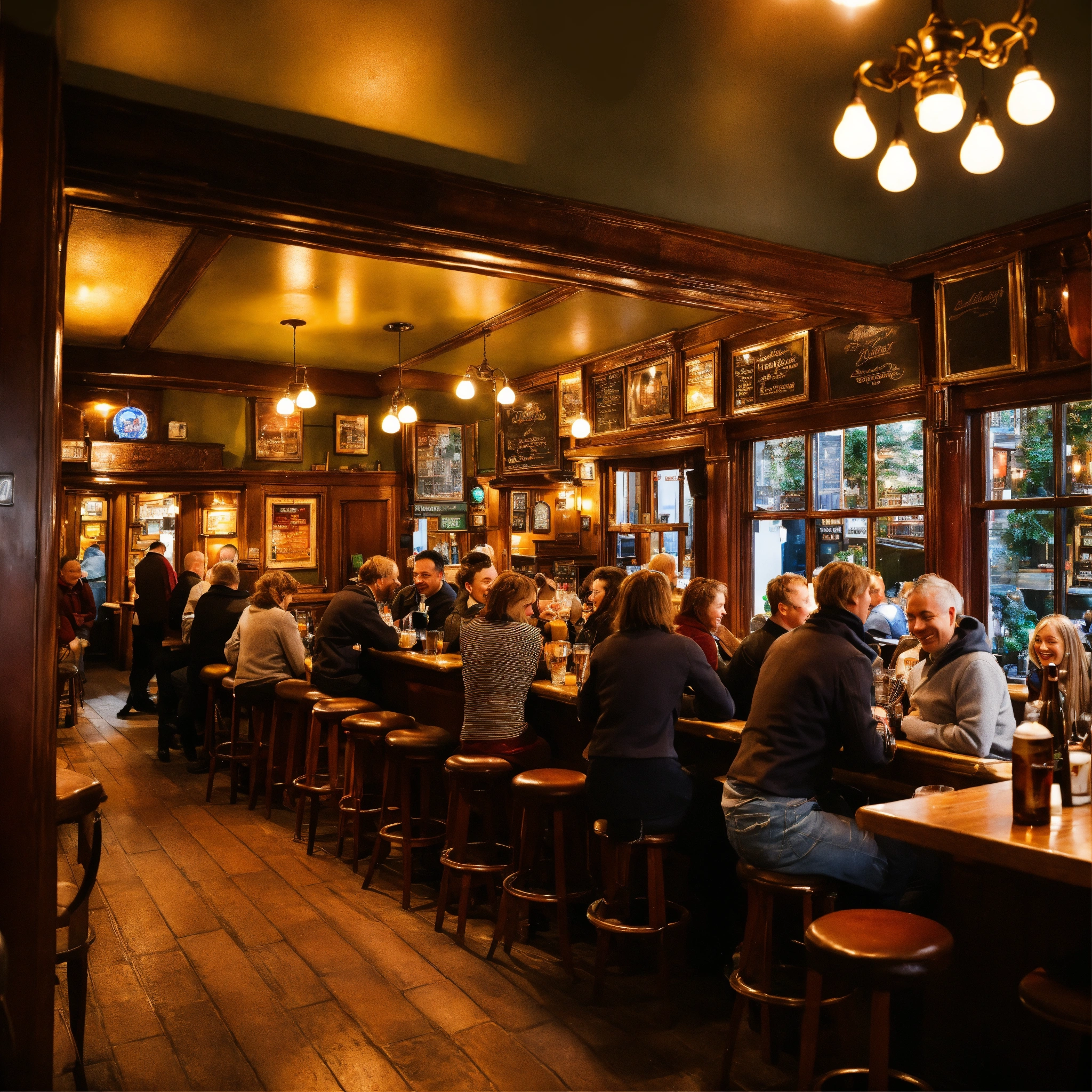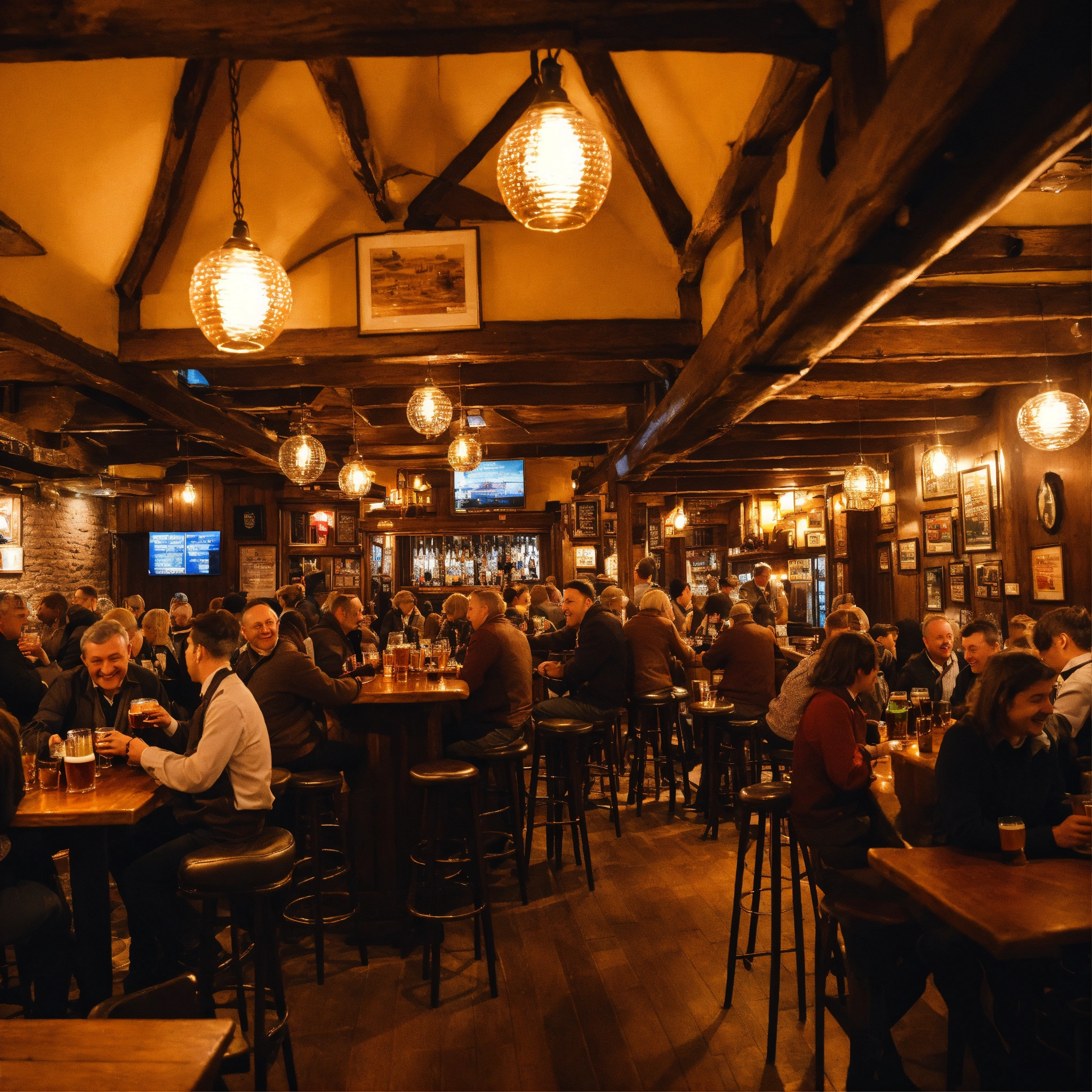 A photo of a busy pub, the pub is crowded with people enjoying a drink and a meal, the atmosphere is lively and cheerful