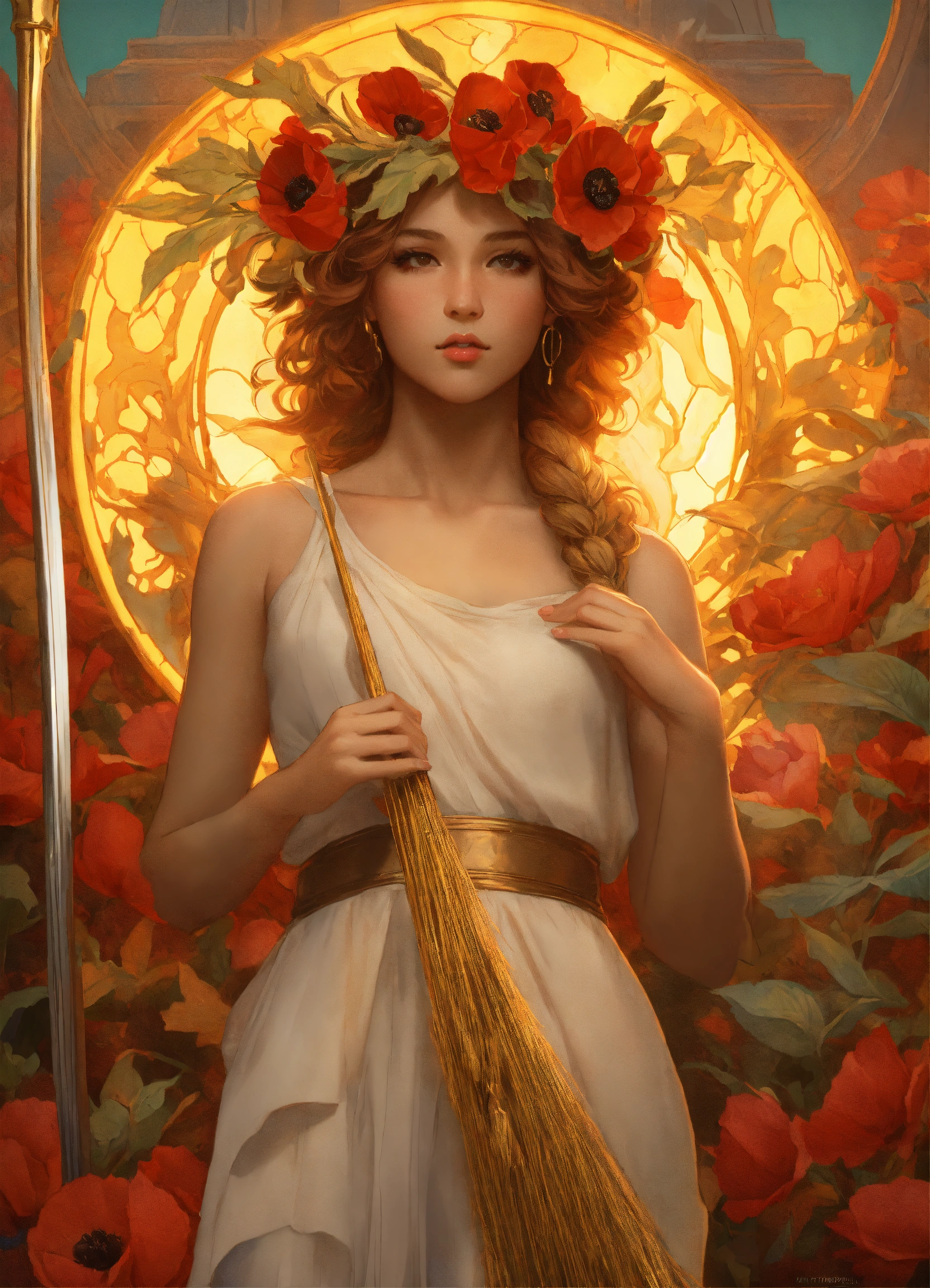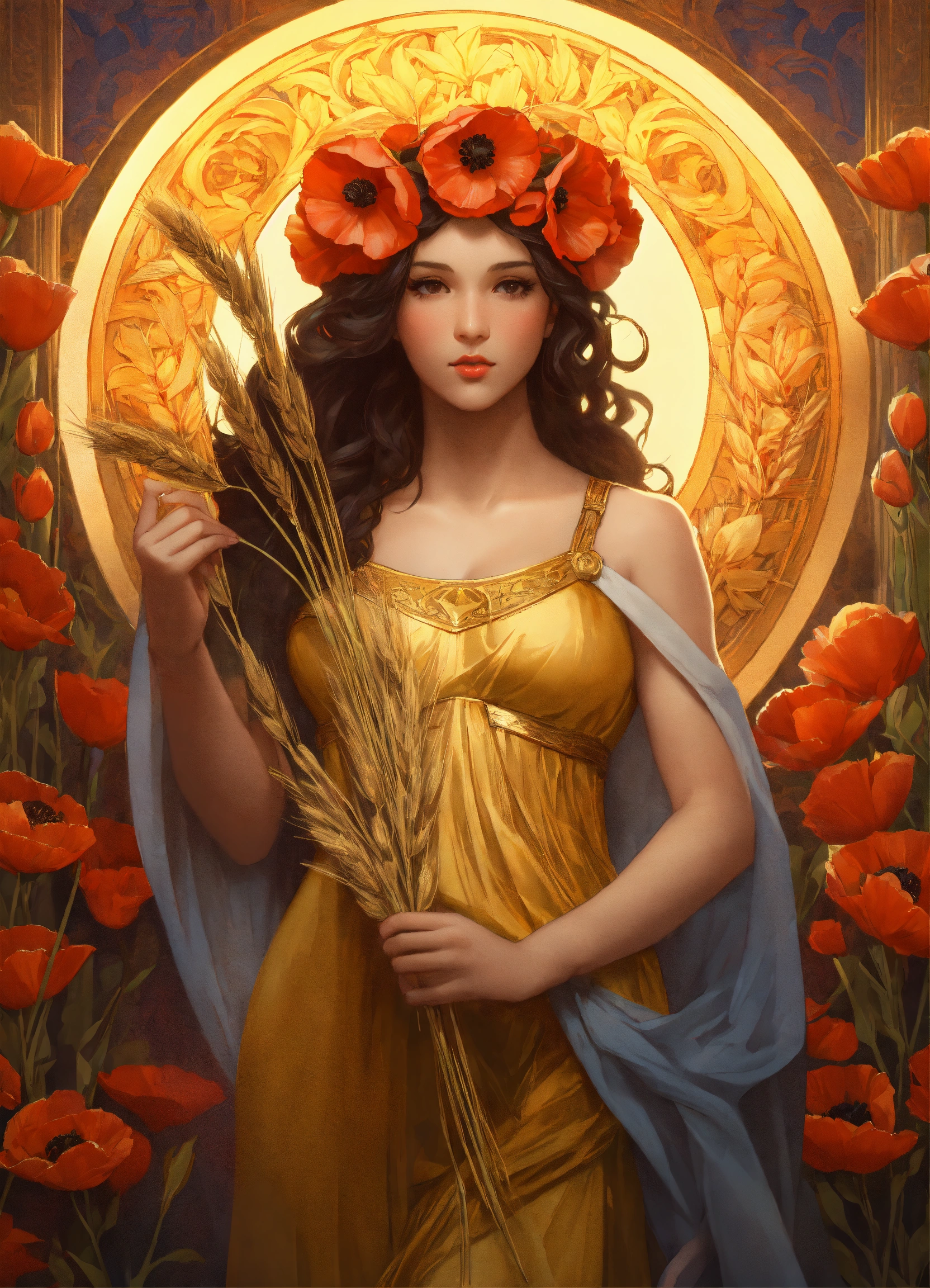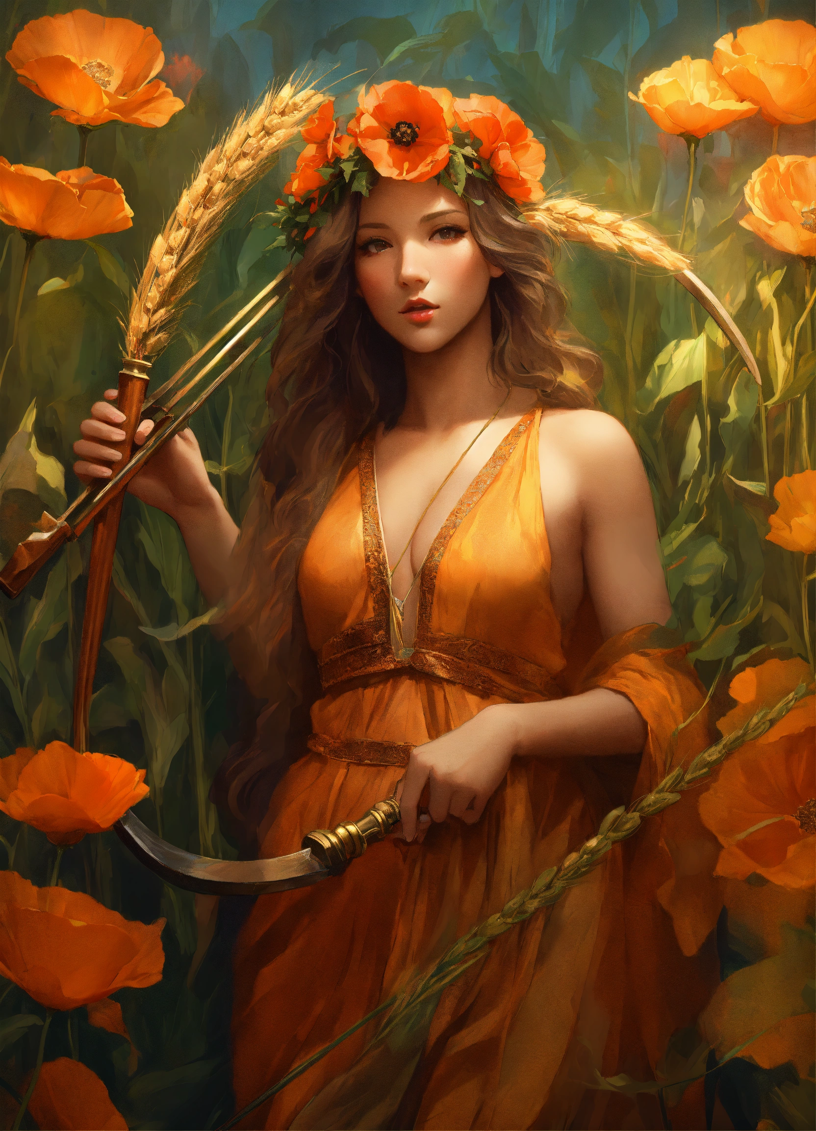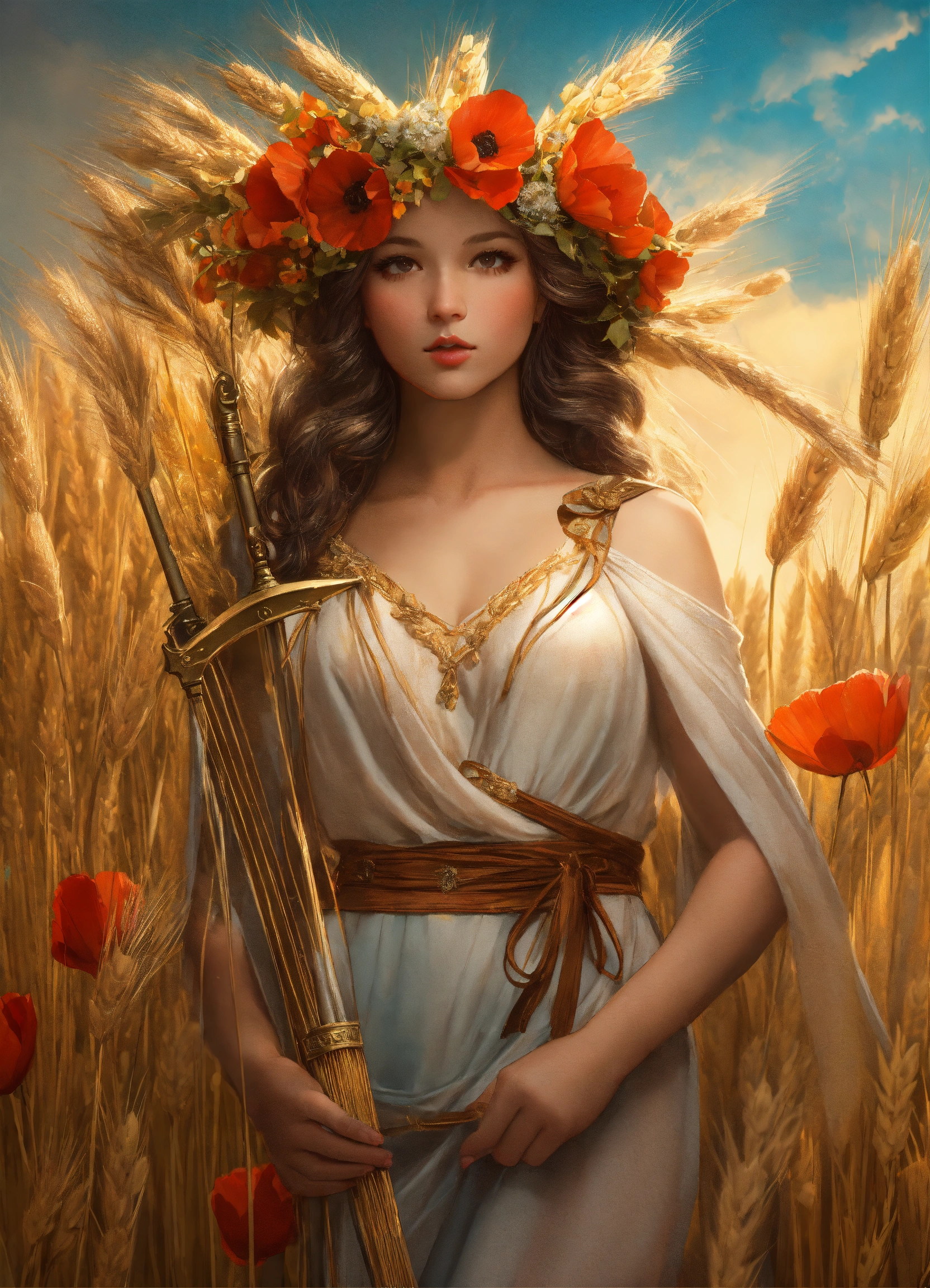 Greek goddess demeter with poppy crown, holding sheaf of wheat and scythe, art by artgerm and greg rutkowski and alphonse mucha and william - adolphe bouguereau and stephanie law, 8k, dynamic lighting, colorful lighting, clean, smooth, elegant, beautiful, highly detailed, sharp focus, studio photography, xf iq 4, 1 5 0 mp, 5 0 mm, iso 2 0 0, 1 / 1 6 0 s, realistic, natural light, octane render, adobe lightroom, rule of thirds, symmetrical balance, depth layering, polarizing filter, sense of depth, ai enhanced
