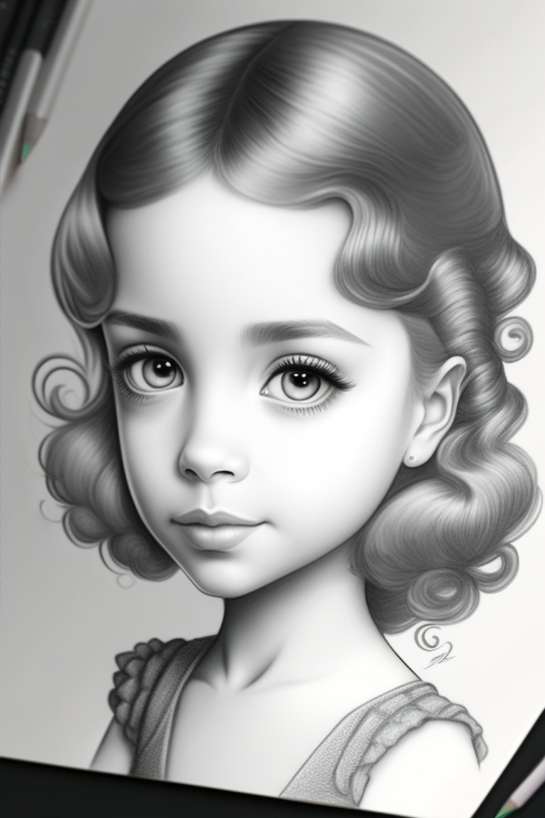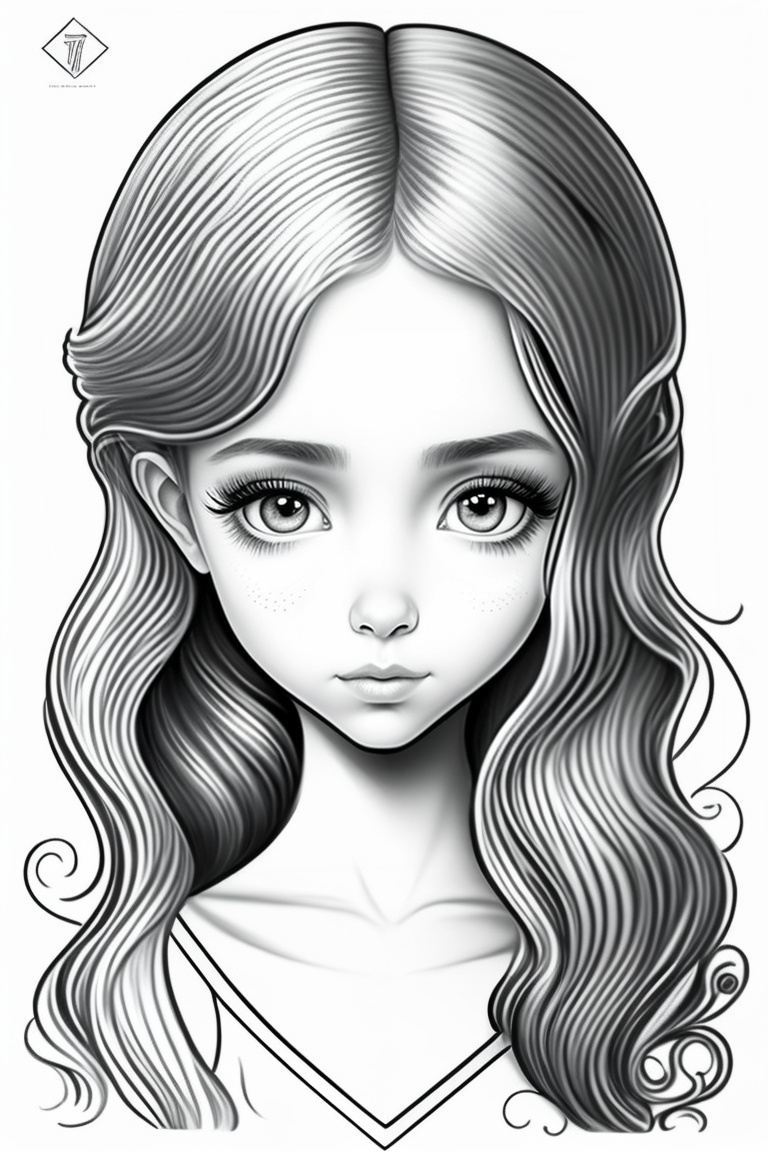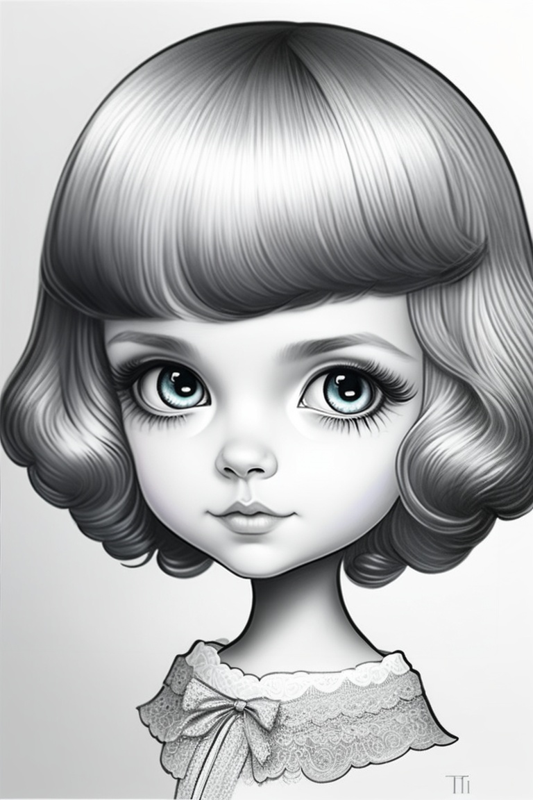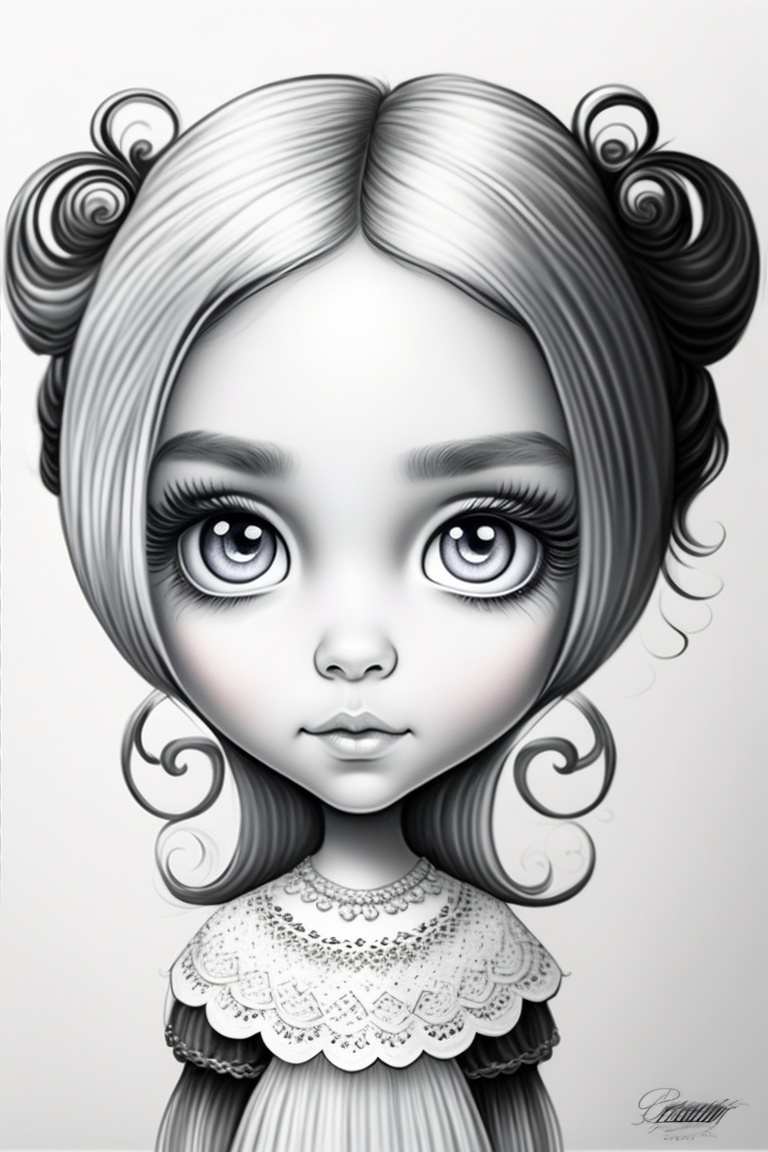 Pencil drawing, hand drawing, black and white, a beautiful girl, round head, big head, big eyes, set eyes, small nose, small mouth, wavy hair, big neck, slender neck, small delicate body, tim burton style, monster high style, high definition, surrealism, coloring page book