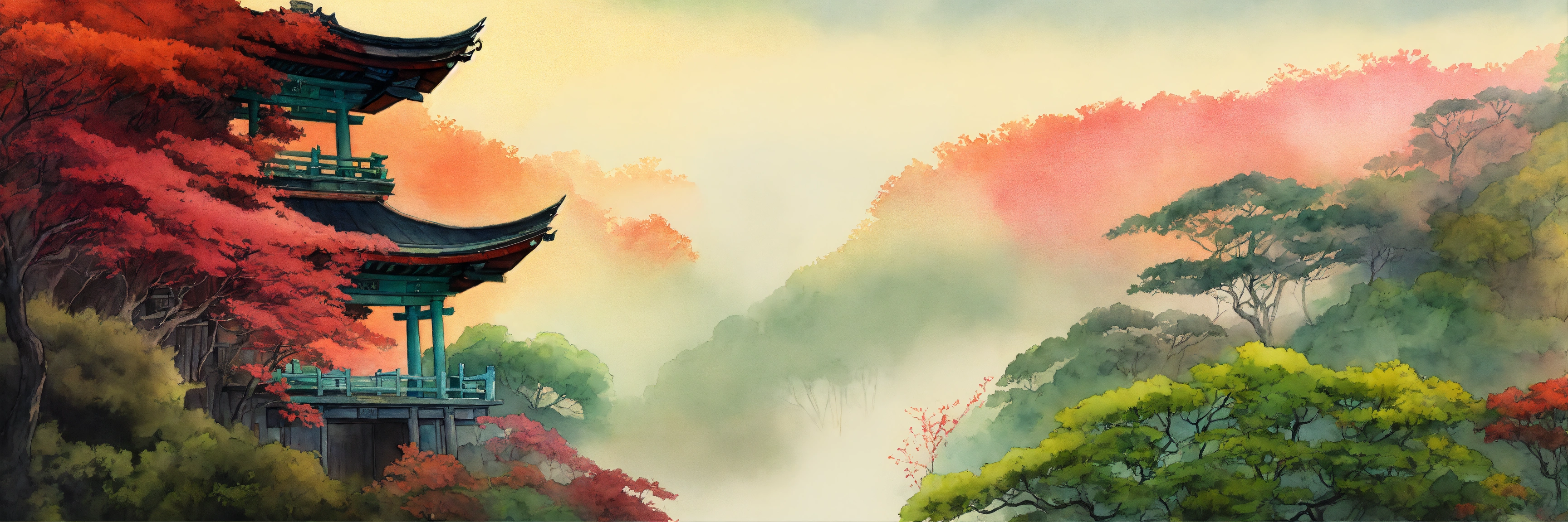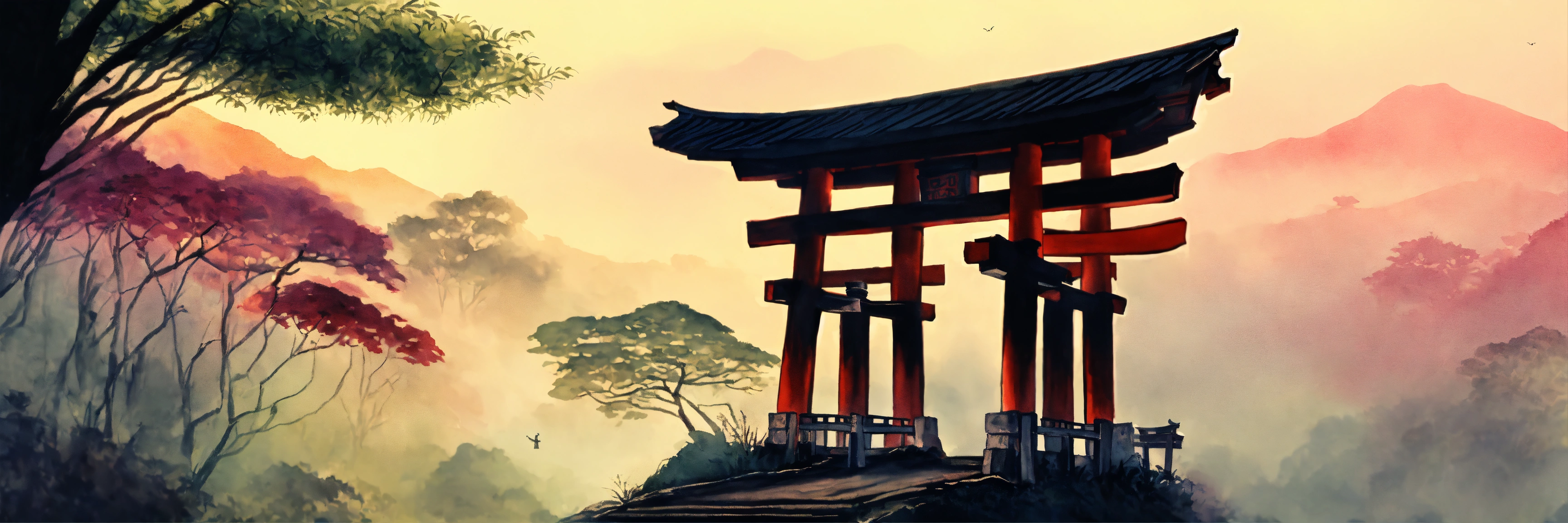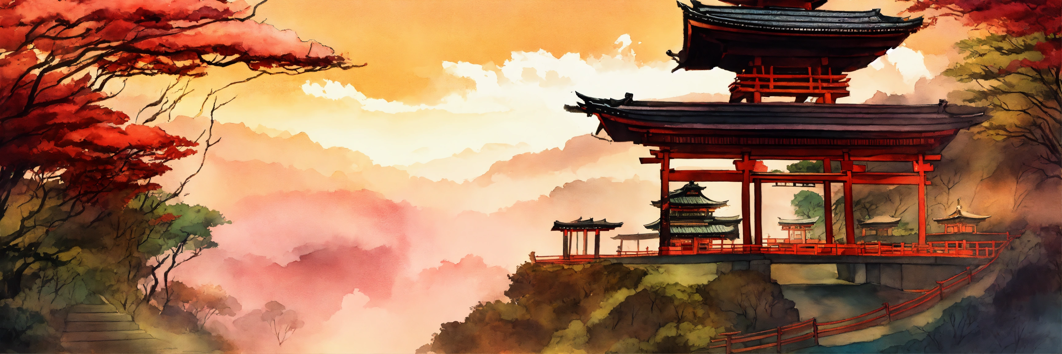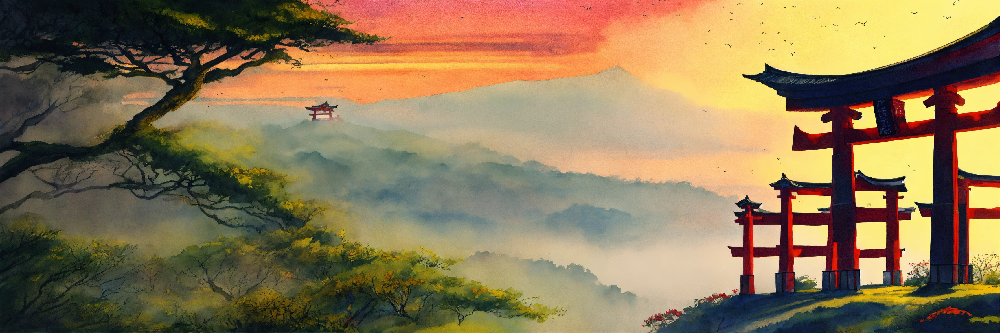 Exquisitely rendered architect’s drawing of one torii gate and one shrine on a misty jungle hilltop in style of loraaqua 1.0, moody, dramatic, atmospheric, mystical, vivid palette, a masterpiece, strong colours, high contrast, perfect composition, meticulously detailed ink pen and watercolour, fine detail, precise colouring, vivid colours, clean precise lines, detailed illustration