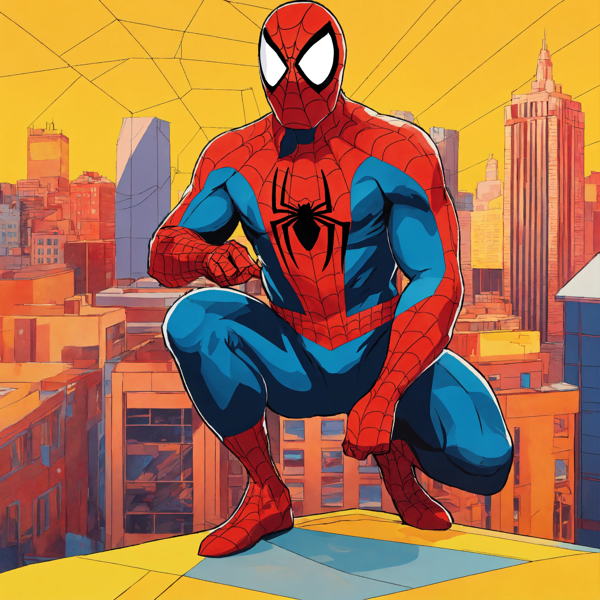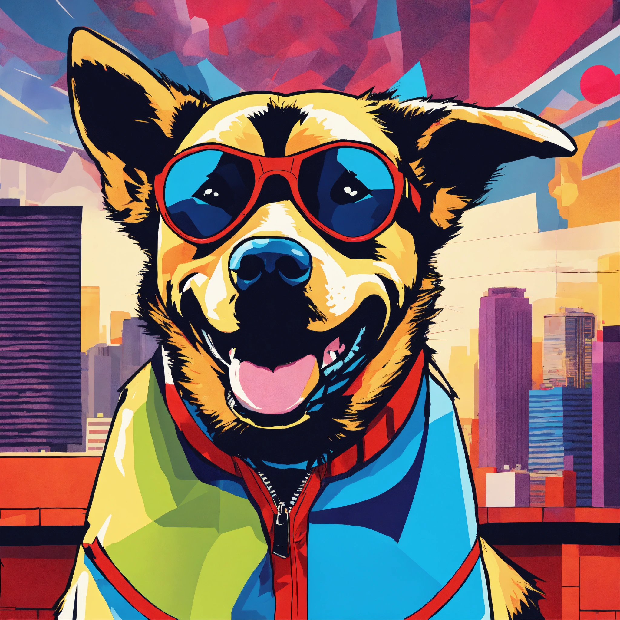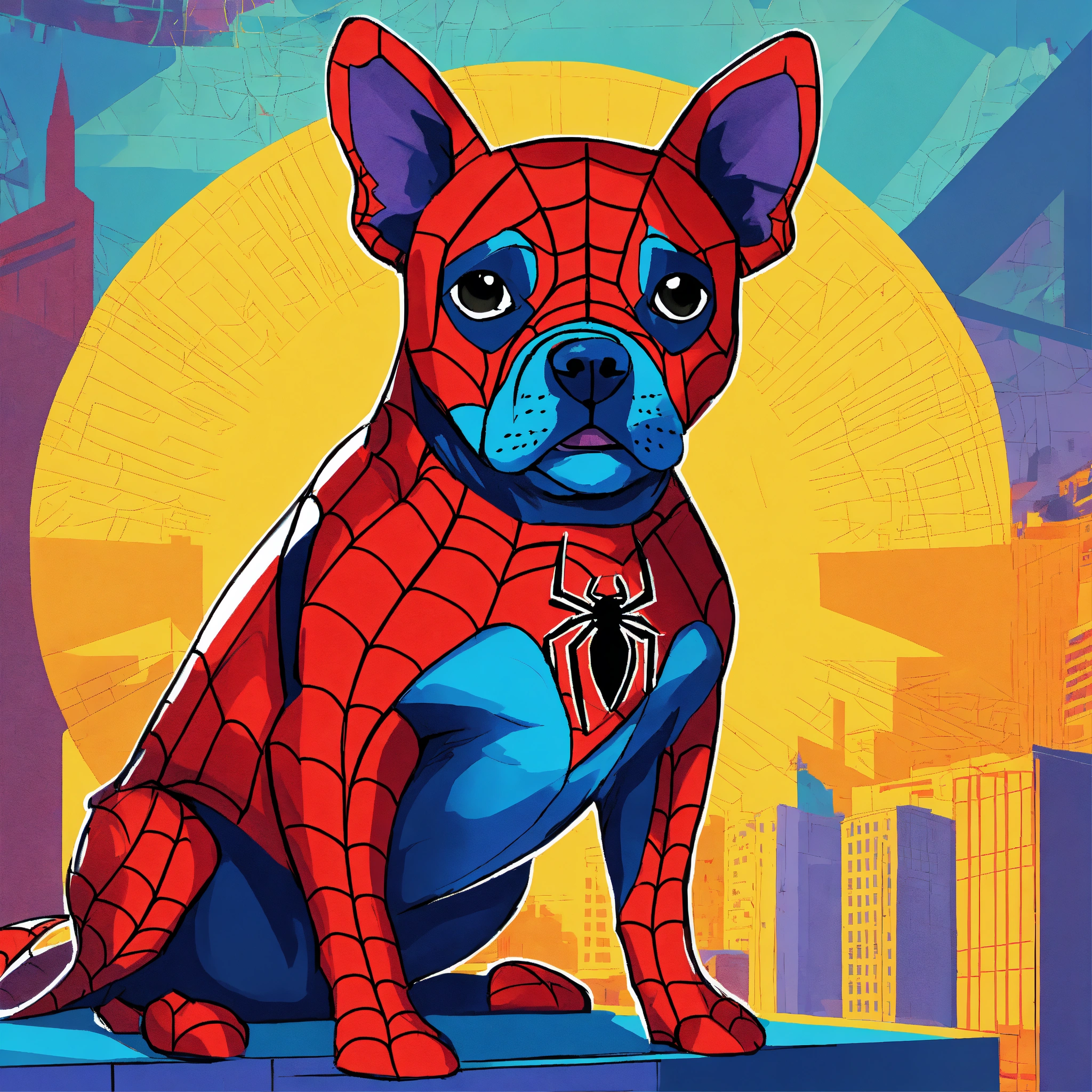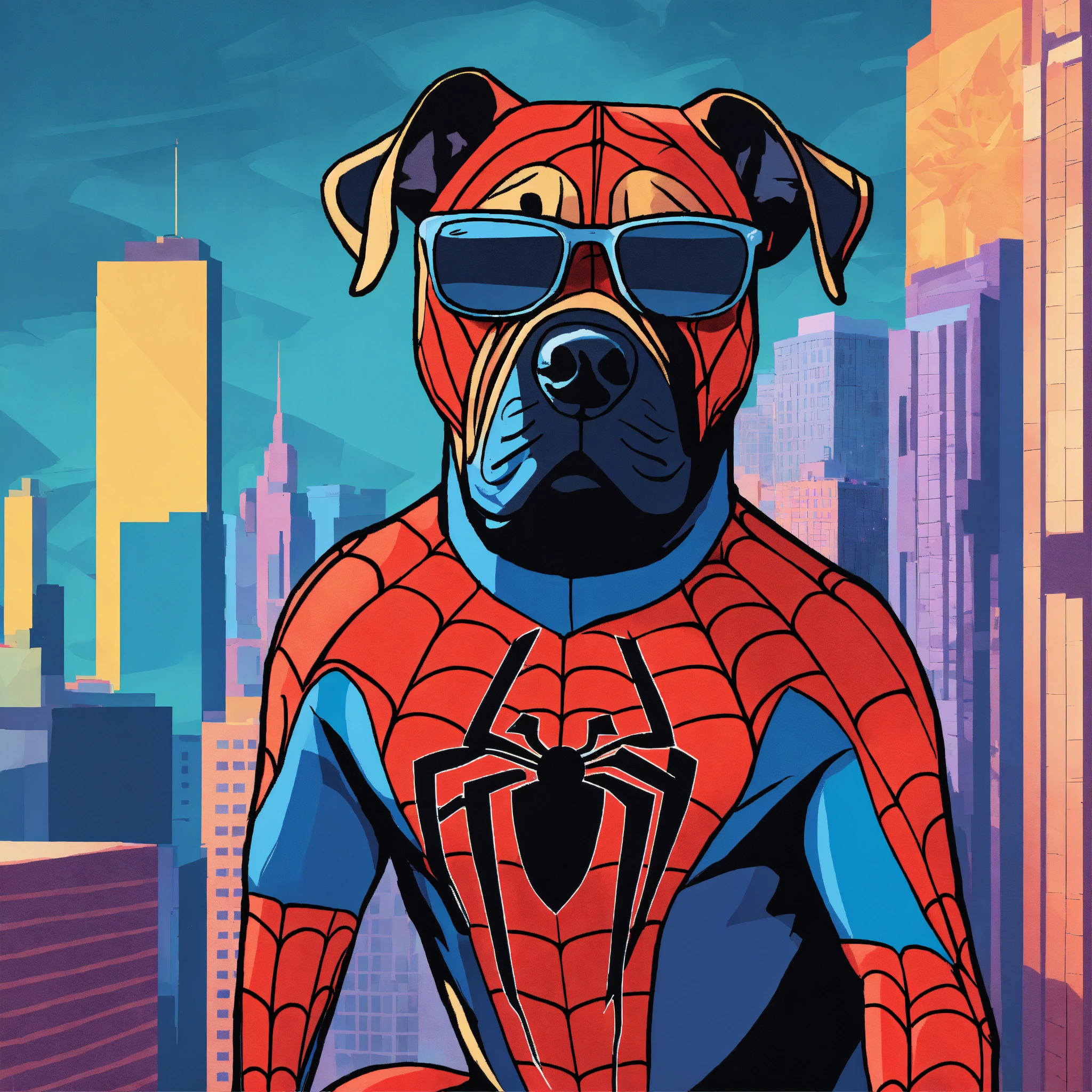 Generate a pop art masterpiece featuring a dog dressed like a spider-man like superhero figure as the central character. utilize primary colors and geometric shapes to capture the essence of the style. the character should embody a pixar like, fun persona, striking a dynamic, energetic pose. complement this with a backdrop filled with fun, city backdrop.