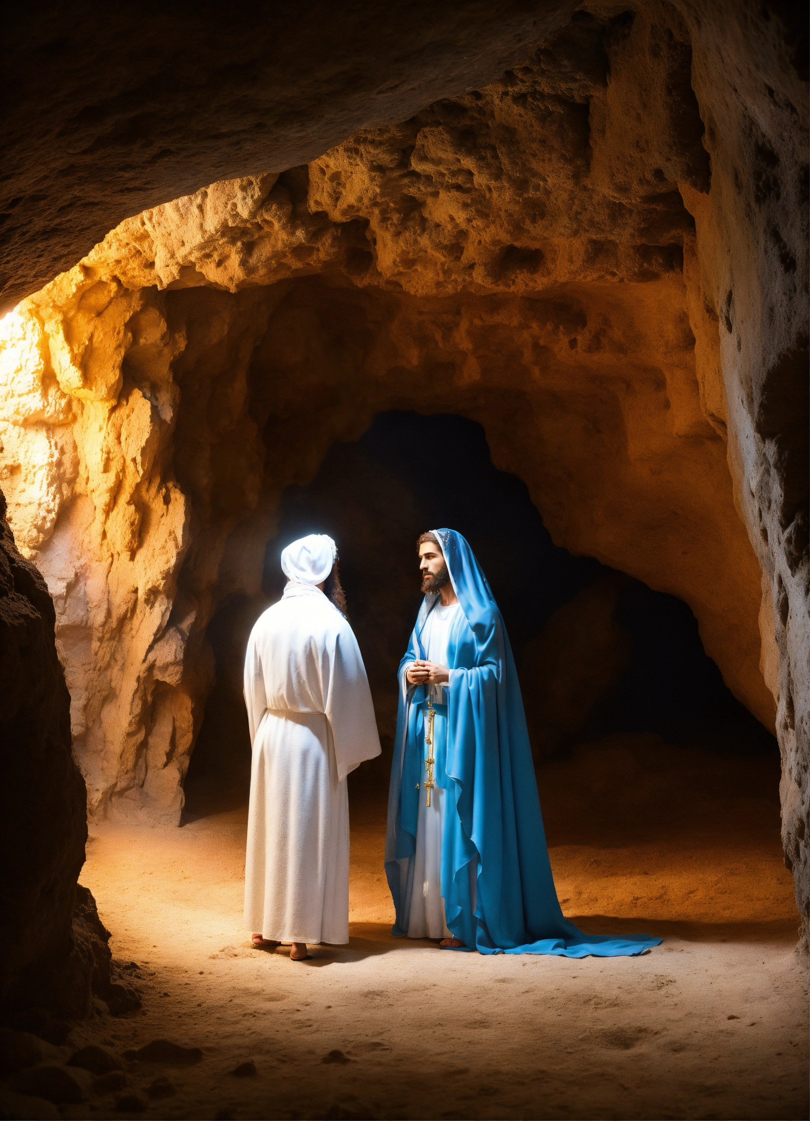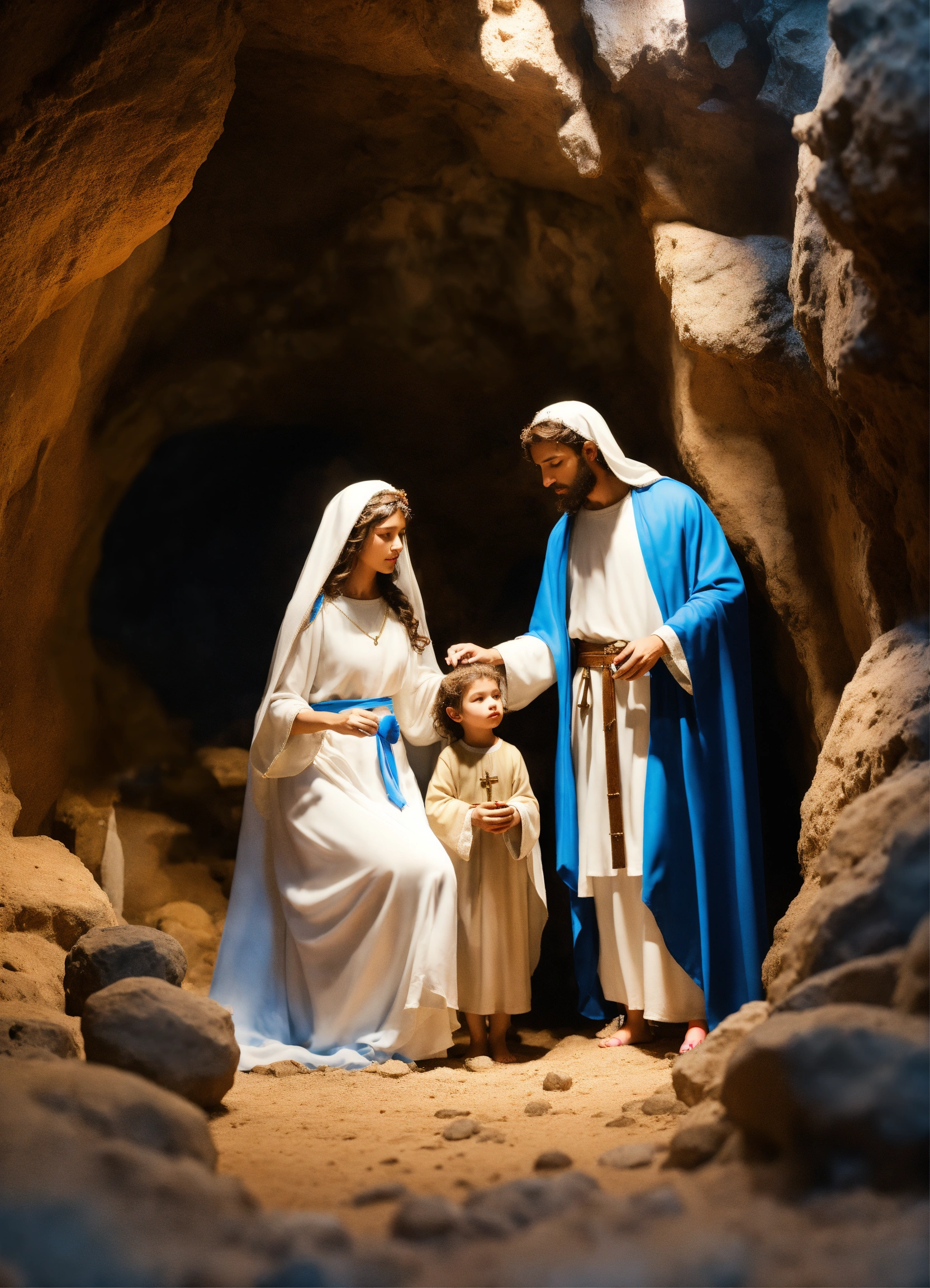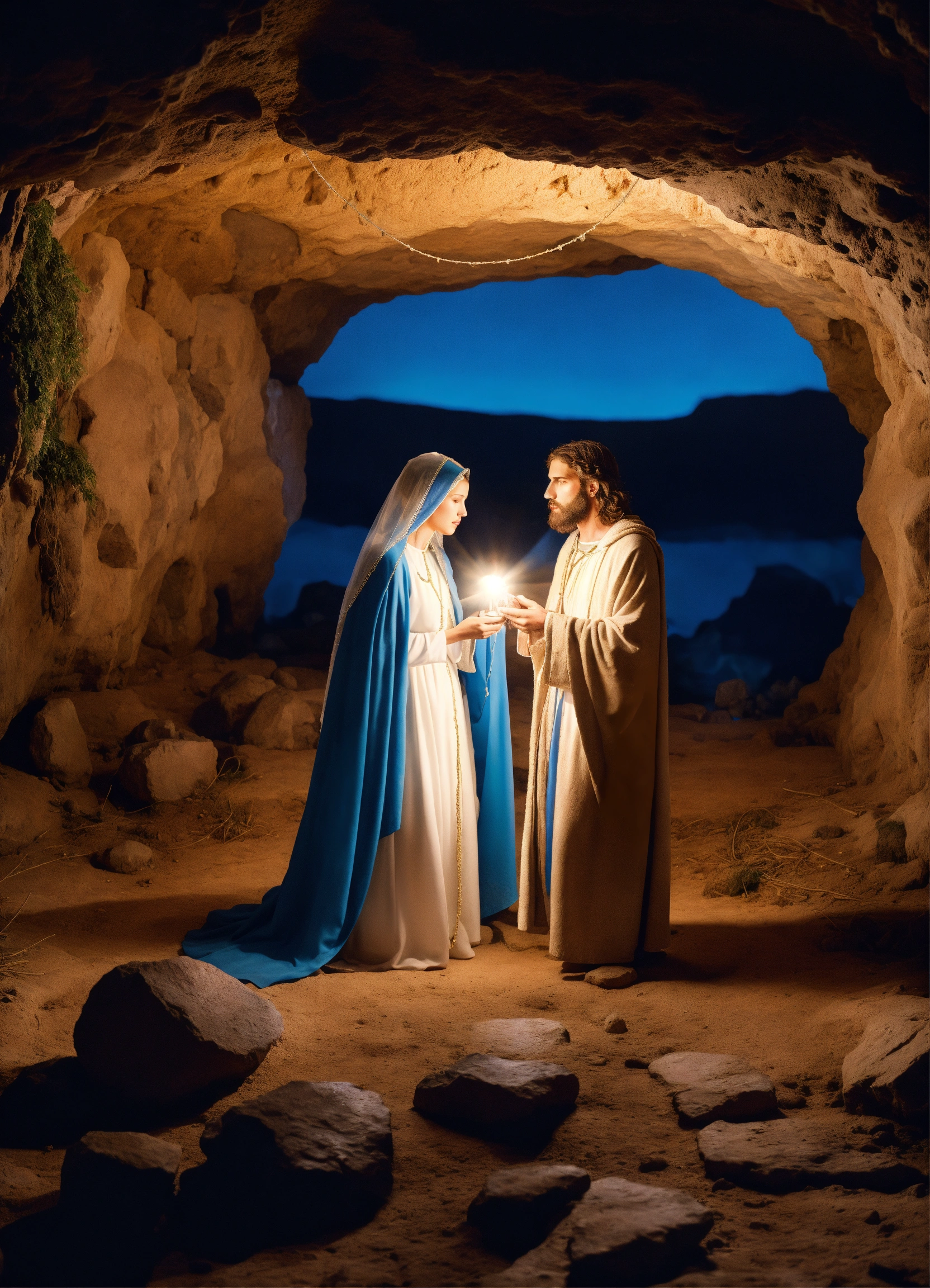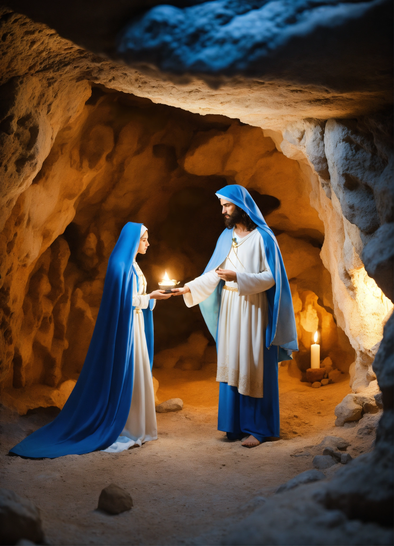 Nativity of jesus, inside a cave. photographic. ultra realistic. 8k. virgin mary dressed in a white dress with a blue veil, and saint joseph dressed with a brown tunic, entering a cave.