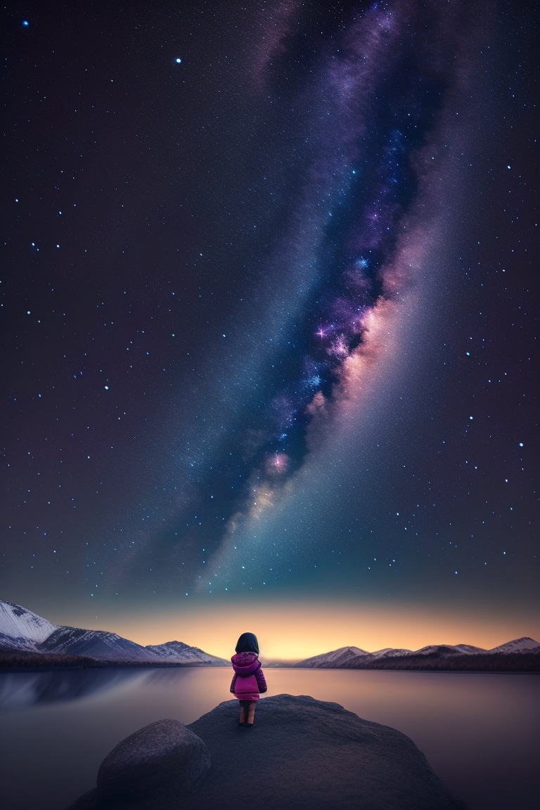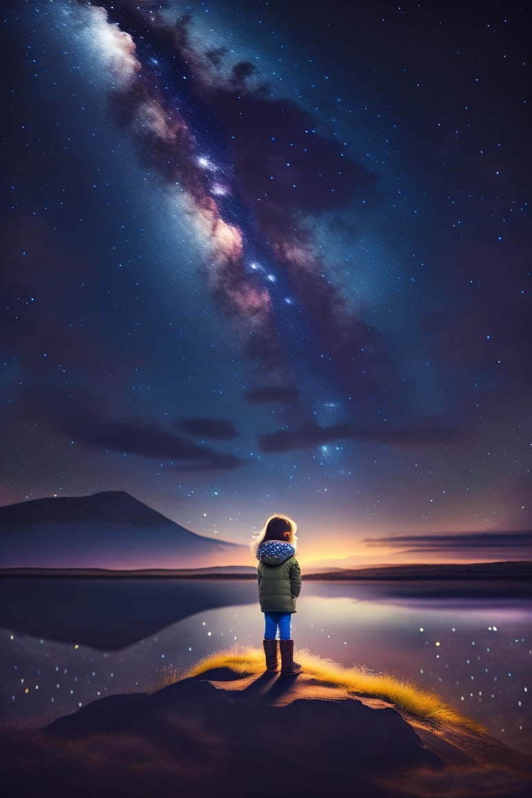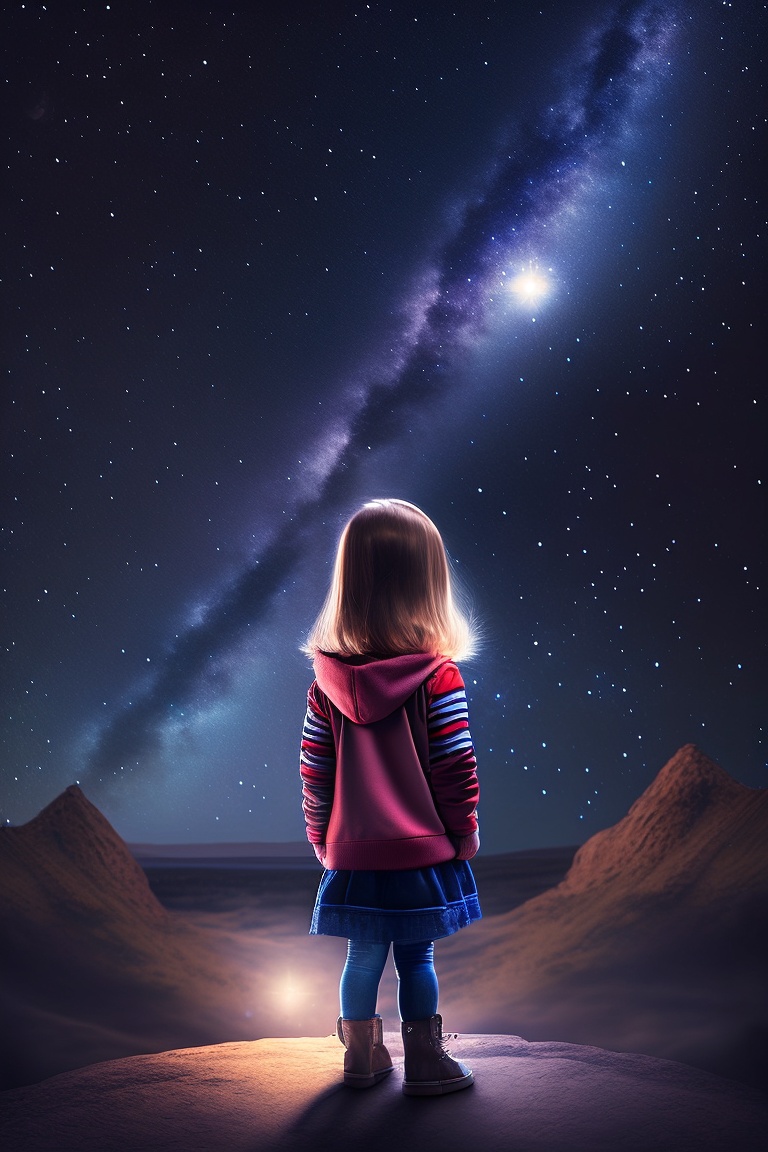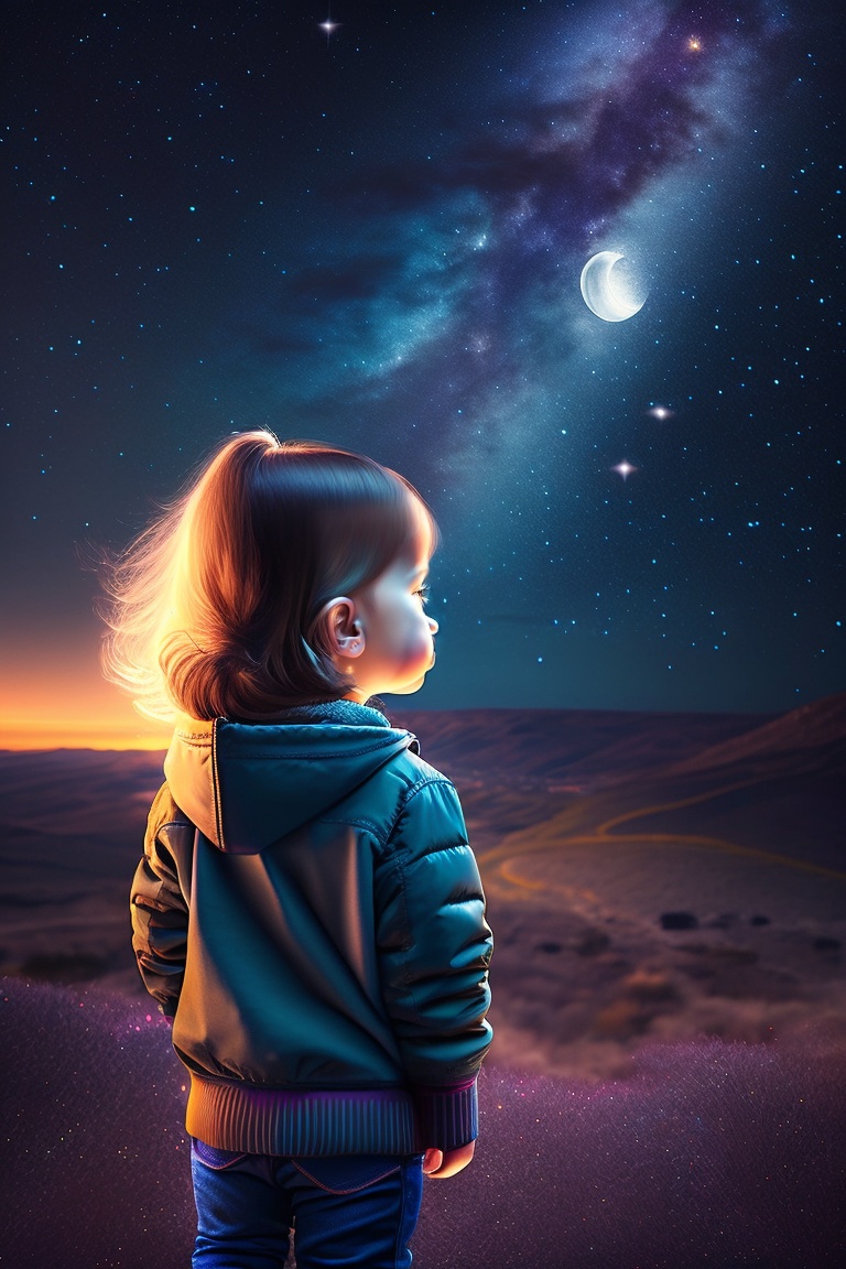 Little girl staring at the night sky, moon, many stars, alone, dark, child looking up, wishing, milky way