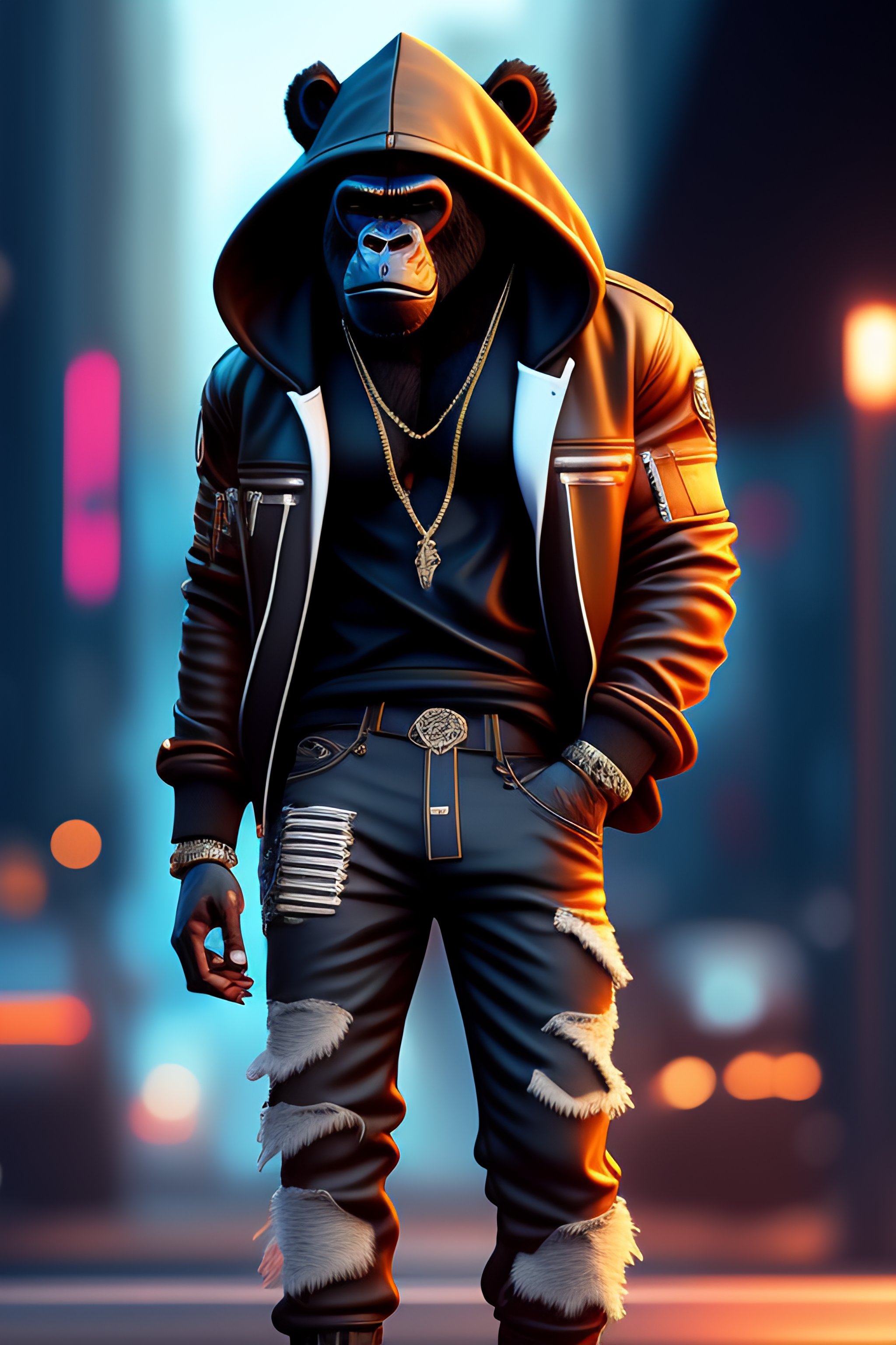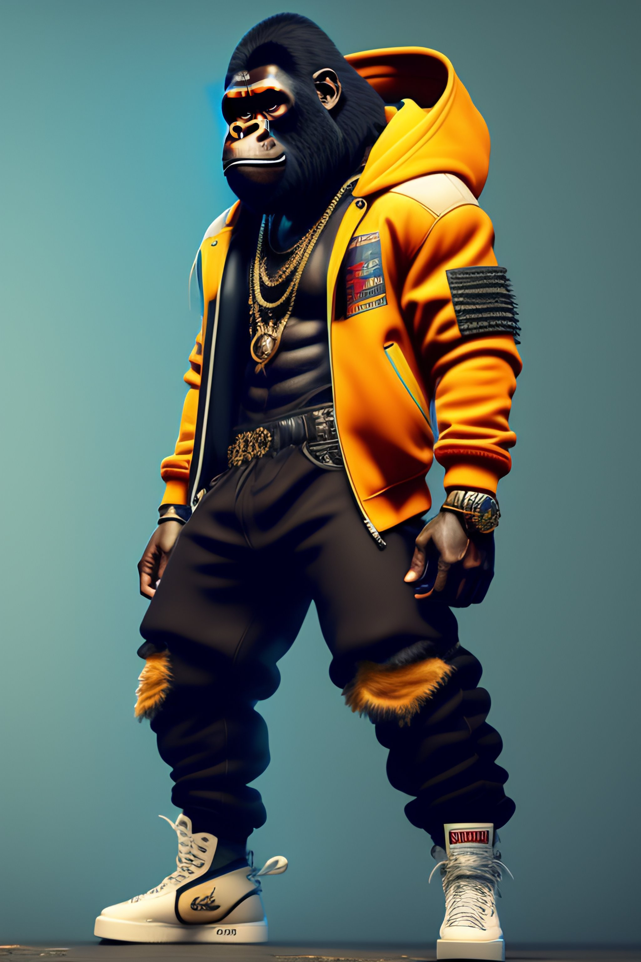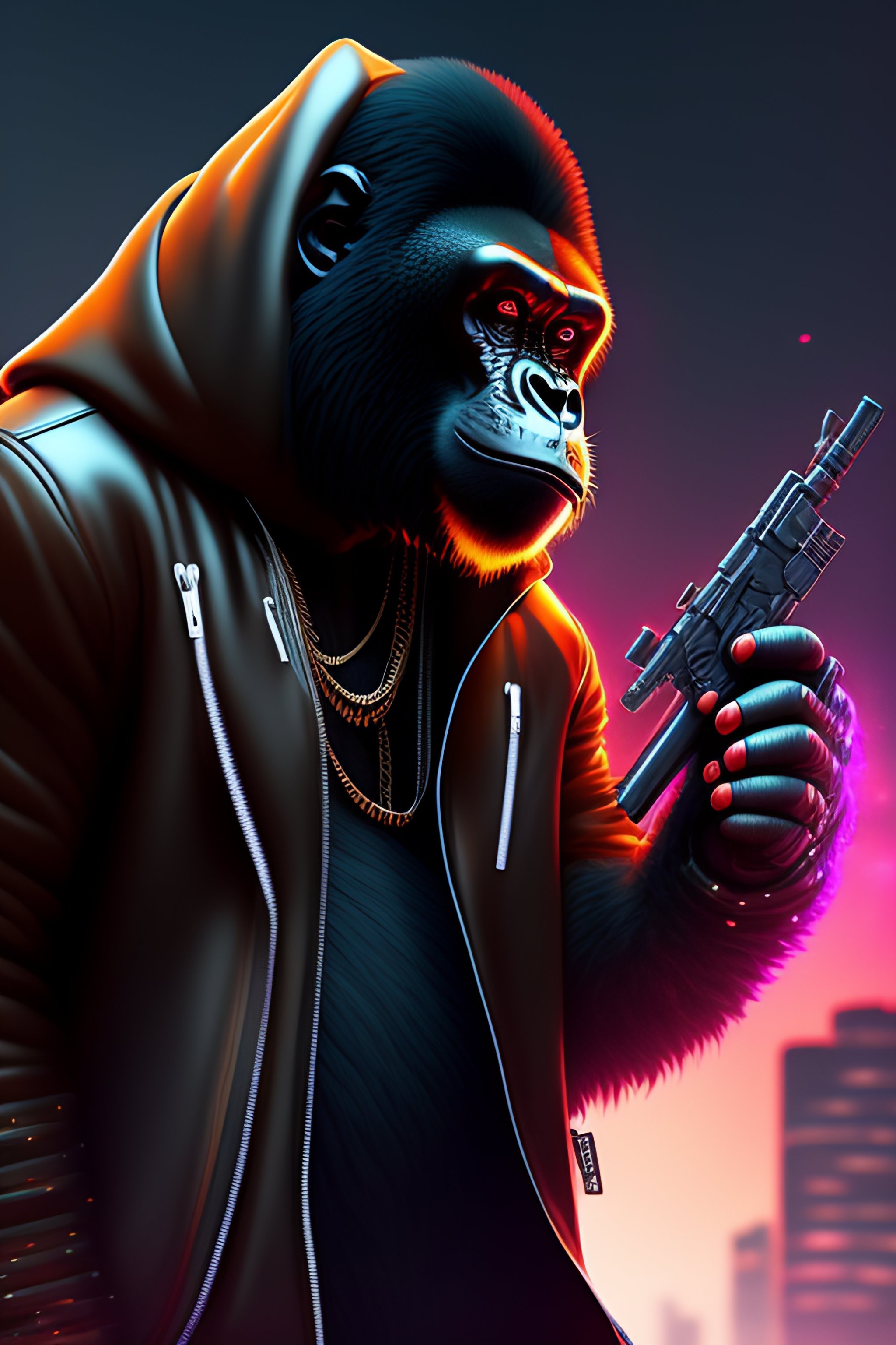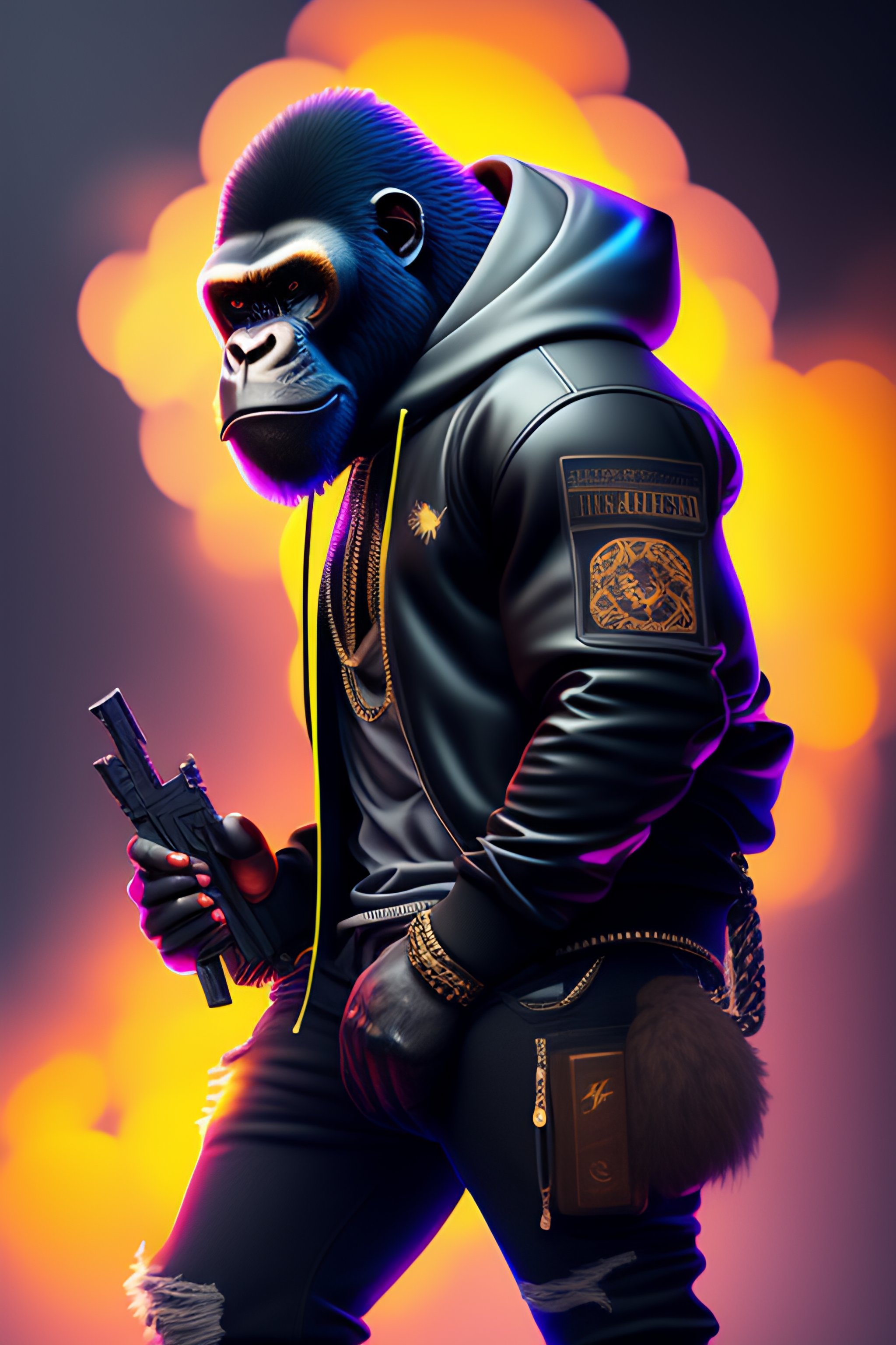 Anthro humanoid gorilla, hoodie and ripped jeans, pointing gun, hip-hop, character concept design, painting, detailed, vivid, trending on artstation, 8k, detailed lighting