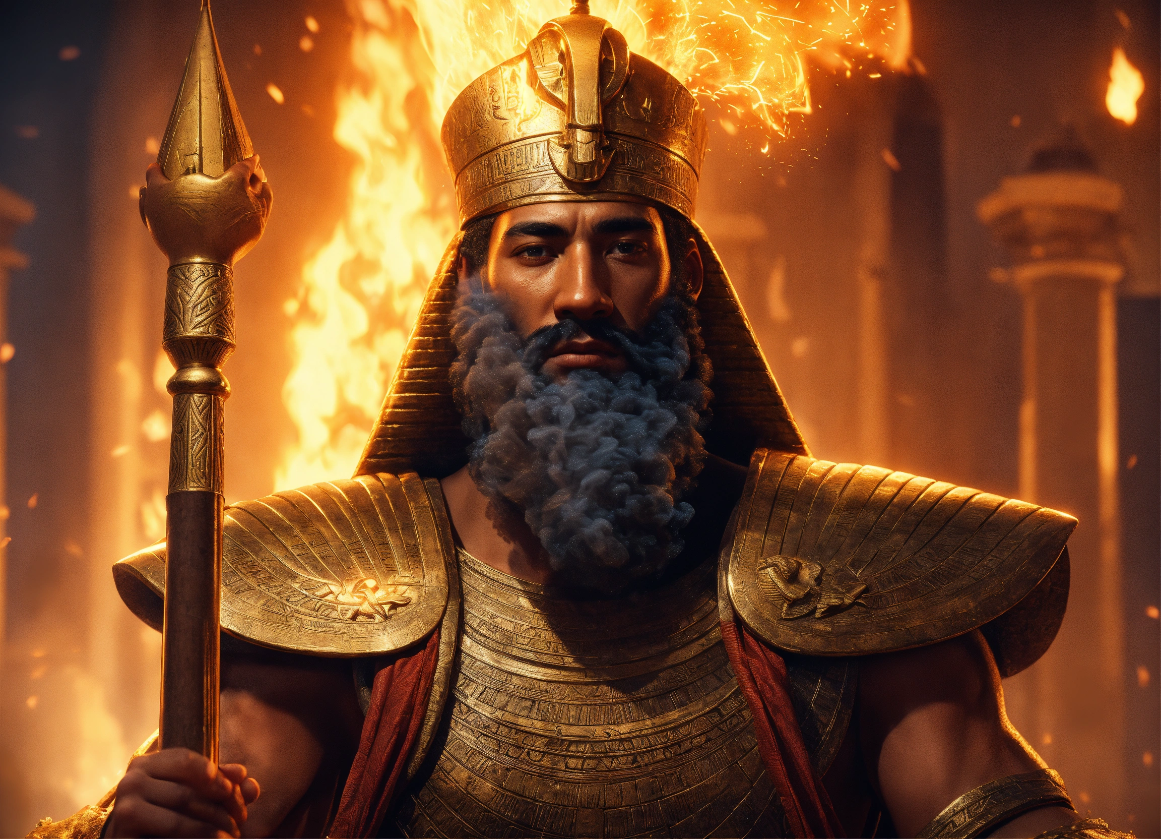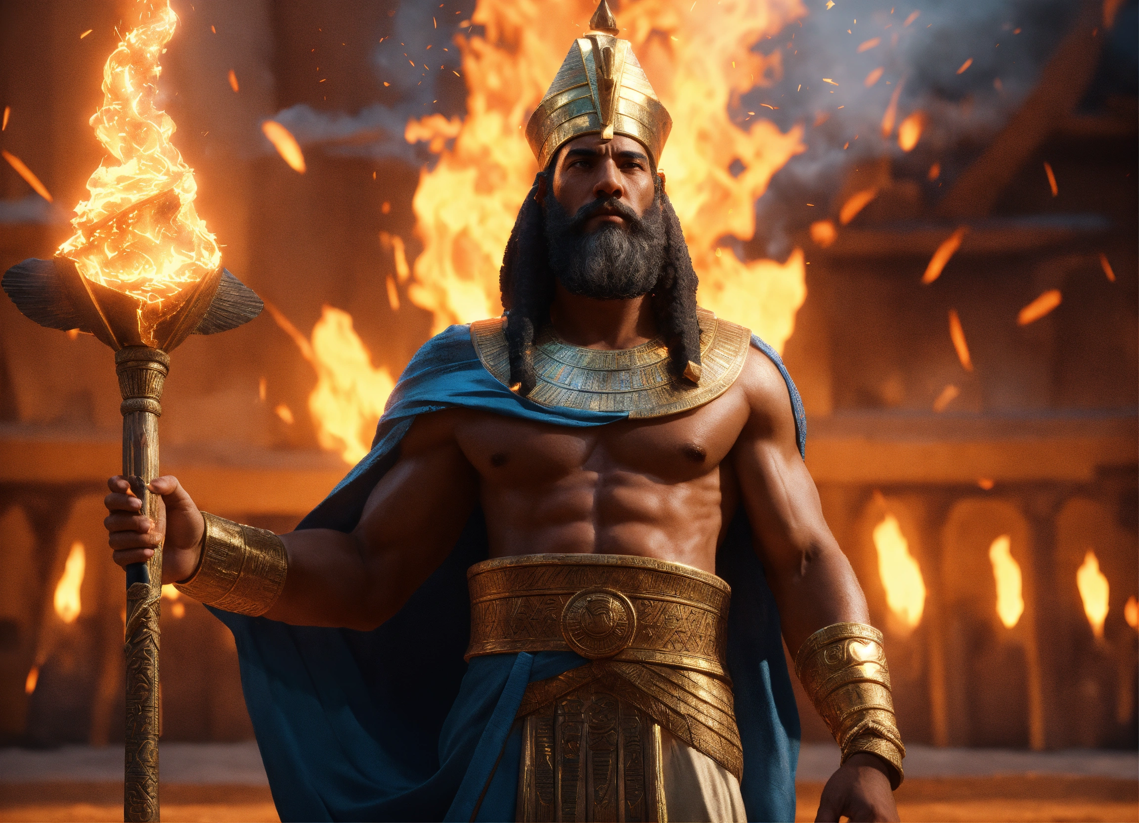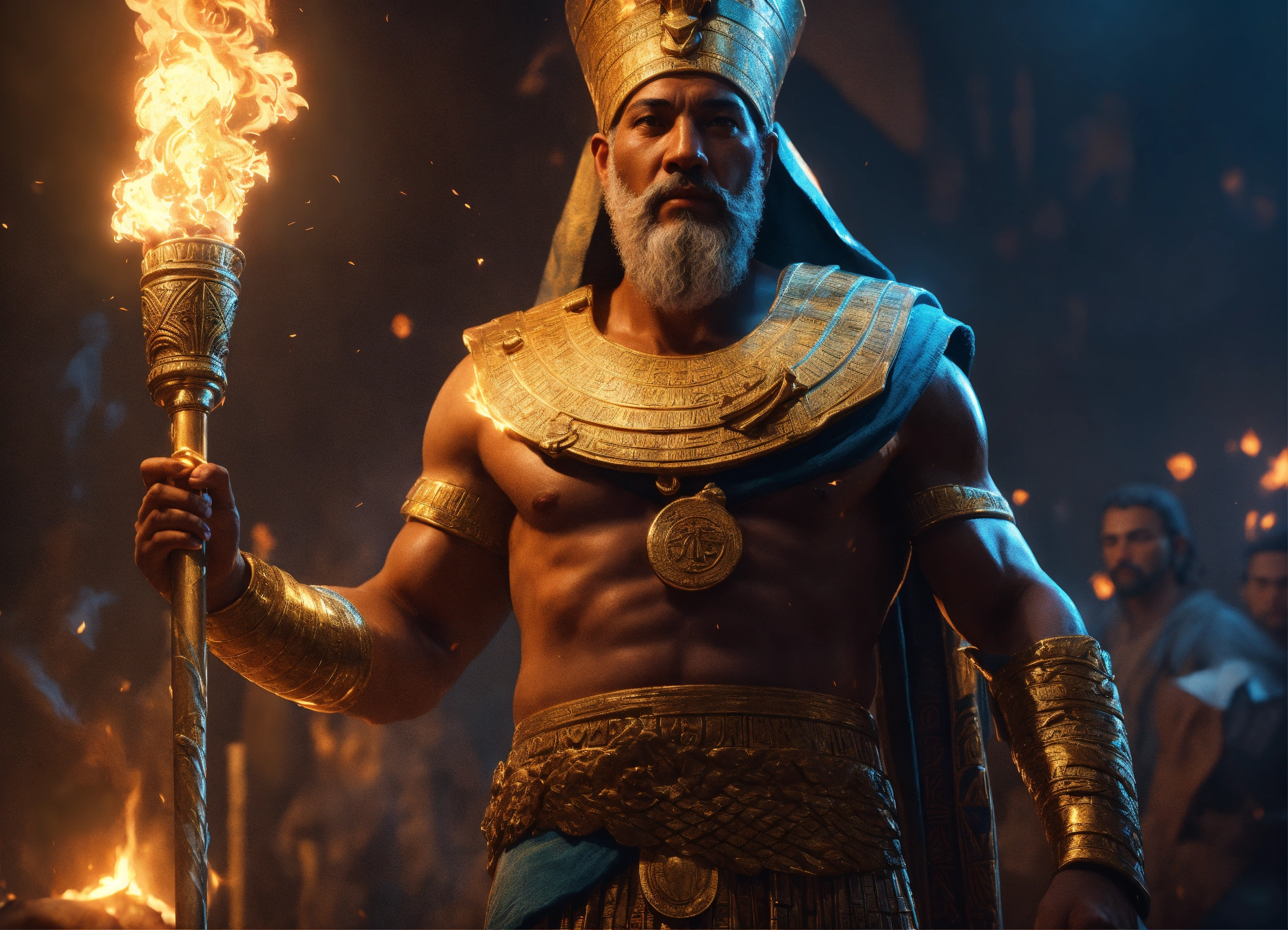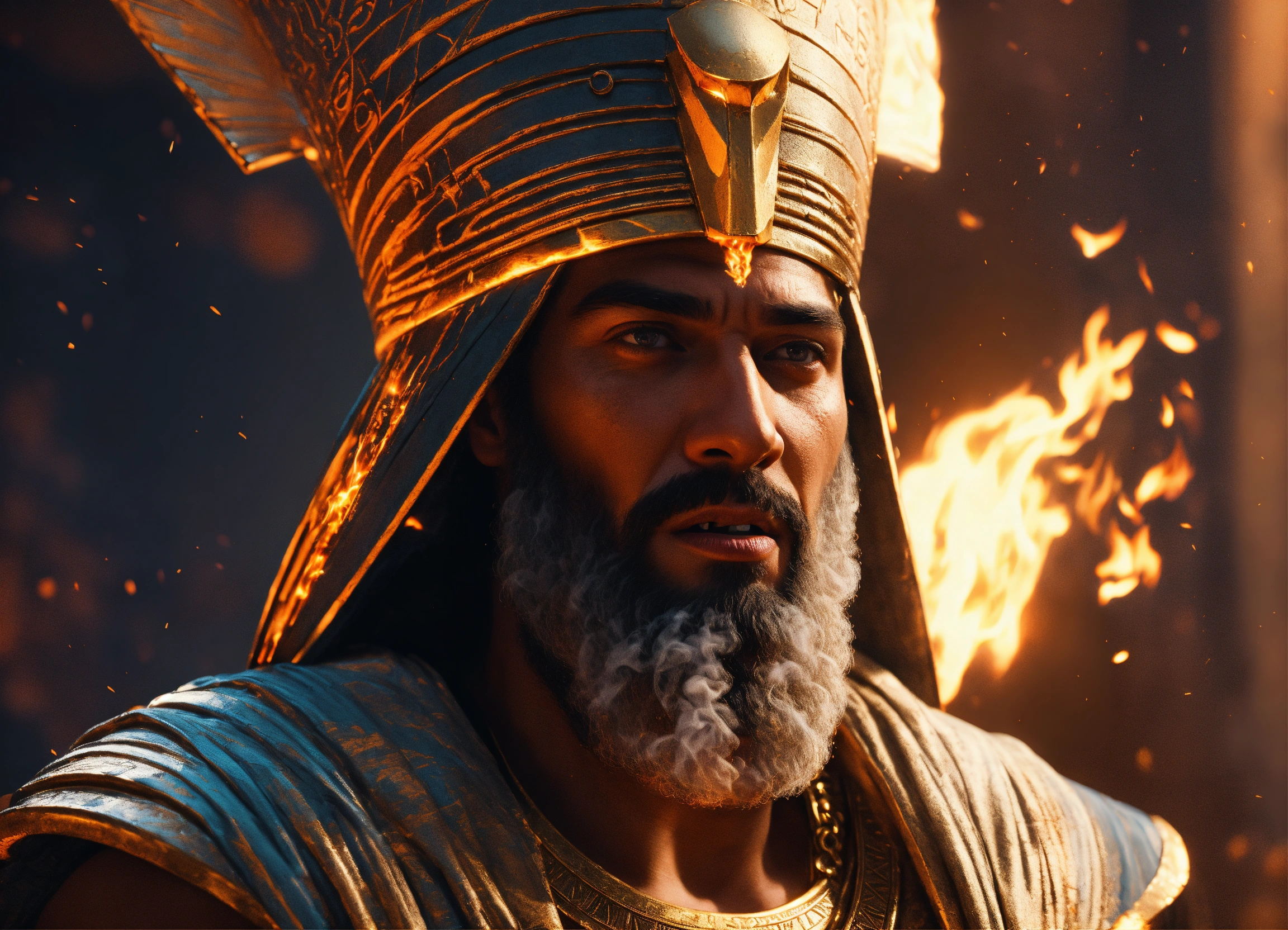 "moses with his staff in his hand, talking to the pharaoh of ancient egypt", flaming, smoke, embers, sparks, head and shoulders portrait, finely drawn eyes, concept art portrait in 8k resolution, intricately detailed hyper-detailed dynamic lighting trends splash art in artstation unreal engine 5 volumetric lighting