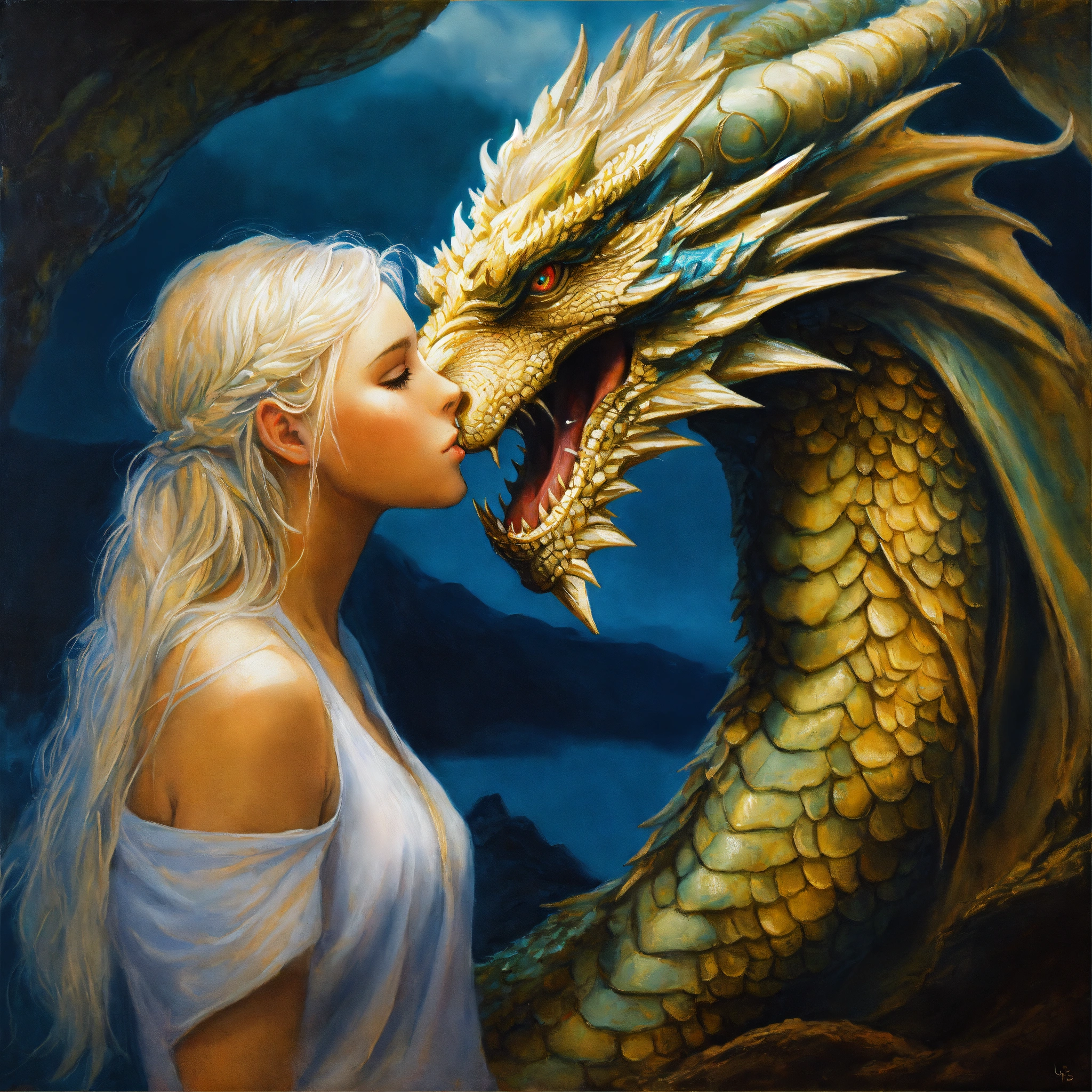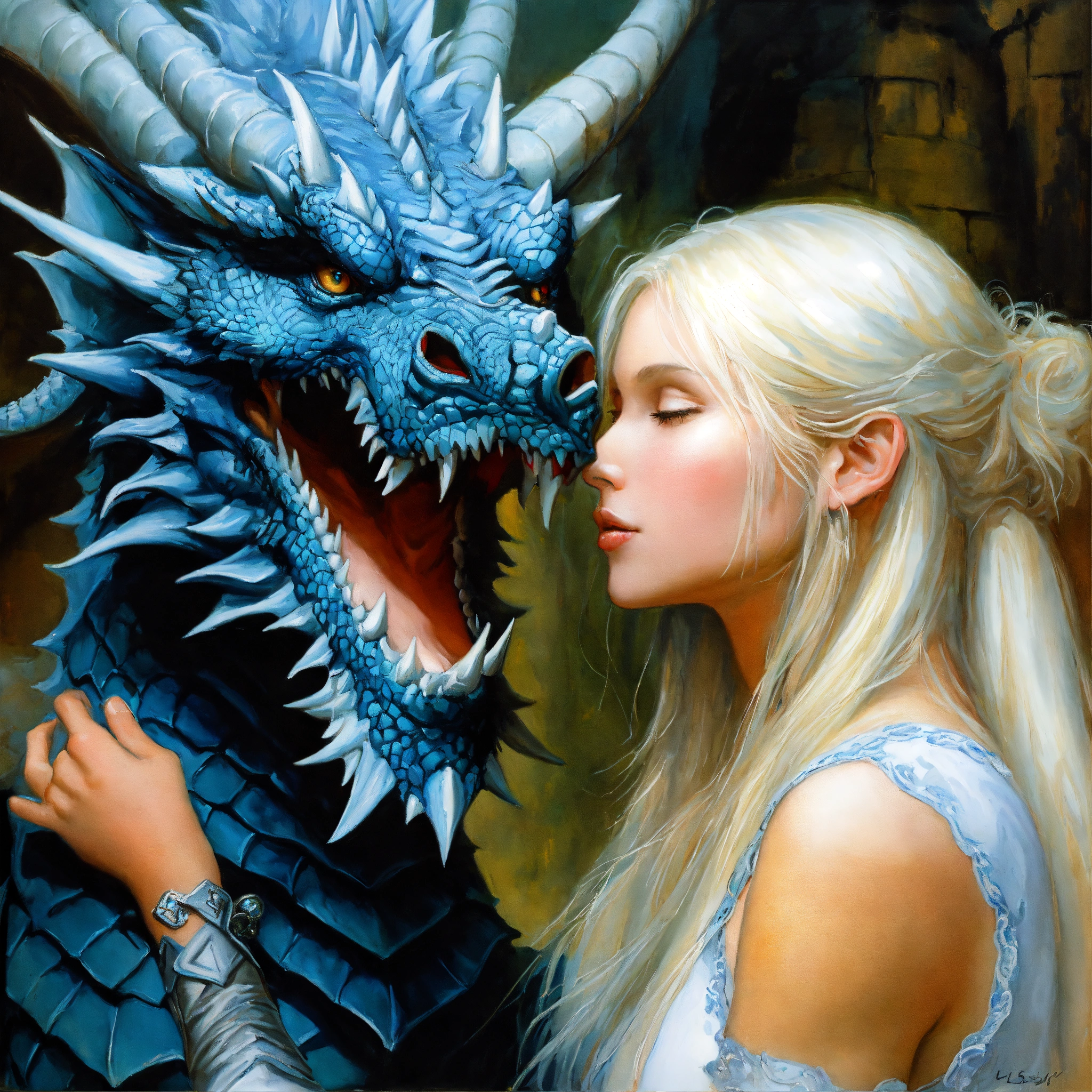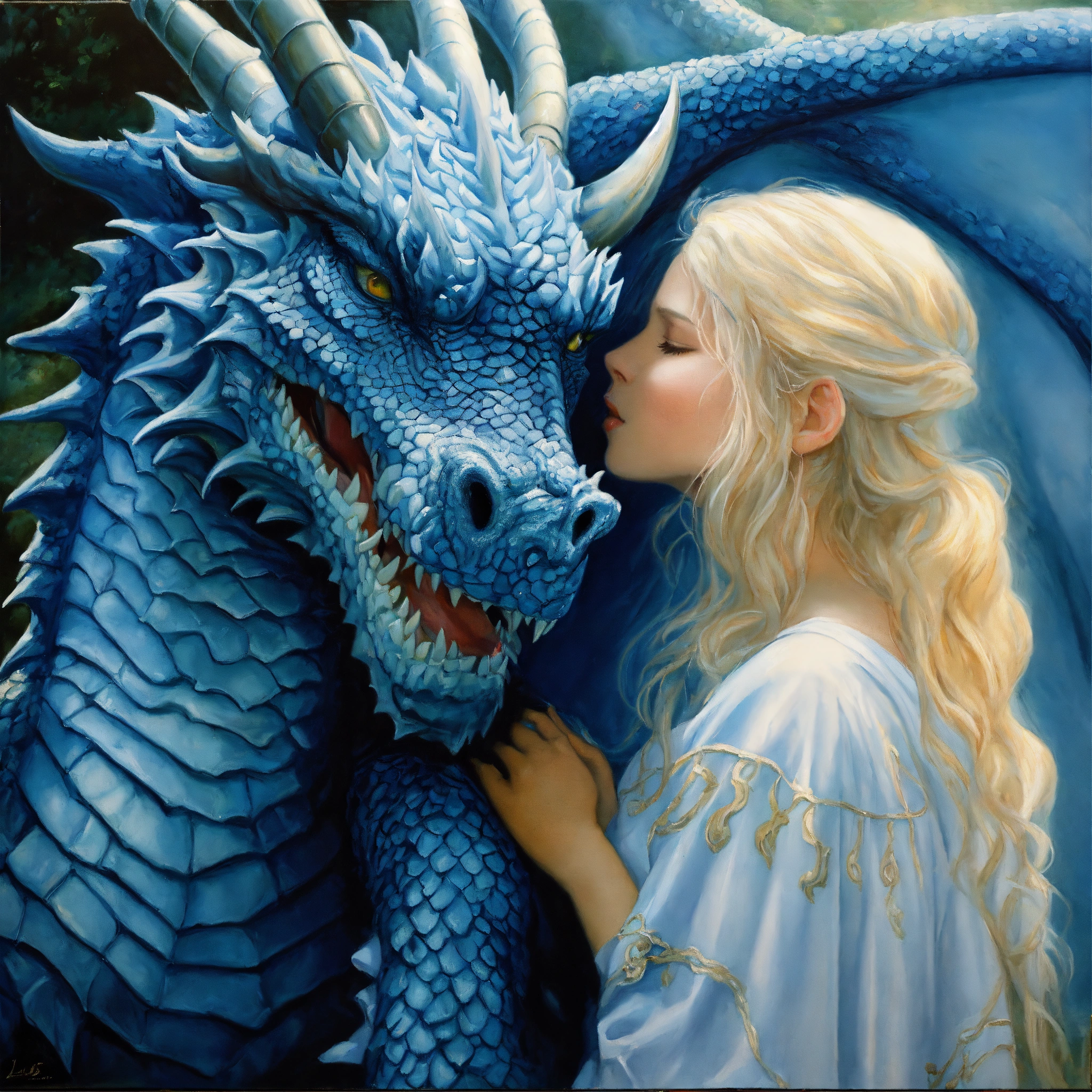 Oil painting of a huge magnificent two meter big blue dragon's head with a 15 year old white blonde elf girl lovingly hugging and kissing the dragon's head, the dragon's head is as big as the entire girl, ultra detailled, ultra realistic, in the style of luis royo