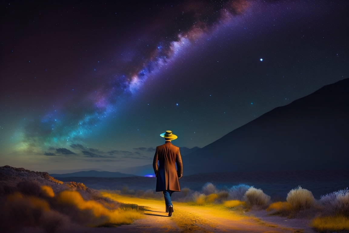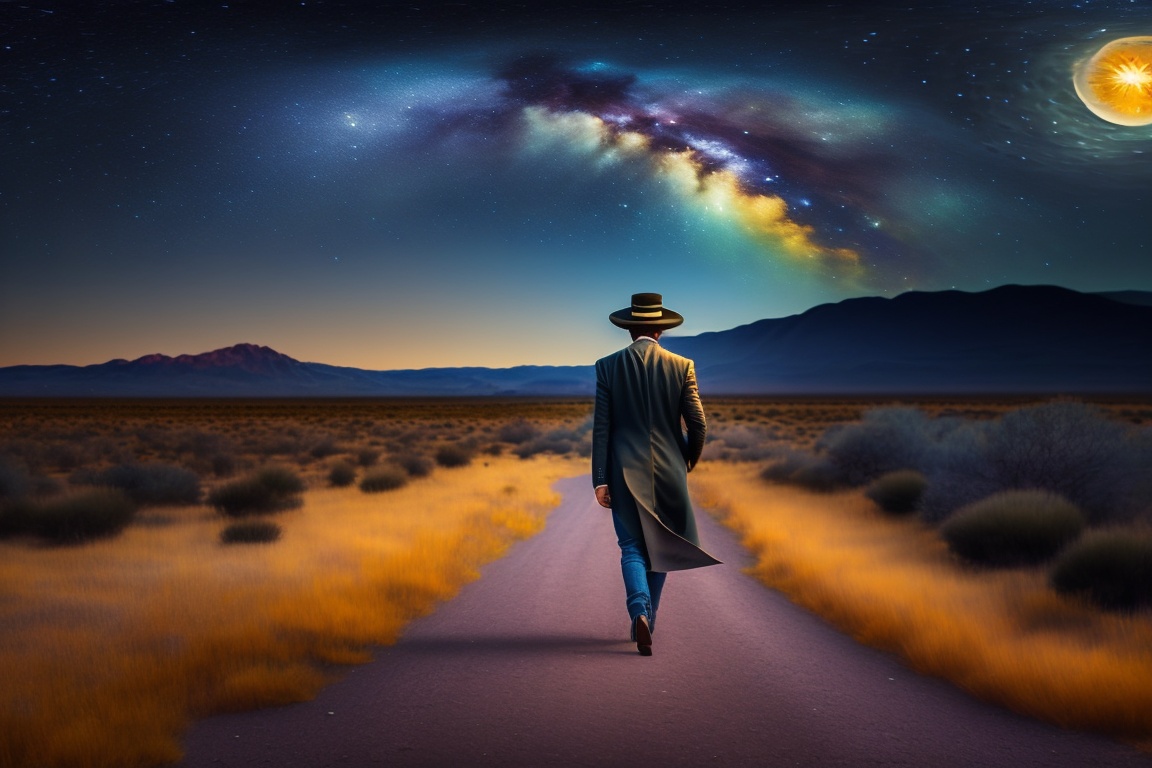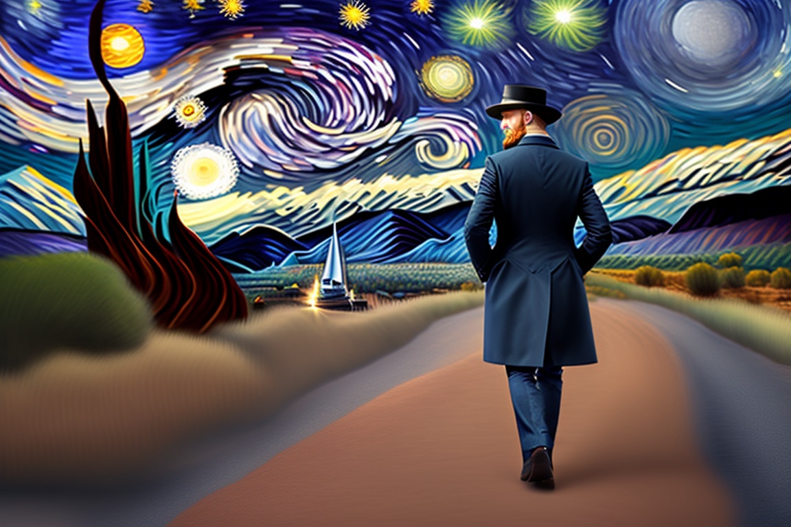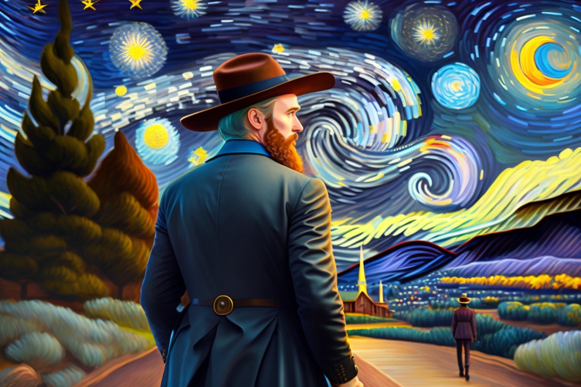 Vincent van gogh, bohemium artist in hat walking towards the camera, full body pose, in van gogh starry night, oil painting art style