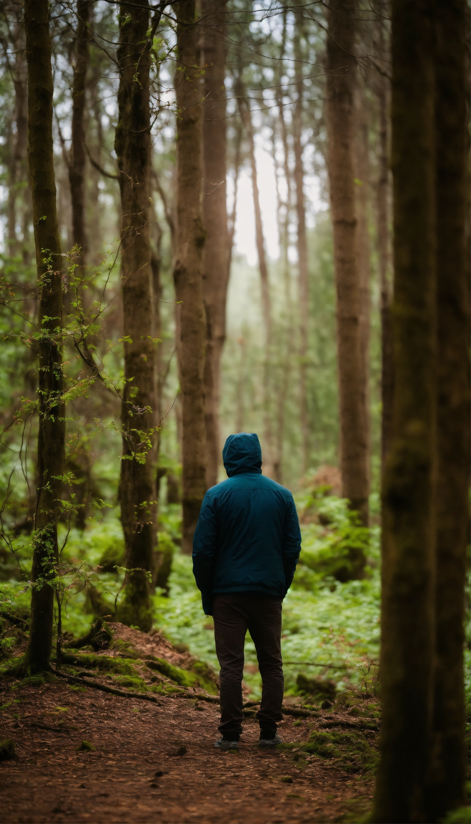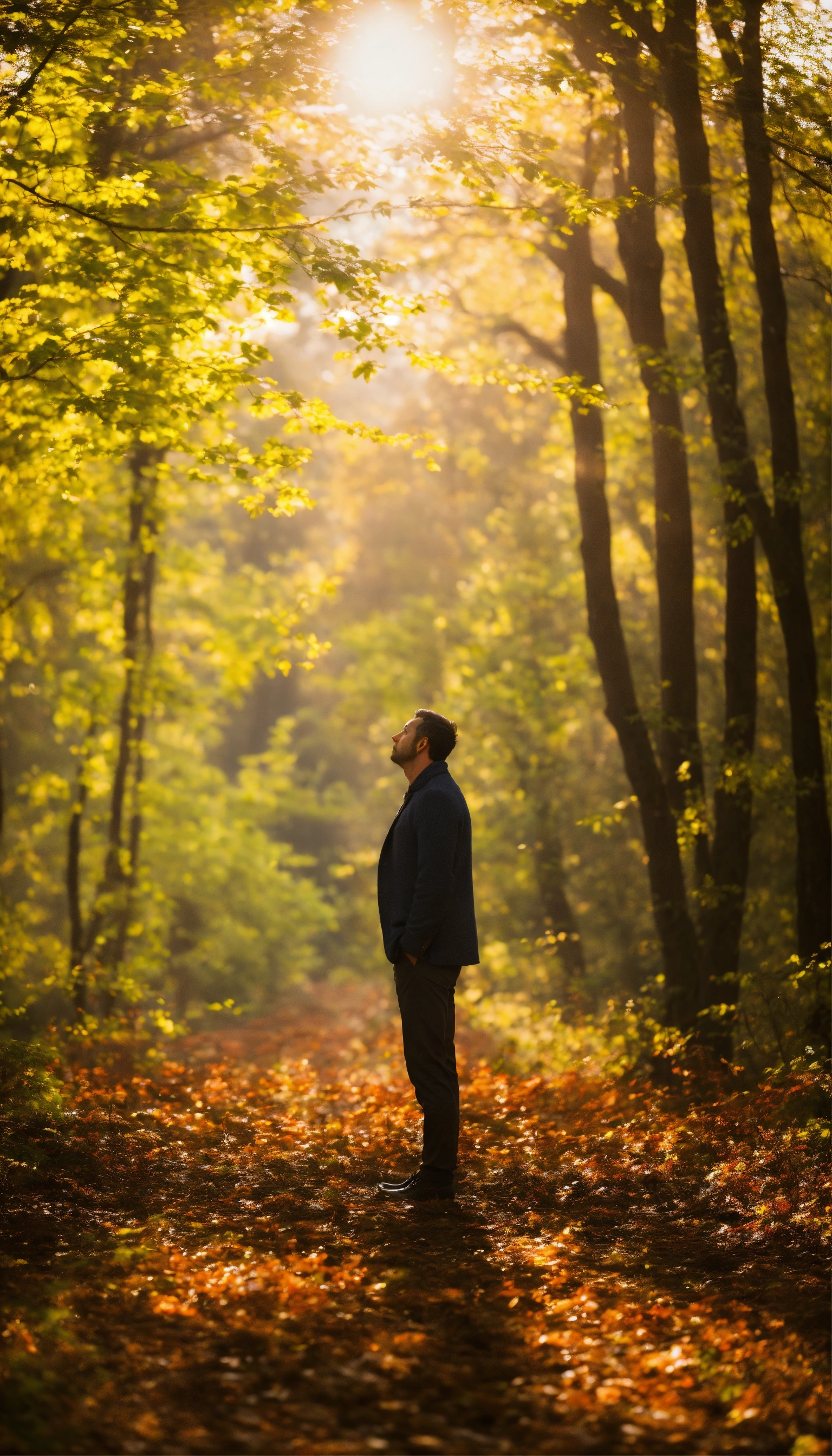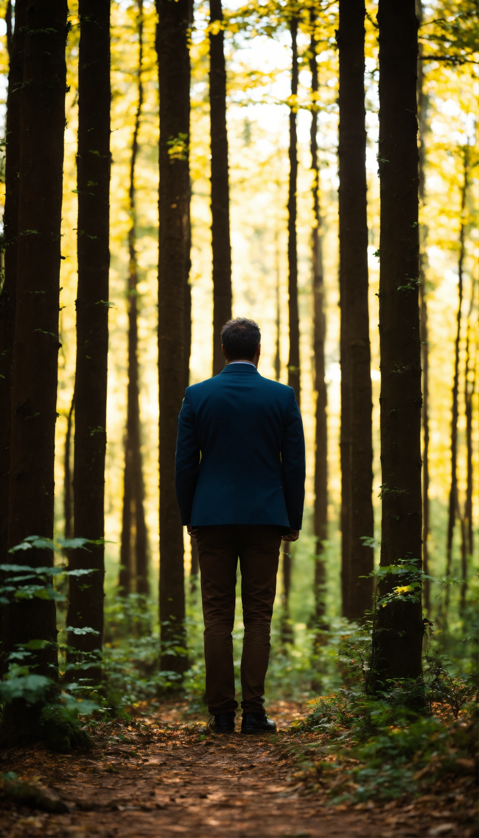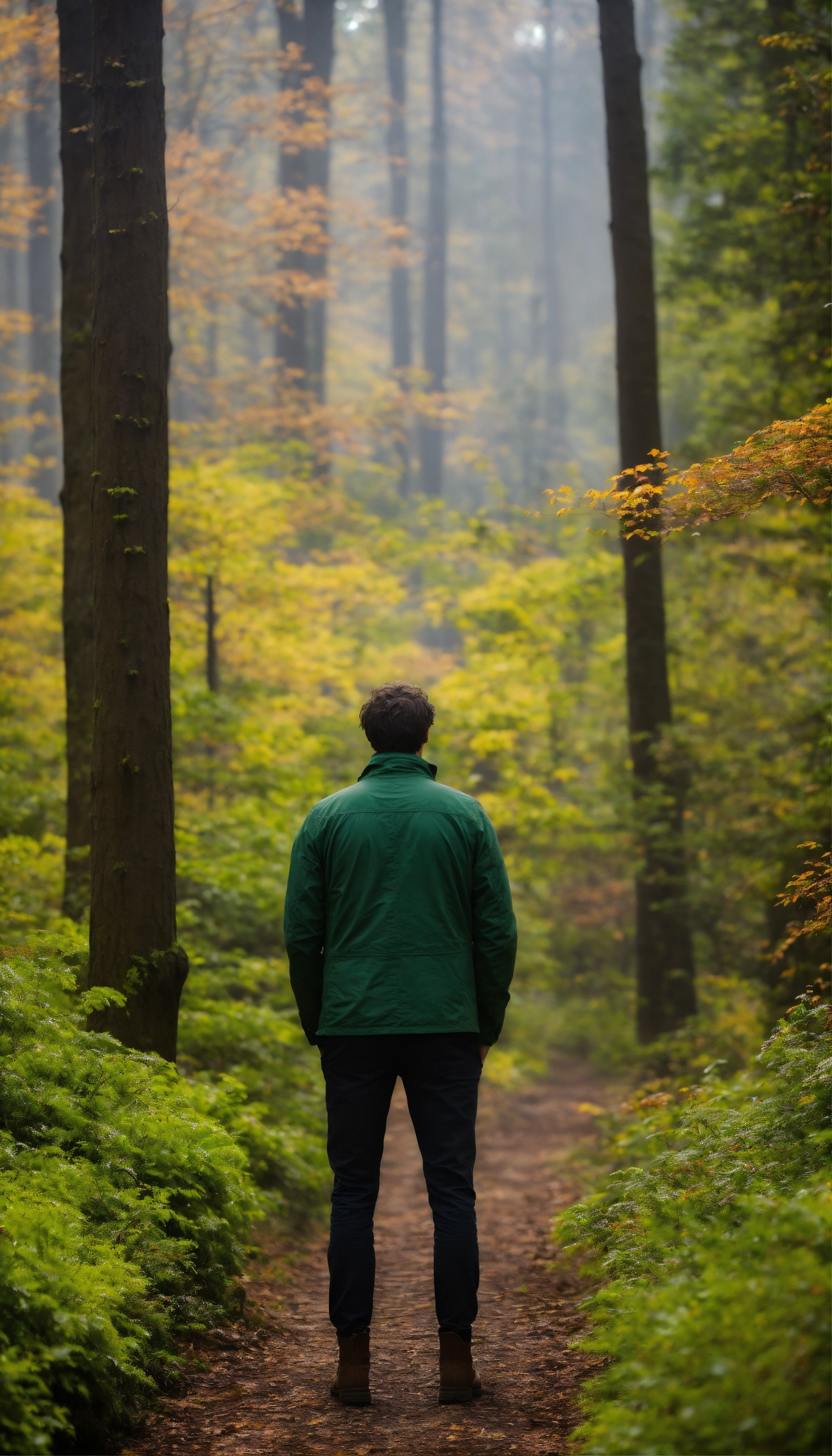 Capturez l'image d'un homme debout, face à la caméra. il se tient au premier plan, avec un air de détermination et de contemplation. la forêt s'étend derrière lui
