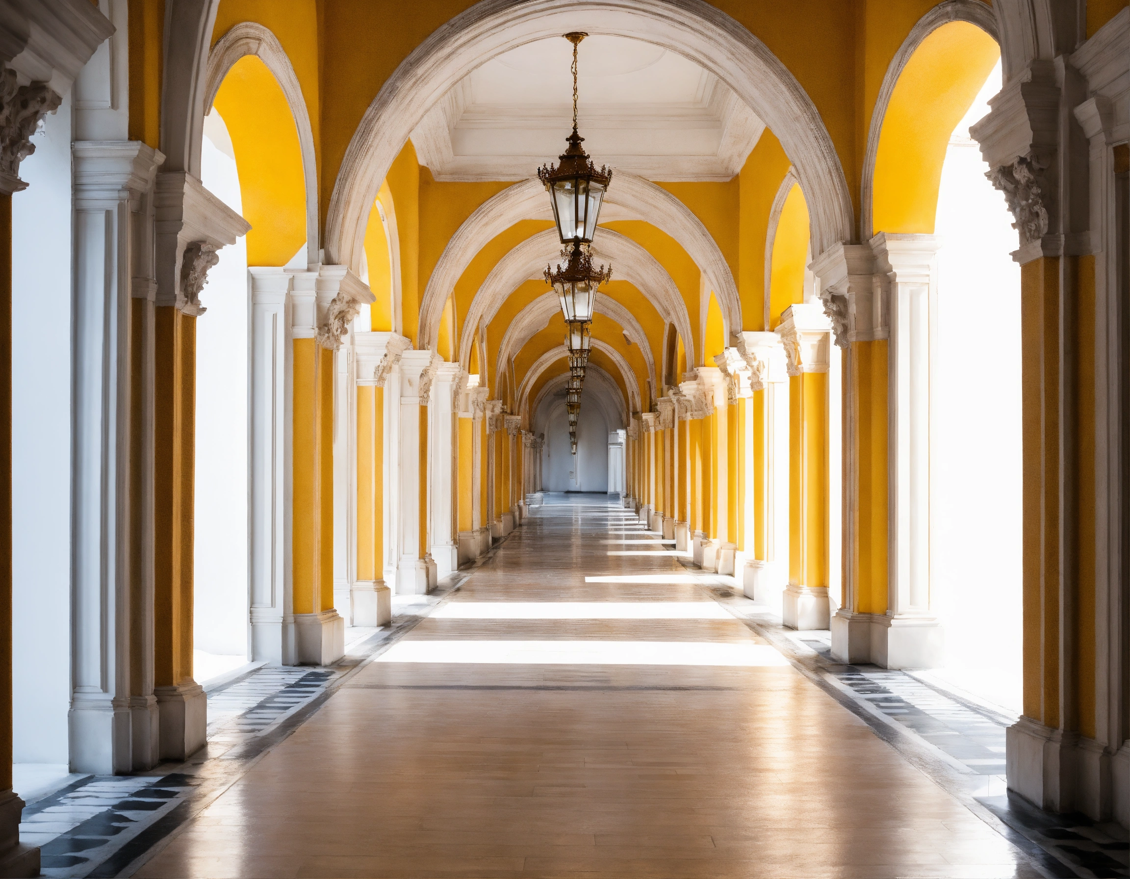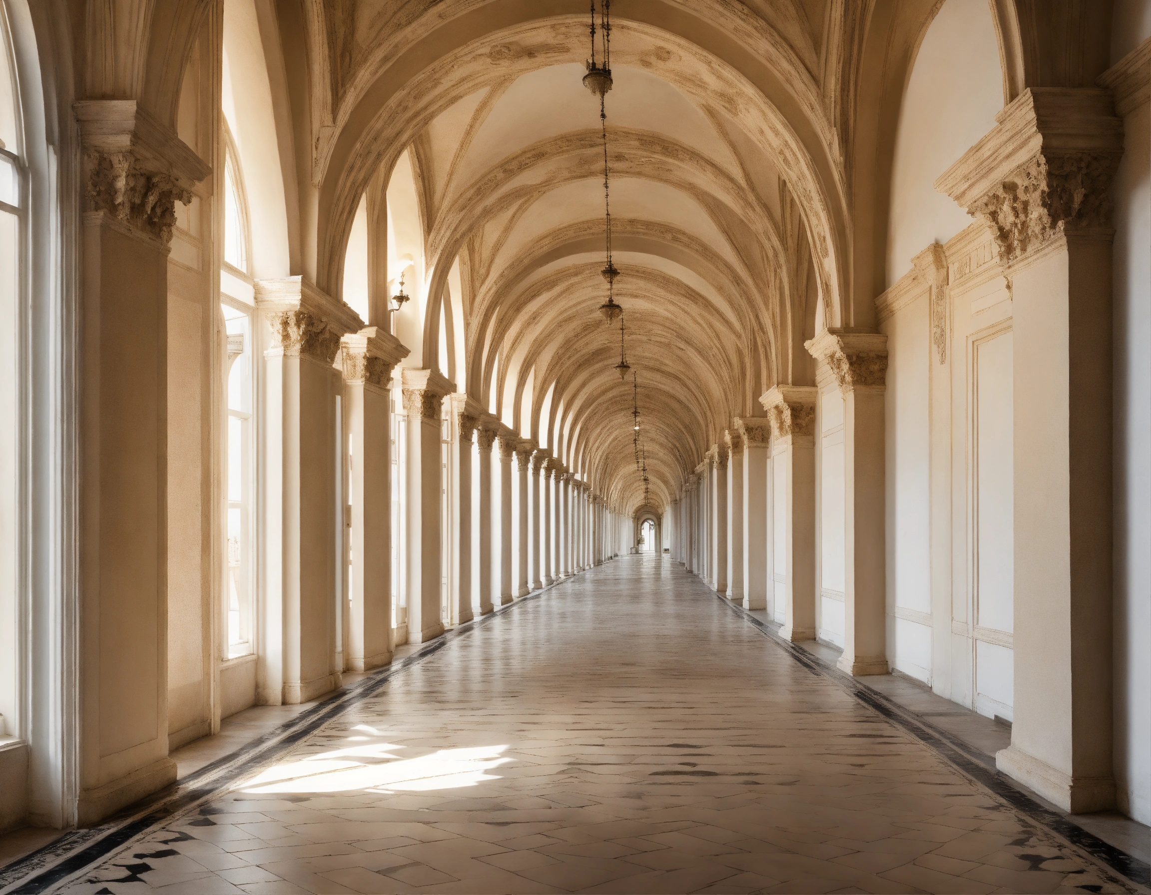 Long corridor of arches in perspective on a white background strict classicism