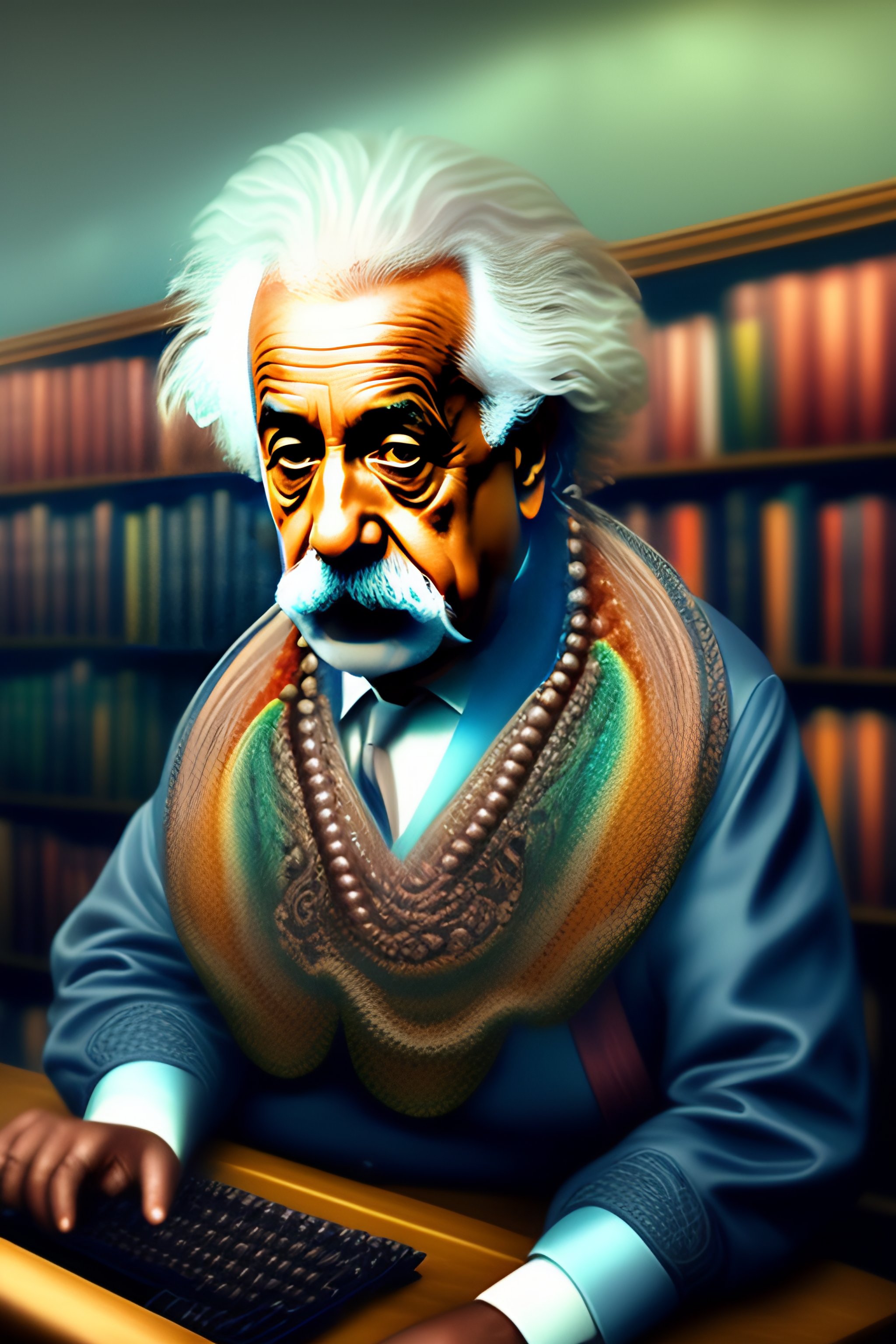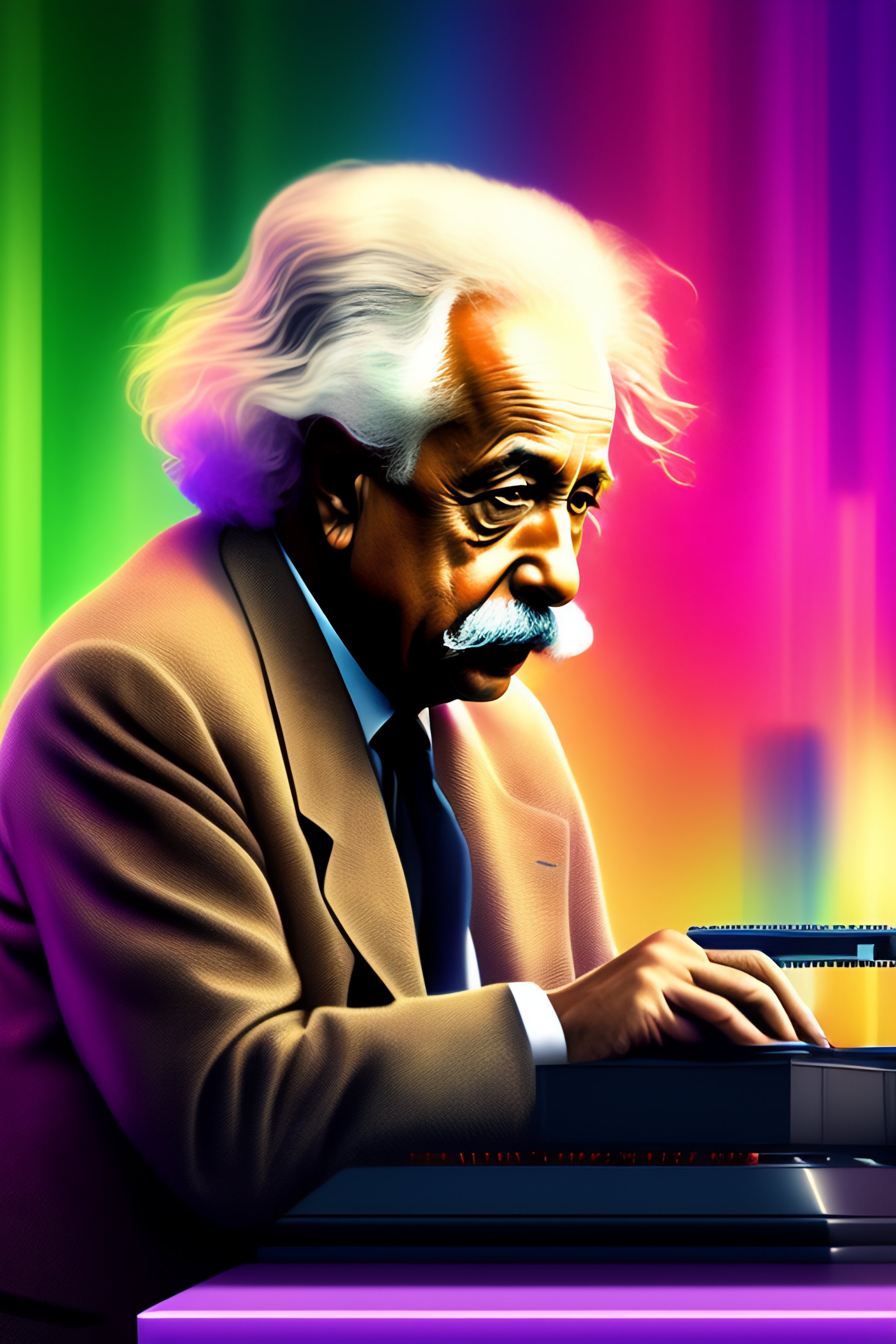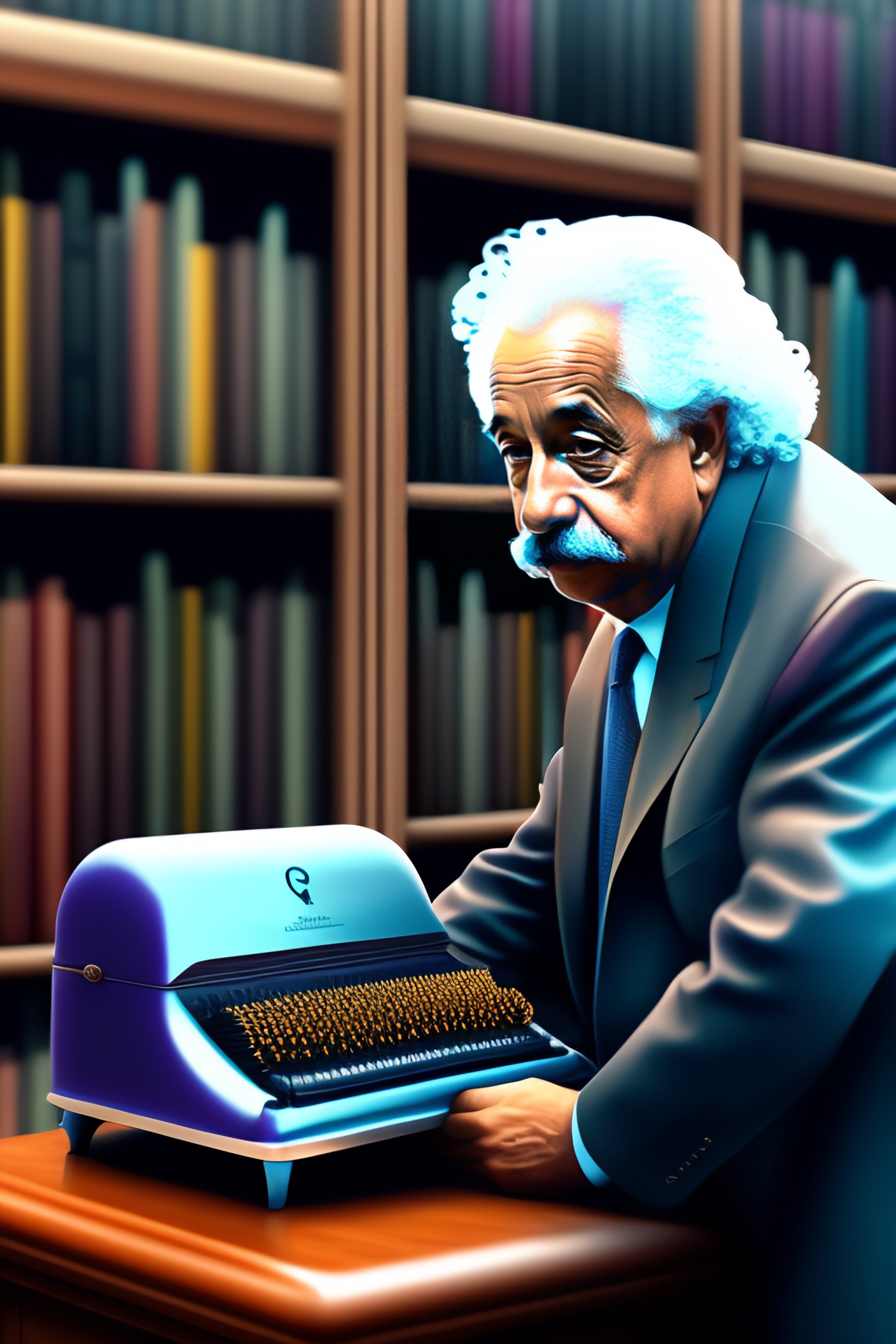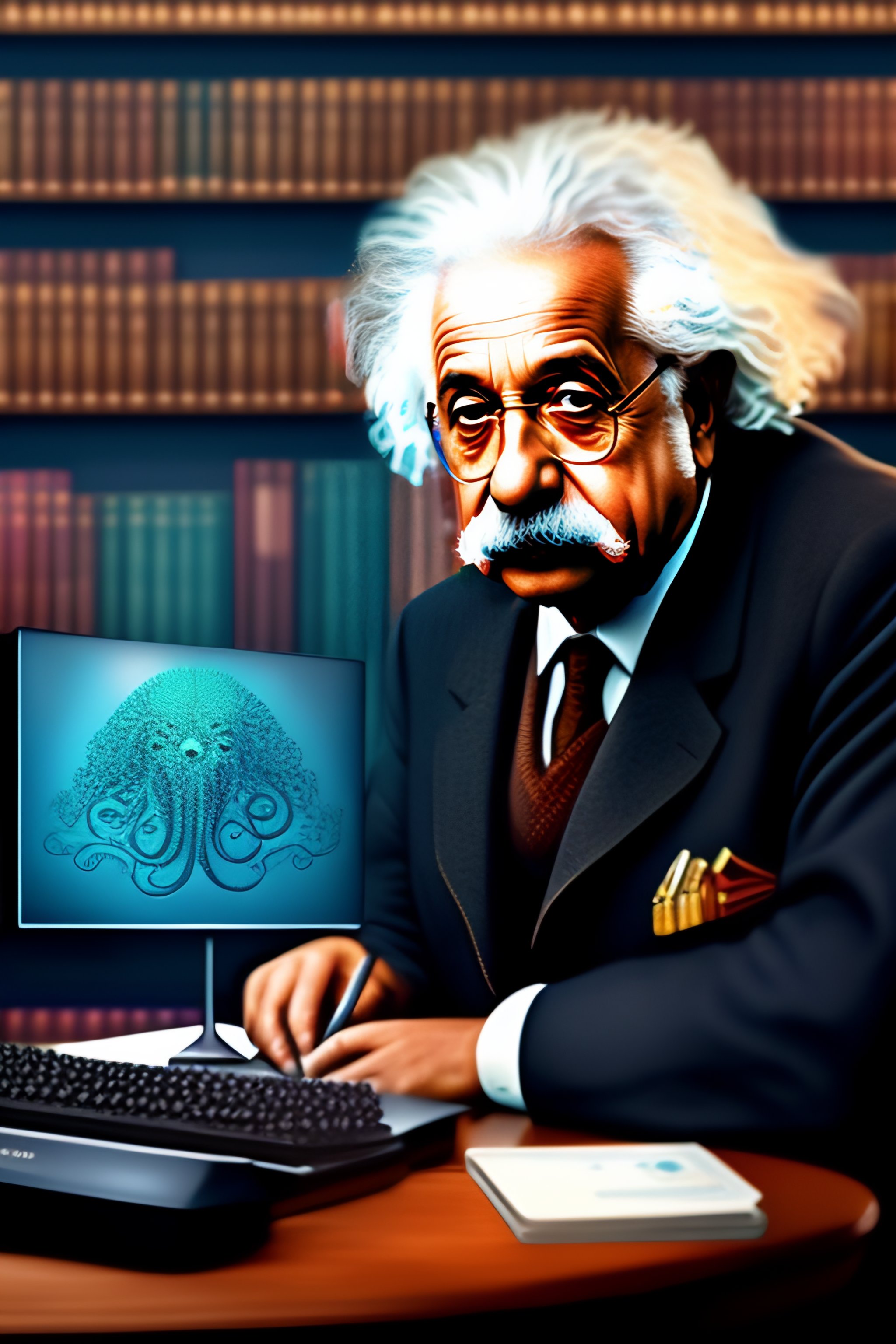 Albert einstein typing on a computer-octopus hybrid