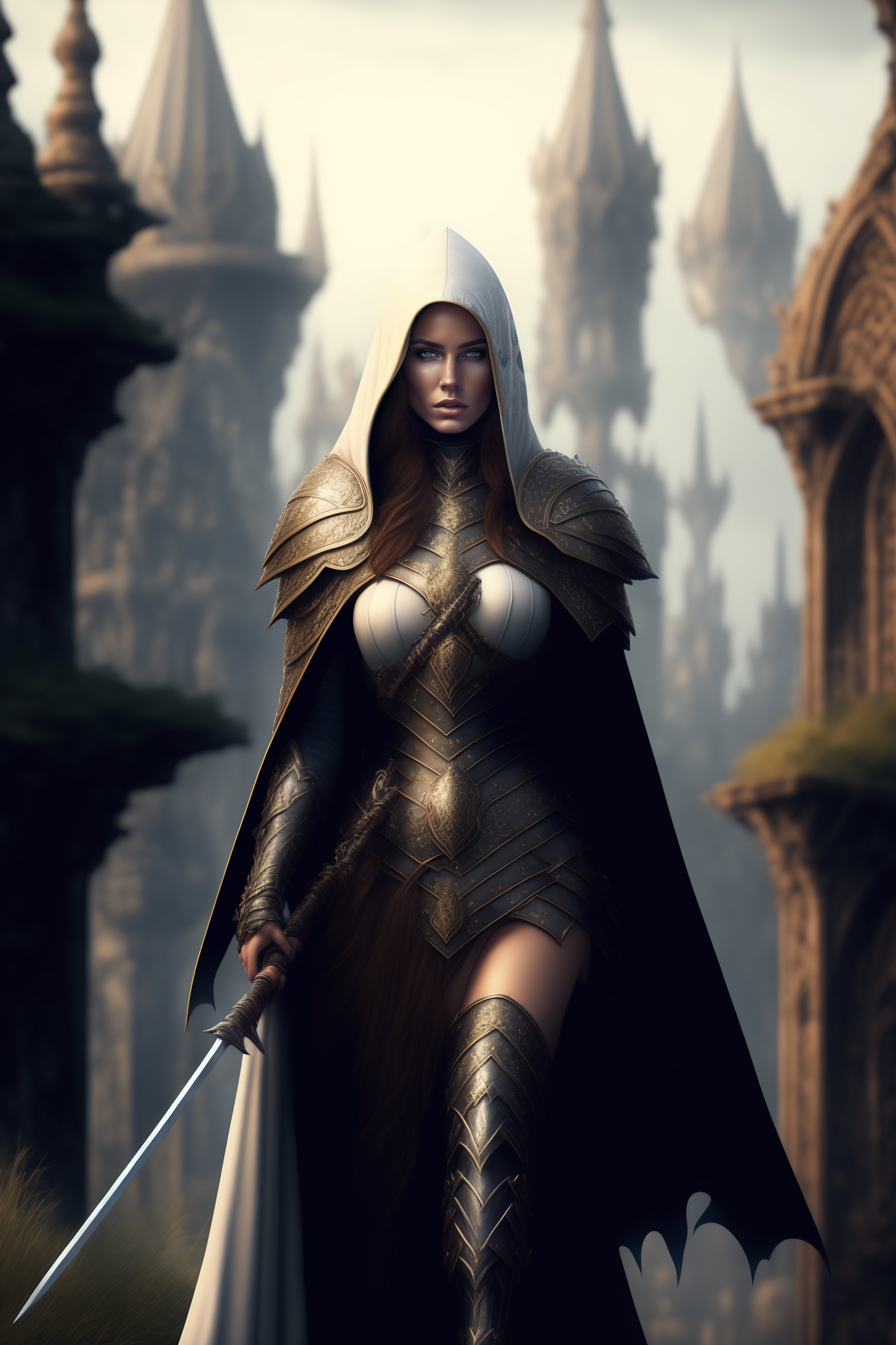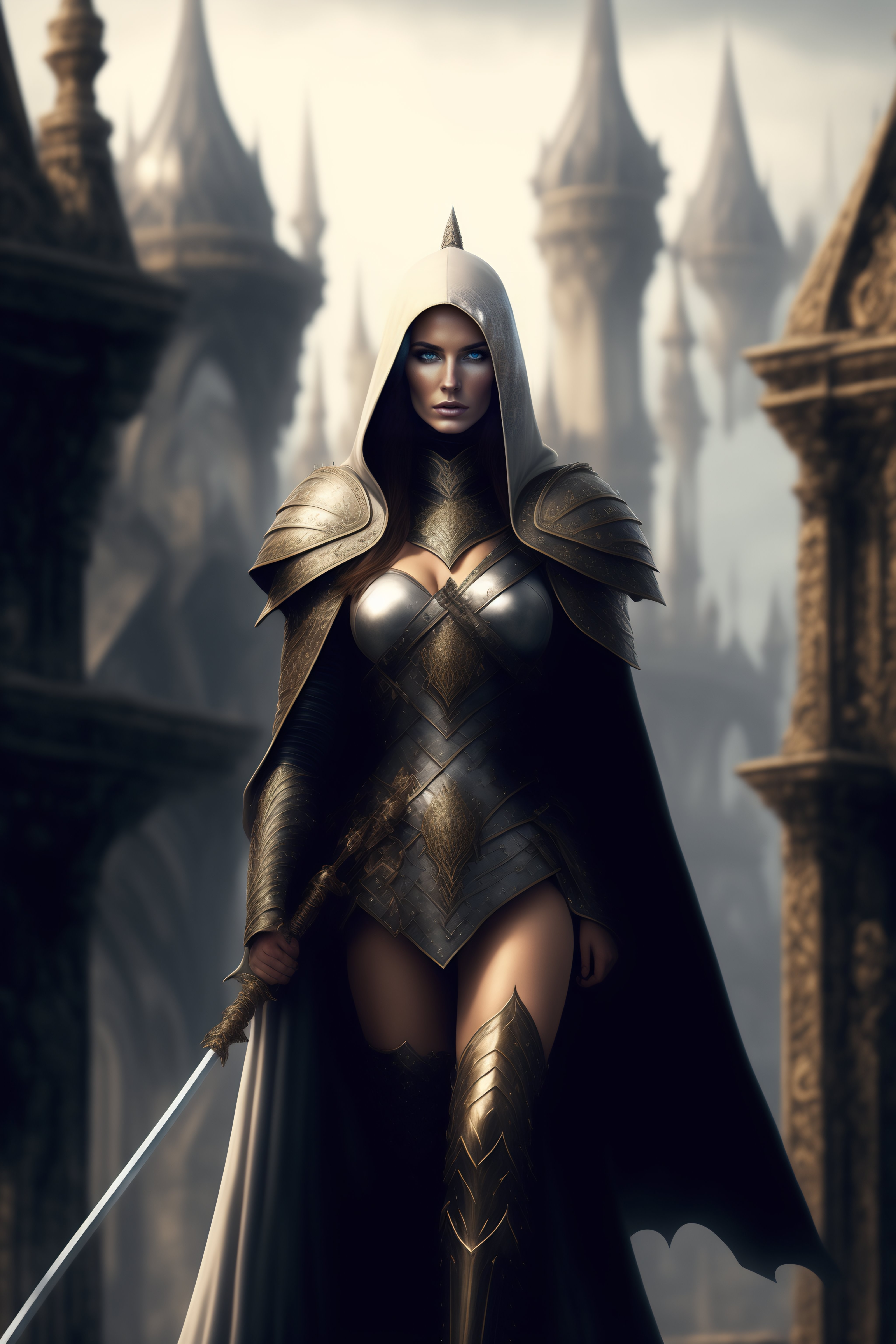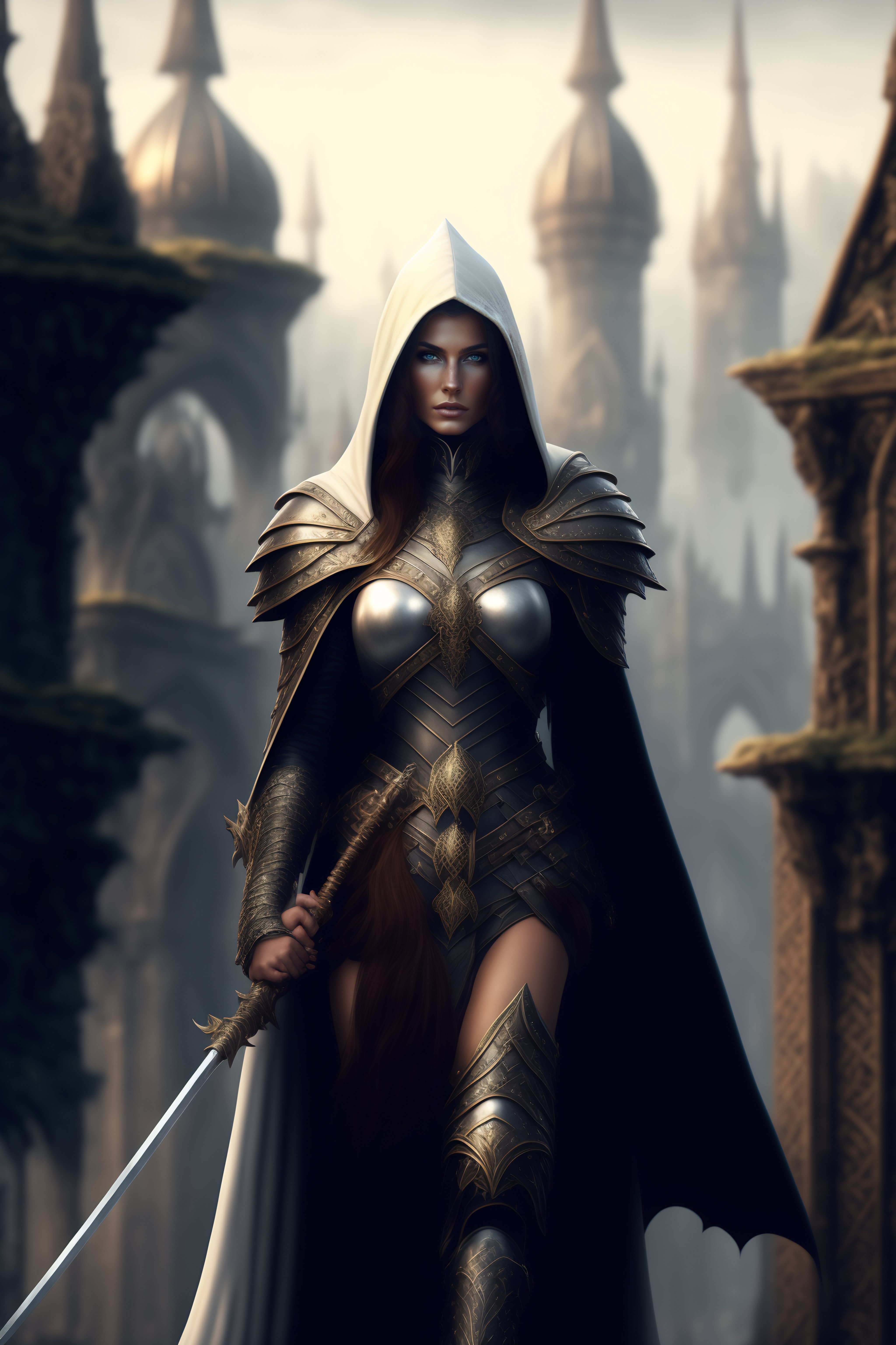 White female warrior brunette hair with metal full body armour and a hooded cloak, overlooking a gothic massive city