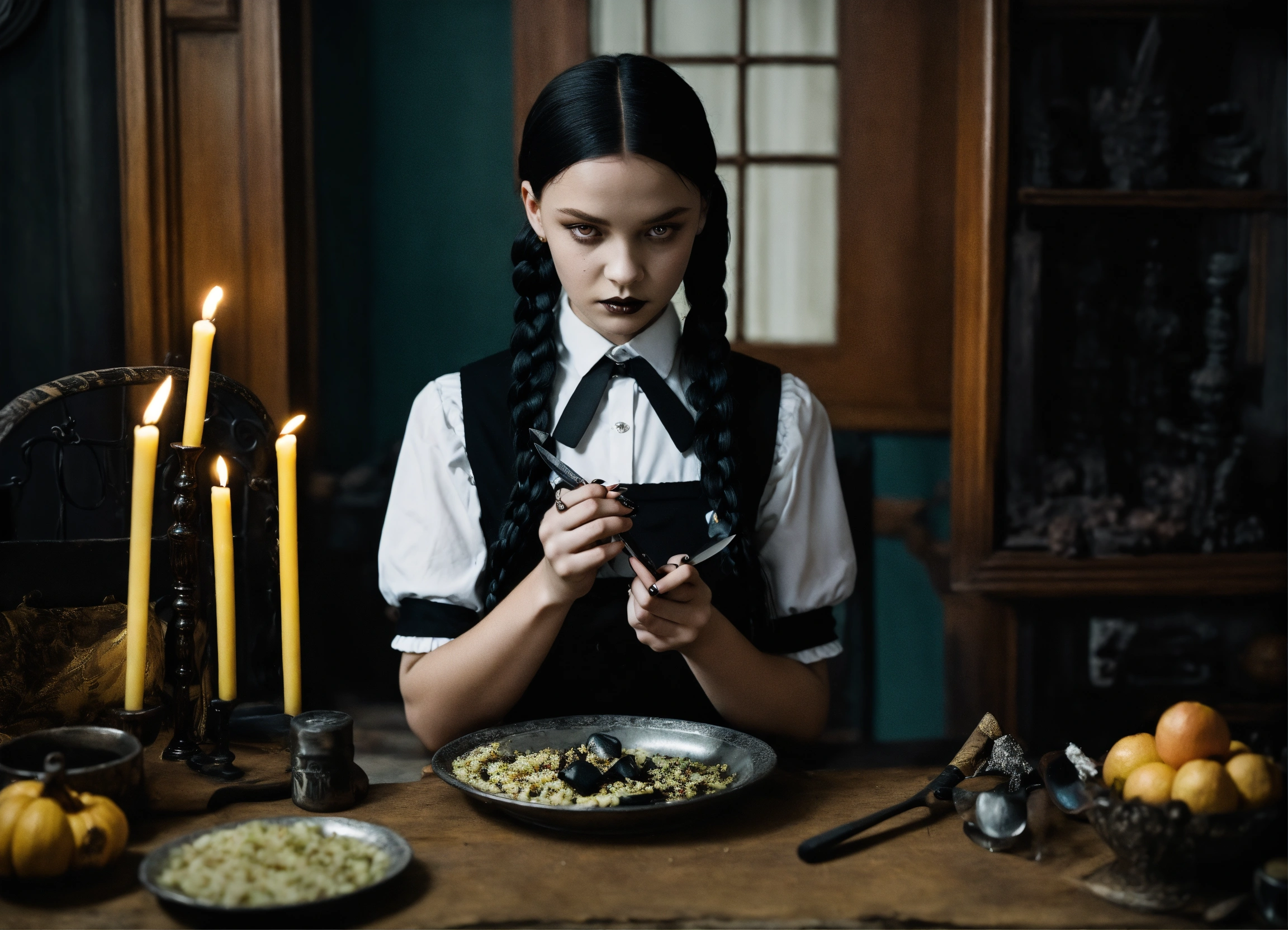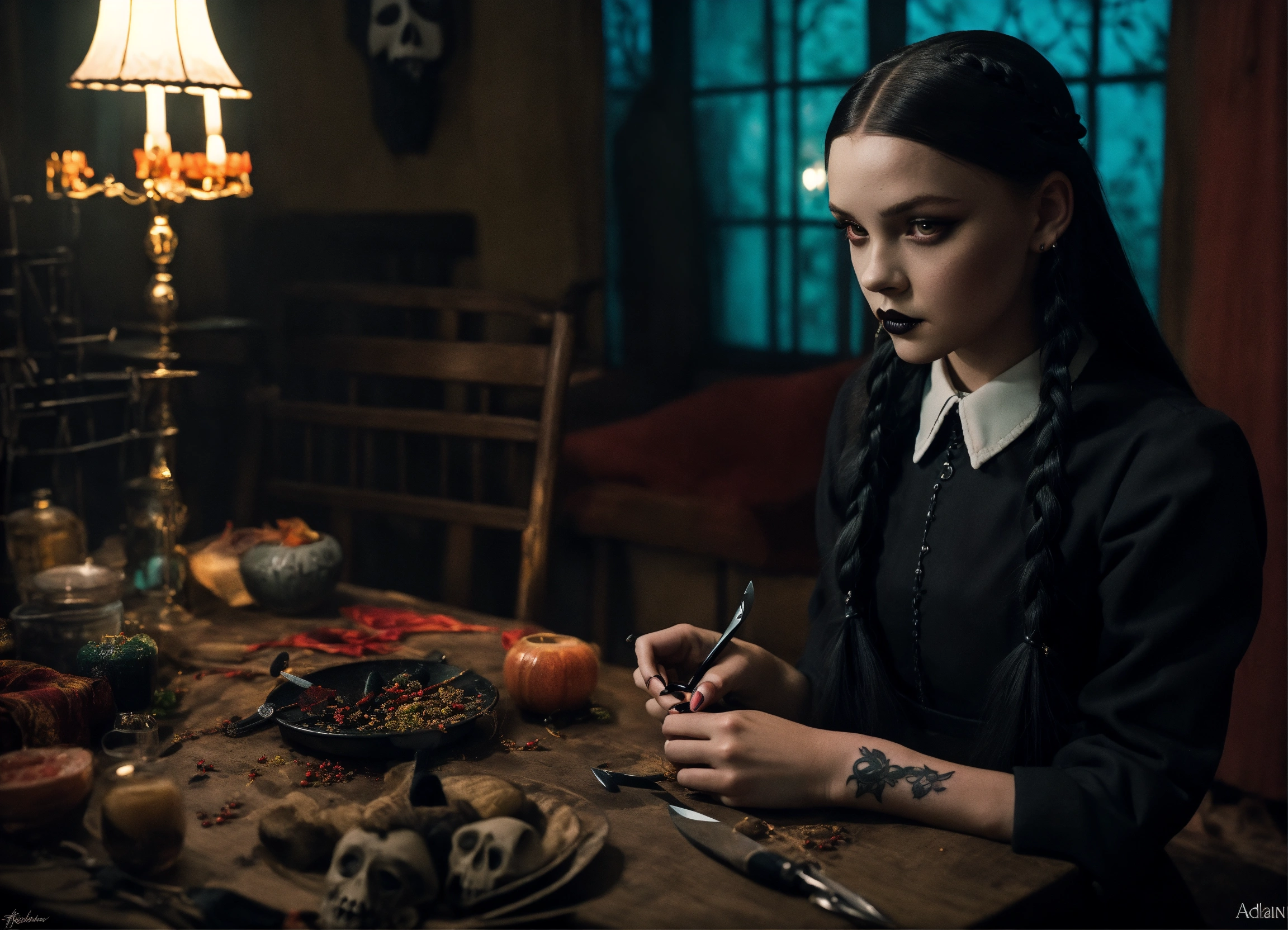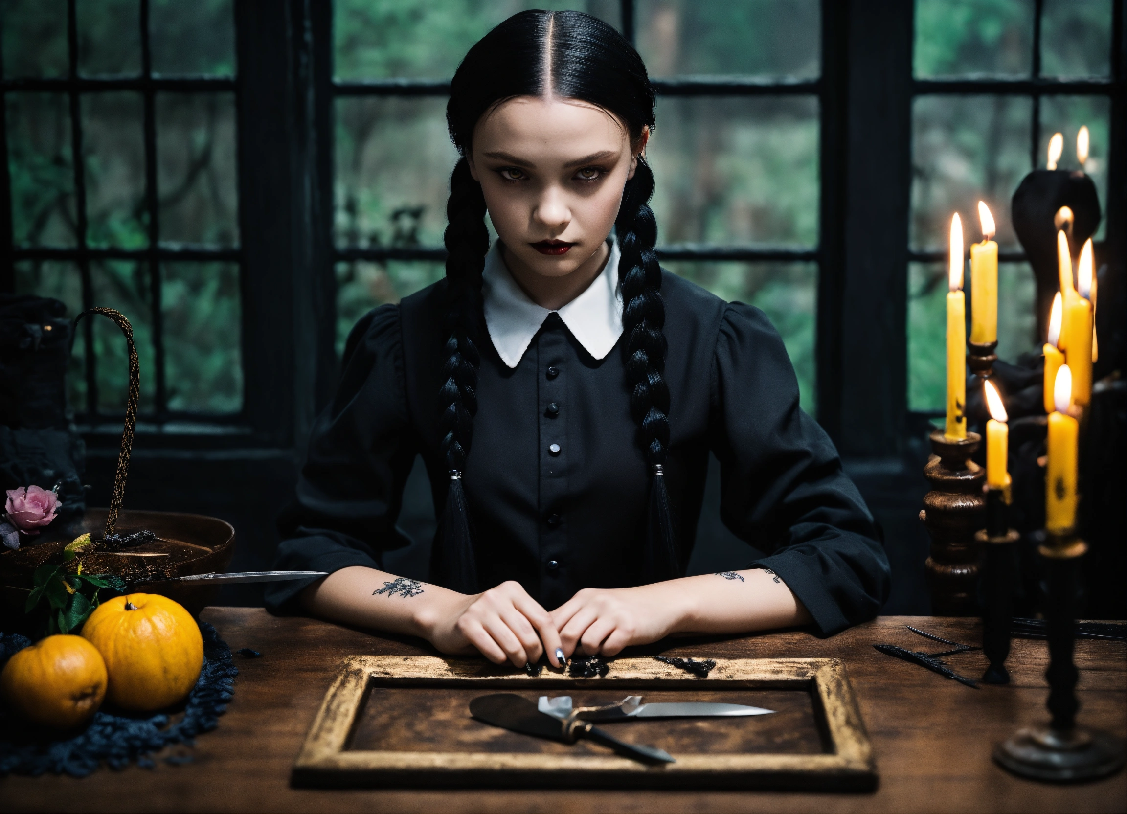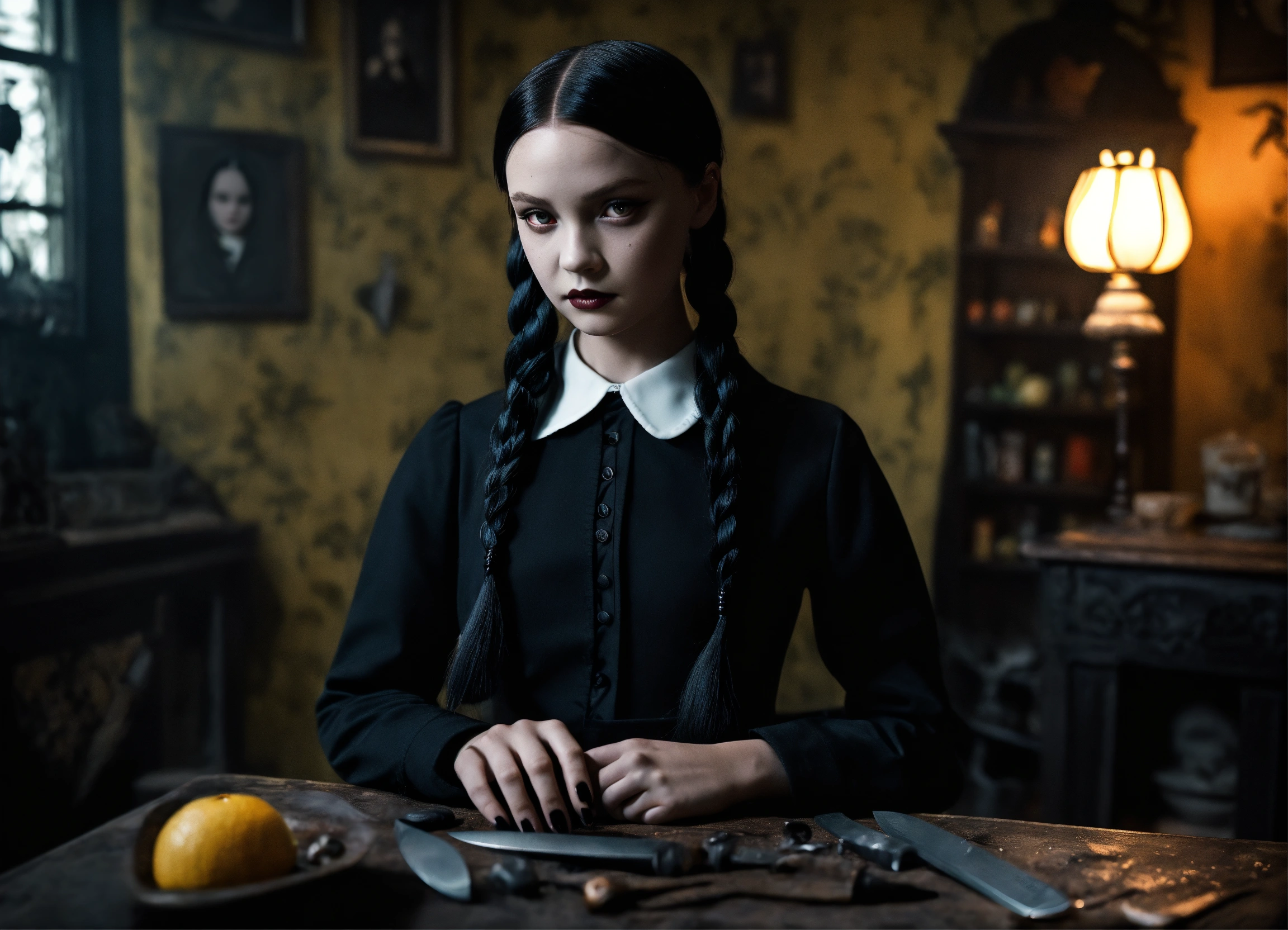 Wednesday addams from the series, black hair braided full growth, stay with tatoo, stay in home, color palette and overall composition of the image emphasize the dark and enigmatic atmosphere of the addams family. black eyes and nails, age 18, black pupils, knife in hand