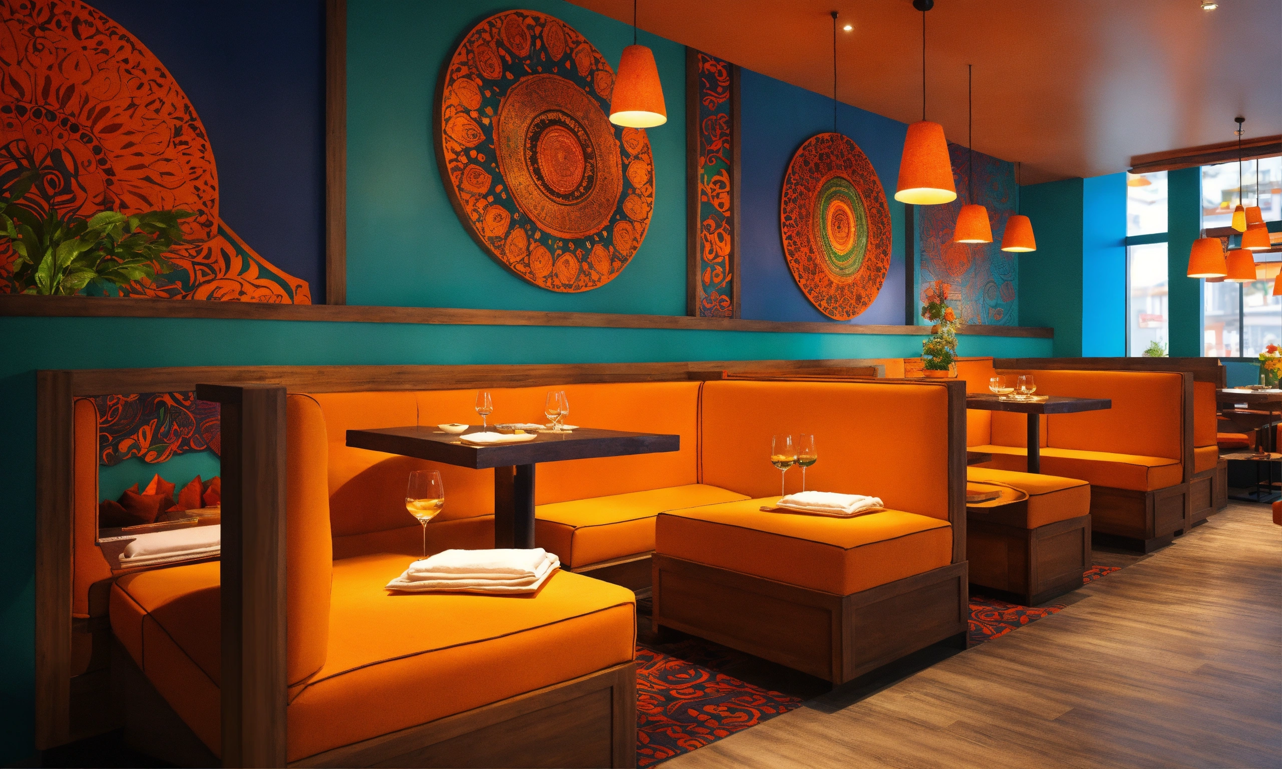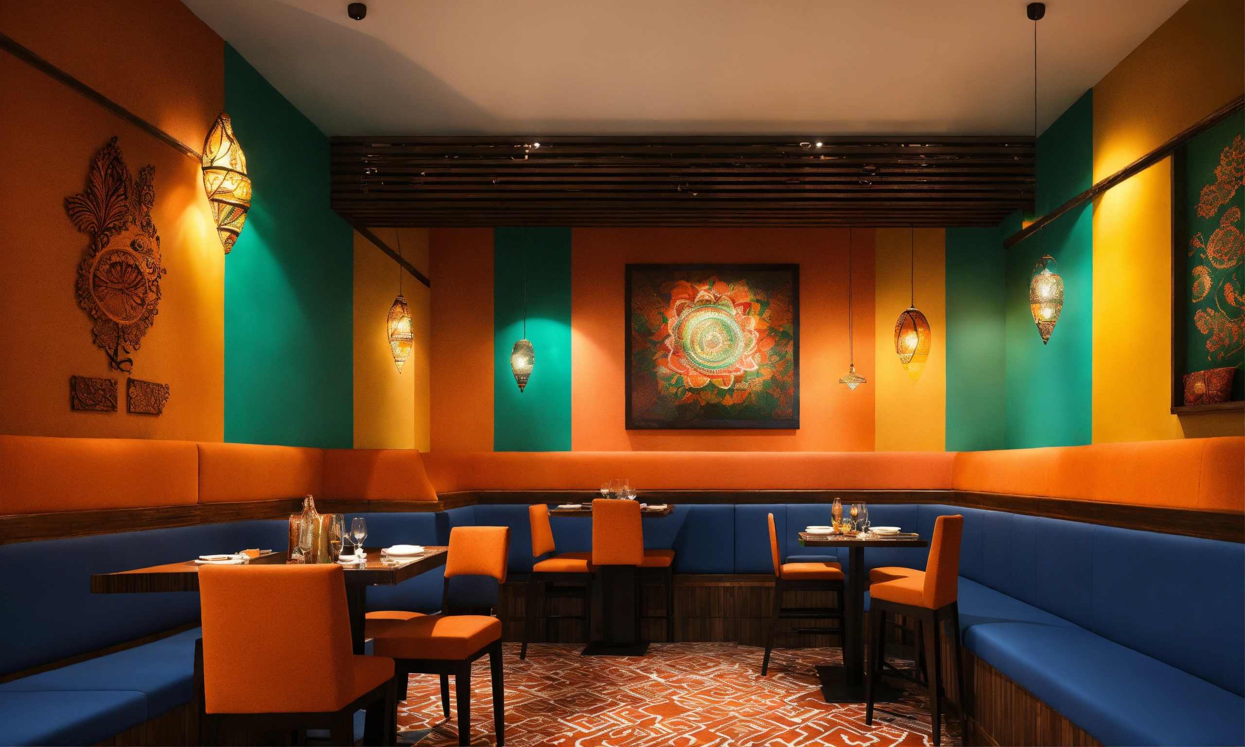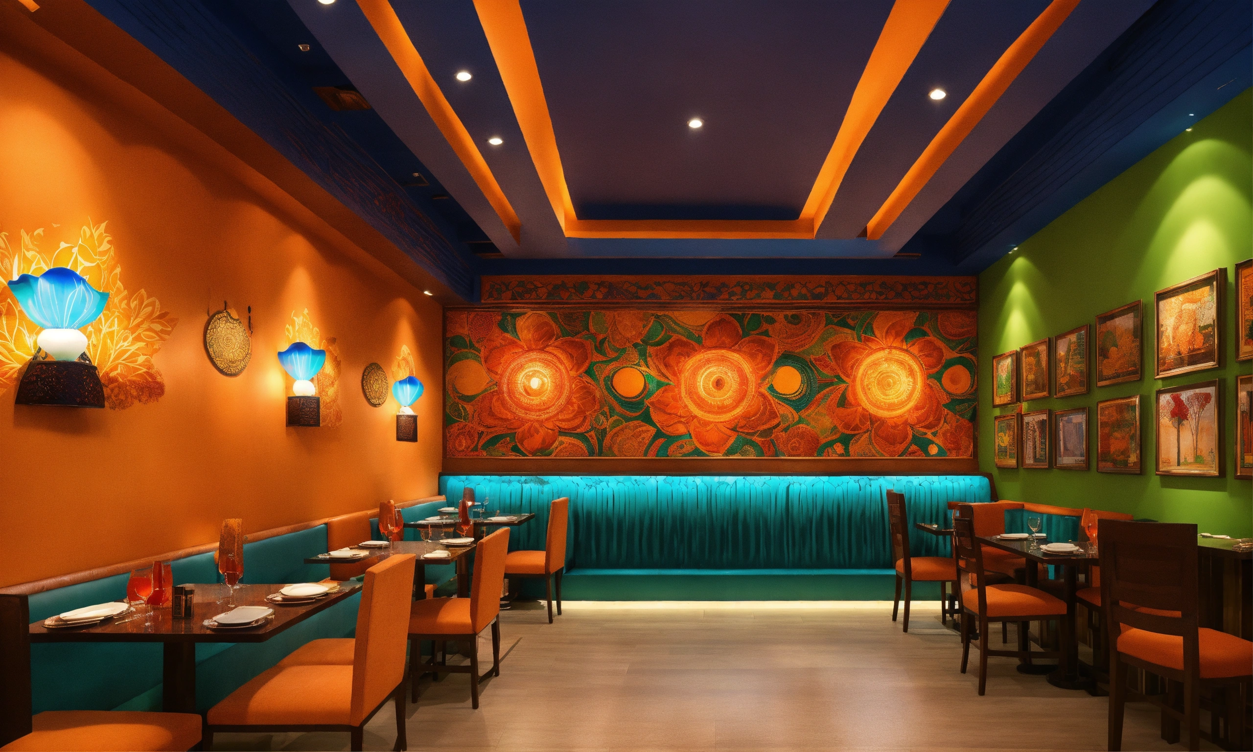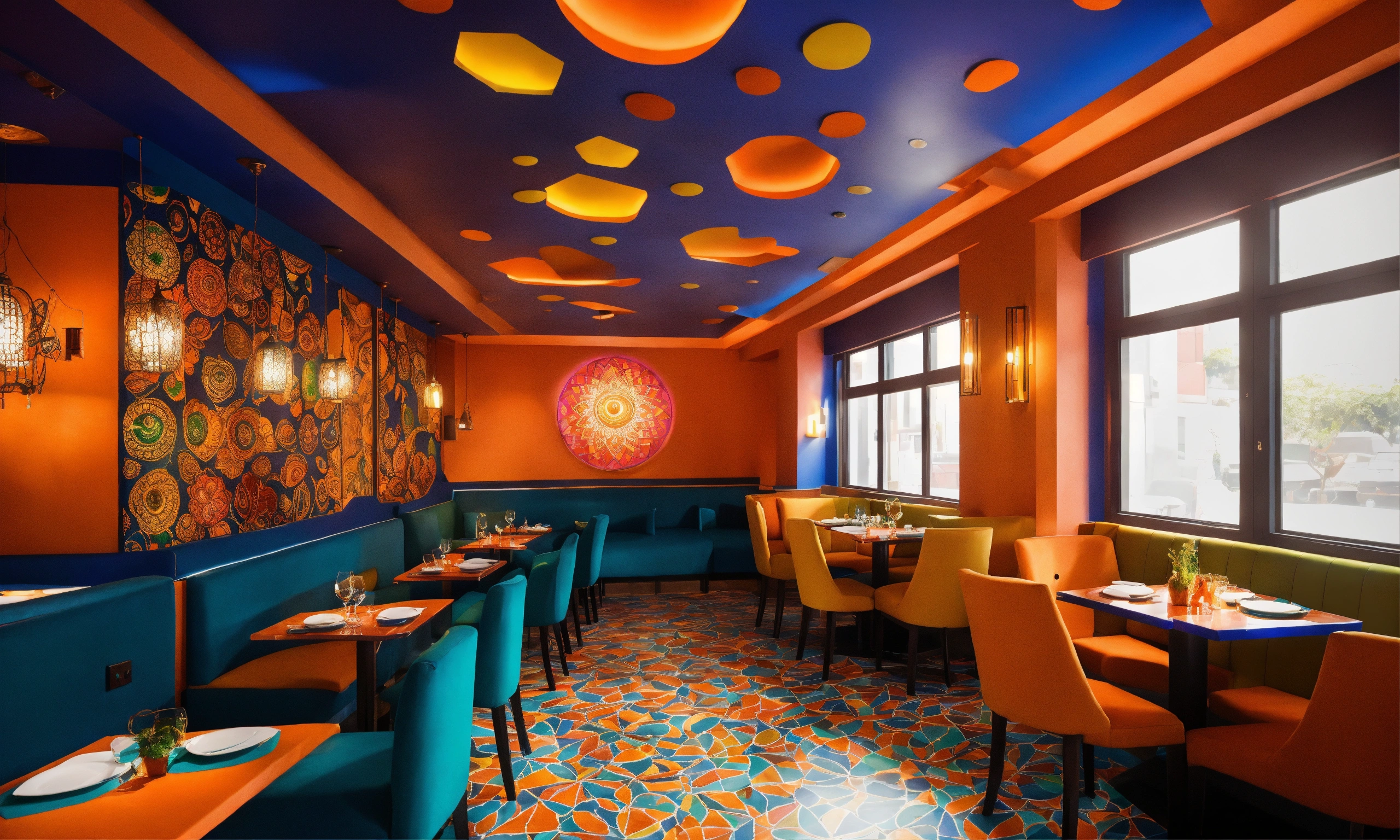Design a front prospective of a vibrant indian restaurant interior with a modern and trendy ambiance. the restaurant features eye-catching decor inspired by mandela shapes, illuminated by soft backlights that add depth and warmth to the space. the color palette includes bold shades of orange, green, and blue, creating a lively and inviting atmosphere that complements the rich flavors of indian cuisine