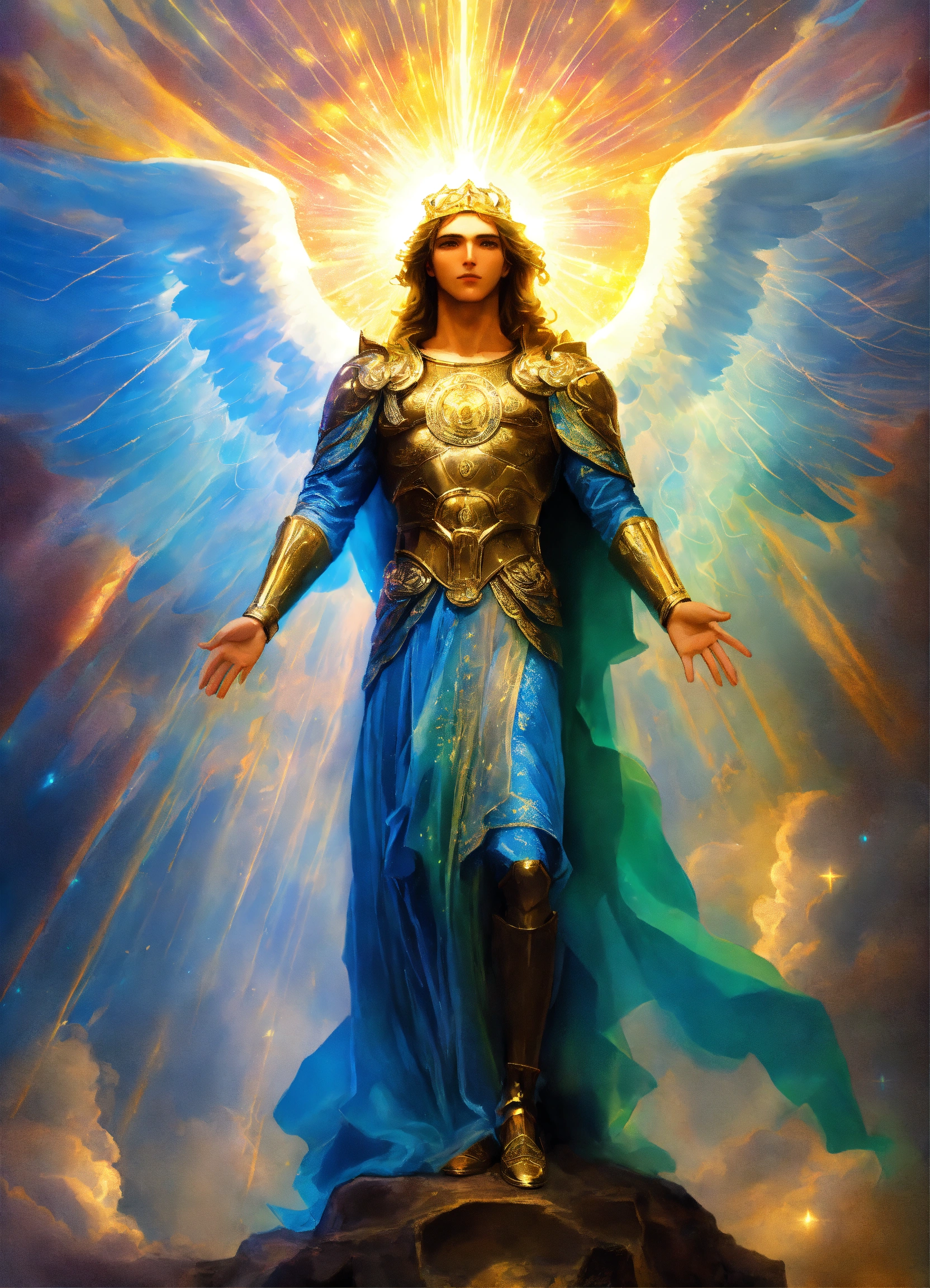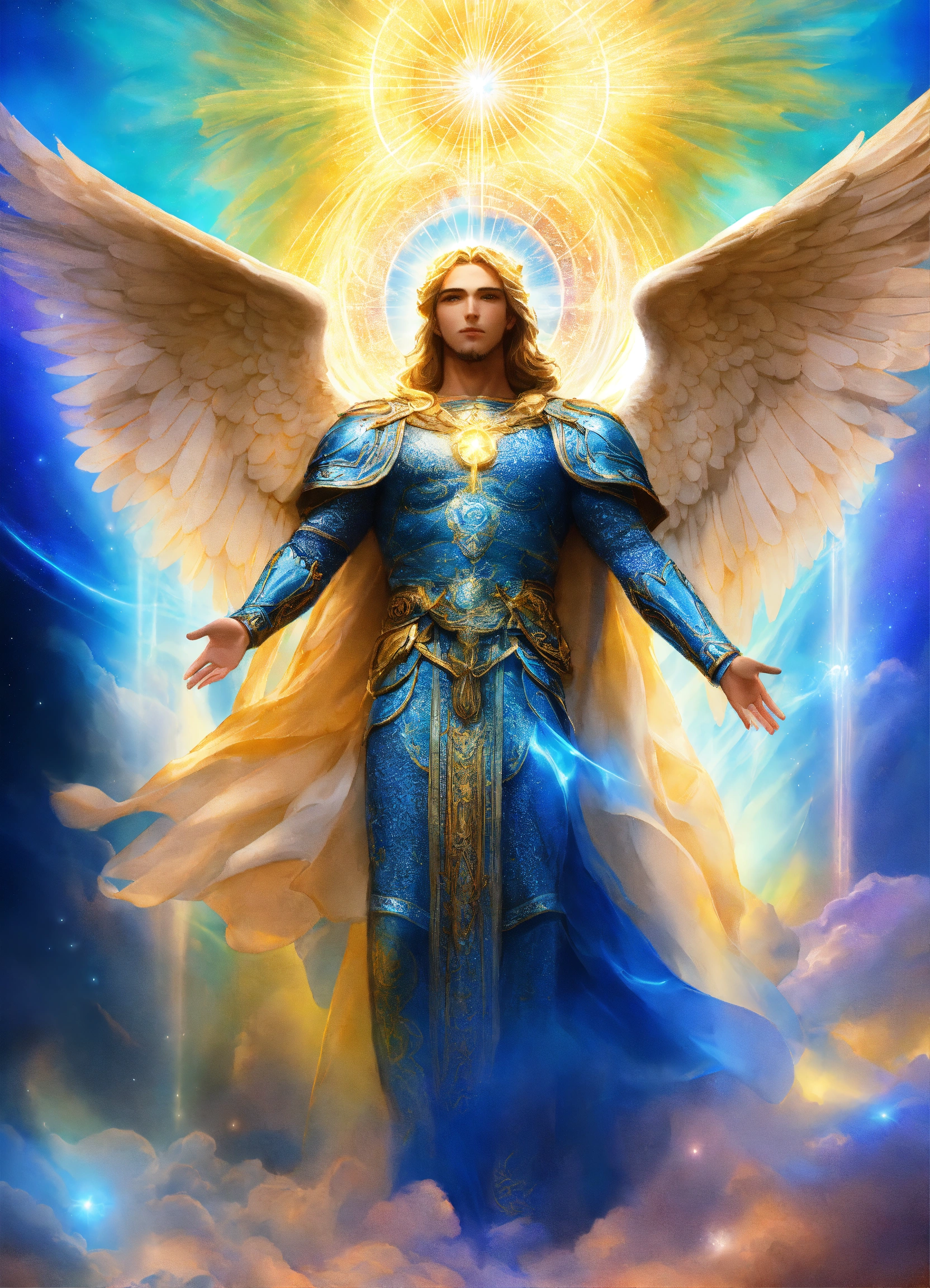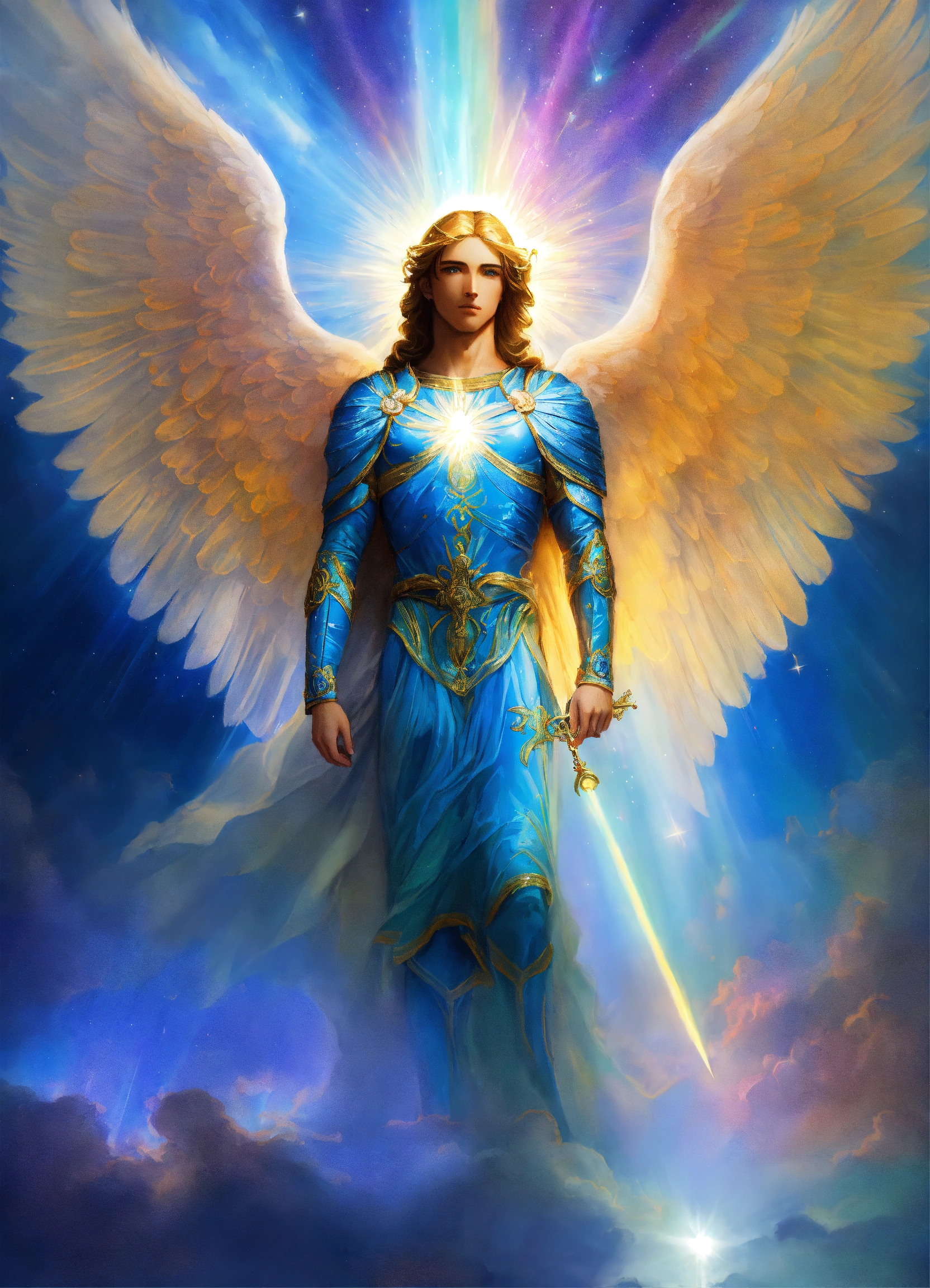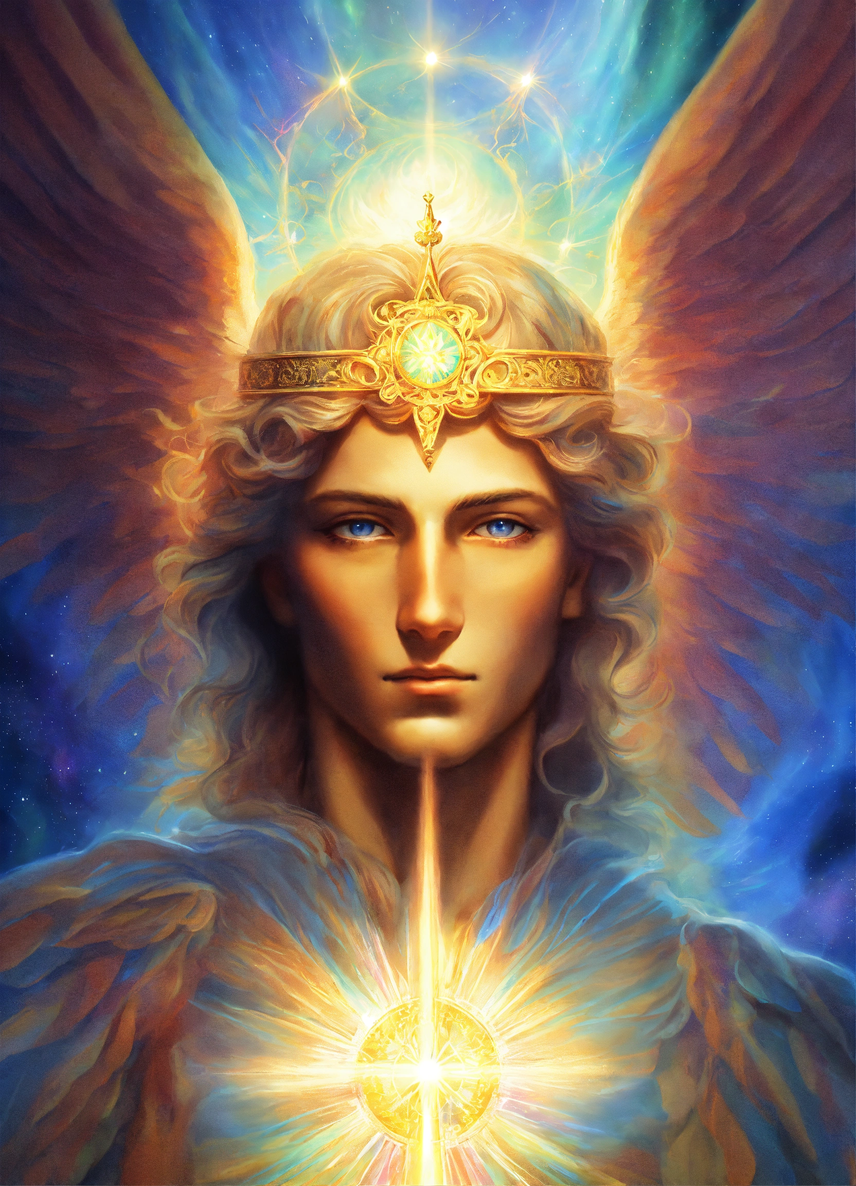 Archangel michael with an adult face, ethereal aura, prismatic aurora lights, blue beams, beyond the heavenly host.