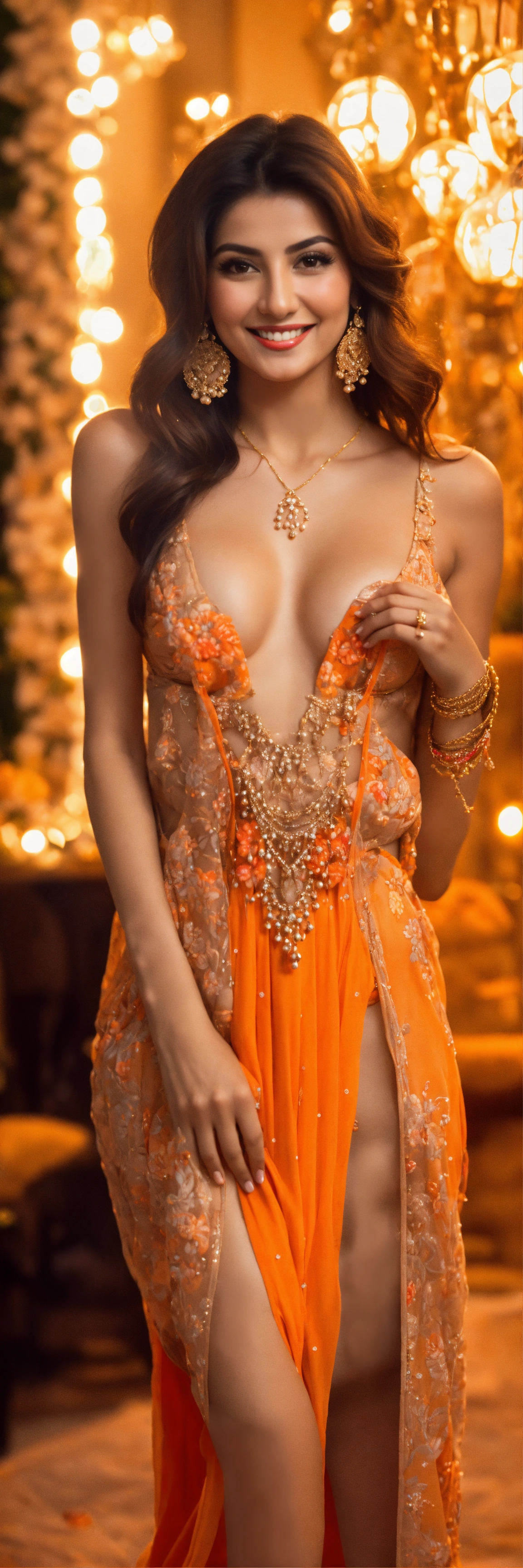 Festival background, persian beautiful housewife, orange beige bra, thin saron, long legs visible, opening champagne, friends in background, jewellery, clevage visible, long hairs, cute smile, shy, nice shape body, bright light