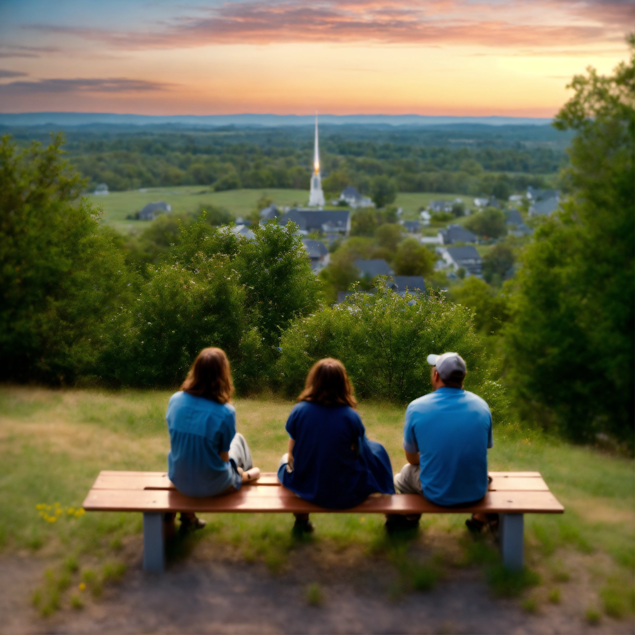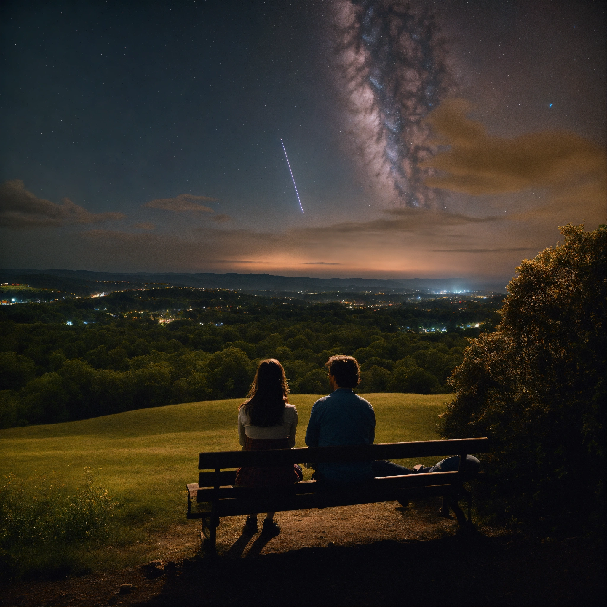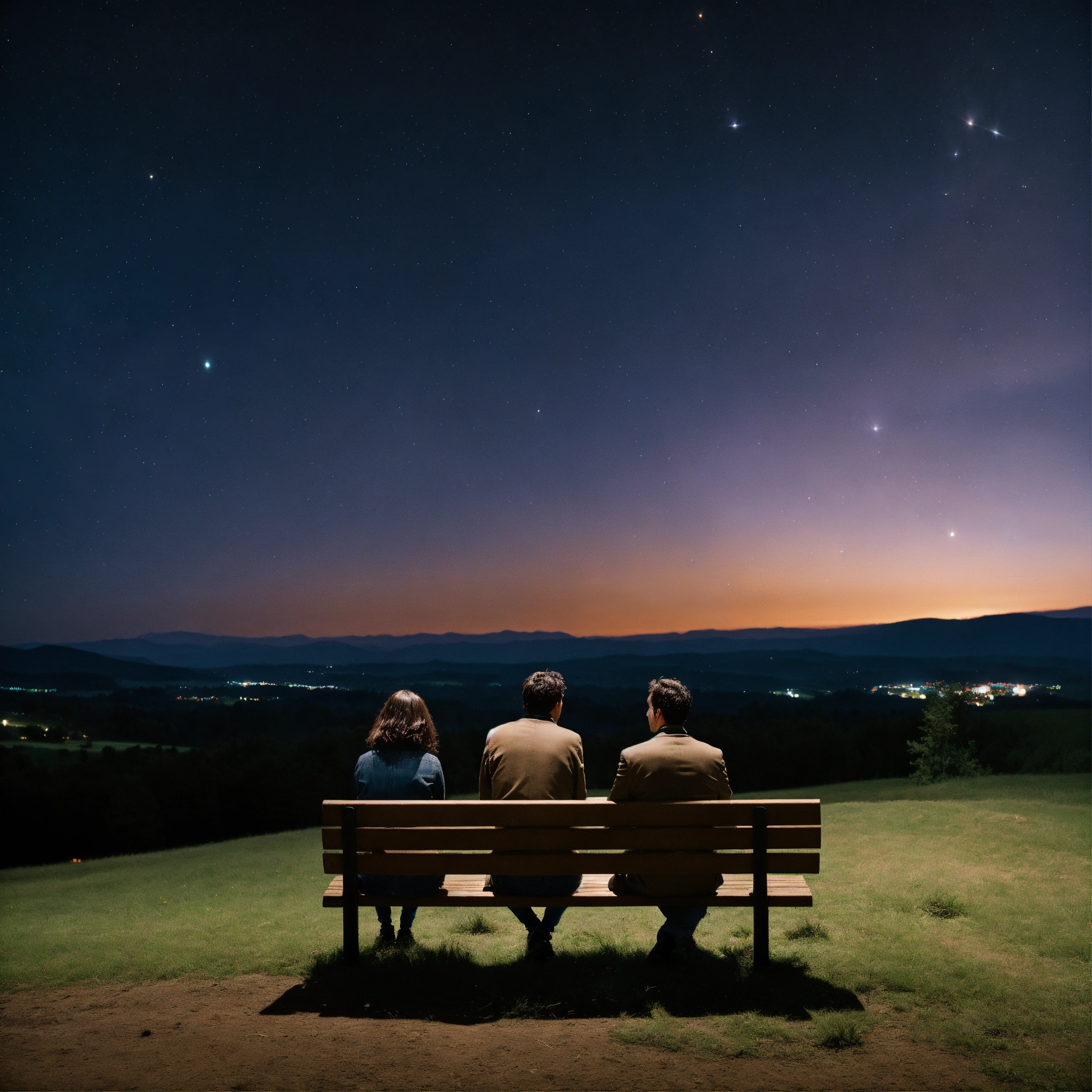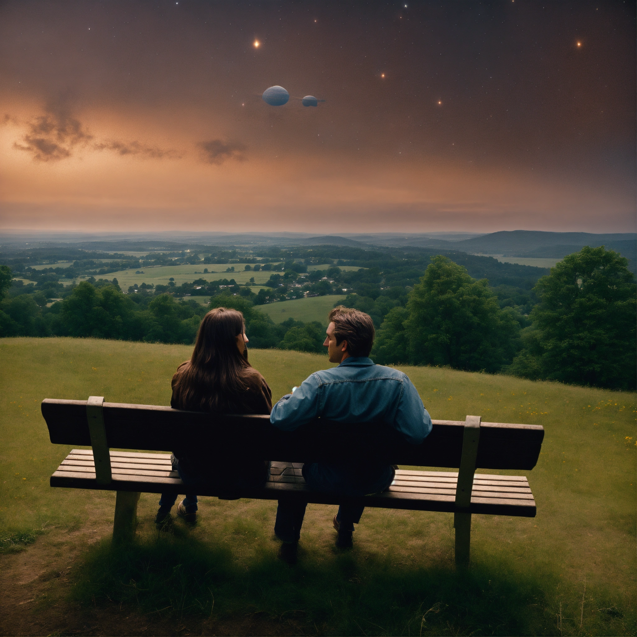 A woman with long brown hair and a man with short brown hair sitting in a bench seat on a hill looking out to outer space, wide format gregory crewdson style photography