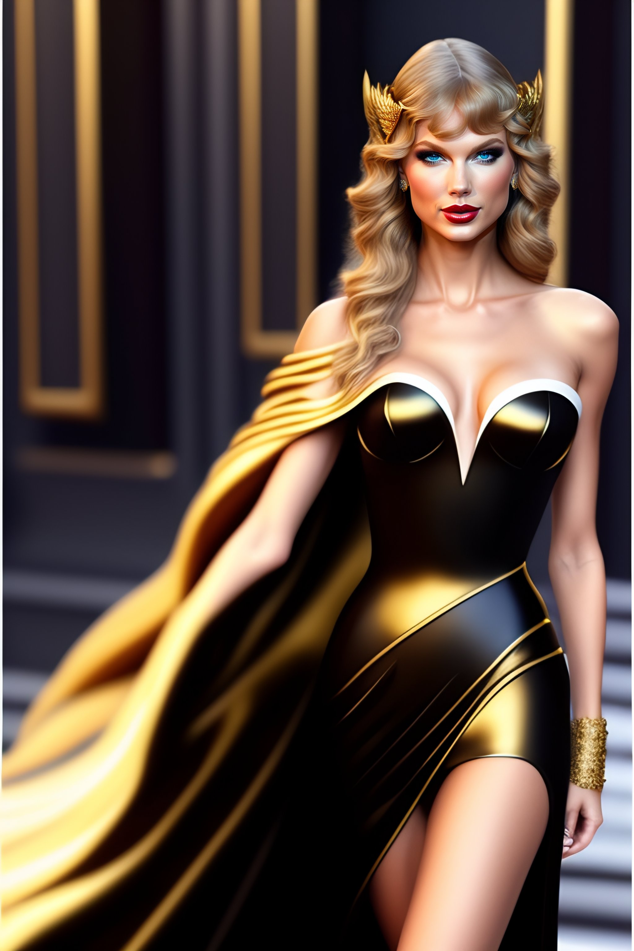 Taylor swift greek goddess black soft flowing gown, online game character, queen, superpowers, fantasy, combative, powerful, vengeful, long gown full body character, white skinned, gold accessories