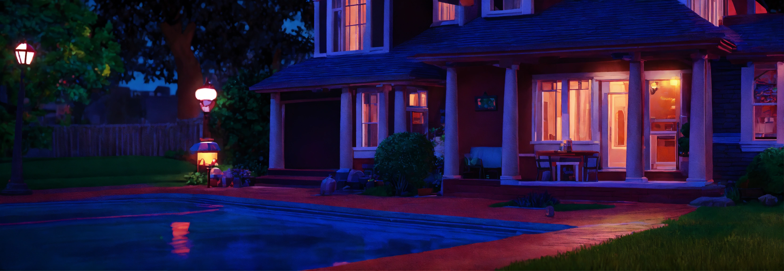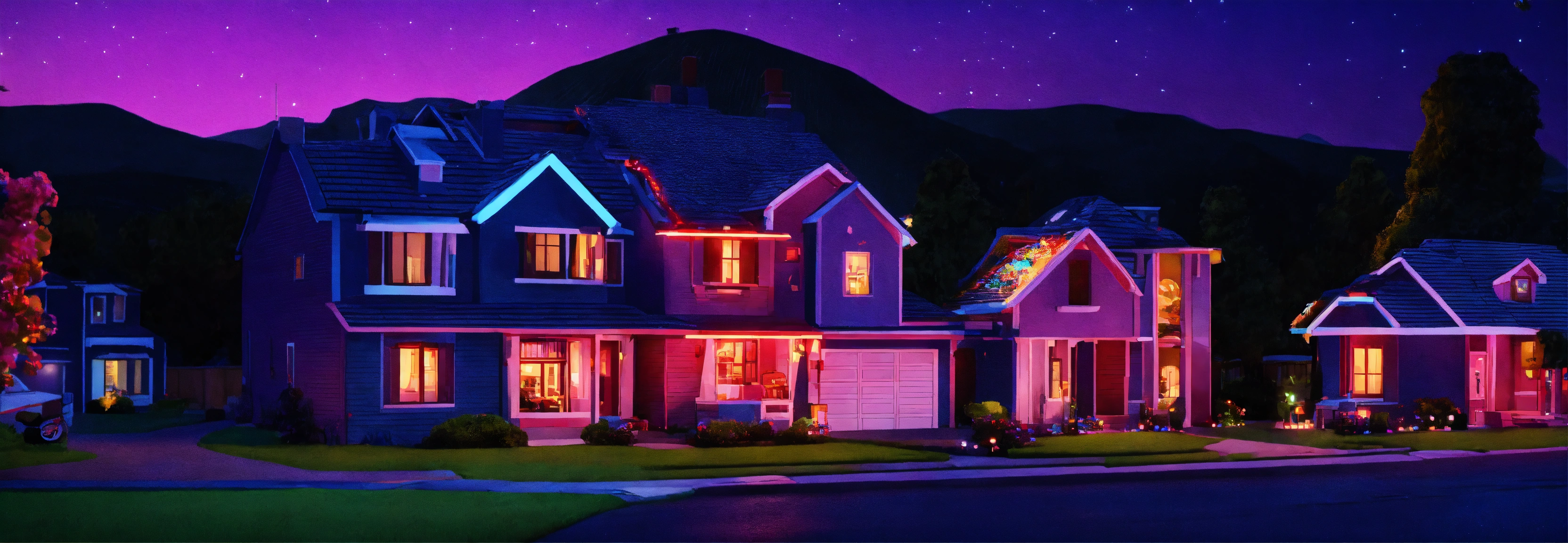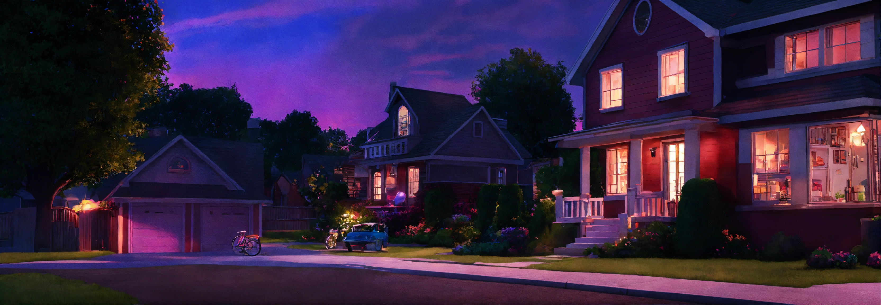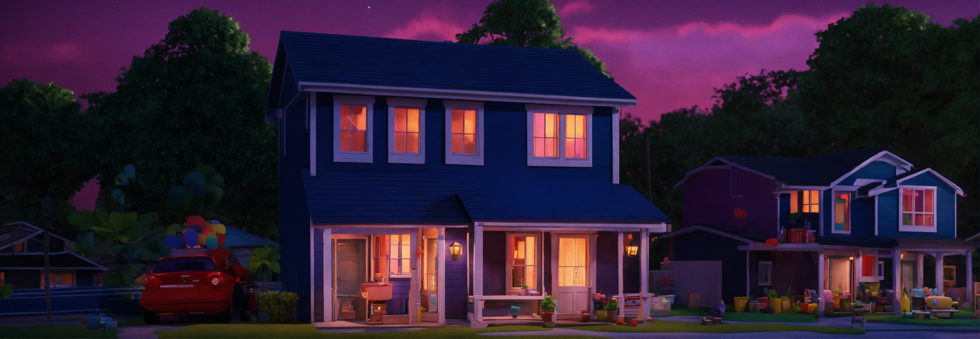 Cgi! pixar 80's style neighborhood homes, house party, red lights, no people, highly detailed, stop motion! purple and blue lighting! dark nighttime sky, anatomically correct
