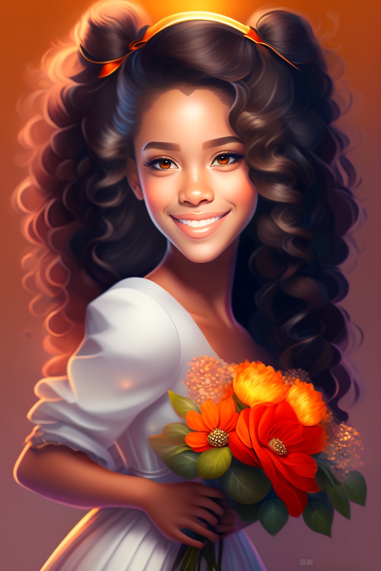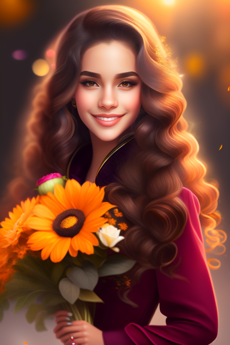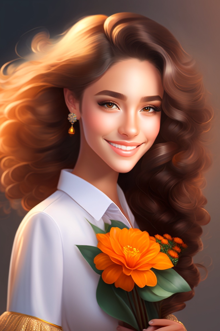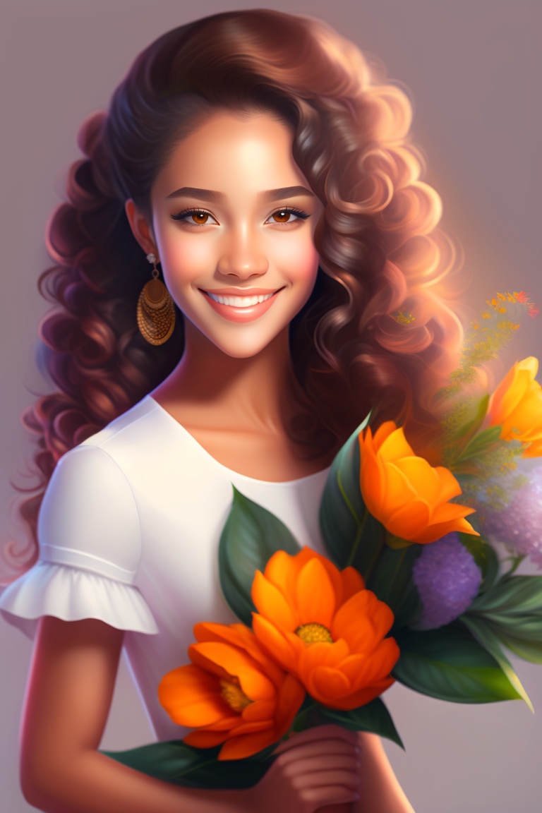 The cute girl has beautiful tousled long curly hair tied in a ponytail, brown in color, with amber eyes. she is wearing elegant and fashionable clothing, exuding a sophisticated style. her bright smile is accompanied by holding a bouquet of flowers in her hand.