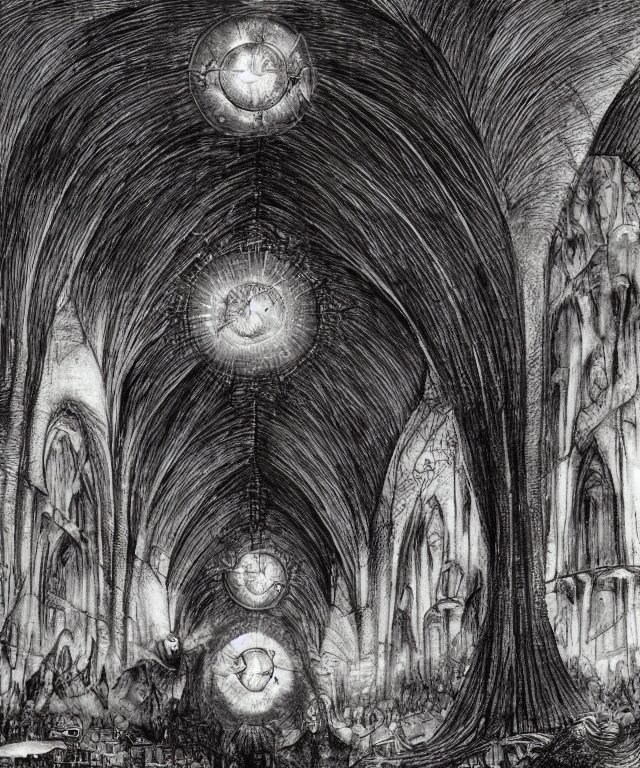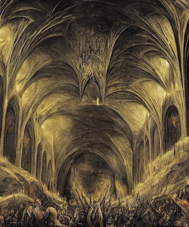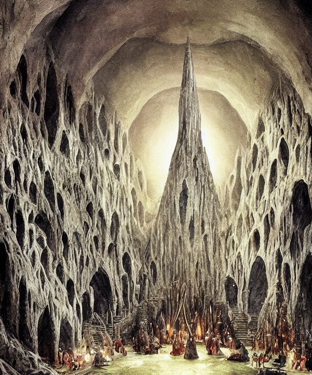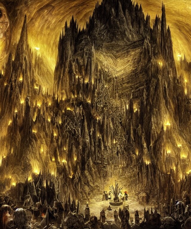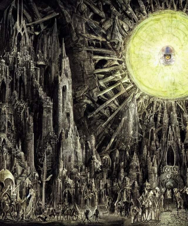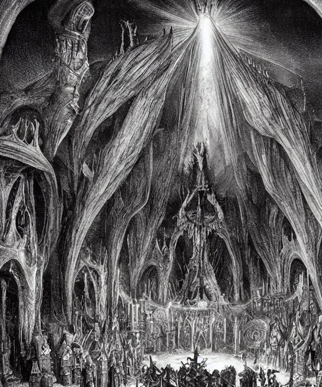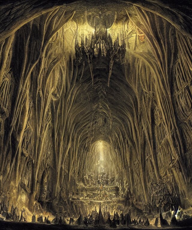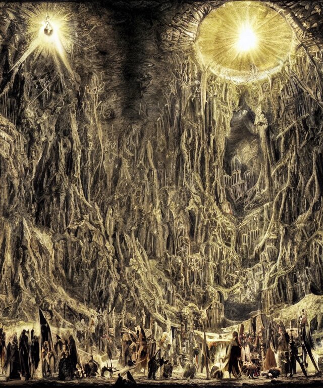 Mines of moria, khazad dum, halls of durin, middle earth, tolkien, a bright orb of light in the center of a grand hall, outer edges shrouded in darkness with creatures crawling out into the light, in the style of hieronymus bosch
