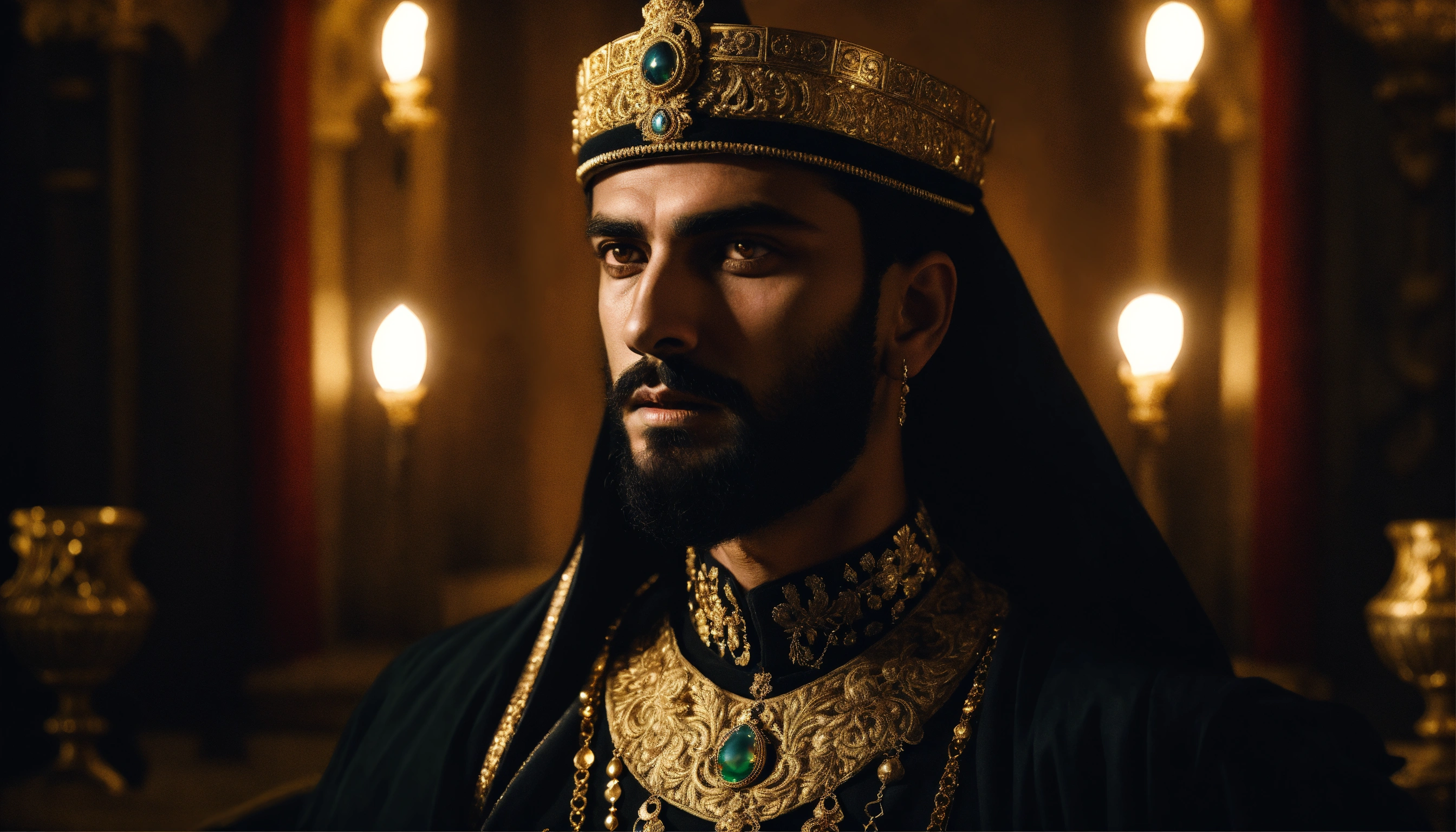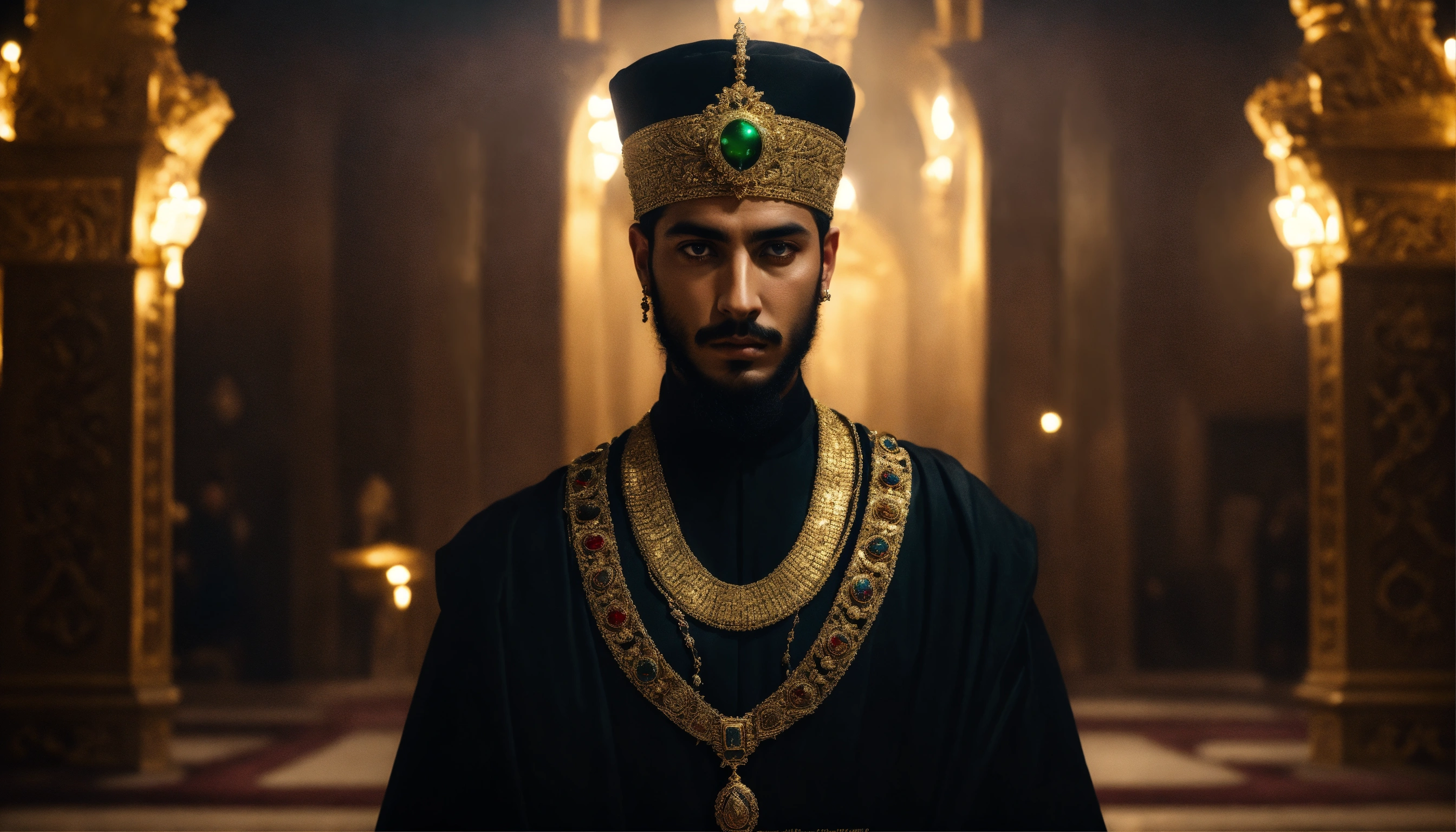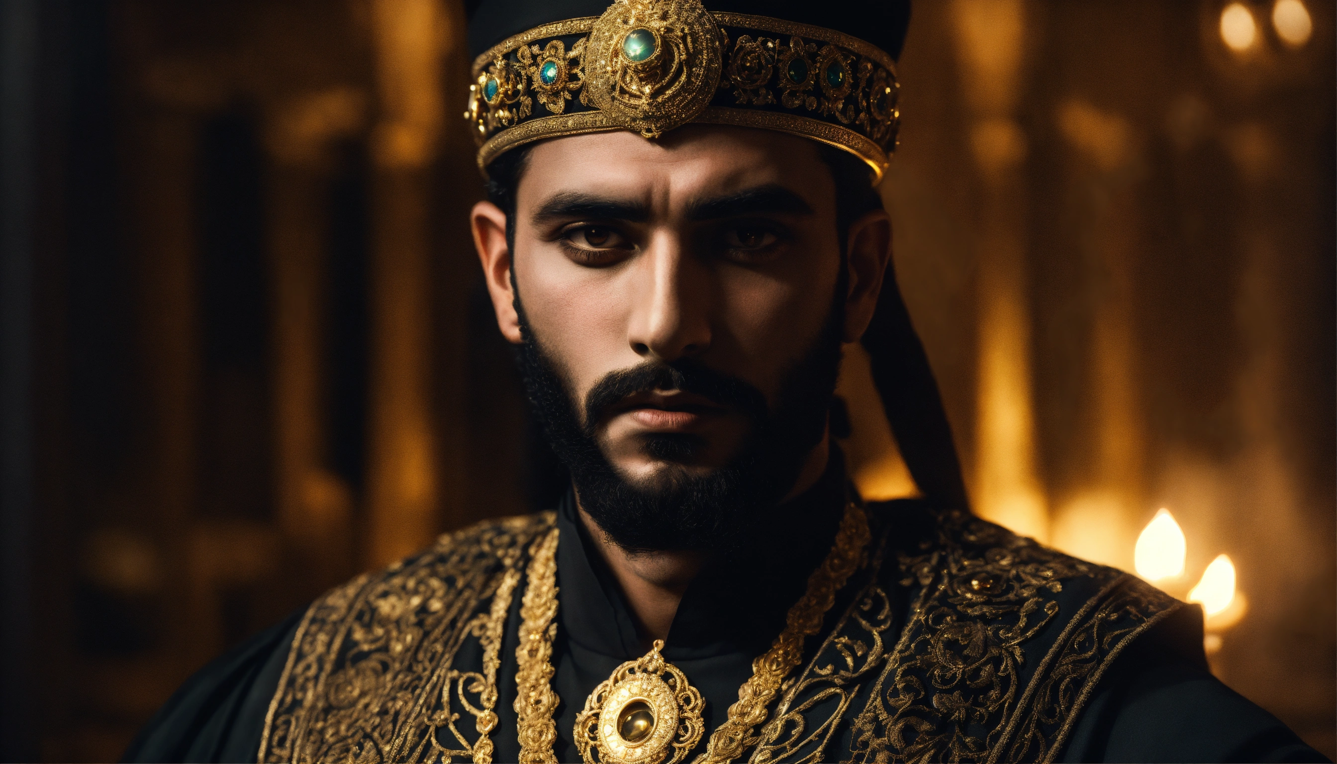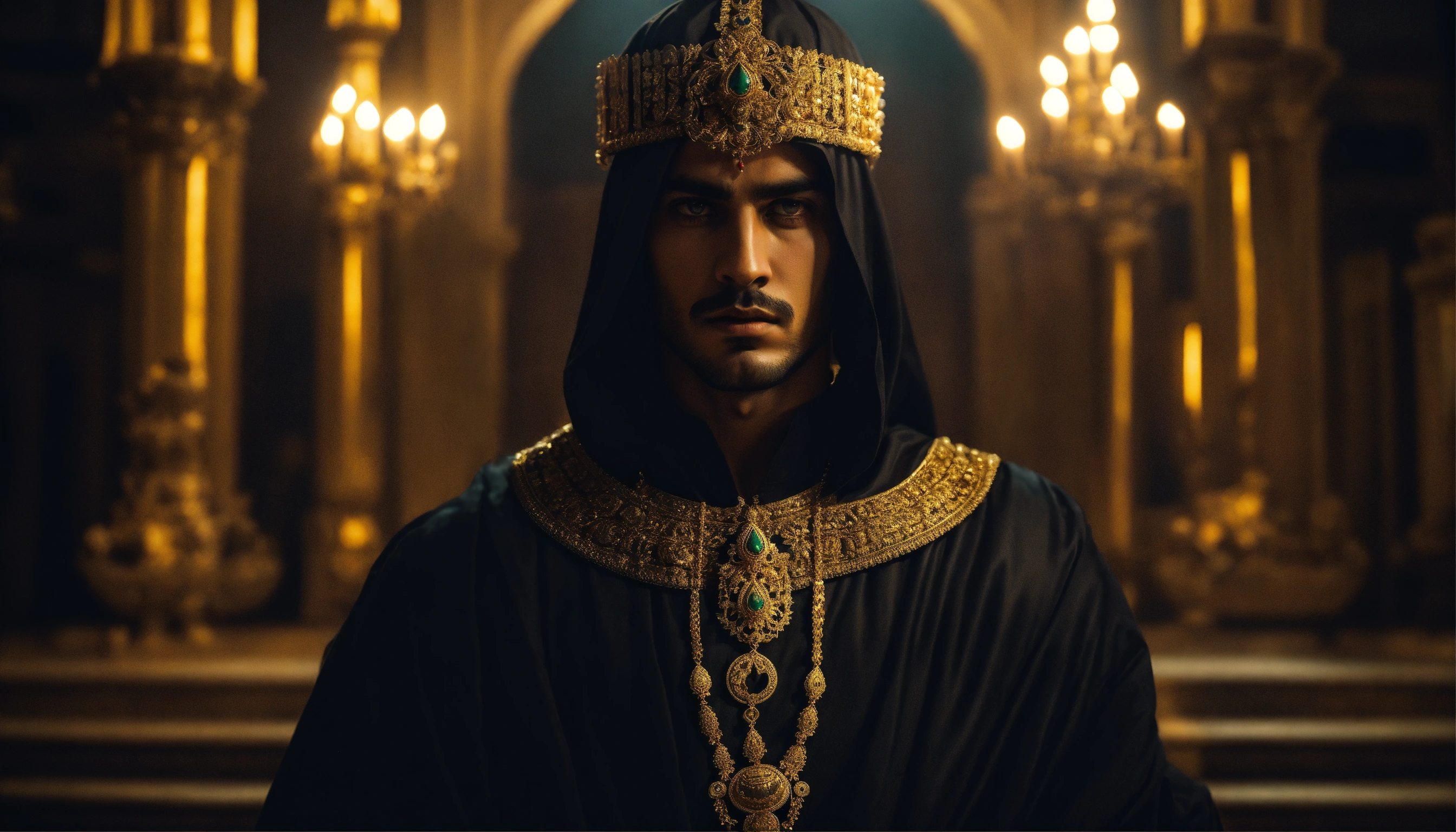 Dark, mysterious and dramatic portrait of a young handsome ancient arabic tyrannical ruler with glowing eyes wearing dark clothes and gold ornate jewellery in a sinister, dimly-lit palace chamber.