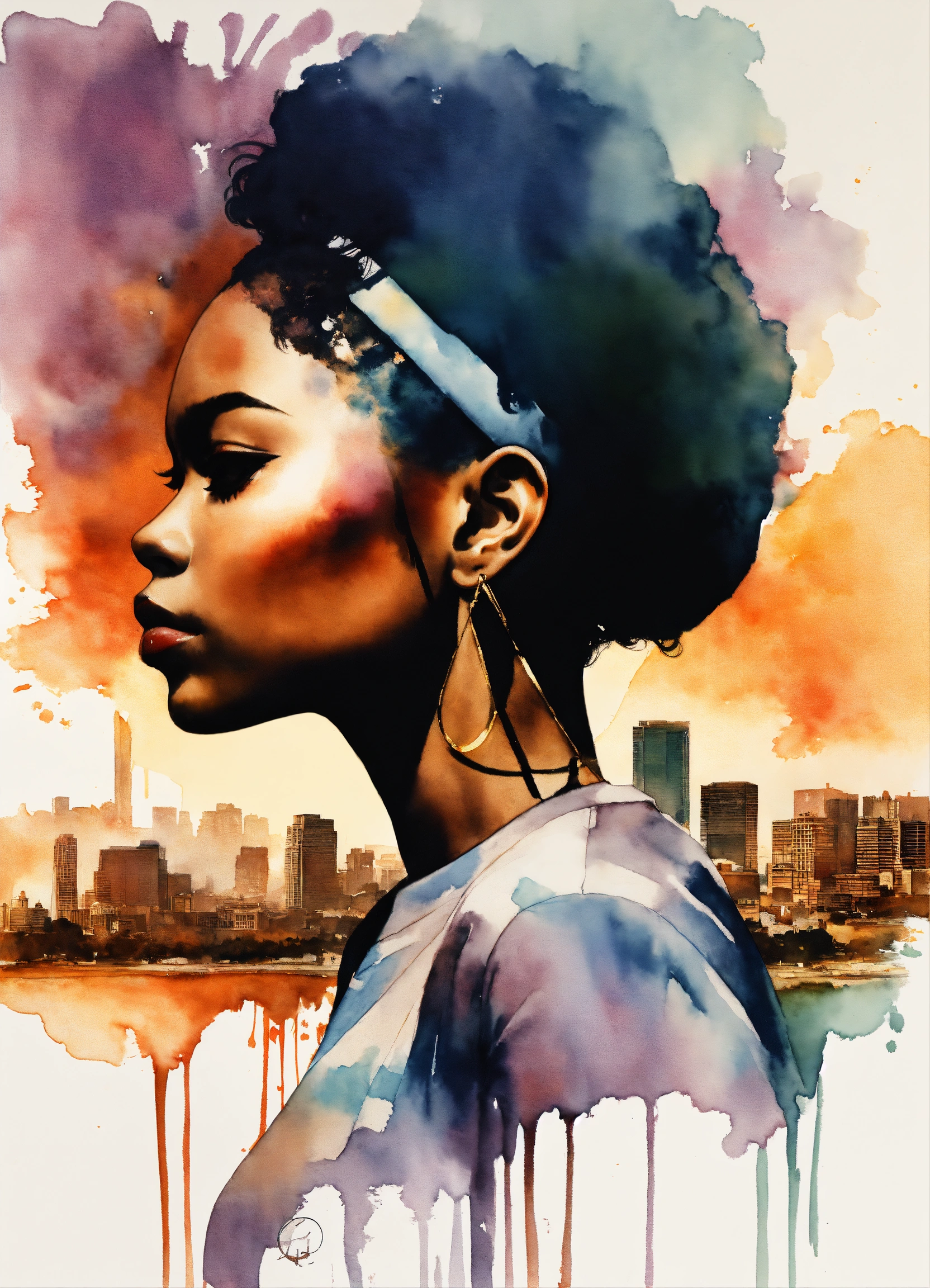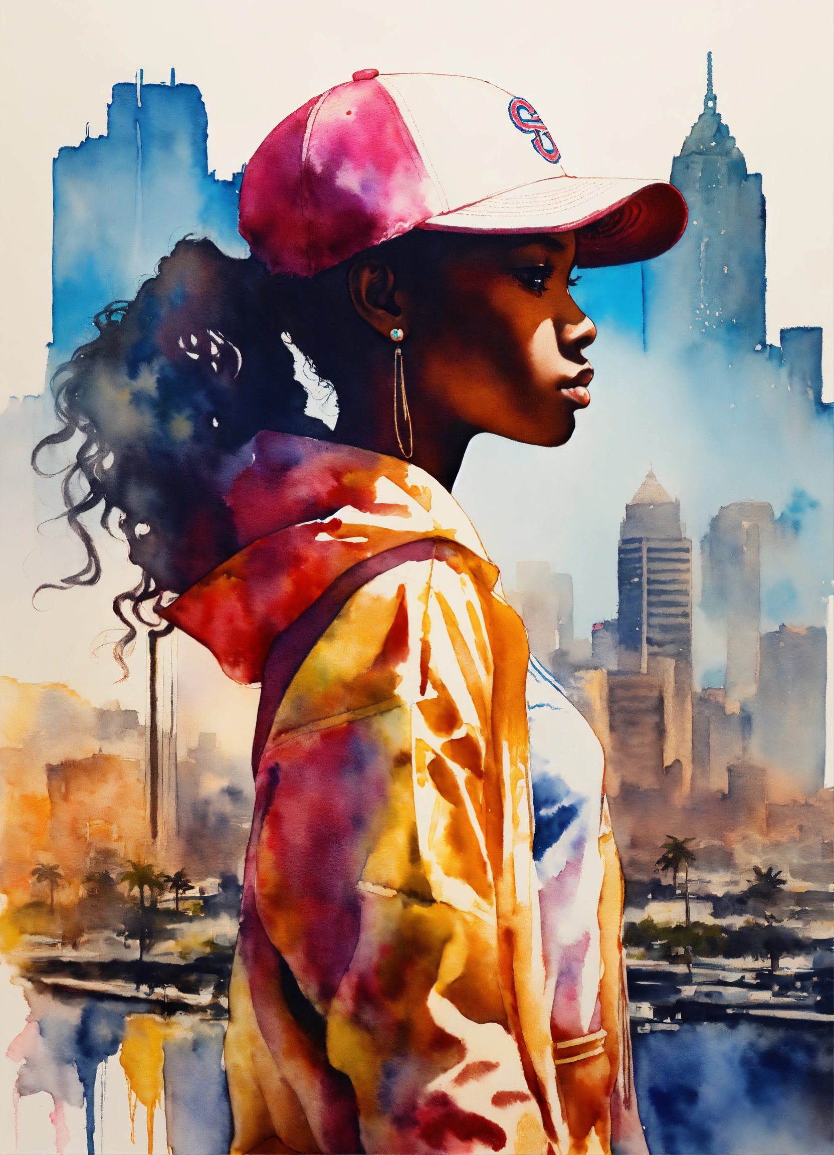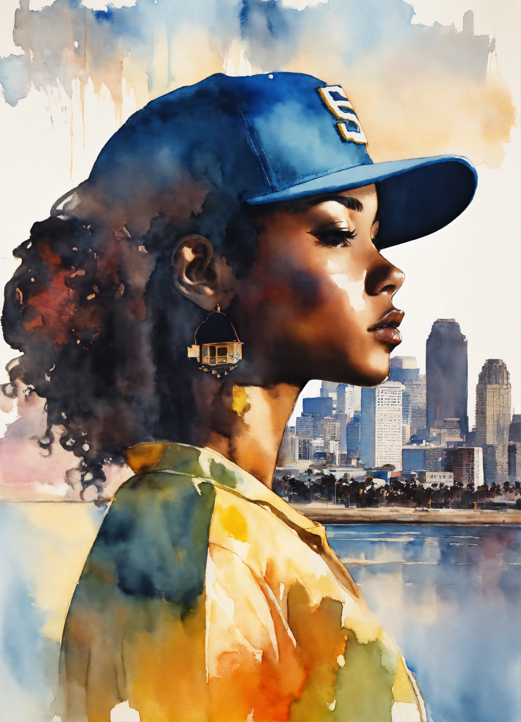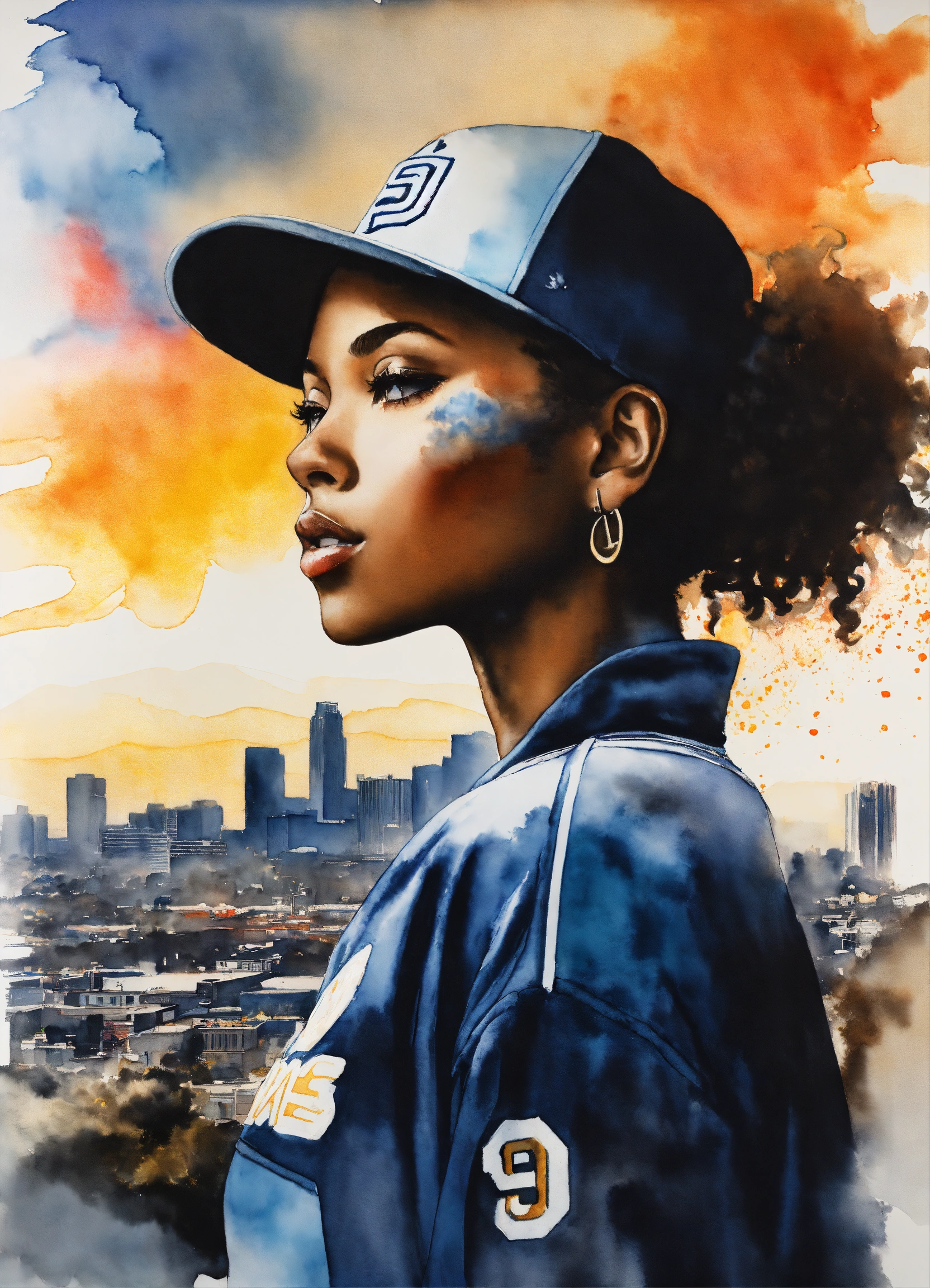 Exquisite watercolor painting on a pure white paper background, where an african american woman with a featureless face, her attire is a double exposure of the san diego, ca sunny skyline. with a snapback baseball hat on over a long low afro puff hairstyle, the city's landmarks become her track suit, merging beautifully double exposed with her clothing with her silhouette at 50% opacity. her silhouette is half the opacity of the background to allow the skyline to be highlighted. the artwork's charm is further enhanced by ethereal colors of the padres current at home uniform represented in the smoke and a dramatic paint splash. double exposure overlay. manga kewpie cartoon style
