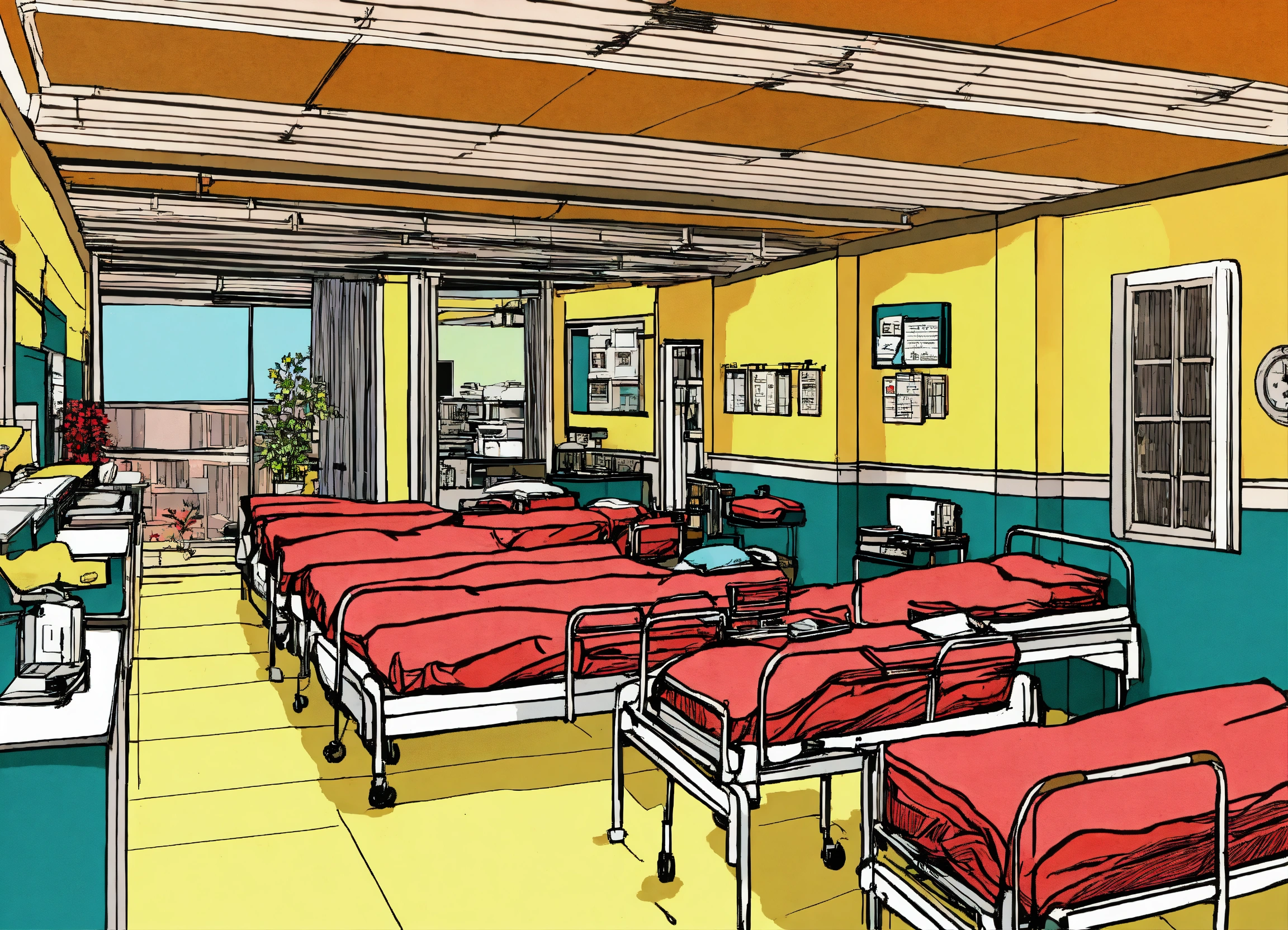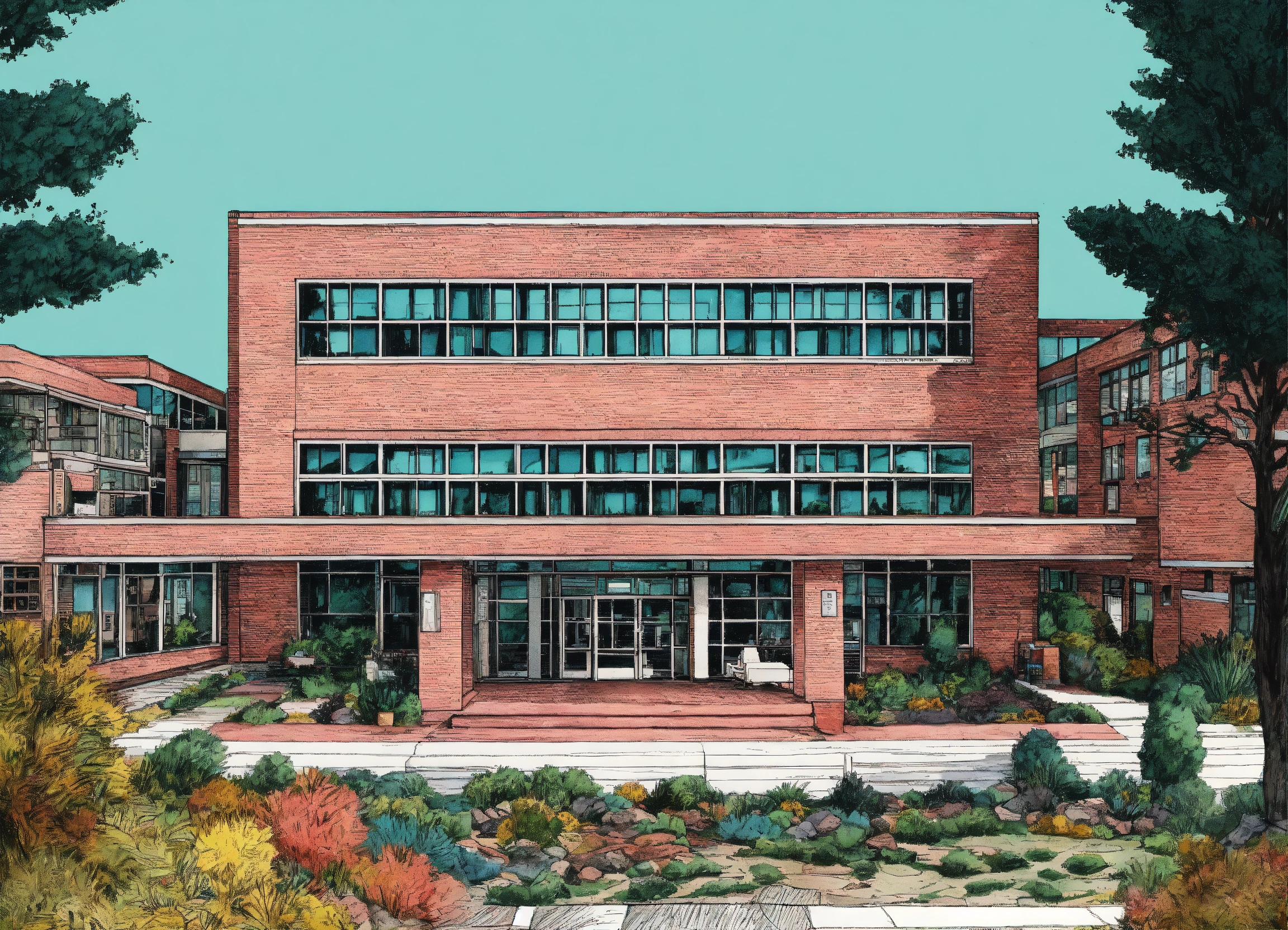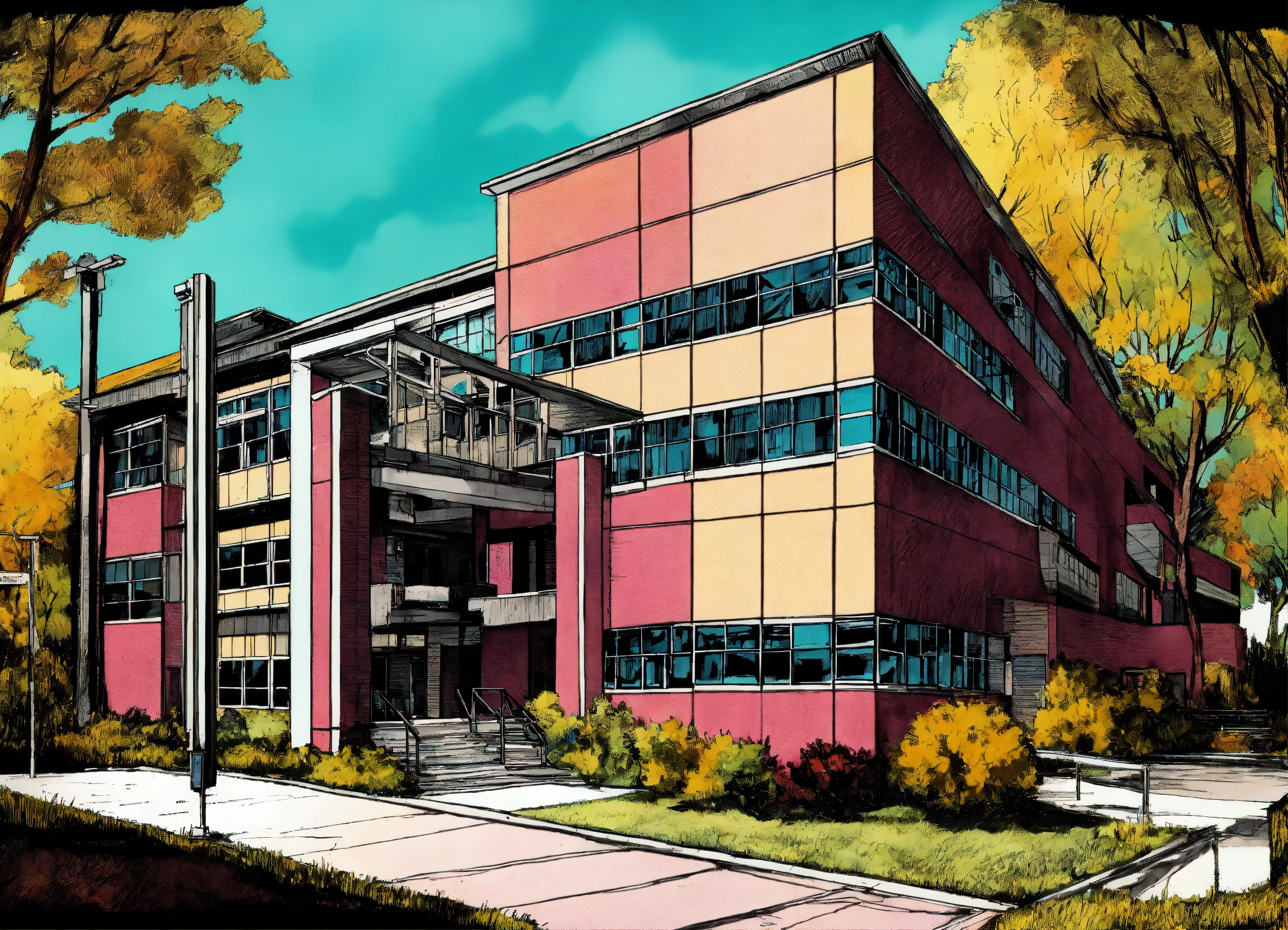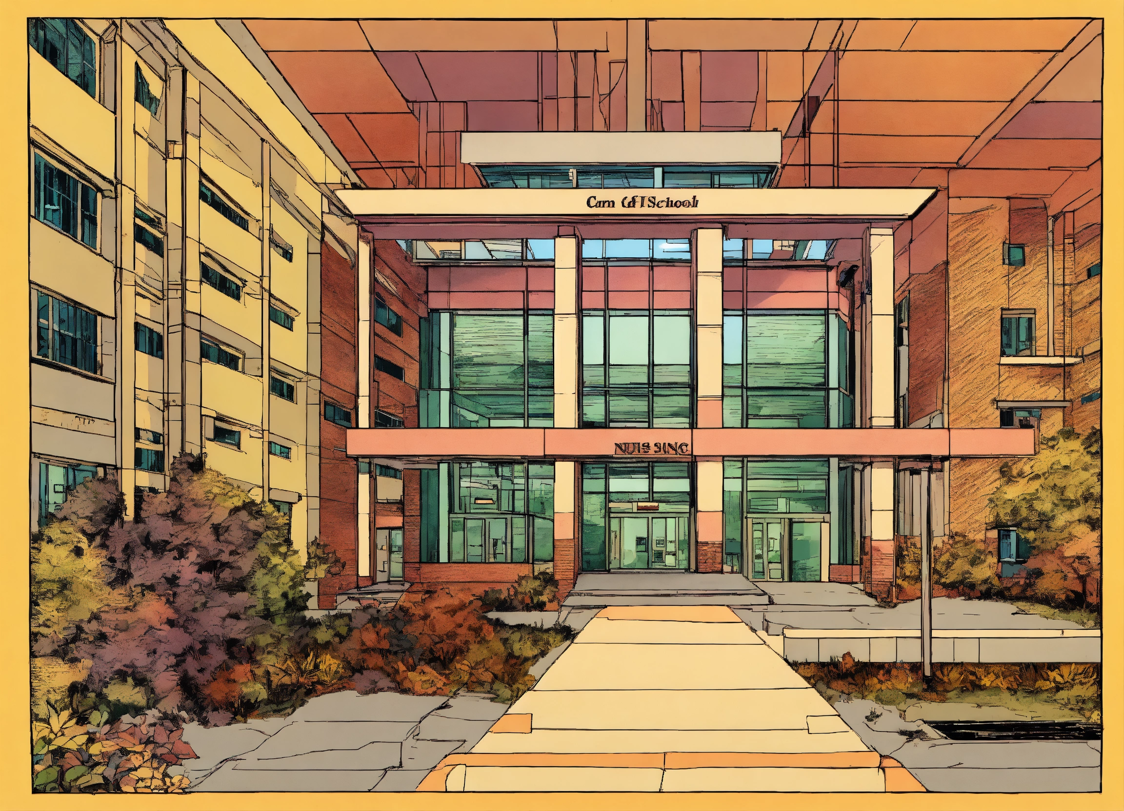 Nursing school. pen and ink style graphic, 90’s colors, very detailed and deep. modern healthcare, architectural hospital.