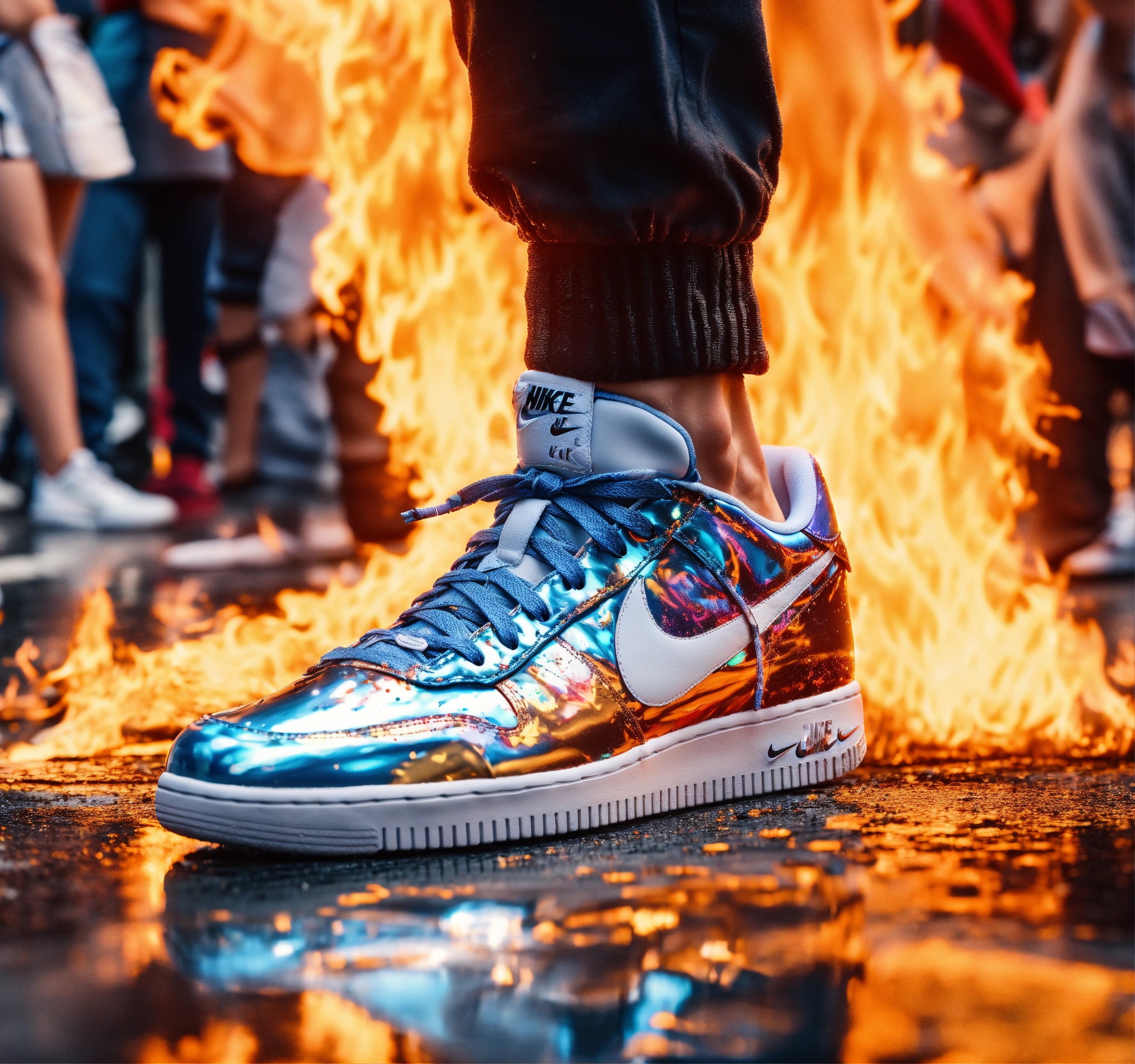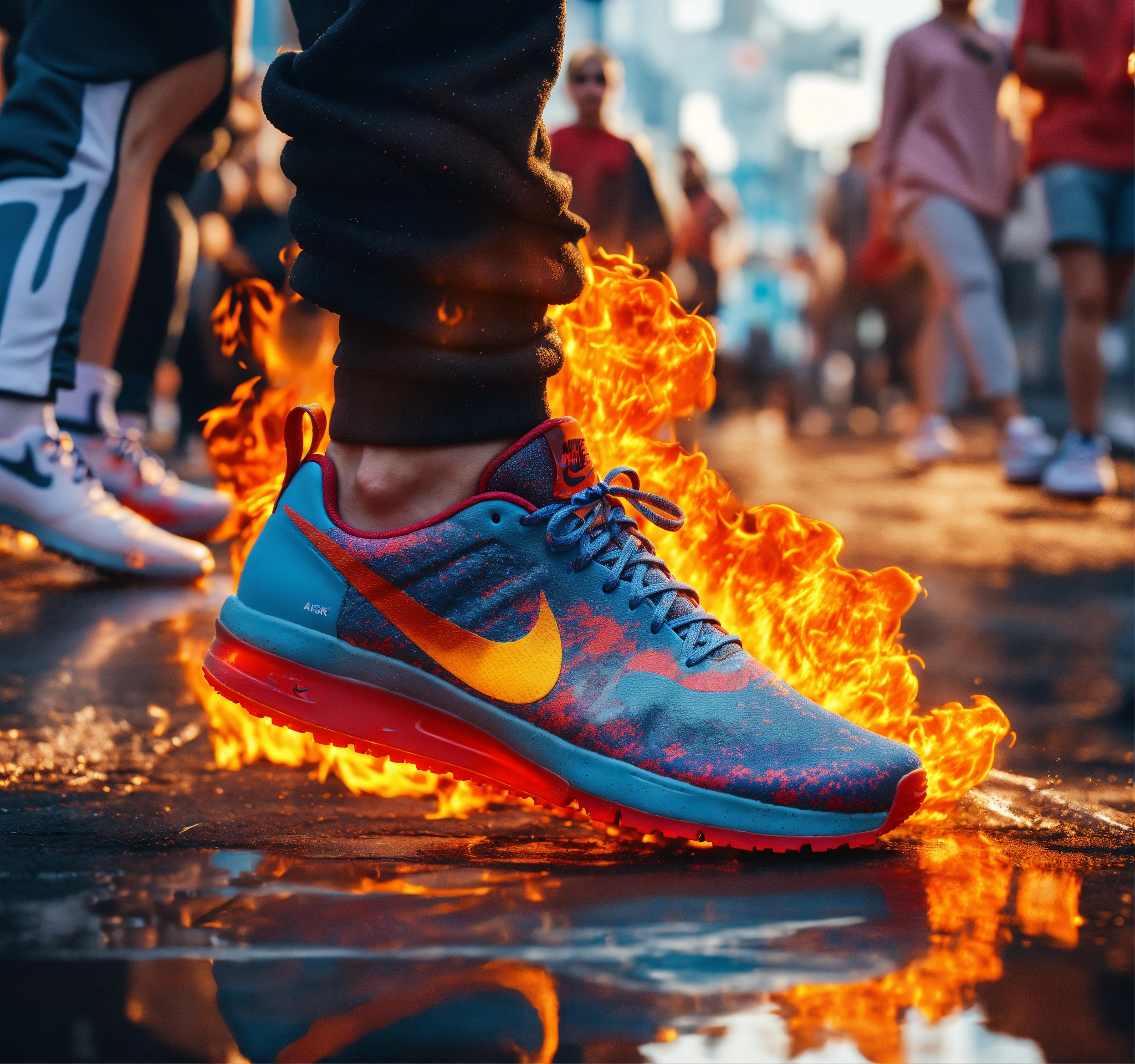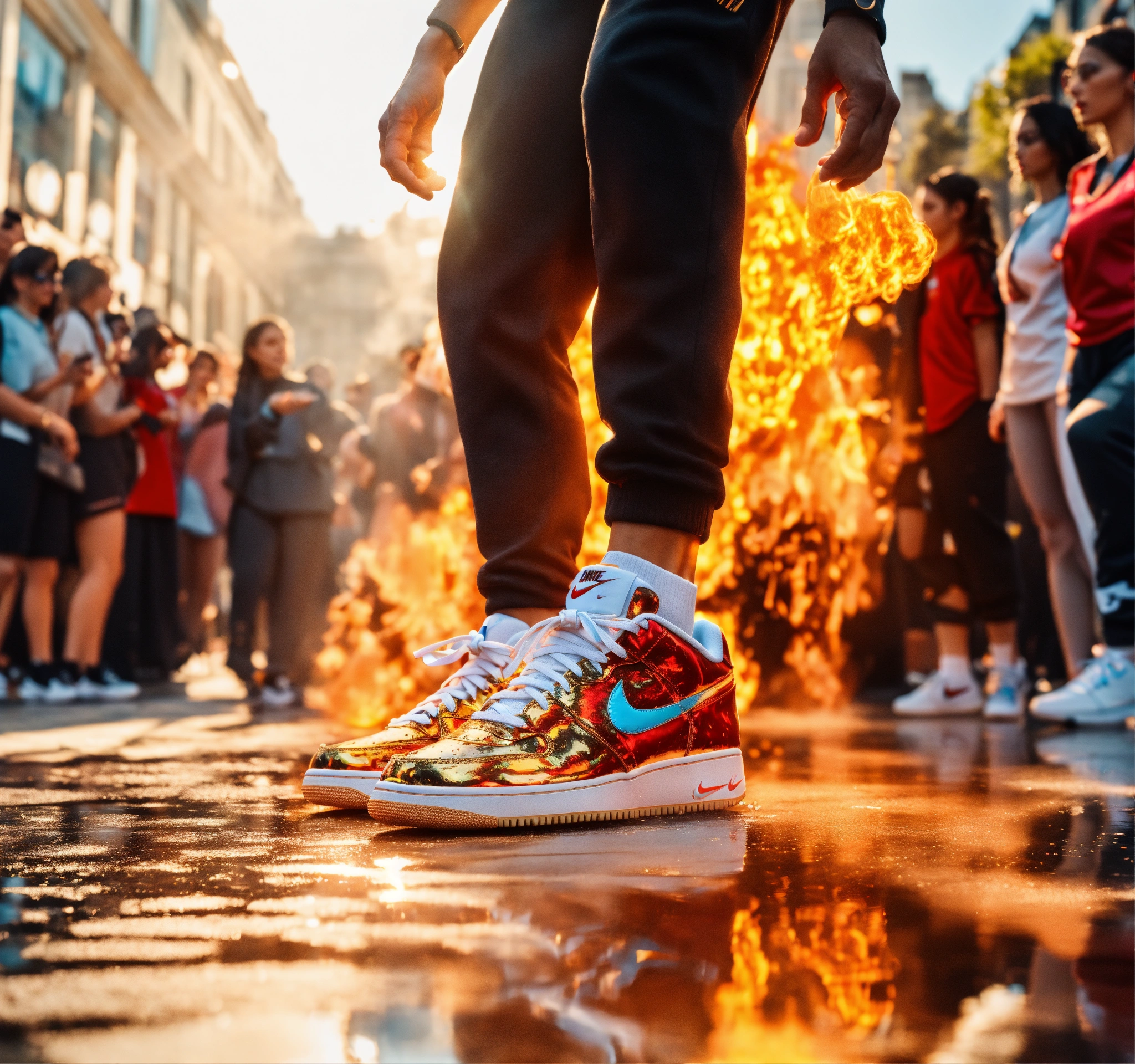 8k hdr photo people wearing nike sneakers on fire in a fashion show on a sunny day, highly detailed, vibrant, production cinematic render, reflections on wet street, 8k render