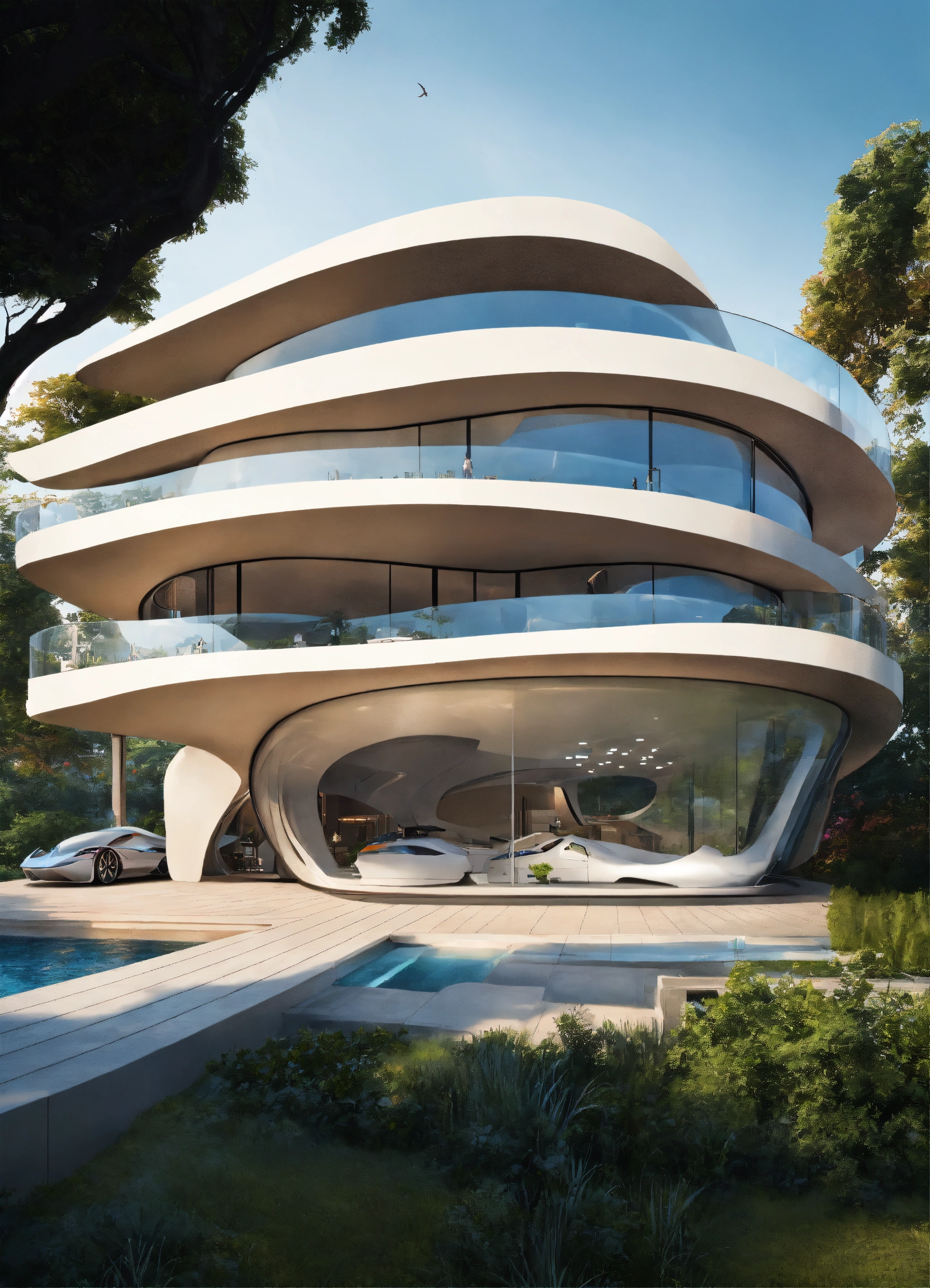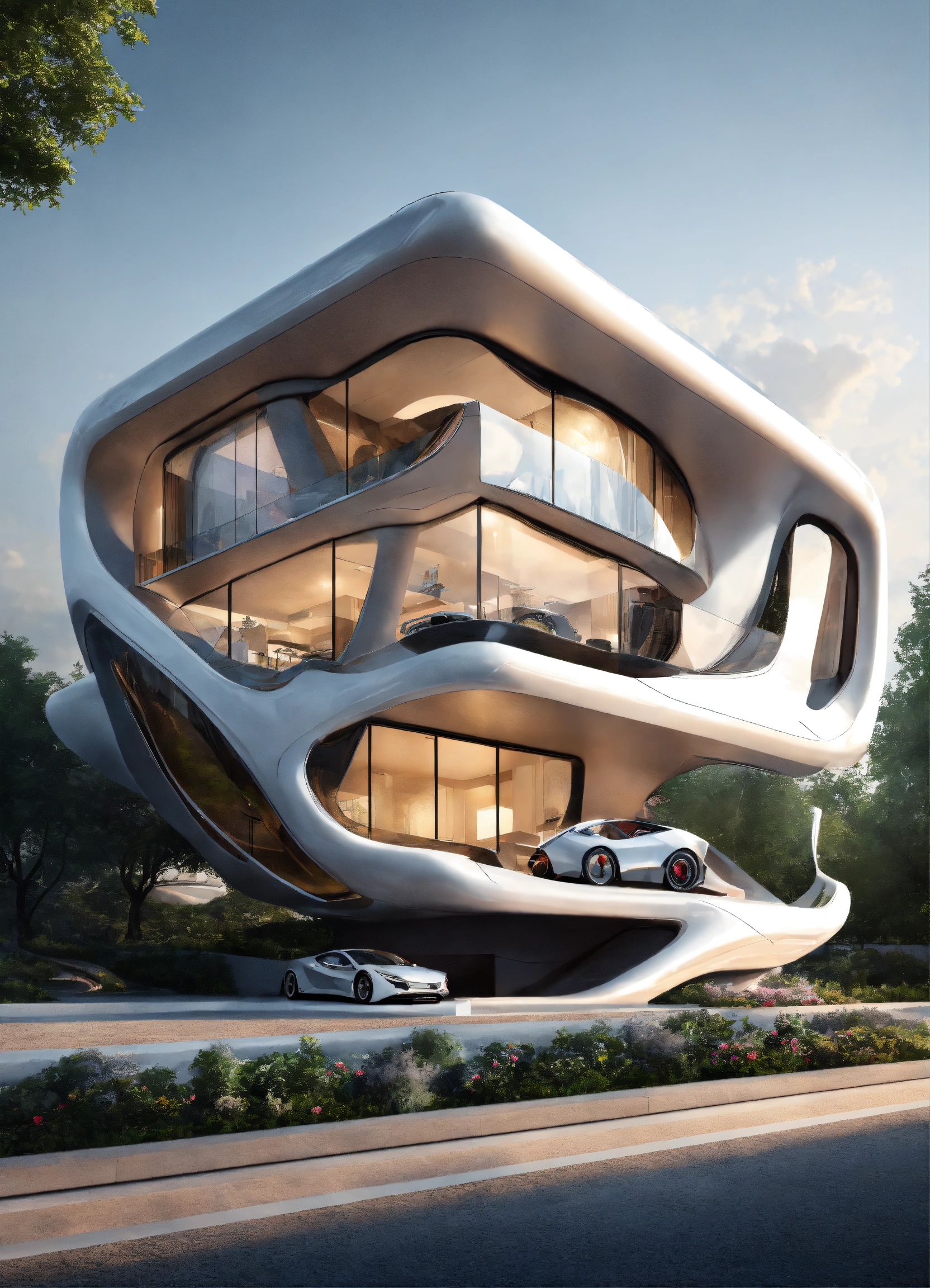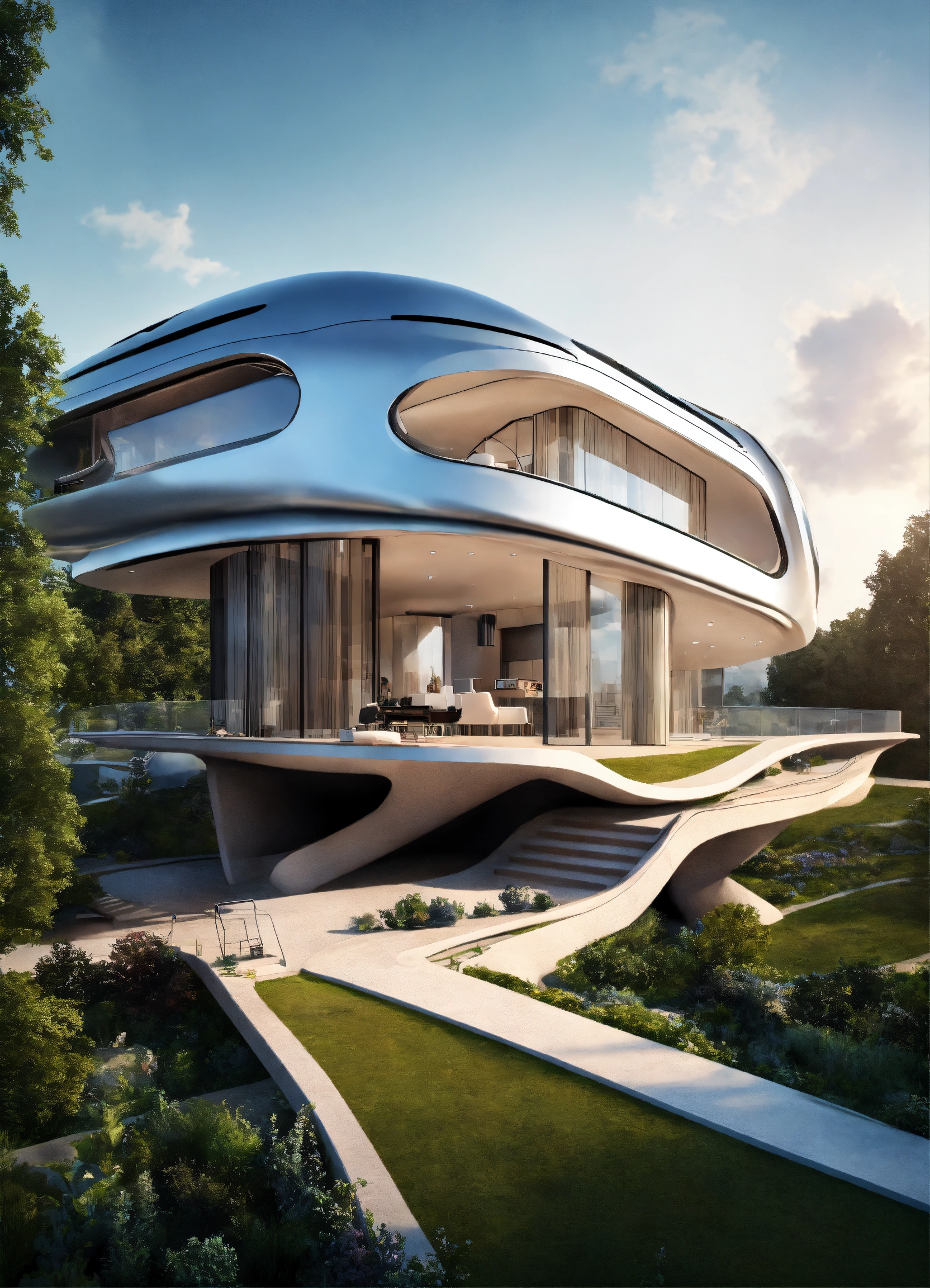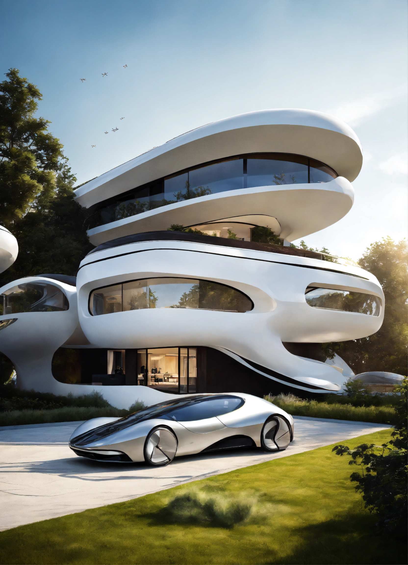 Modern villa of zaha hadid, city of future on background, very detailed, with flying cars, wide range view, perspective