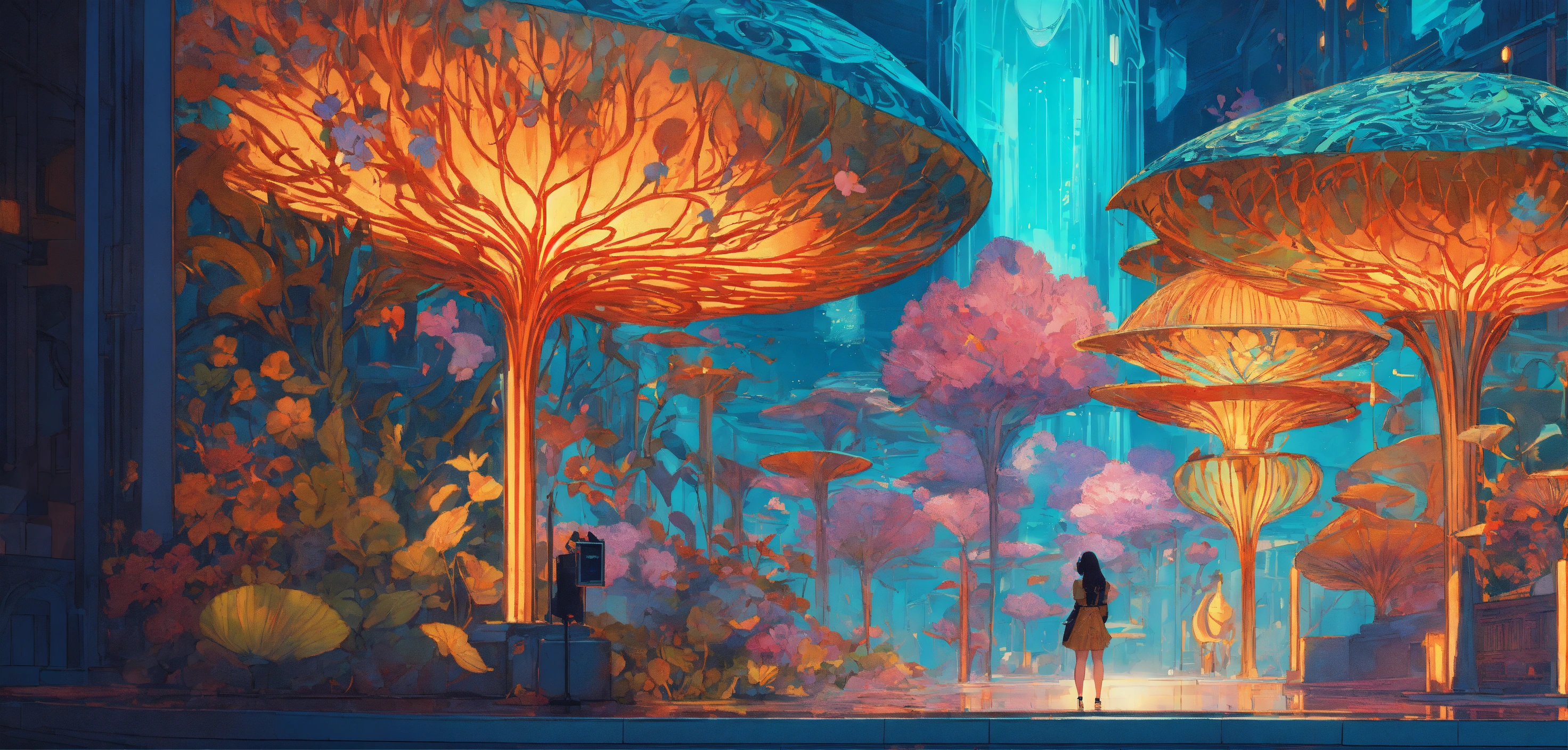 Paper craft style, märchentante, ernst haeckel maria sibylla merian. tristan eaton, victo ngai, artgerm, rhads, ross draws, kaethe butcher, hajime sorayama, greg tocchini, virgil finlay, sci-fi, colors, neon lights, digital painting, pixiv, by ilya kuvshinov, neon lights, 3d, perspective, two colors, blue turquoise