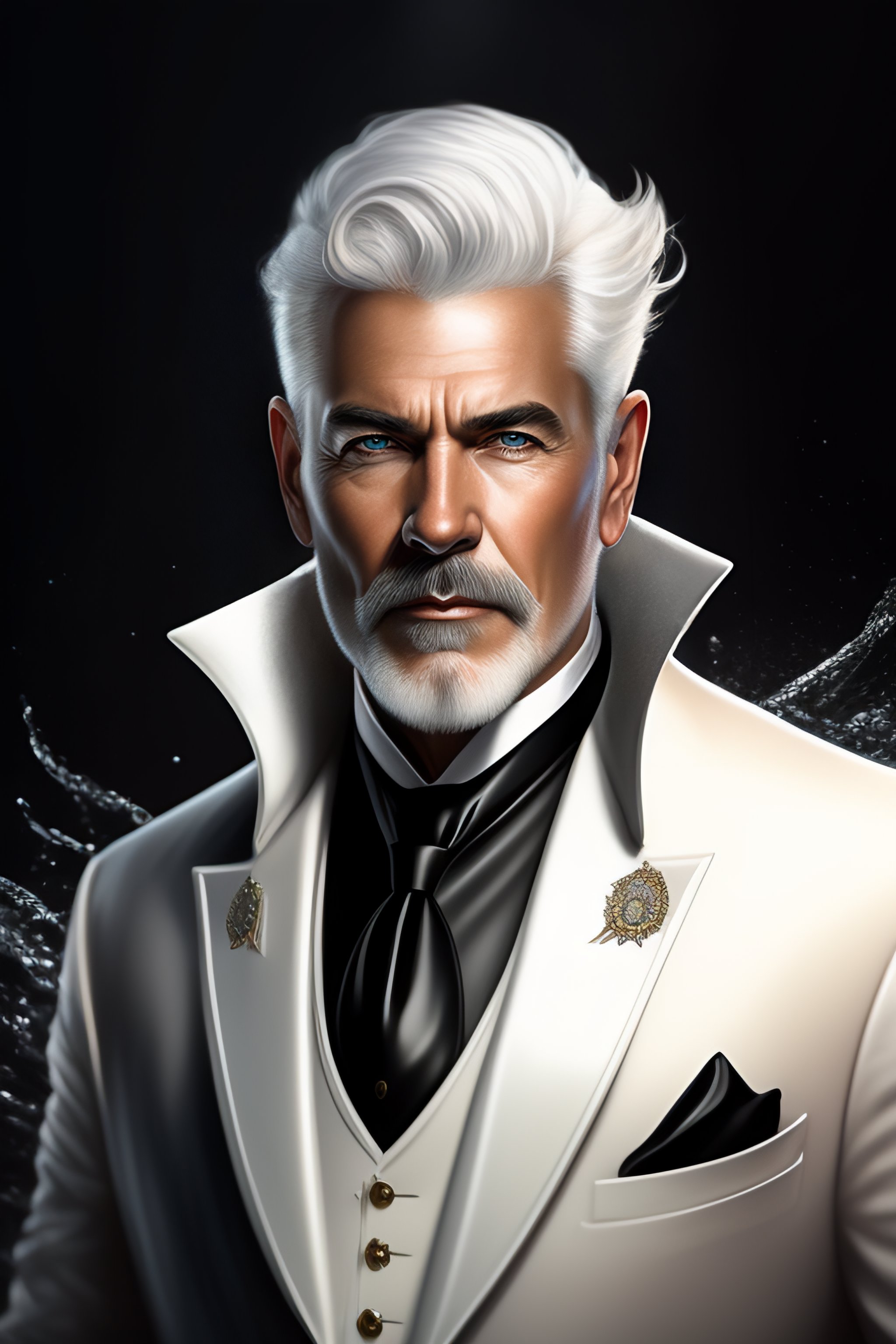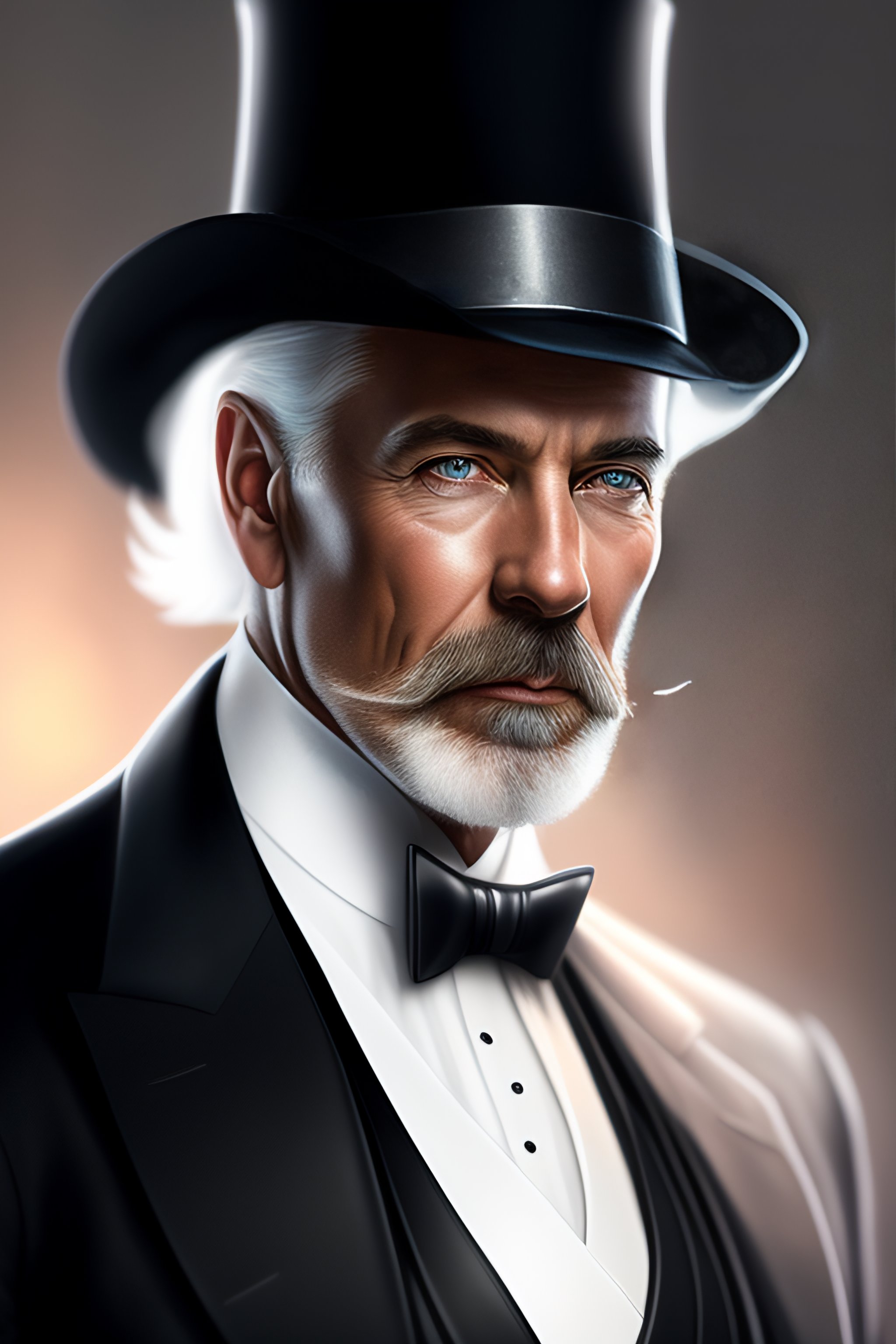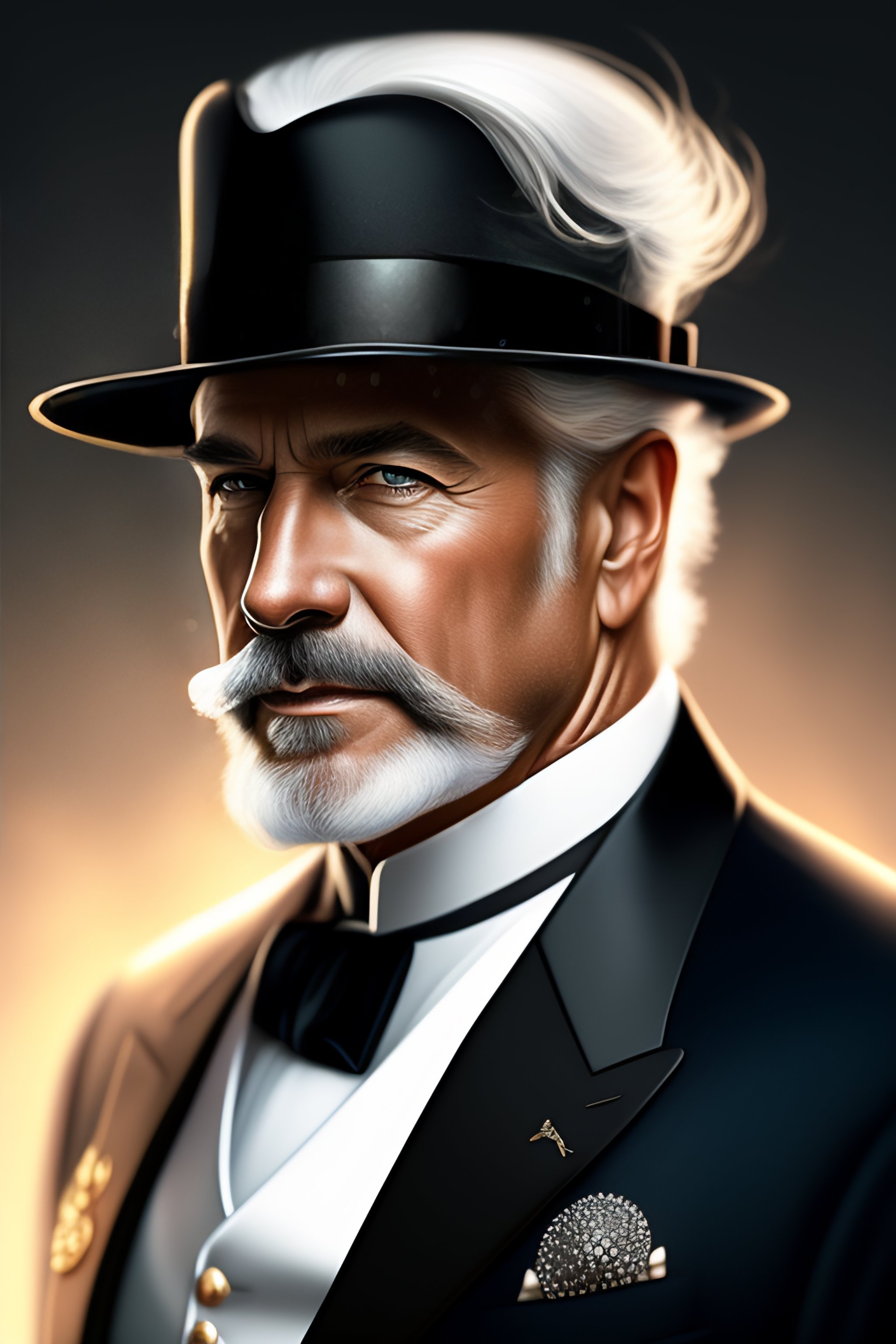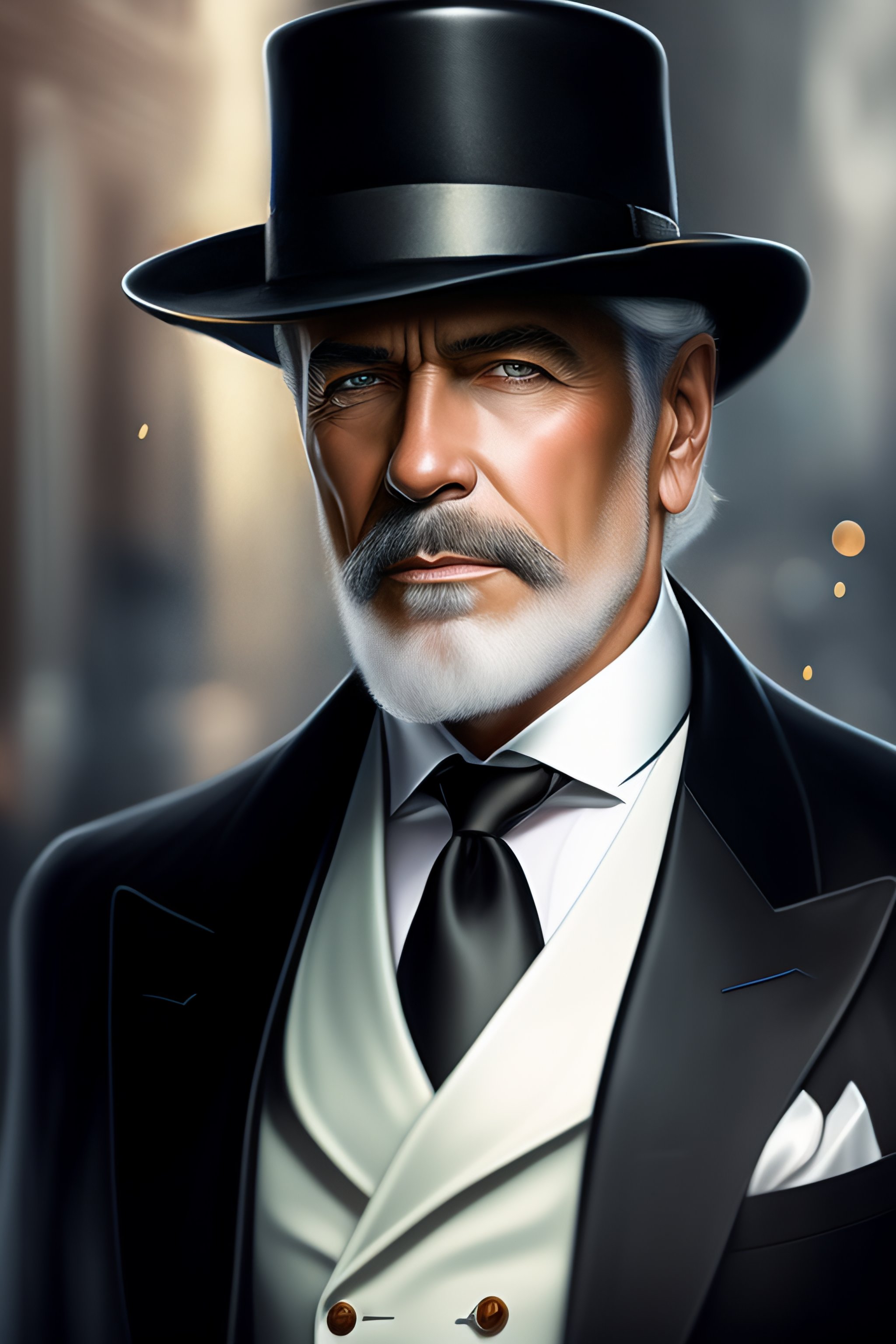 British 65 years old man from american 1890s, white hair and goatee, black suit, black hat, highly detailed, digital painting, splash art, dark, daemoniac