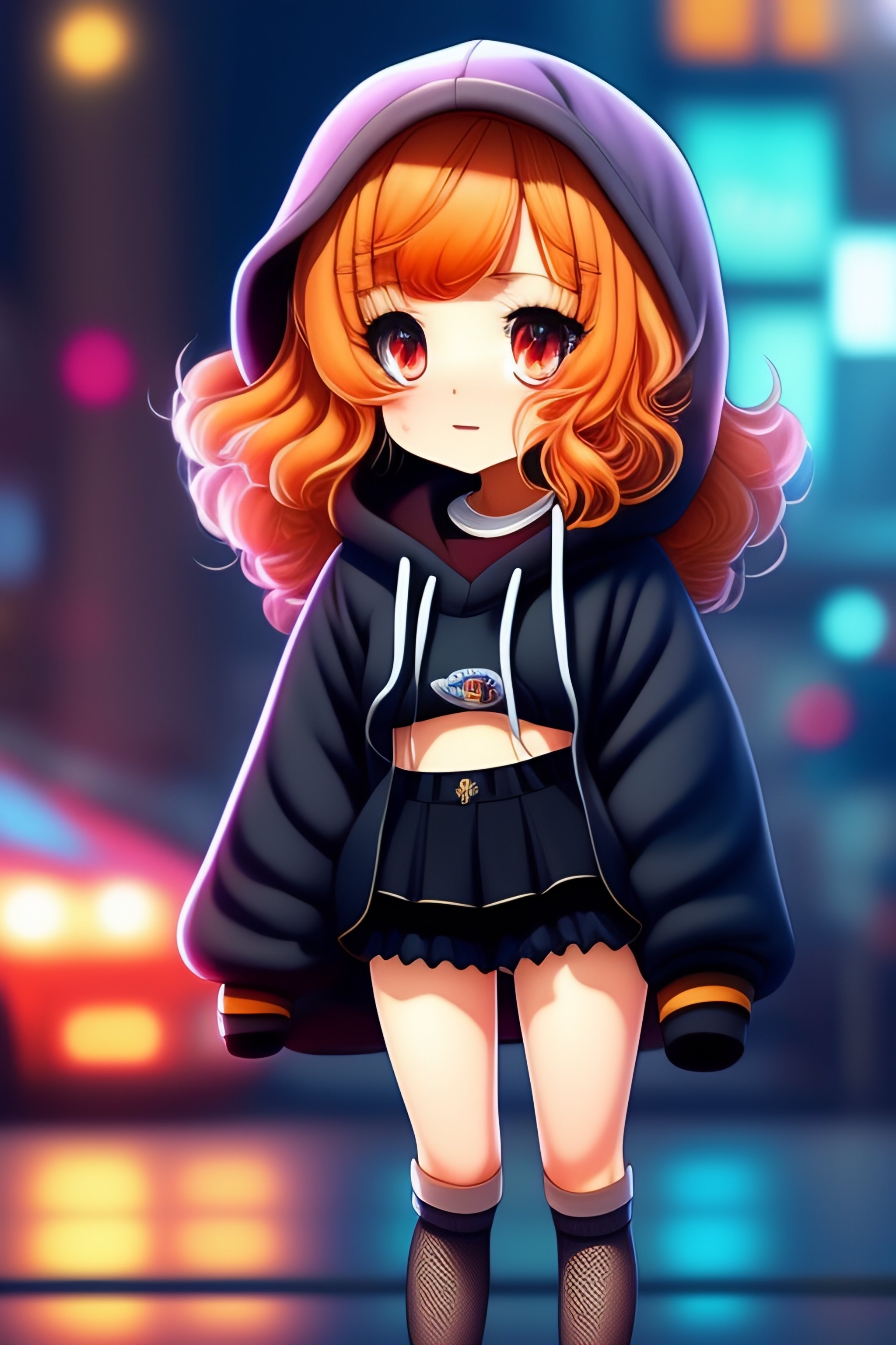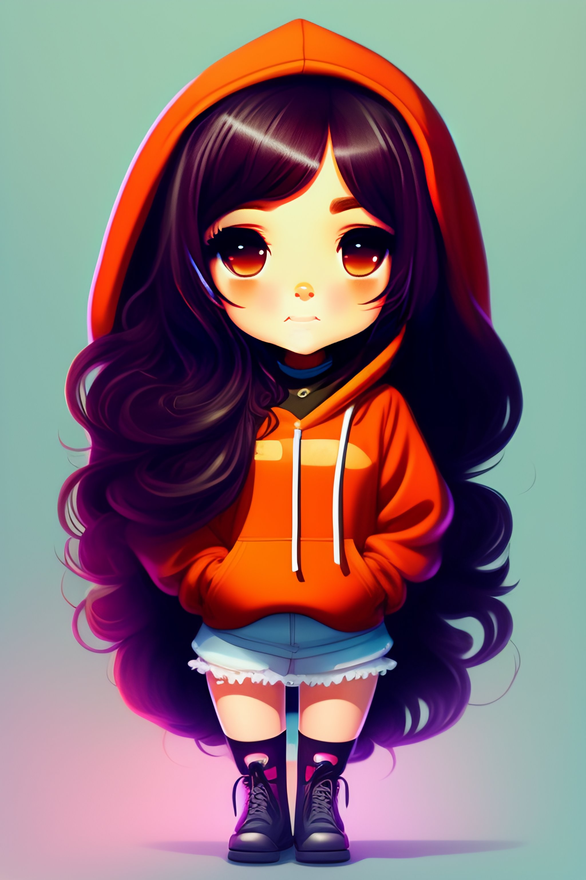 Chibi girl with long hair wearing oversized hoodie and thigh socks