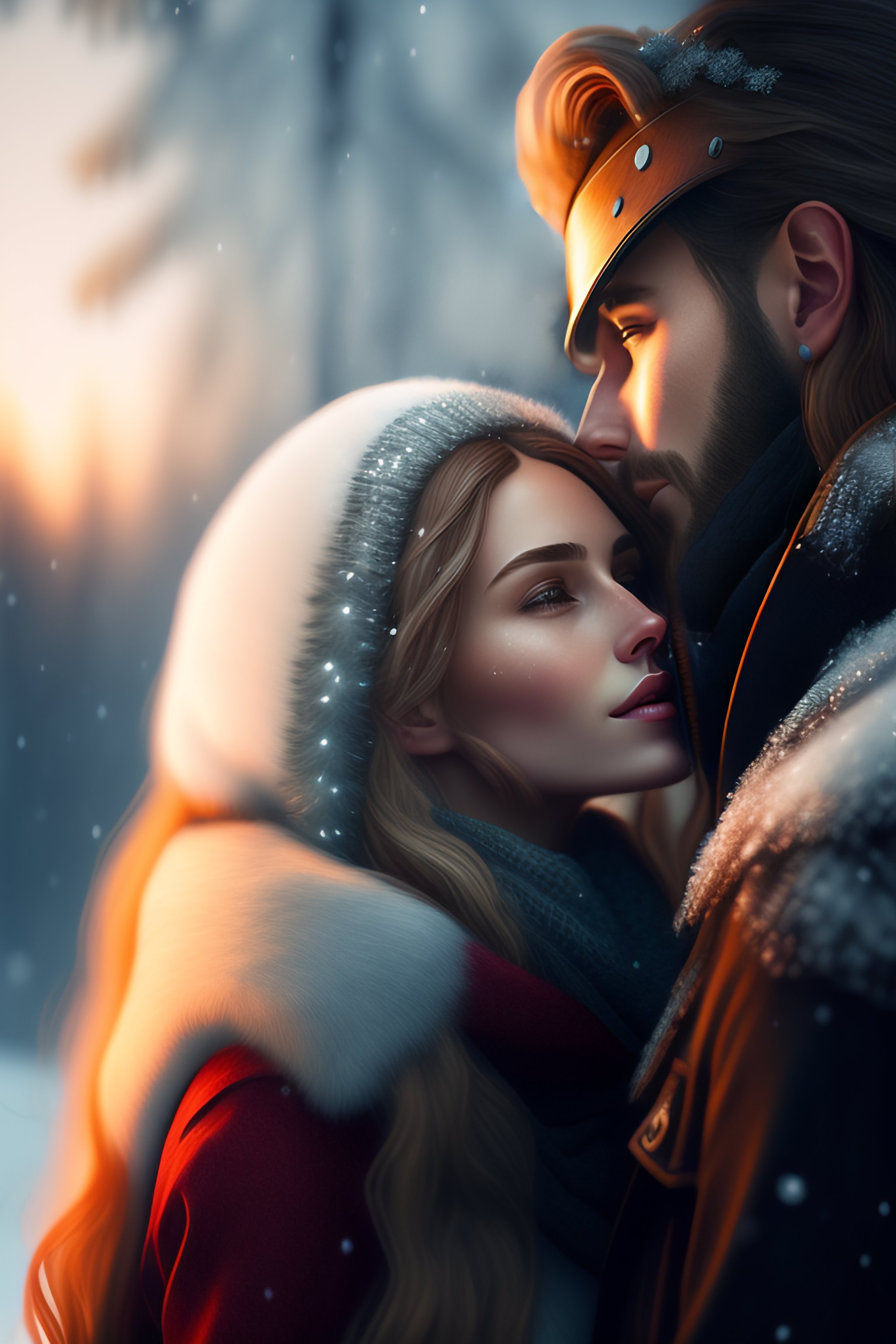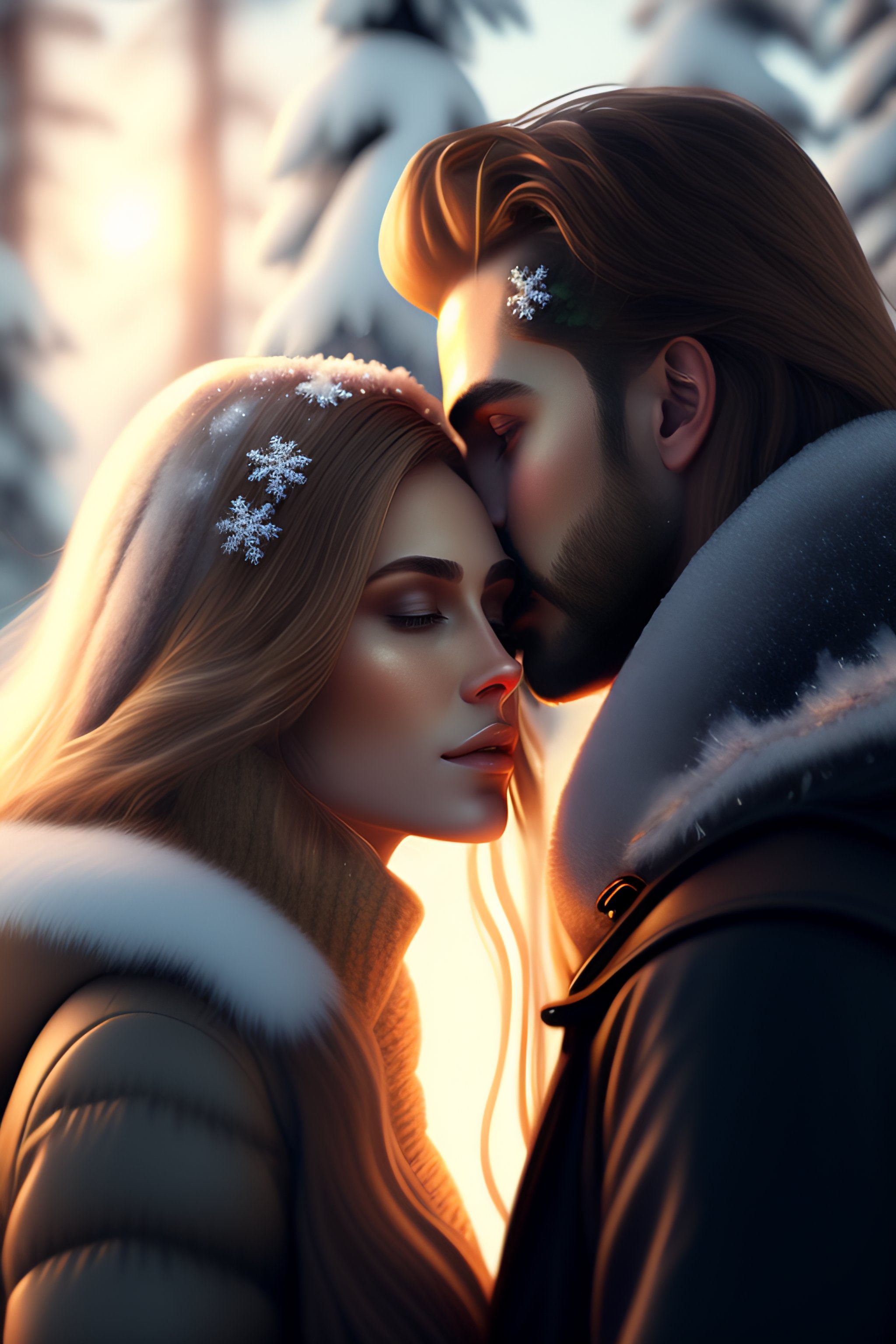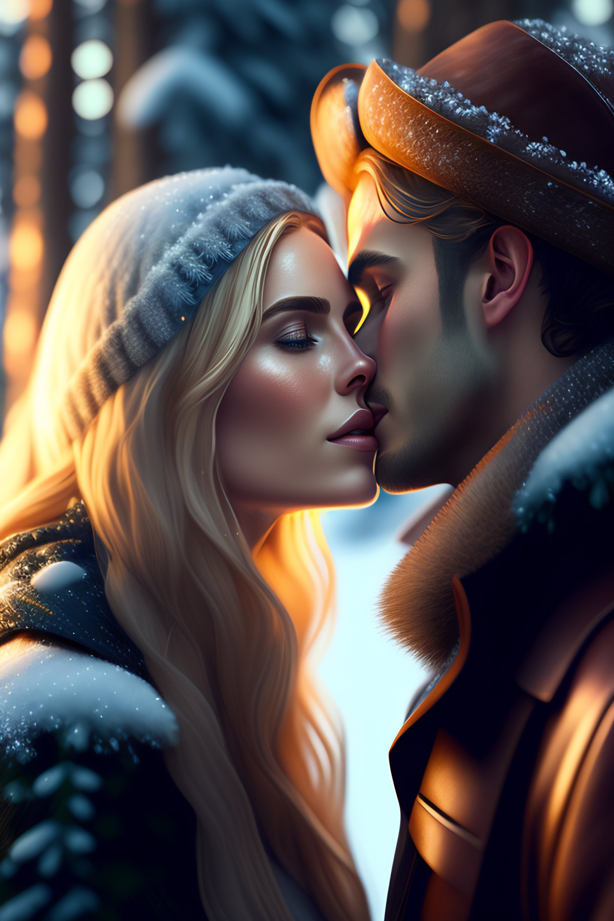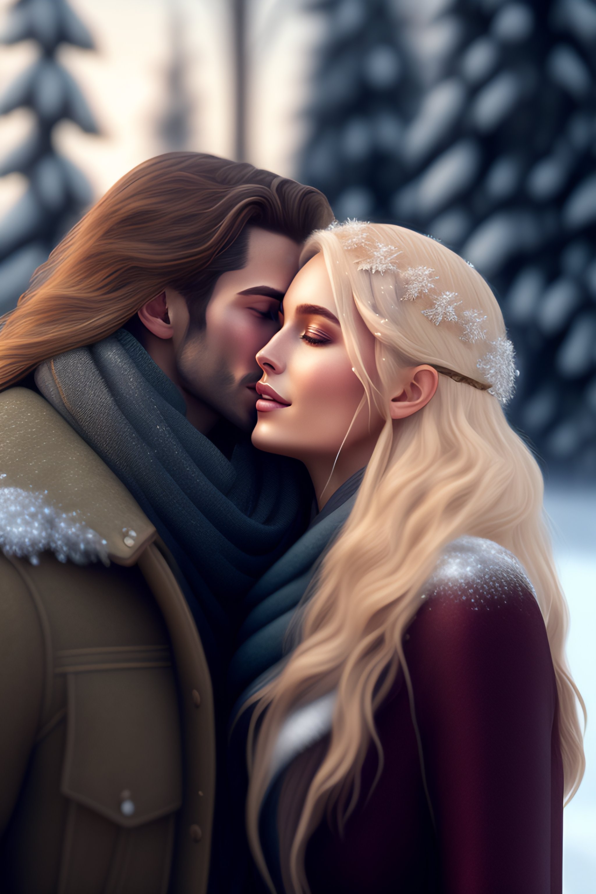 Couple kiss long hair highly detailed, digital painting, atmospheric lighting, octane render, unreal engine, professional forest growth is worth blond young handsome cute winter snow elf
