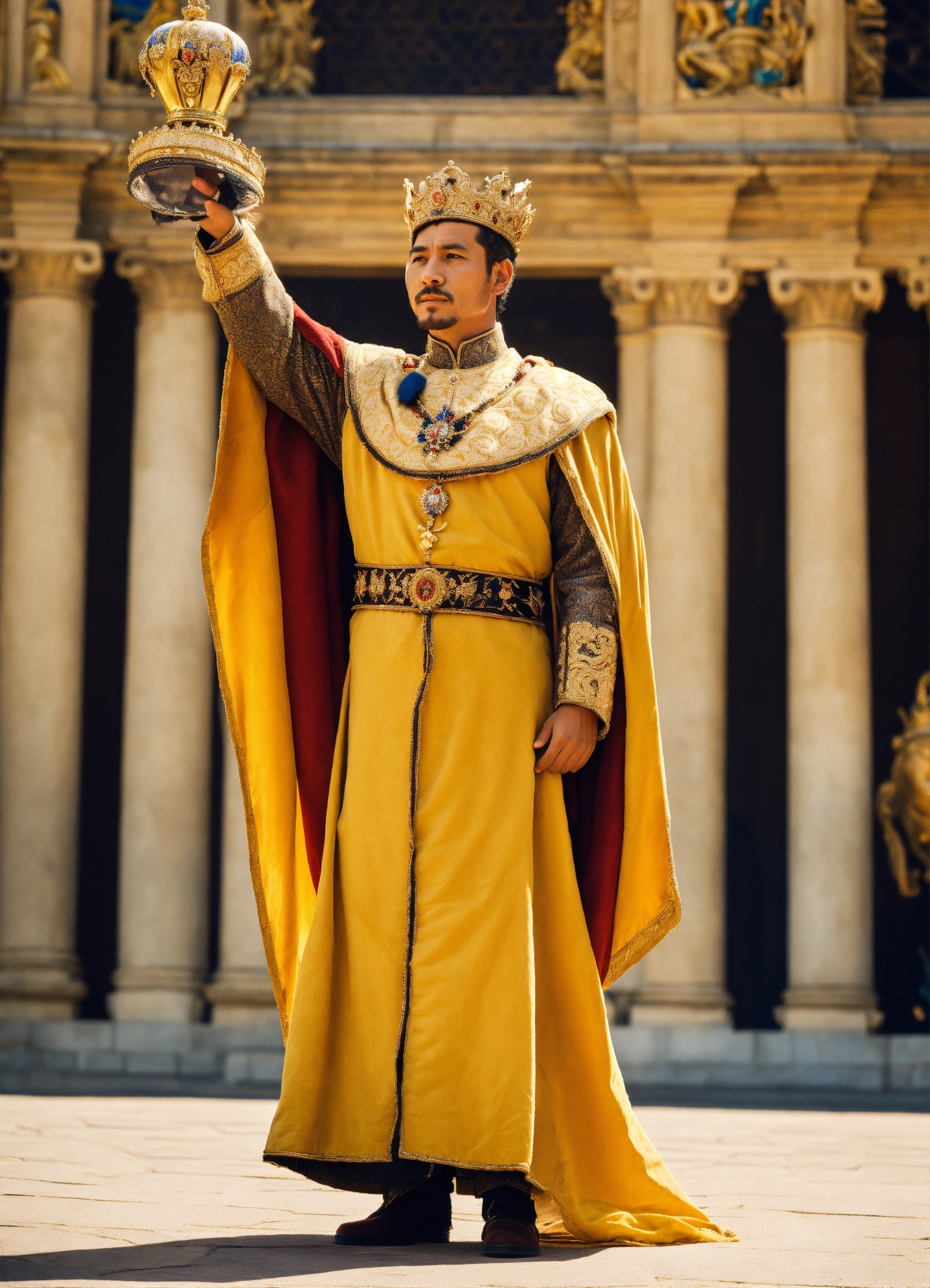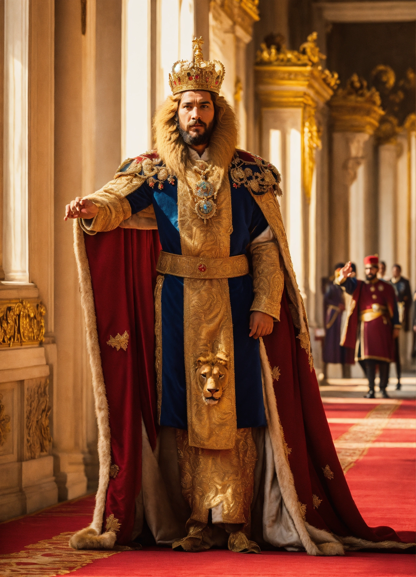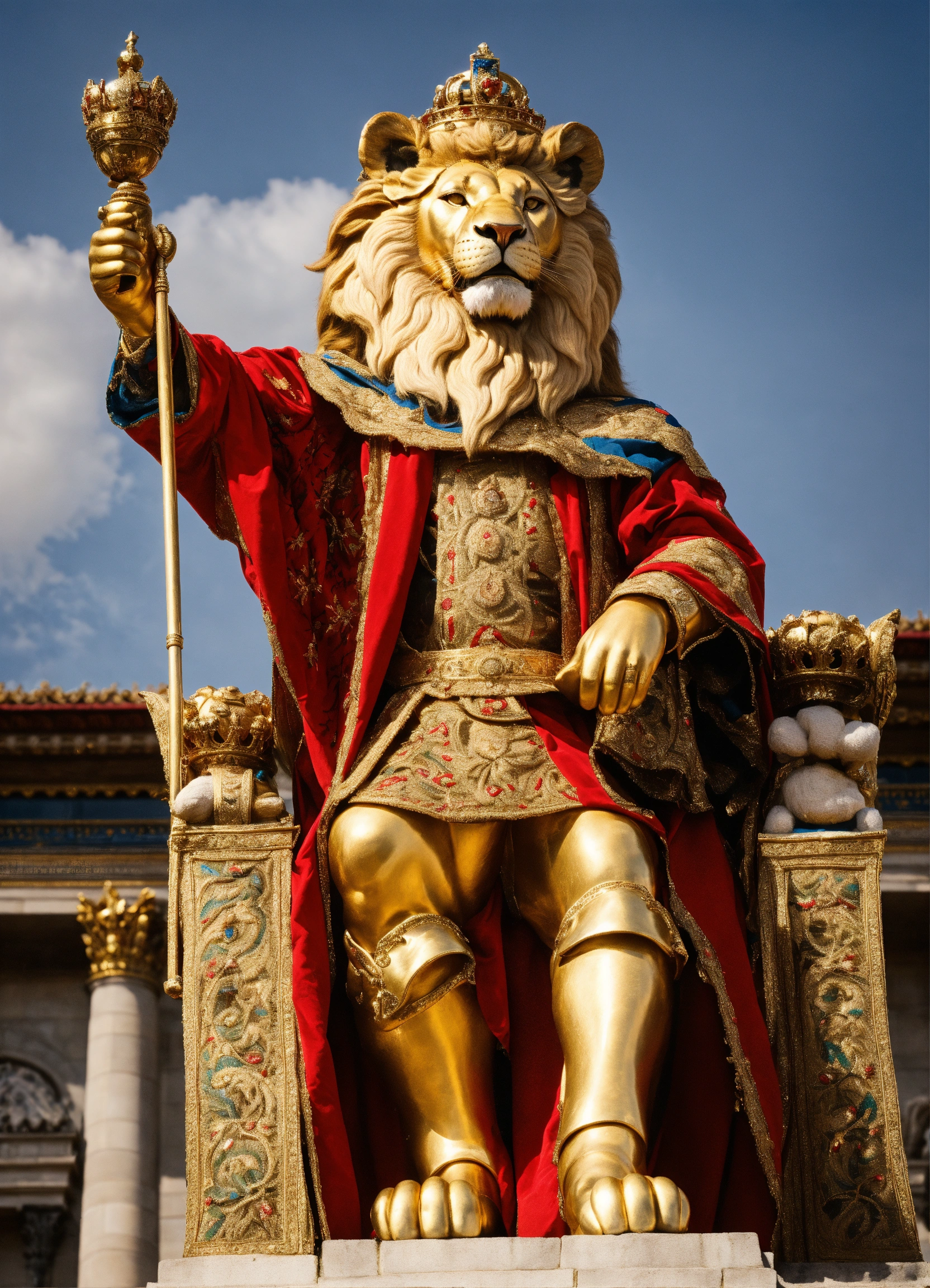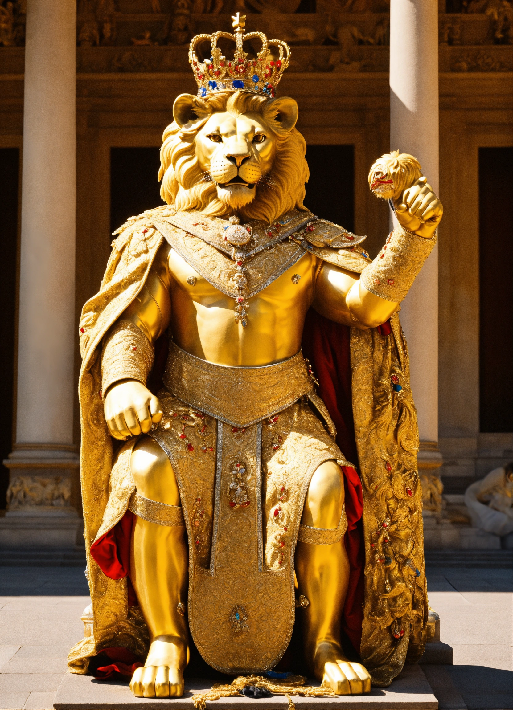 A king wearing full king clothes with the head of a lion, waving his right arm to his people, royal palace, day time, sunlight
