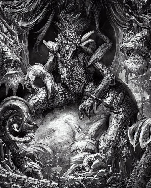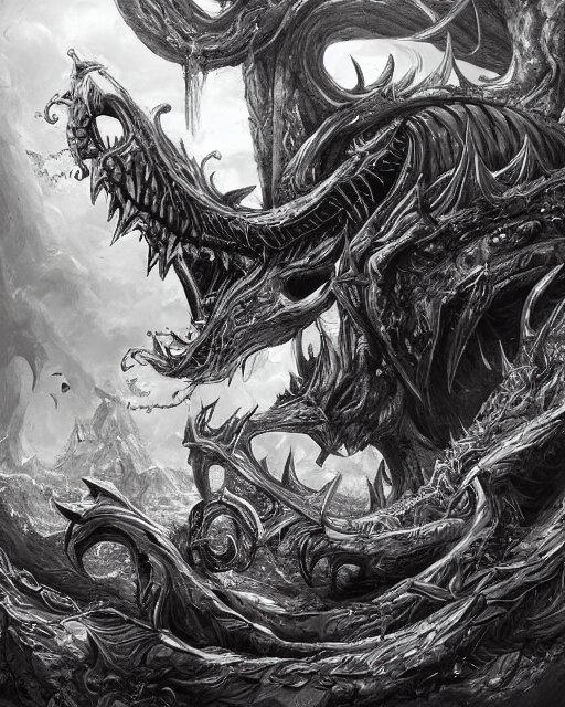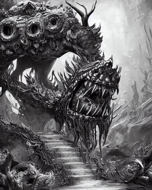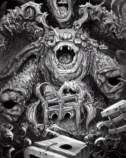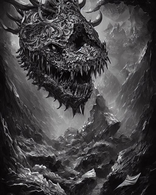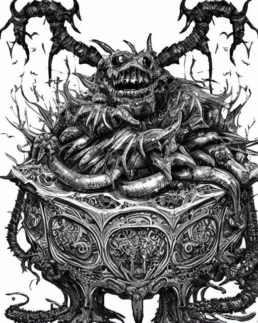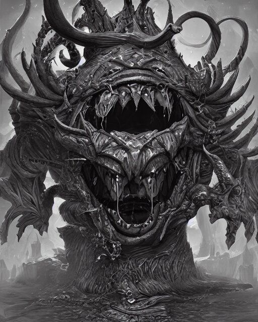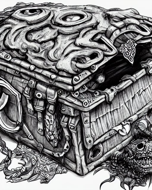 A monster treasure chest, black and white, fantasy art, monster art, illustration, fantasy, intricate, hyper detailed, artstation, concept art, smooth, sharp focus, ray tracing