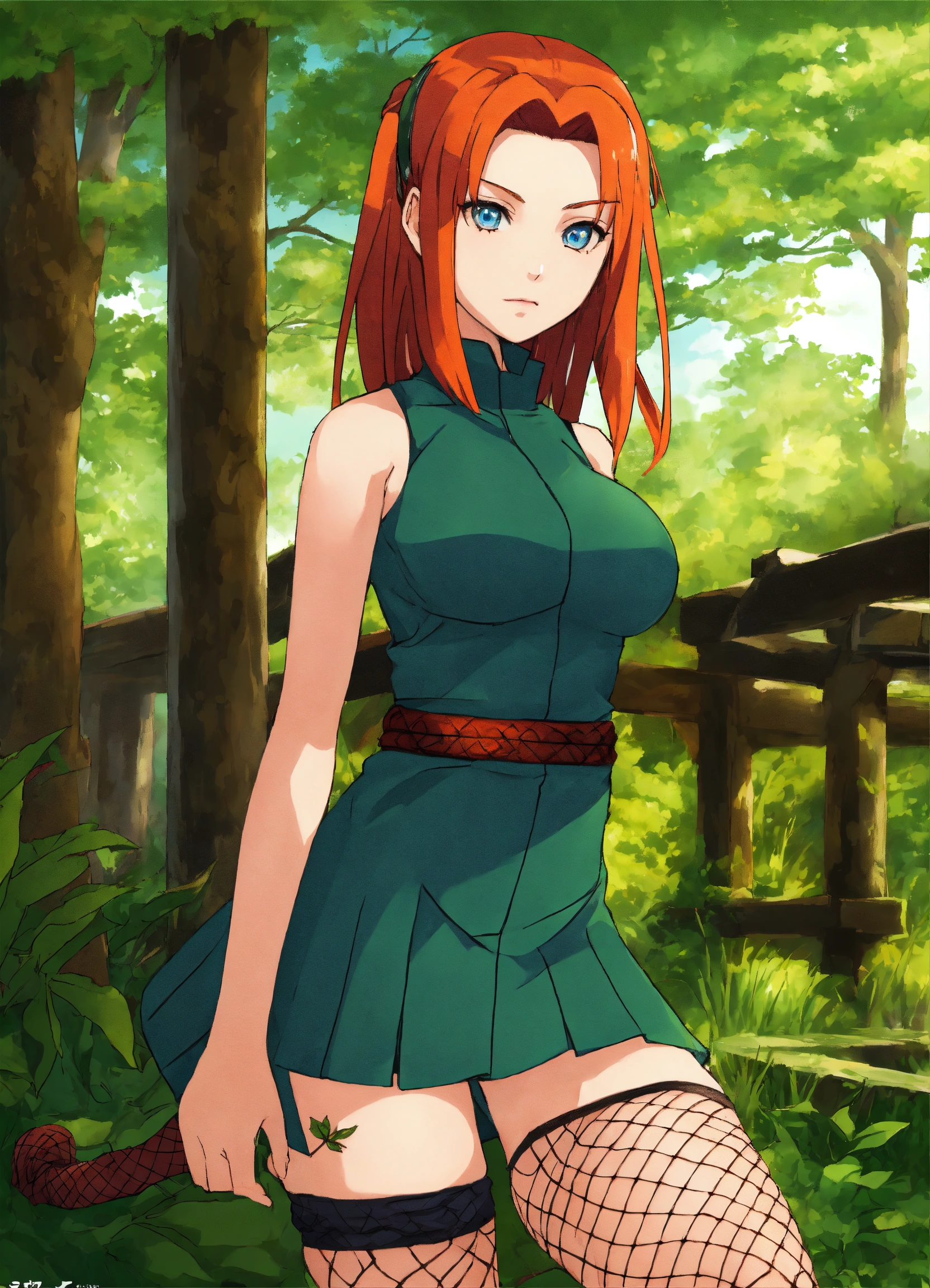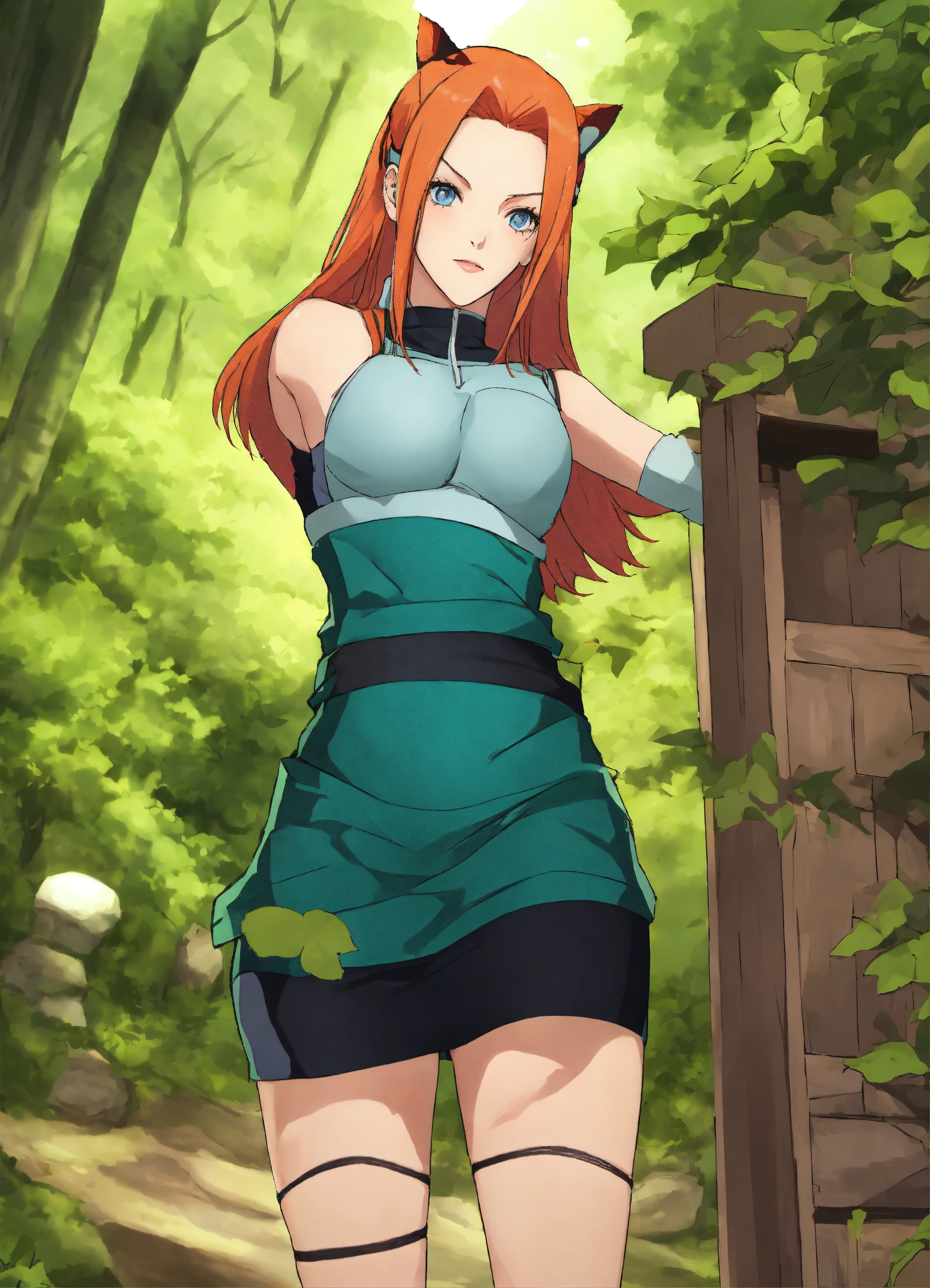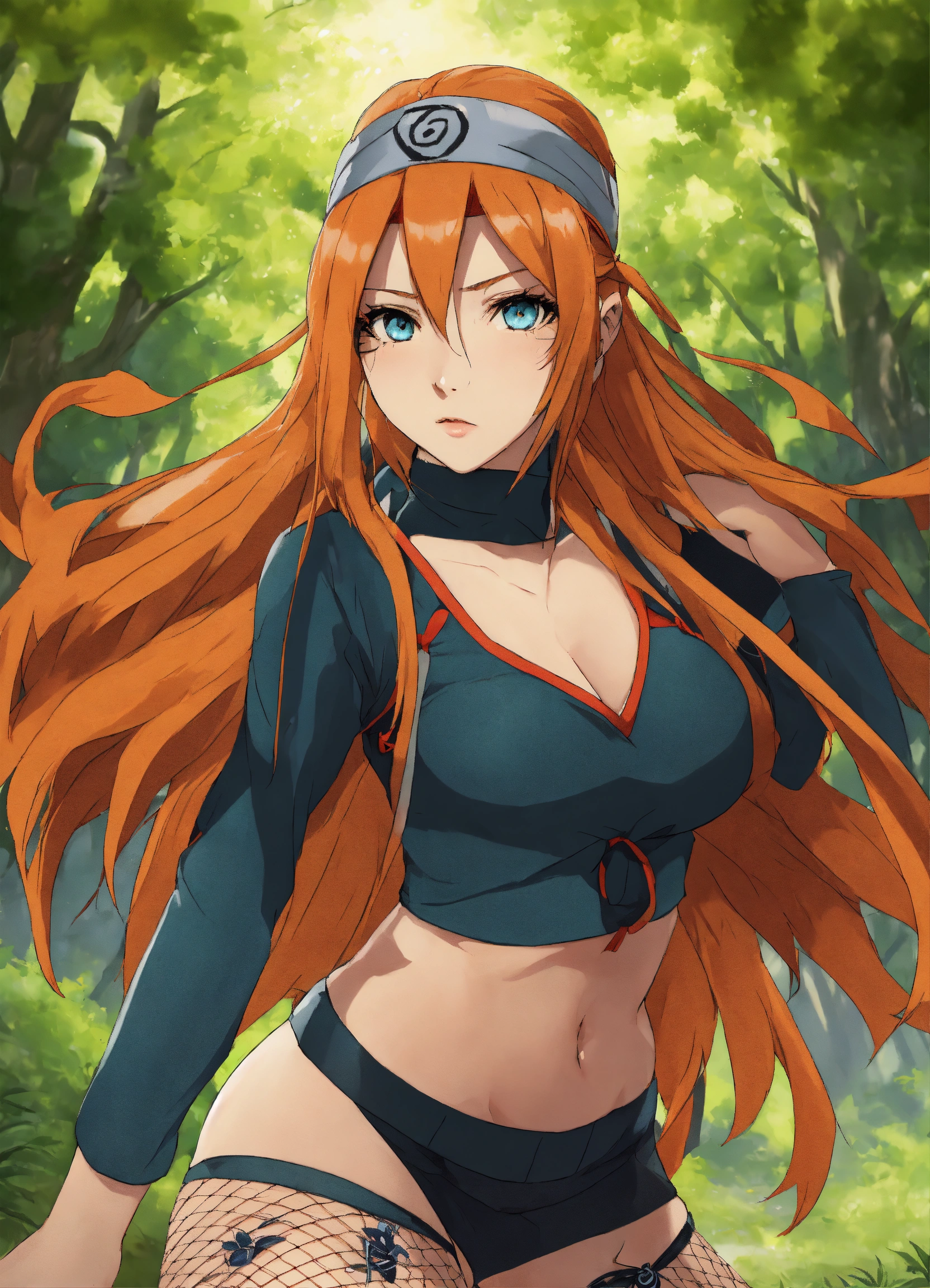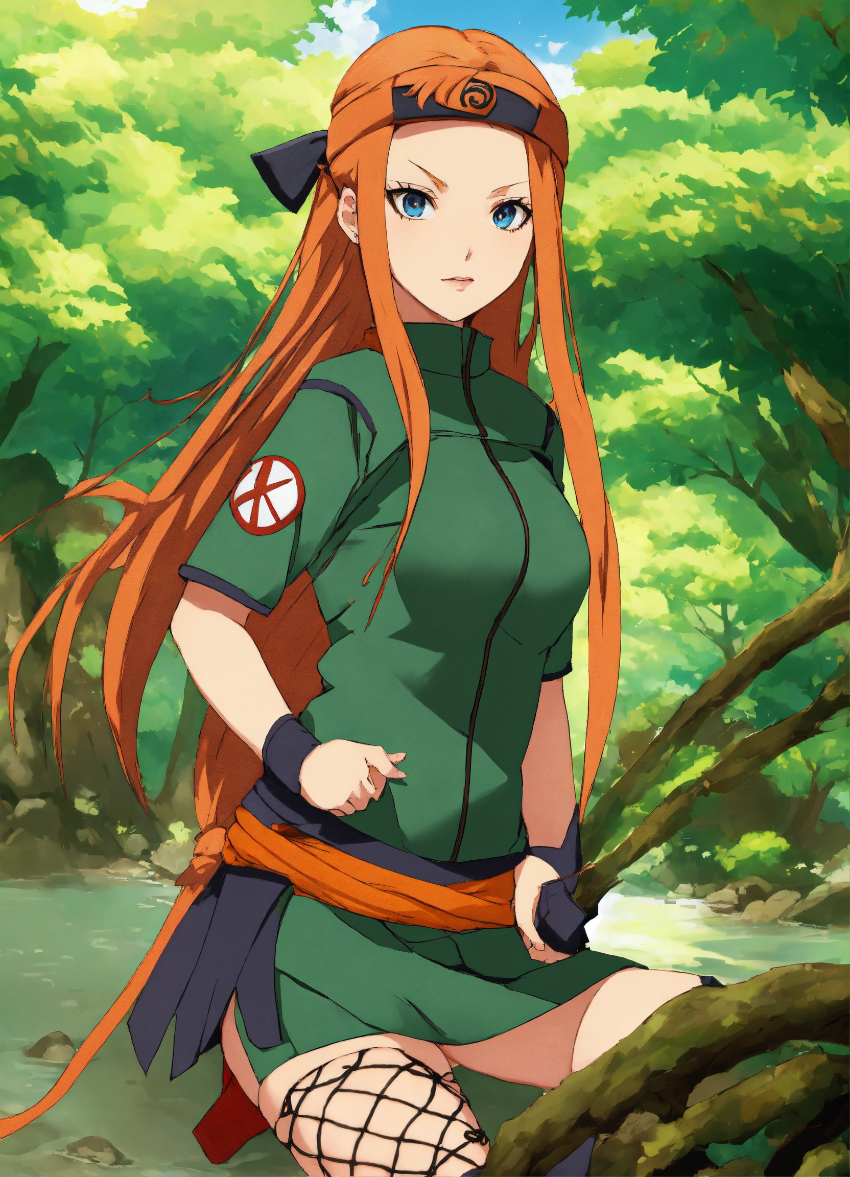 Naruto-style art, masashi kishimoto art, anime, naruto manga, naruto anime, original character, ginger hair, blue eyes, pretty woman, kunoichi, shinobi, konoha, ginger long hair, ginger hair, blue eyes, beautiful girl, beautiful young woman in naruto style art, feminine, fishnets, village hidden in the leaves headband, short dress, fishnets, kunoichi attire, feminine kunoichi attire, naruto headband, fishnets tights on legs, flattering kunoichi fishnets with green short dress, long hair down and flowing, full body, full fishnets on her legs, full fishnet tights, wearing full fishnet tights on her legs, full fishnet tights on legs