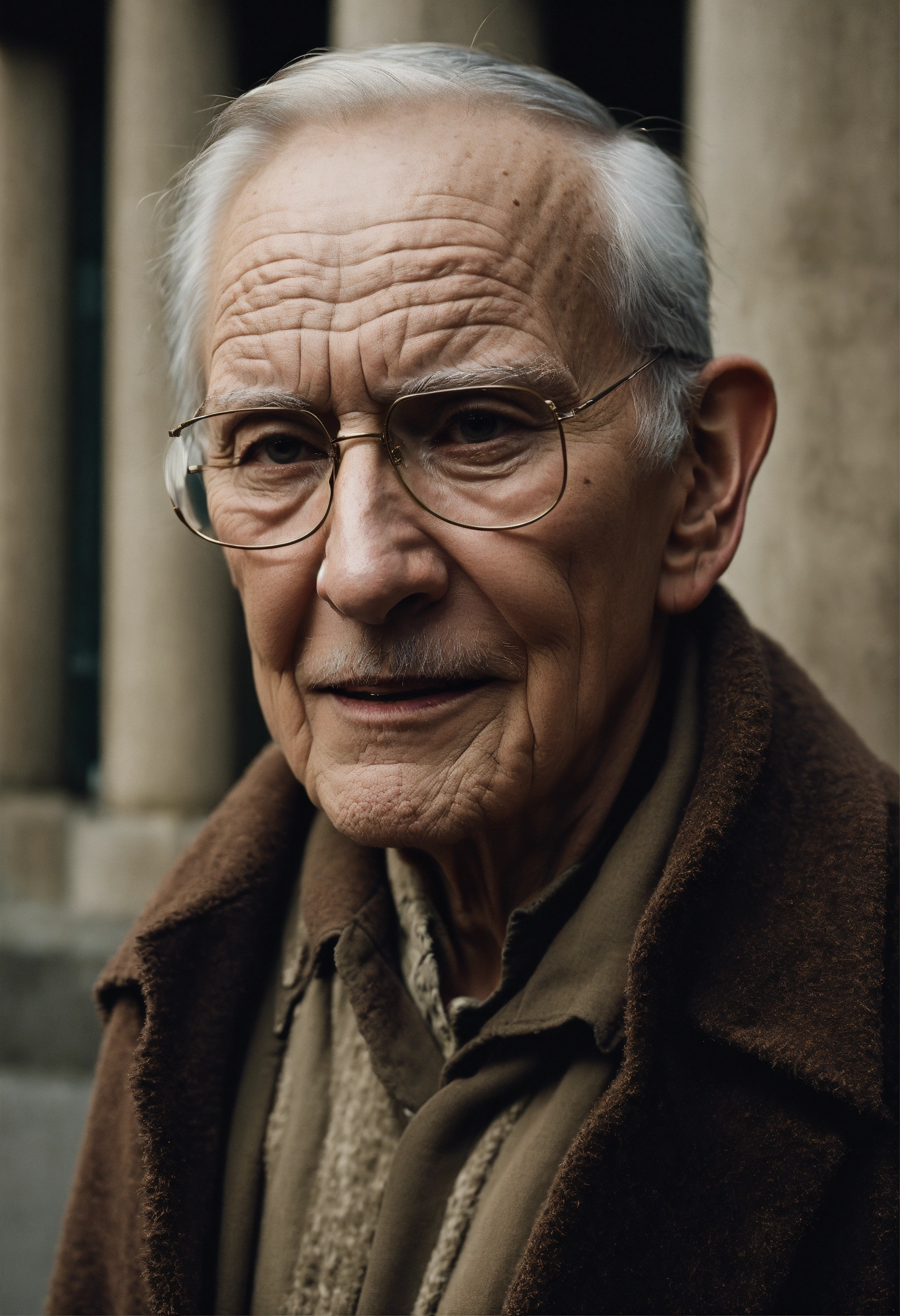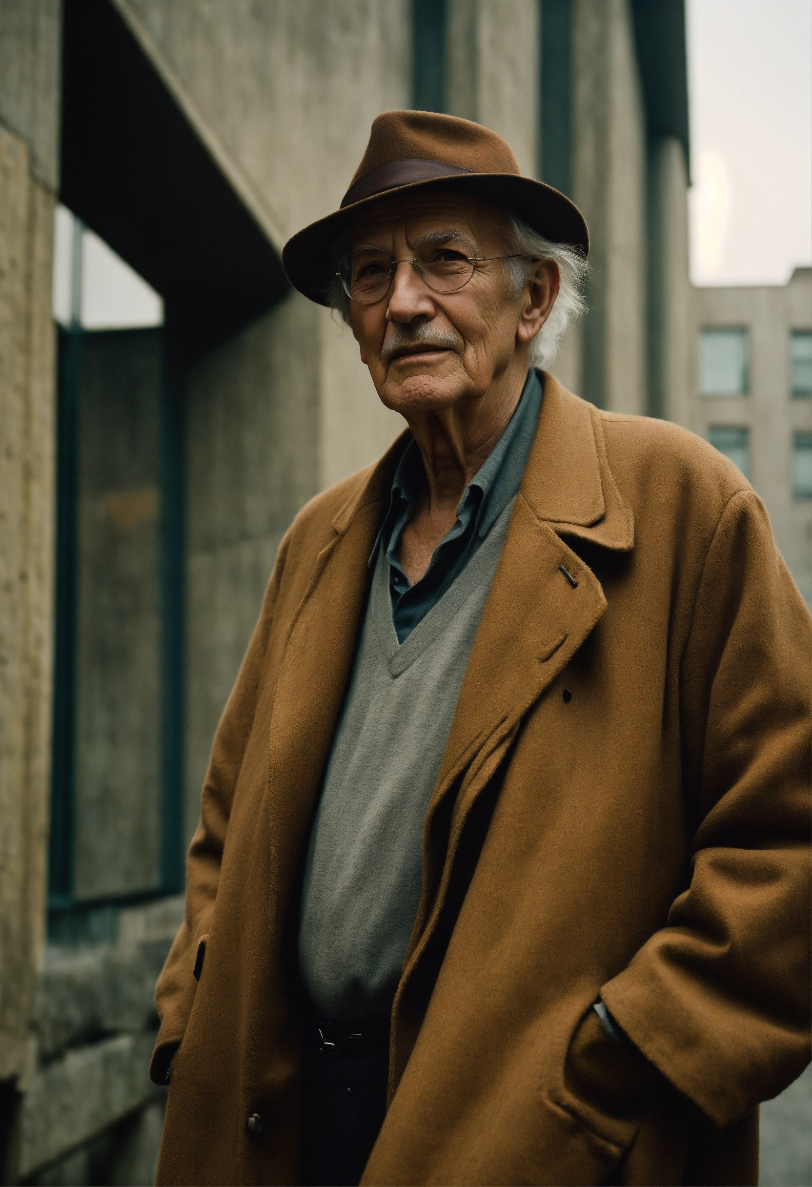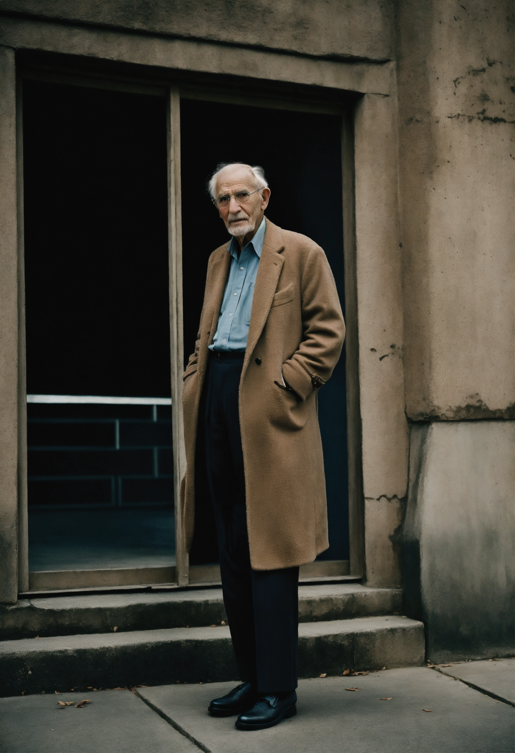 Portrait of a very old man, serene and peaceful, photoshoot by annie leibovitz, editorial fashion magazine photoshoot, fashion poses, in front of brutalist building architecture. kinfolk magazine. film grain. a soft smile.