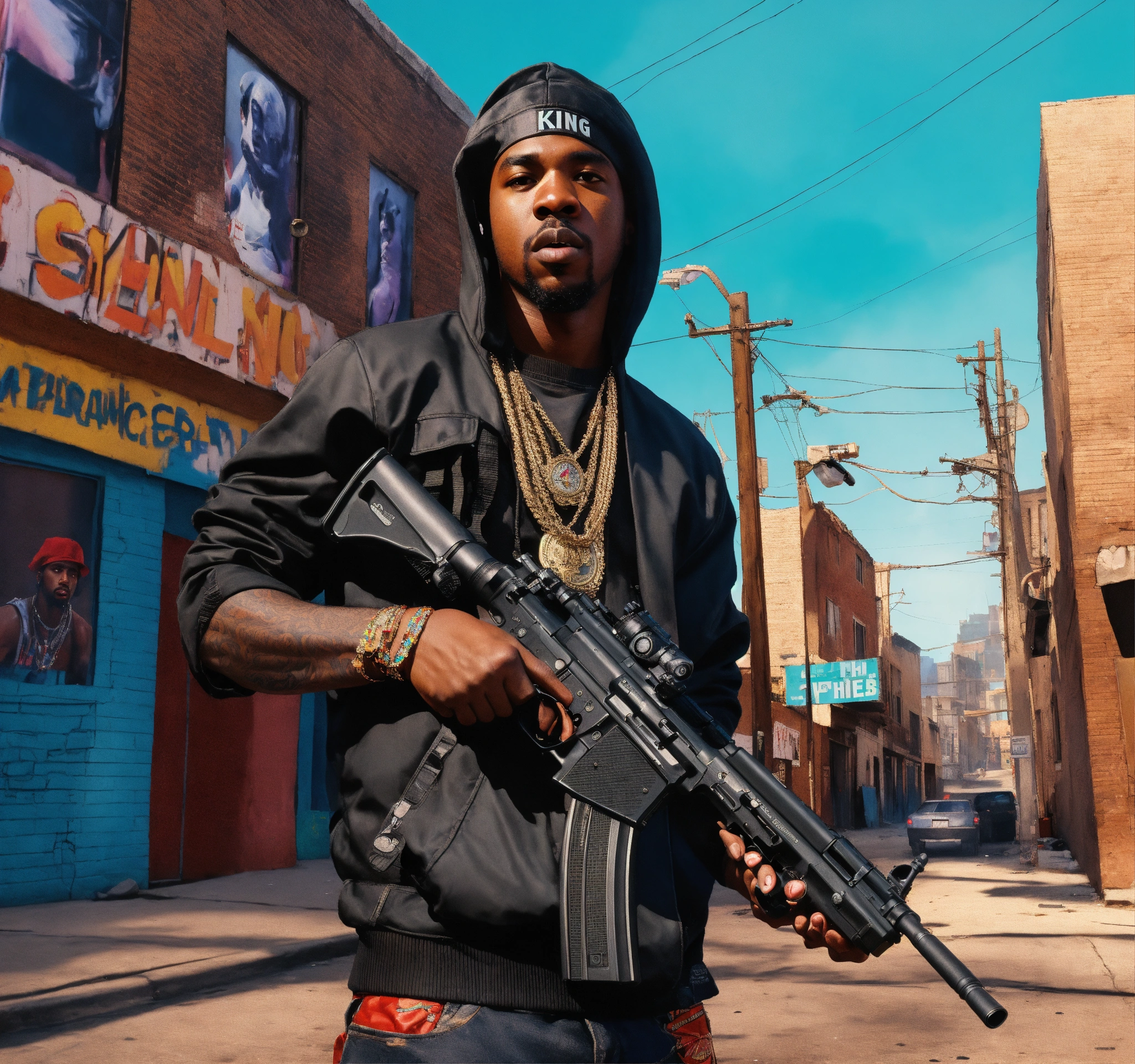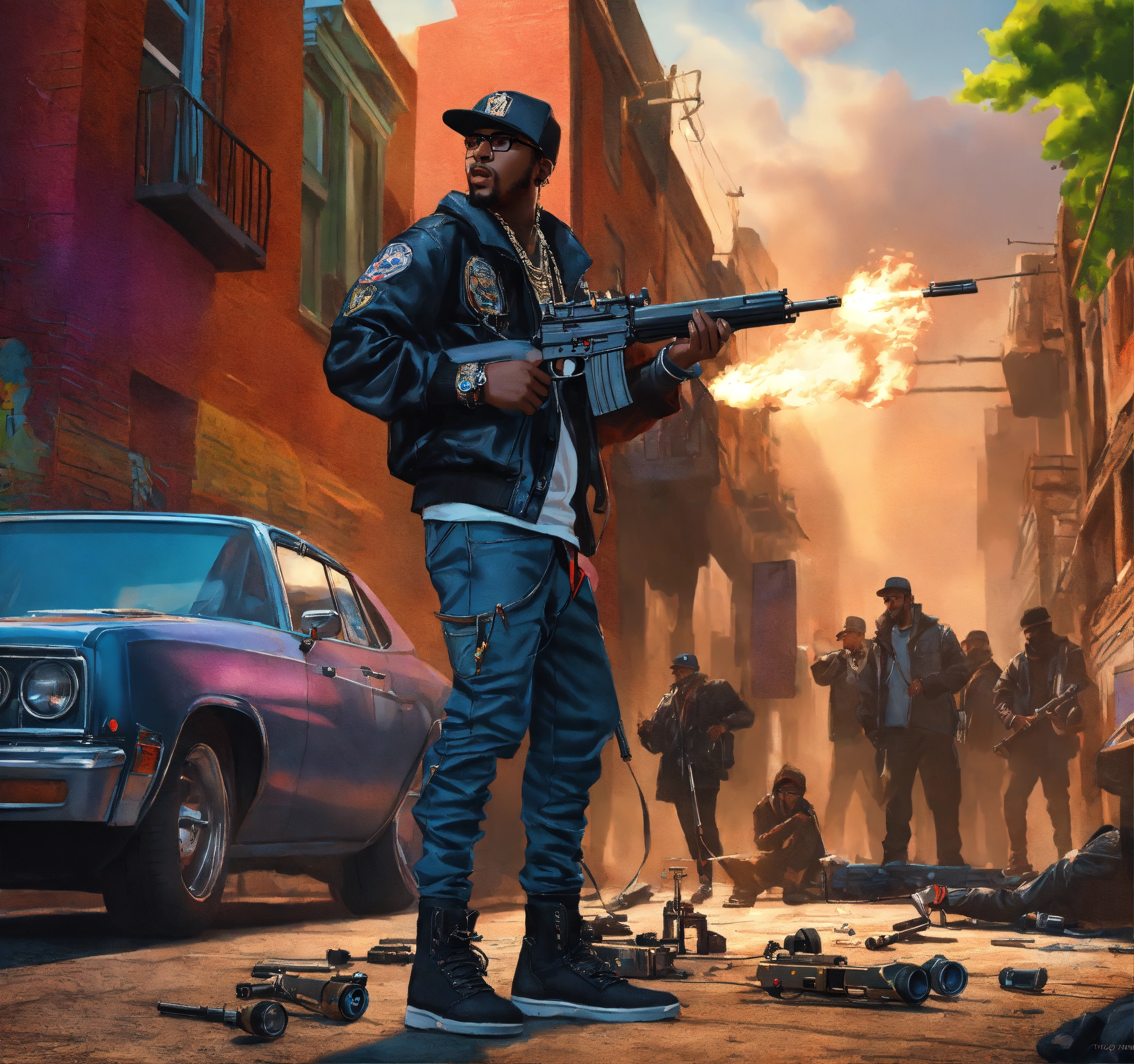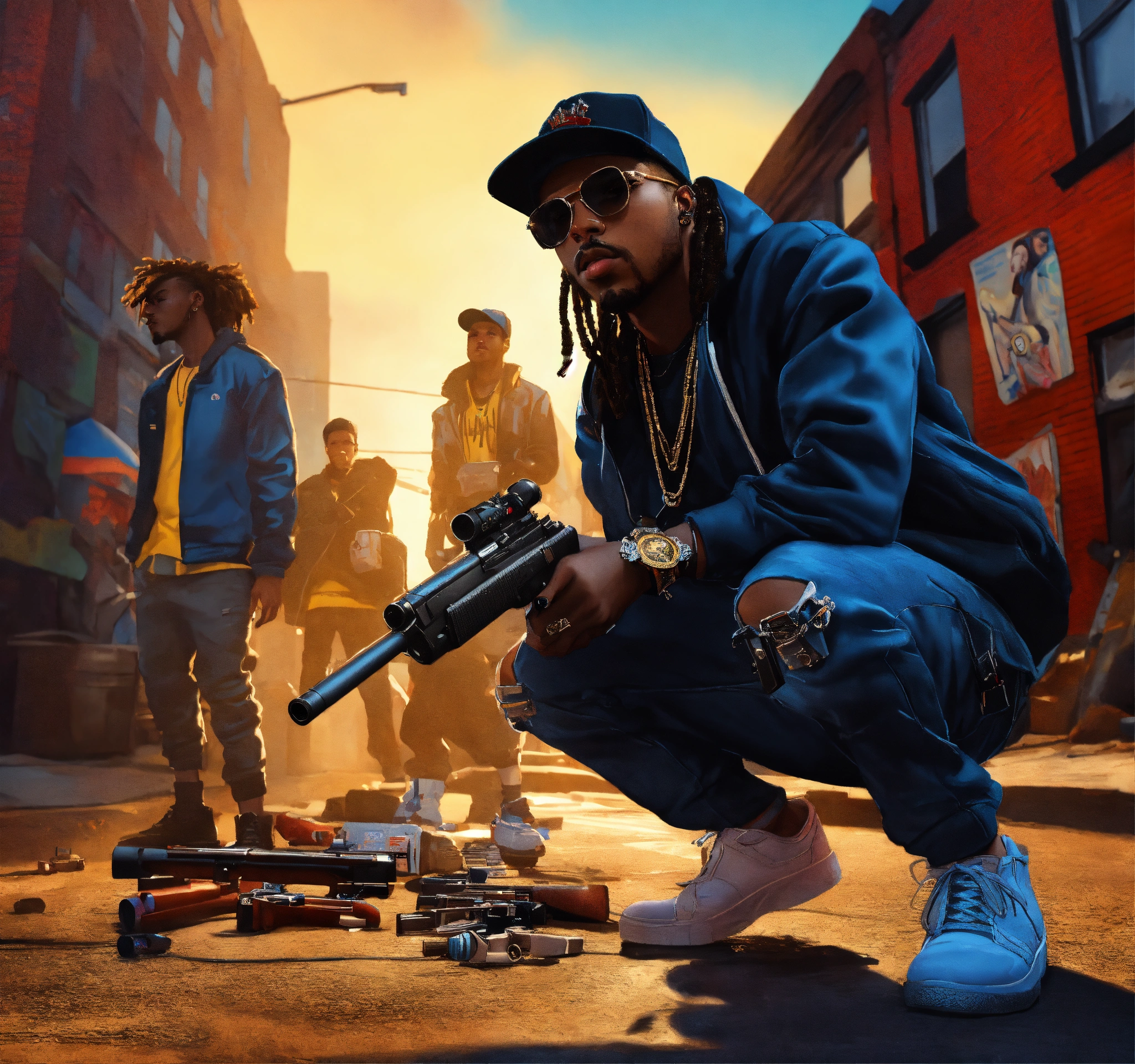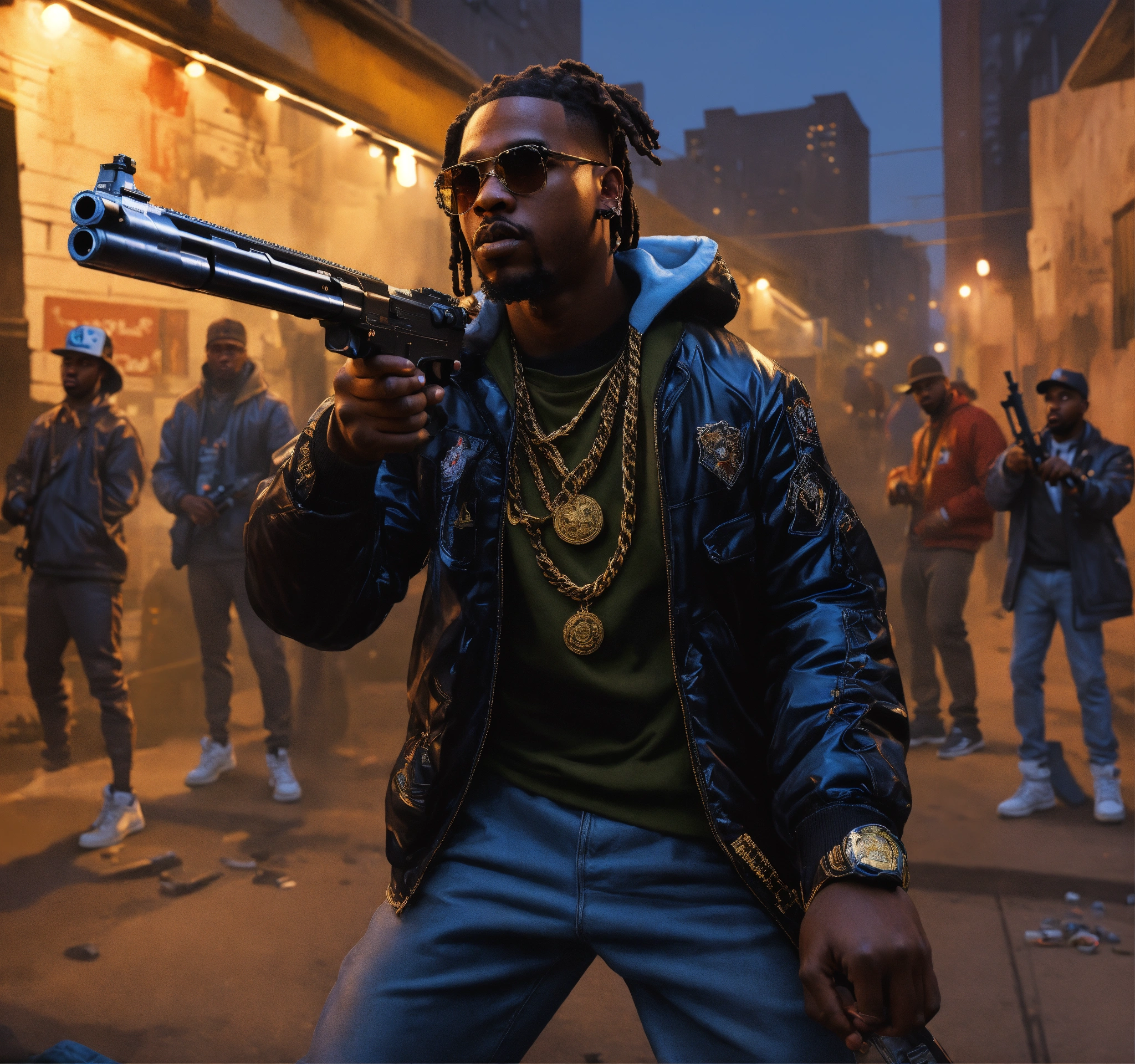 Dutch angle shot, pop art, hyperrealist full body portrait of black rapper "king von " shooting guns with a gang in the slums of chicago street corner, fantasy art, photo realistic, dynamic lighting, artstation, poster, volumetric lighting, very detailed faces, 4 k, award winning