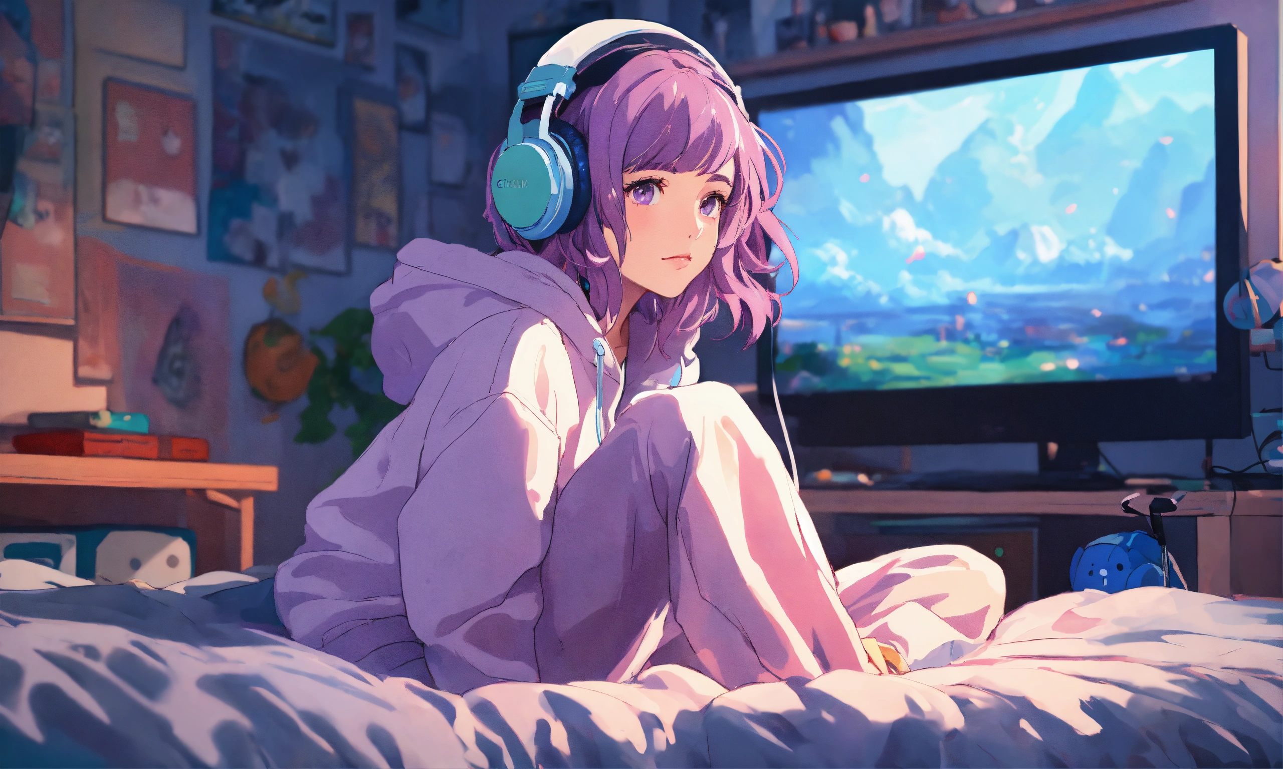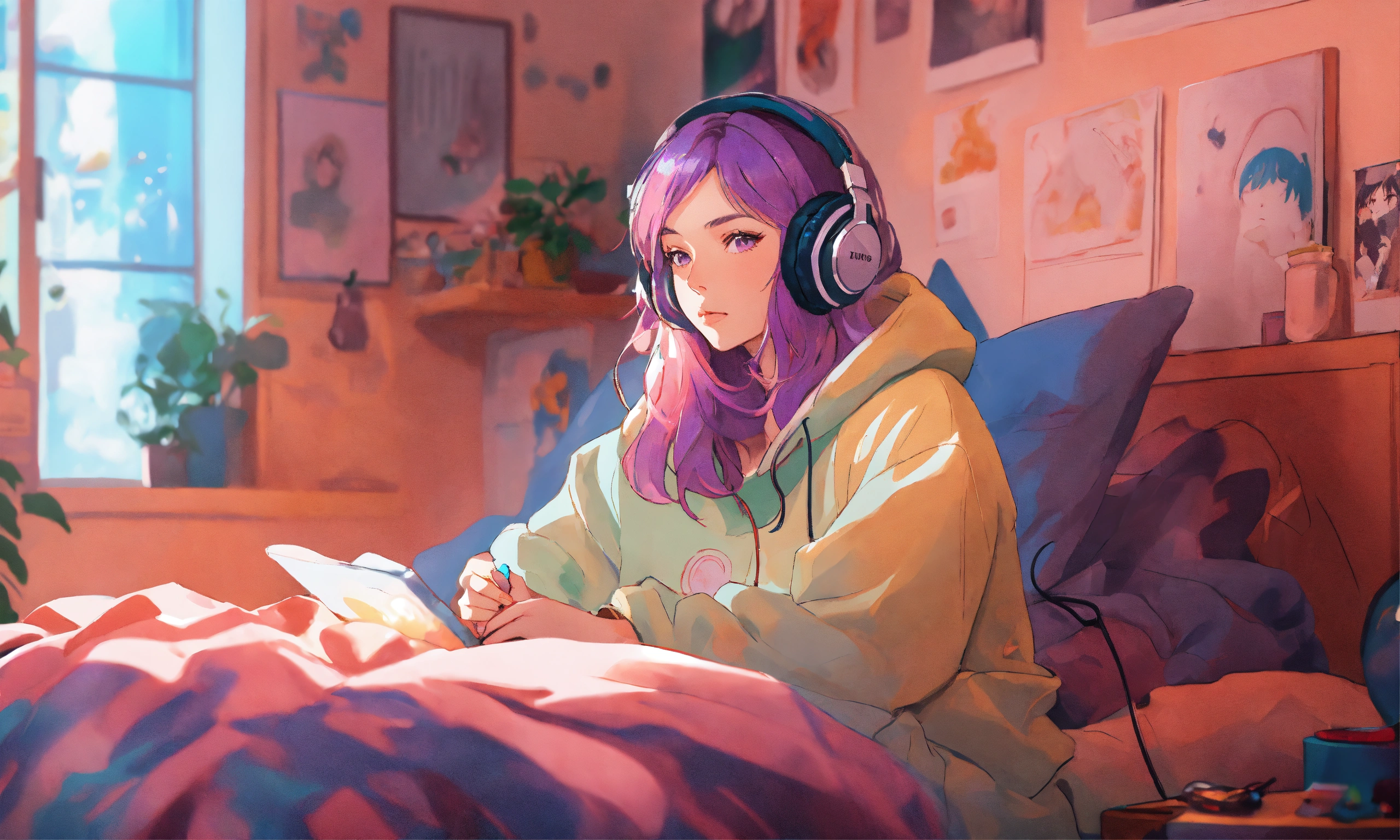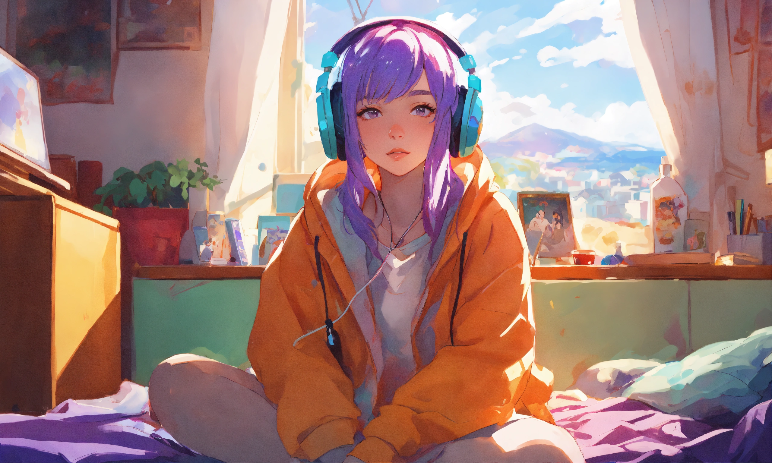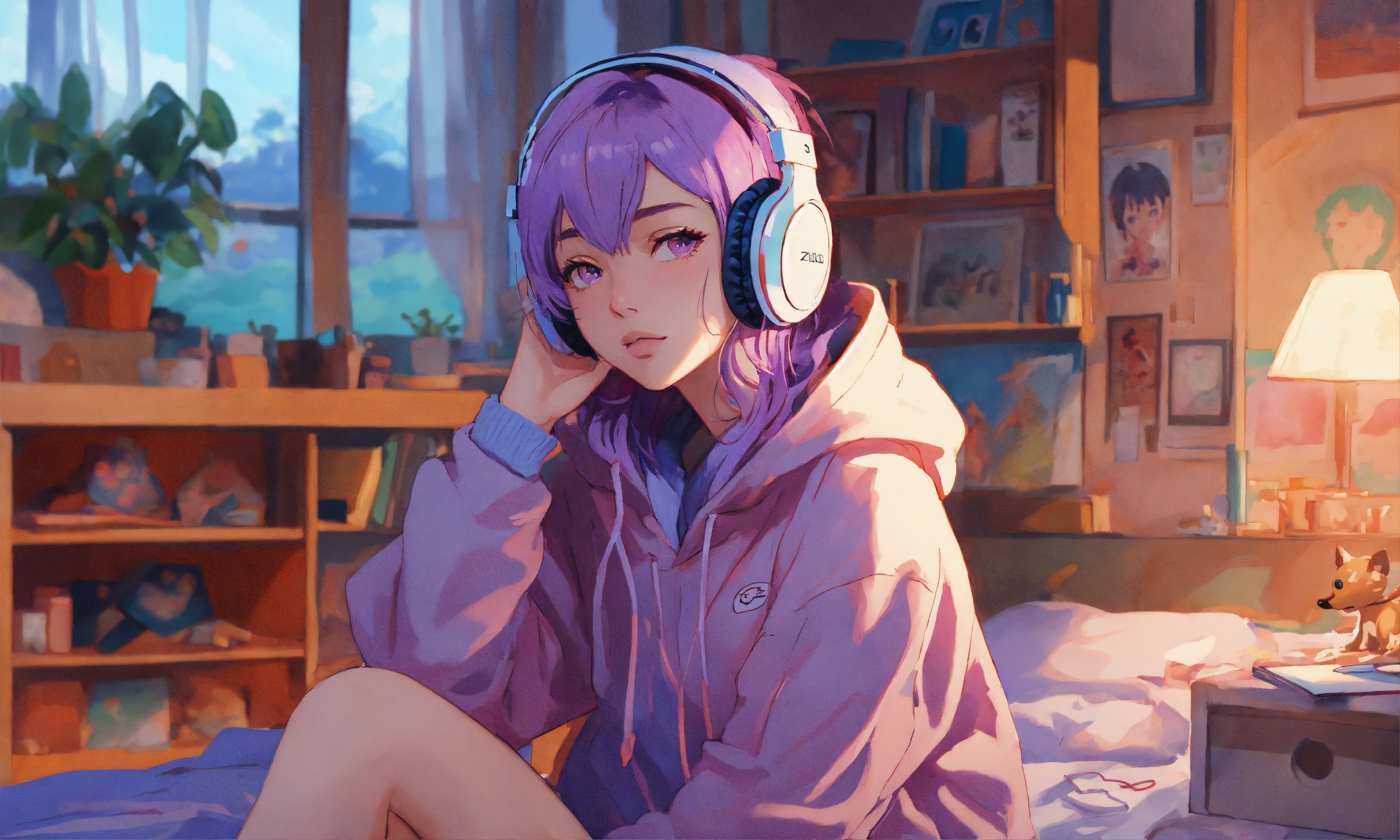 8k photo portrait of a stunning woman with violet hair in a pastel hoodie wearing headphones, looking at the camera, sitting on her bed in her cozy messy room, highly detailed, studio ghibli, akira toriyama, james gilleard, genshin impact, trending pixiv fanbox, acrylic palette knife, 4k, vibrant colors