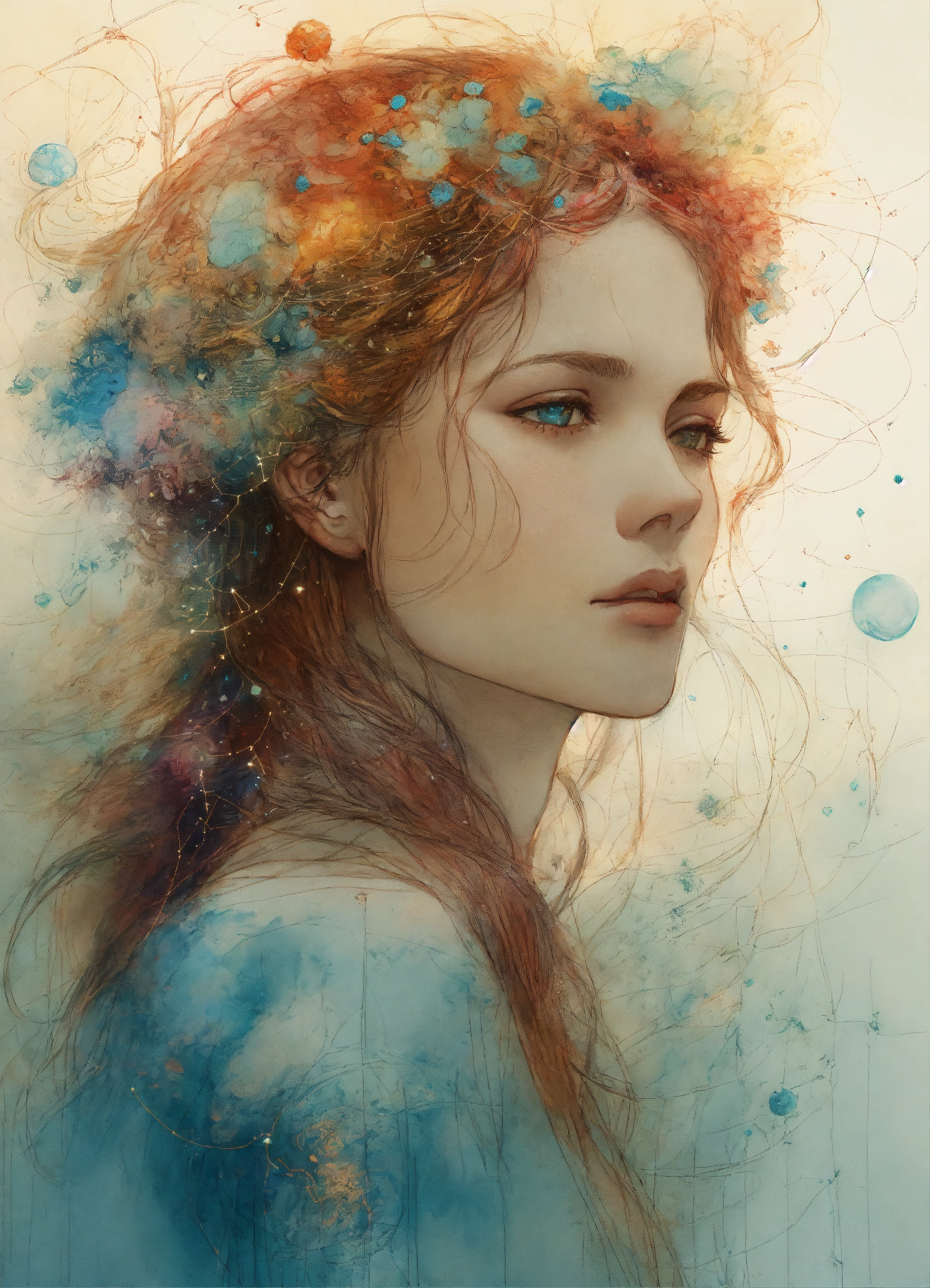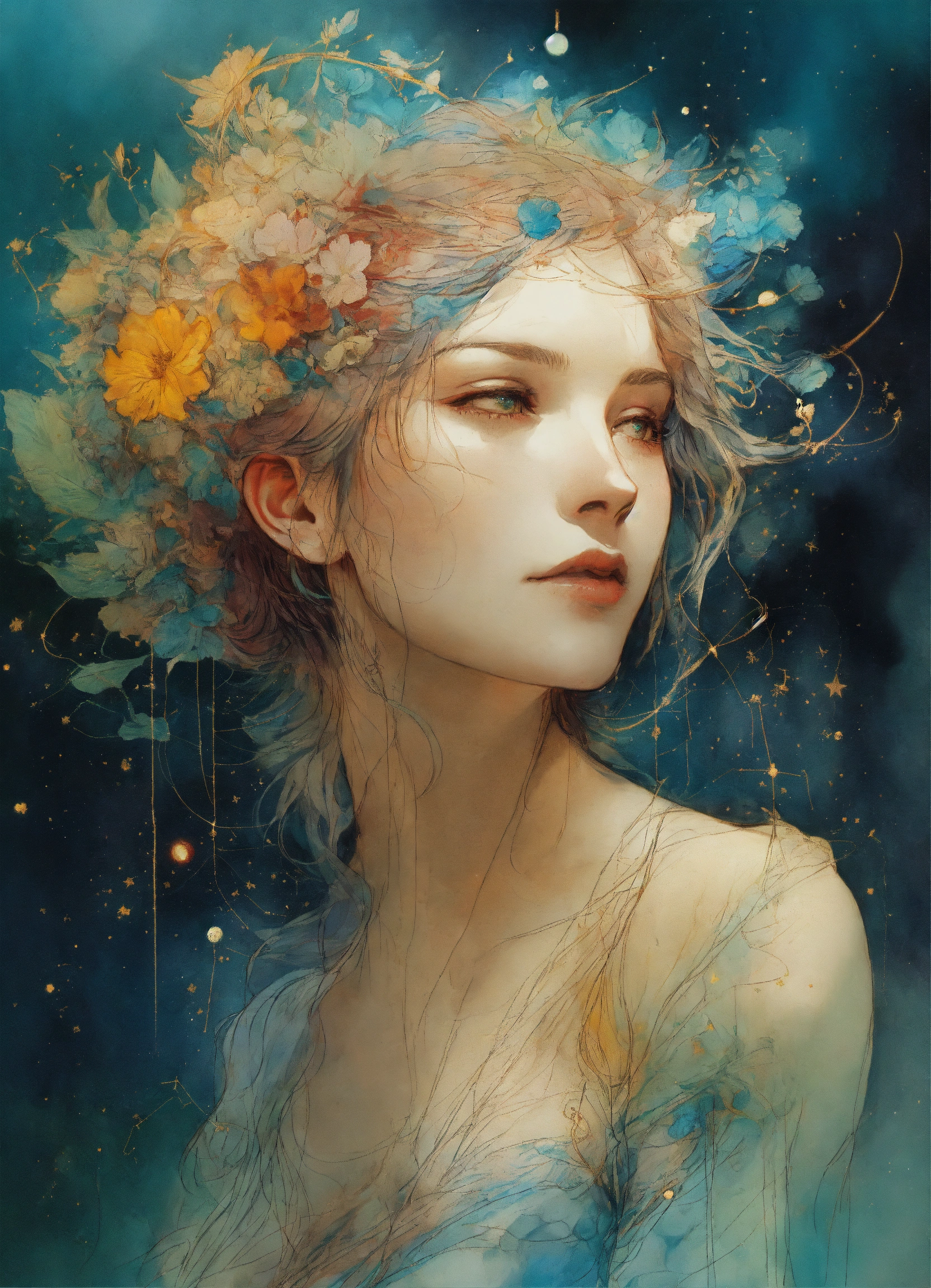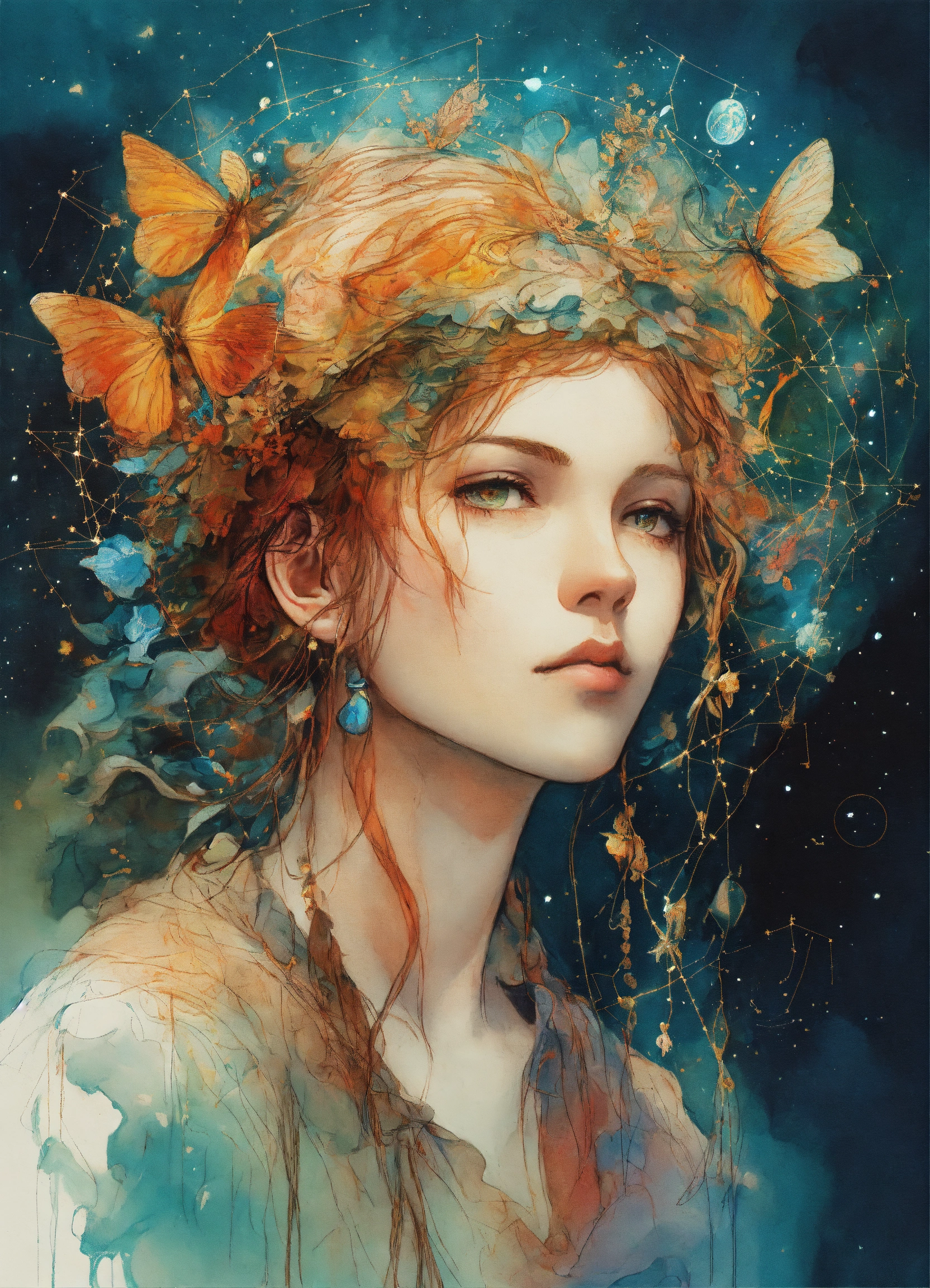 ""combination constellation of a life and a love. carne griffiths and charles vess. ethereal energy, intricate motifs, perfect composition, 8k, cosmic aura""