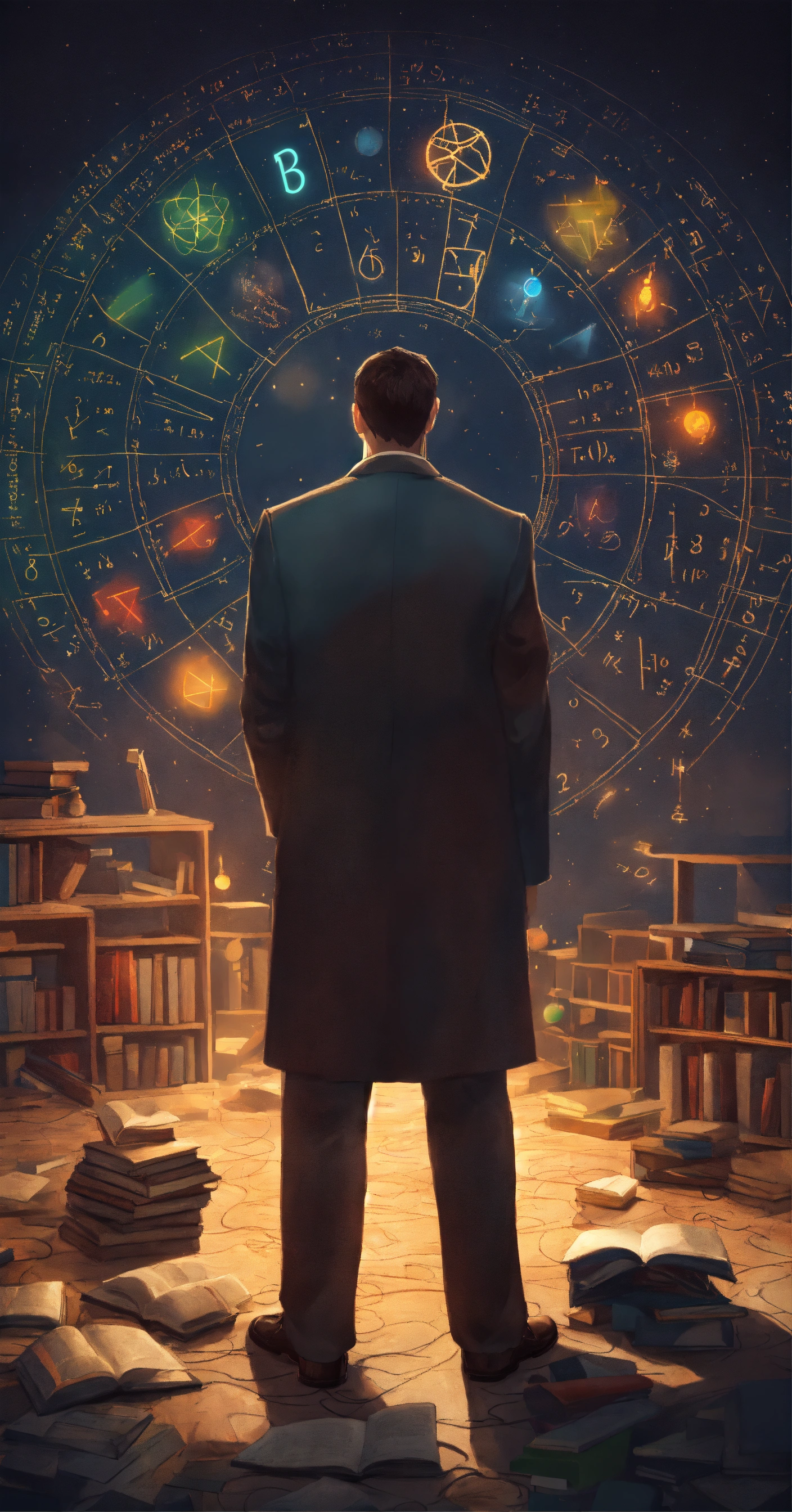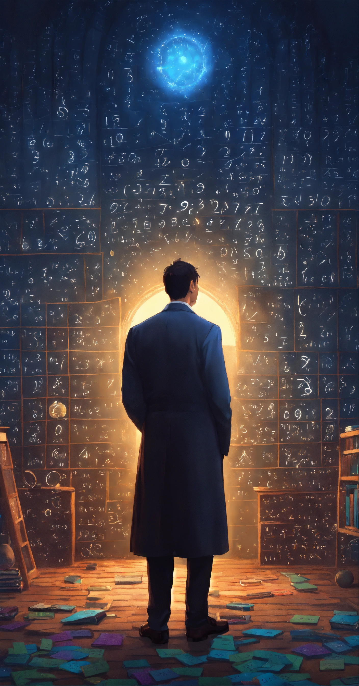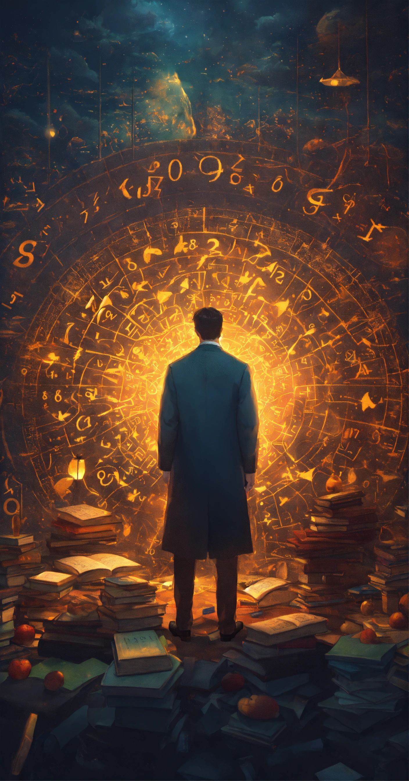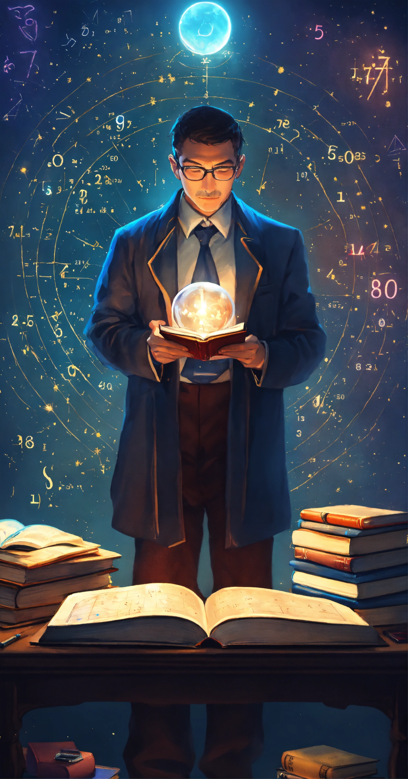 Full of numbers, mathematic symbols, groomy, dark, male serious teacher standing at the start, mystic, fantasy, maths books lie around