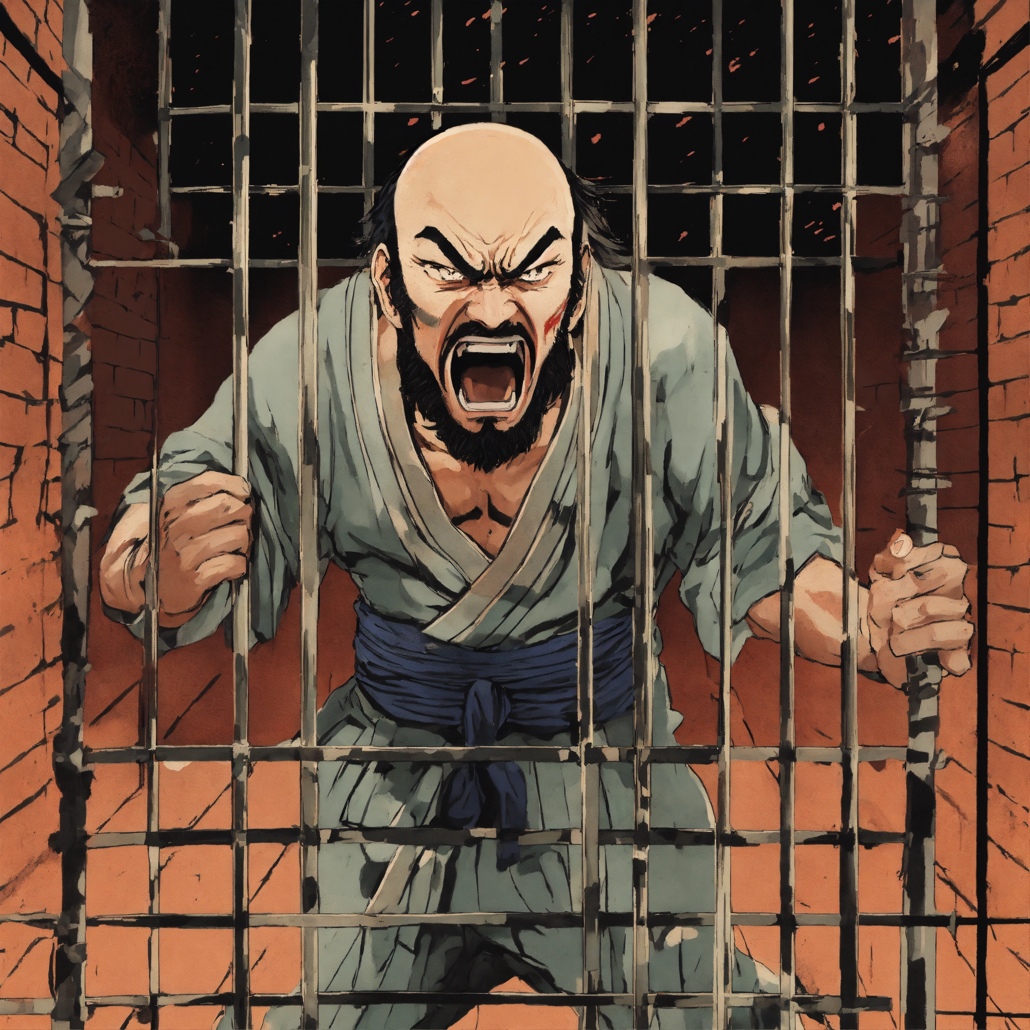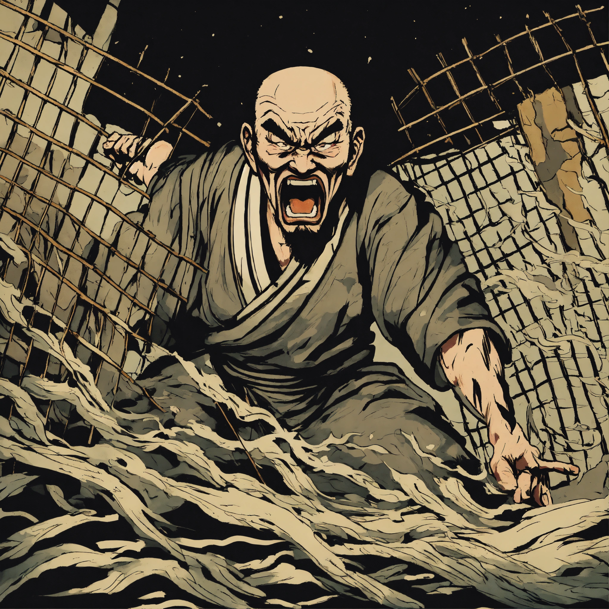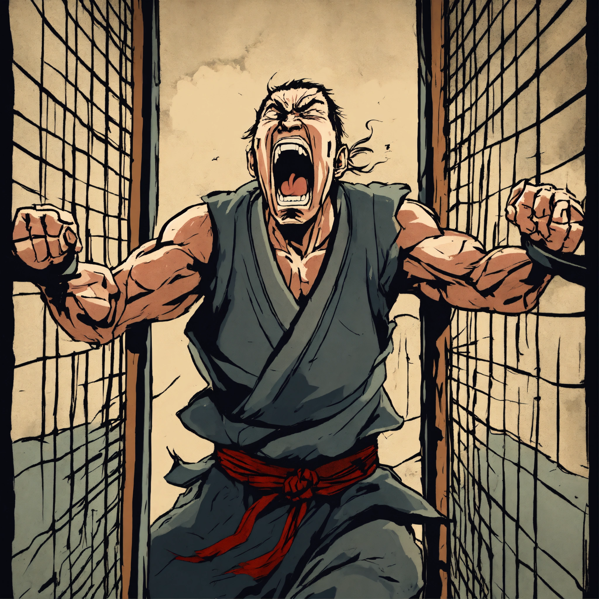 Illustration of a angry man, breaking prison bars, screaming, inspired by ryūkōsai jokei, japanese art style, inspired by kawanabe kyōsai, mysterious